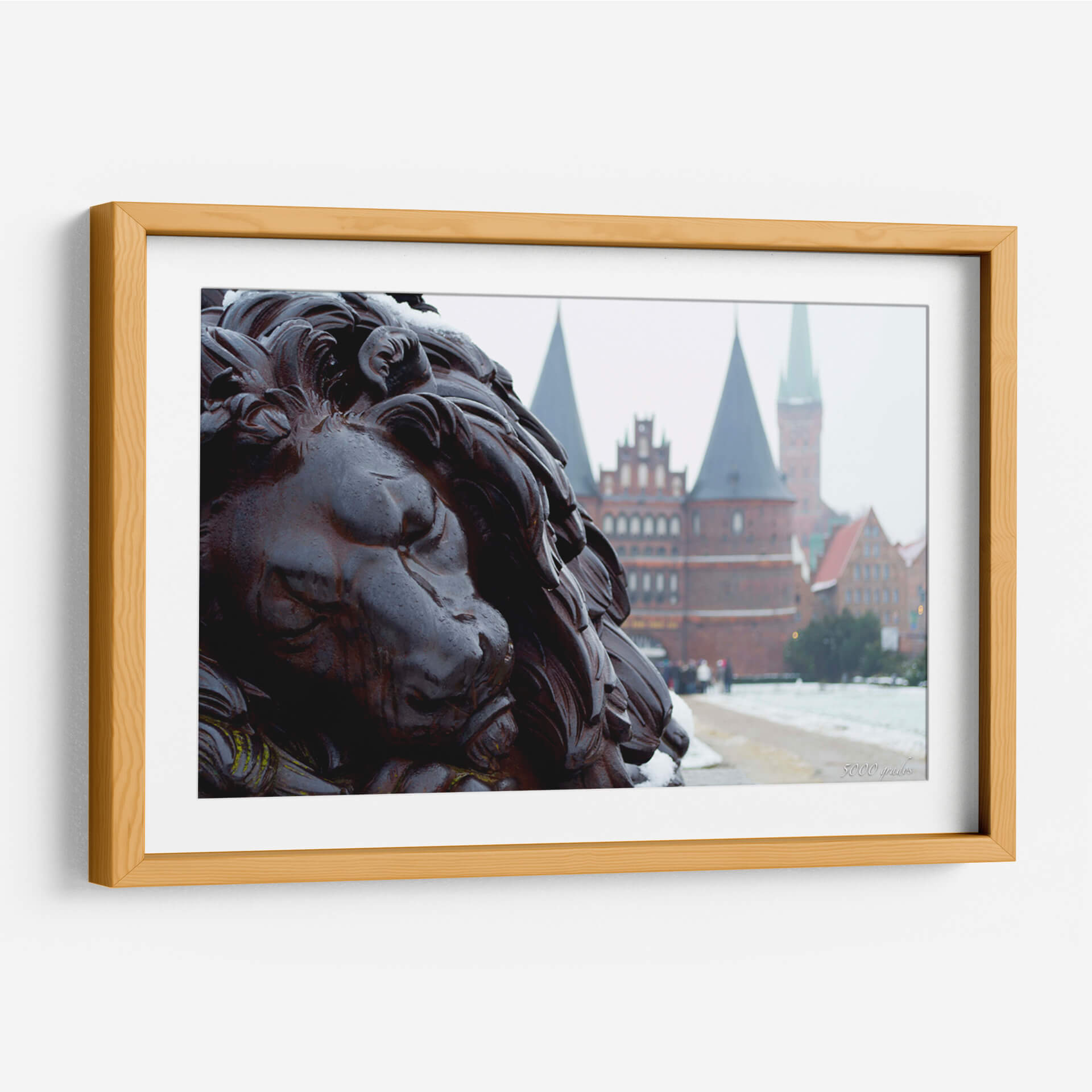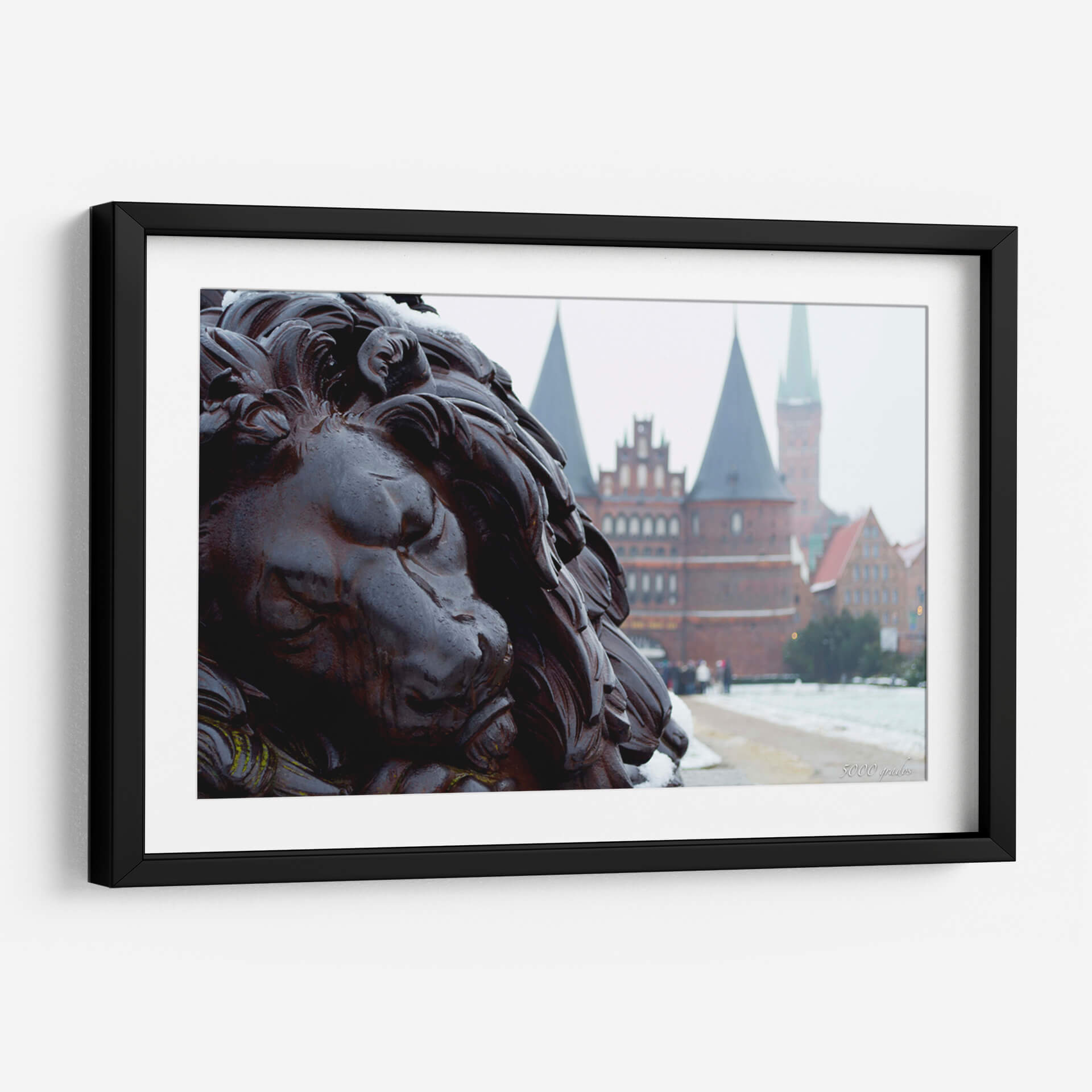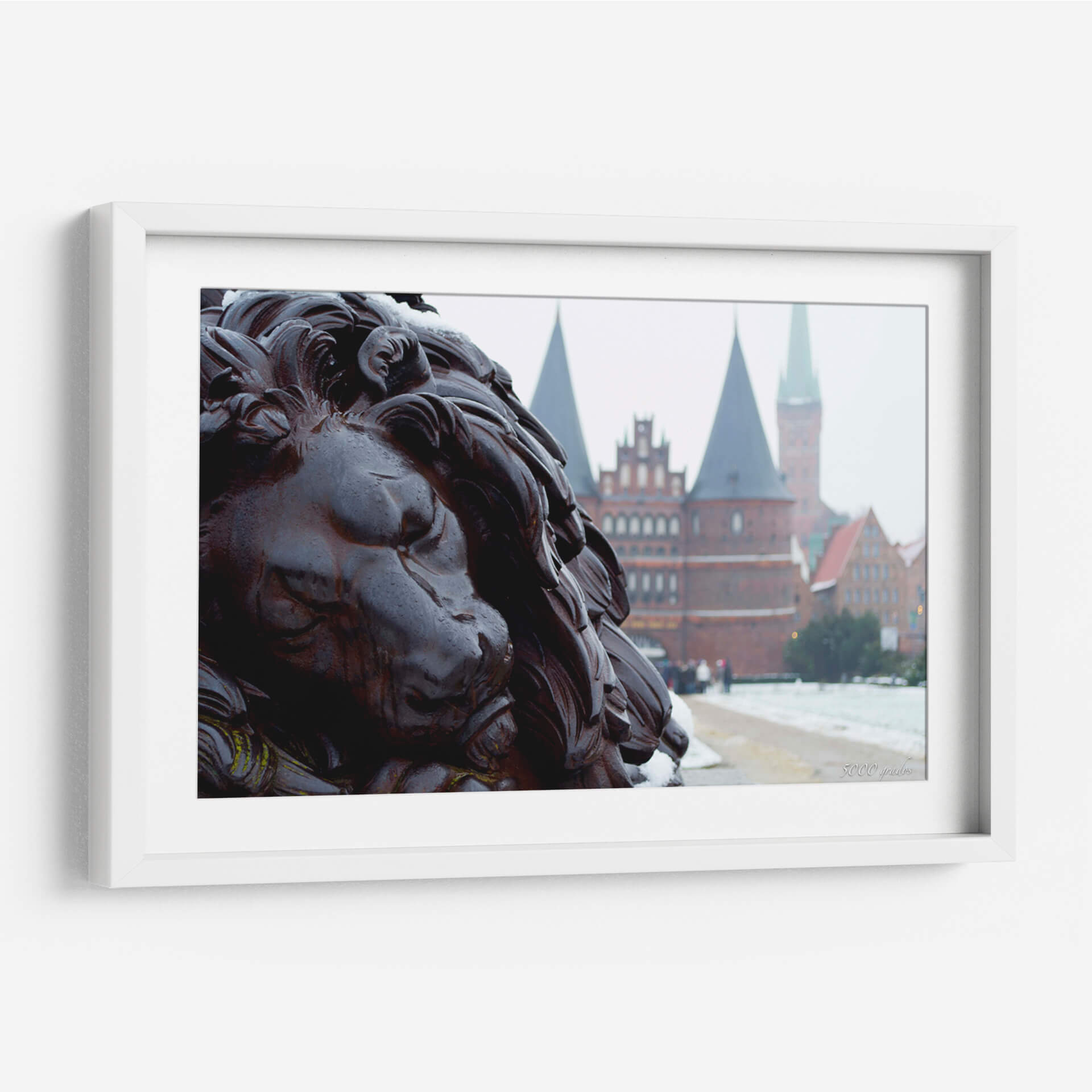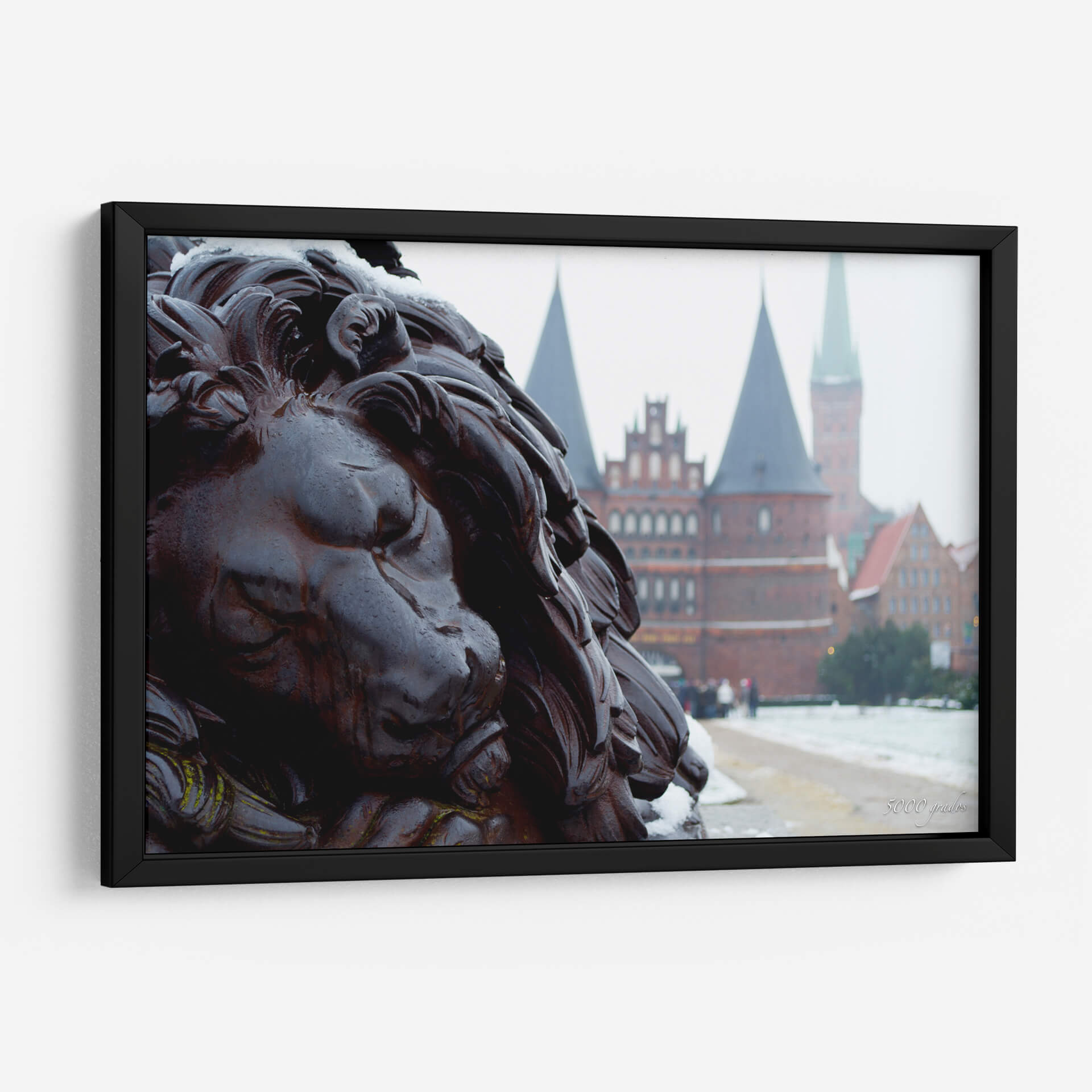 Sumérgete en la majestuosidad de "Guardián de Lübeck 2", una obra de arte que captura la imponente presencia de un león esculpido, con detalles intrincados que evocan fuerza y nobleza. La composición fotográfica sitúa al espectador en primer plano, permitiendo apreciar la textura y el carácter de la escultura, mientras que al fondo se vislumbran las distintivas torres y edificios de estilo gótico-báltico de Lübeck, envueltos en una atmósfera invernal. Los colores predominantes son los tonos oscuros y ricos de la escultura, contrastando con la paleta más suave y brumosa del paisaje urbano, salpicado por la nieve y el cielo nublado. Esta pieza es ideal para quienes buscan añadir un toque de elegancia histórica y poder simbólico a sus espacios. Perfecto para salas de estar, estudios o entradas que requieran un punto focal audaz y evocador. "Guardián de Lübeck 2" no es solo una imagen, es una declaración de estilo y una invitación a la reflexión sobre la historia y la resiliencia. Un cuadro decorativo que transforma cualquier ambiente en una galería personal con carácter y distinción.