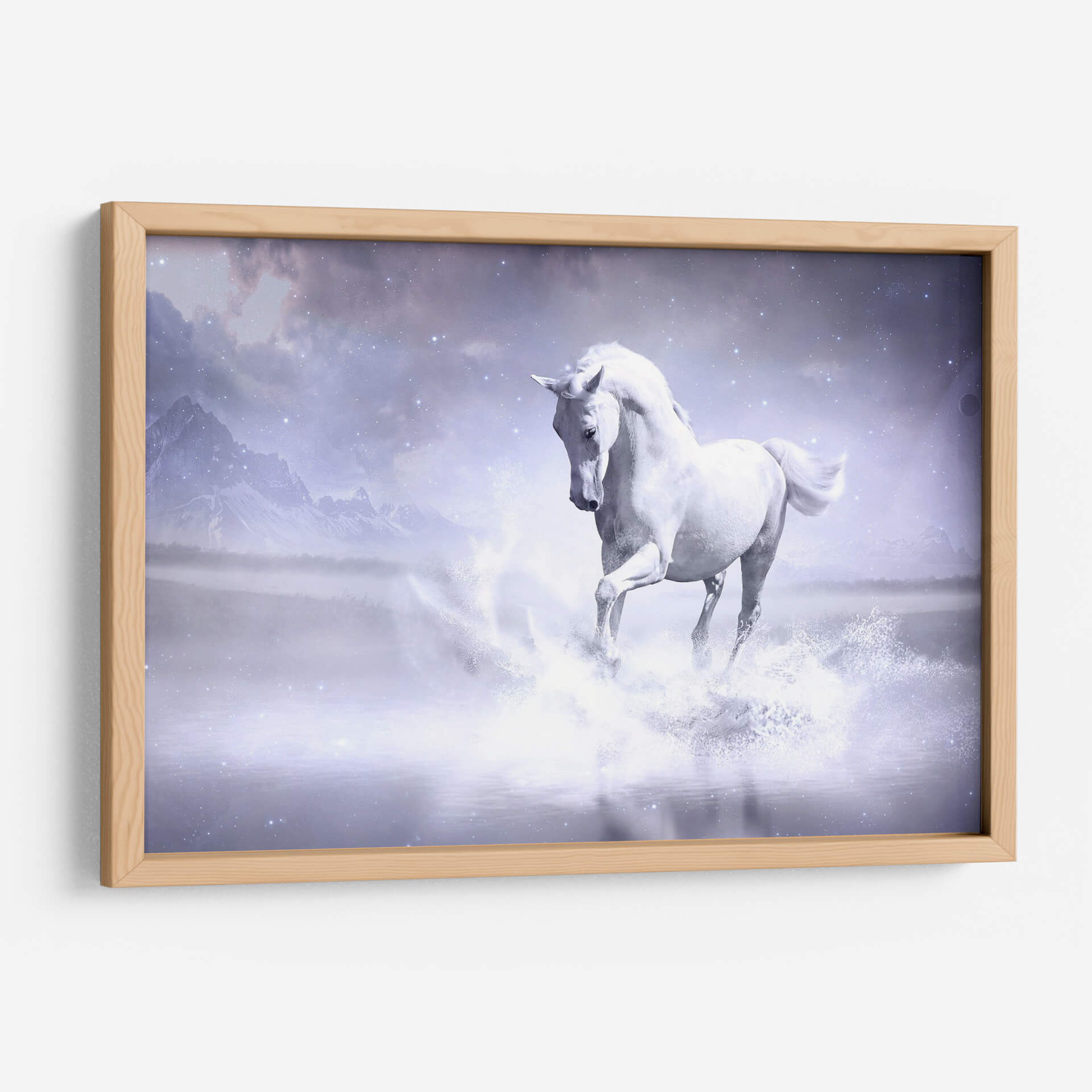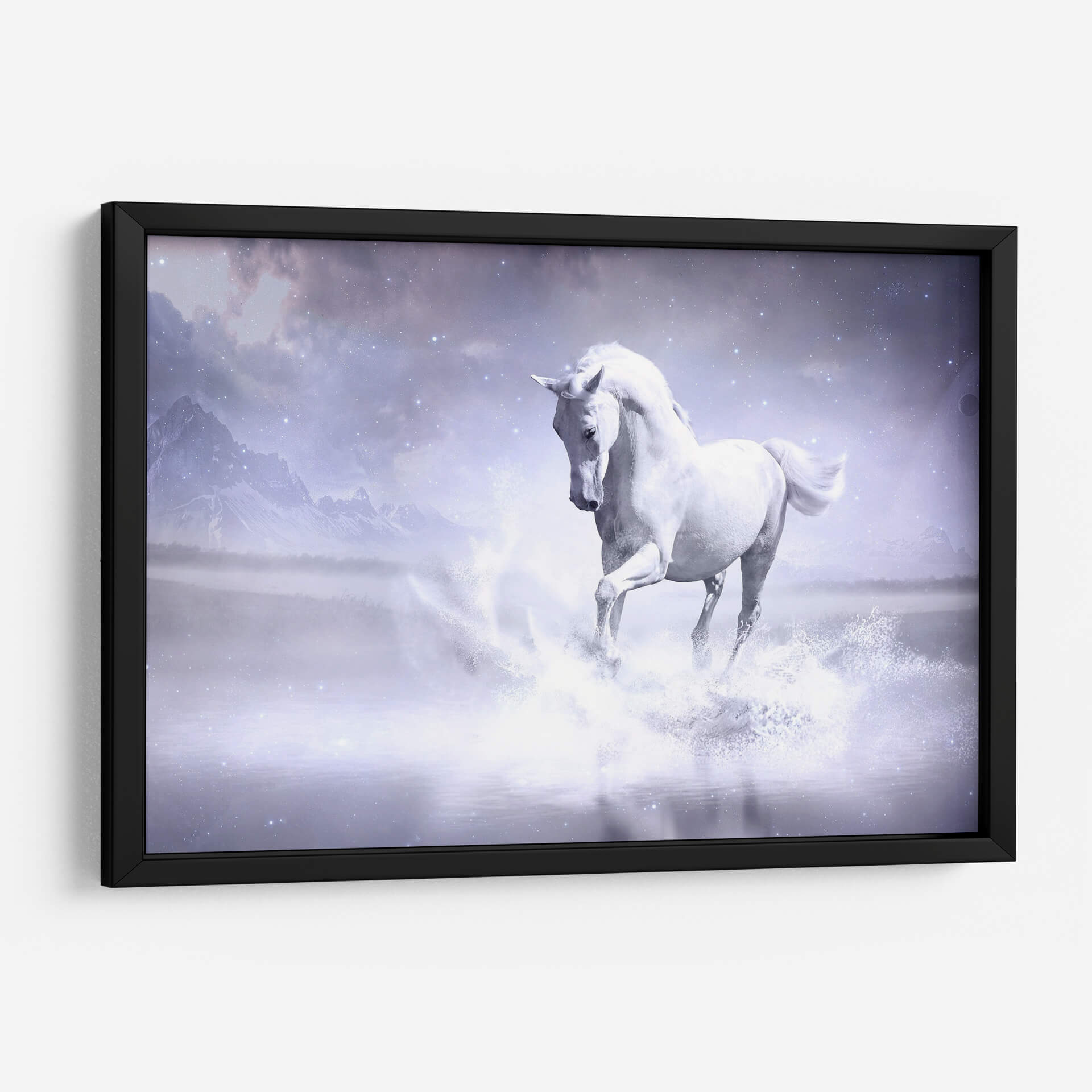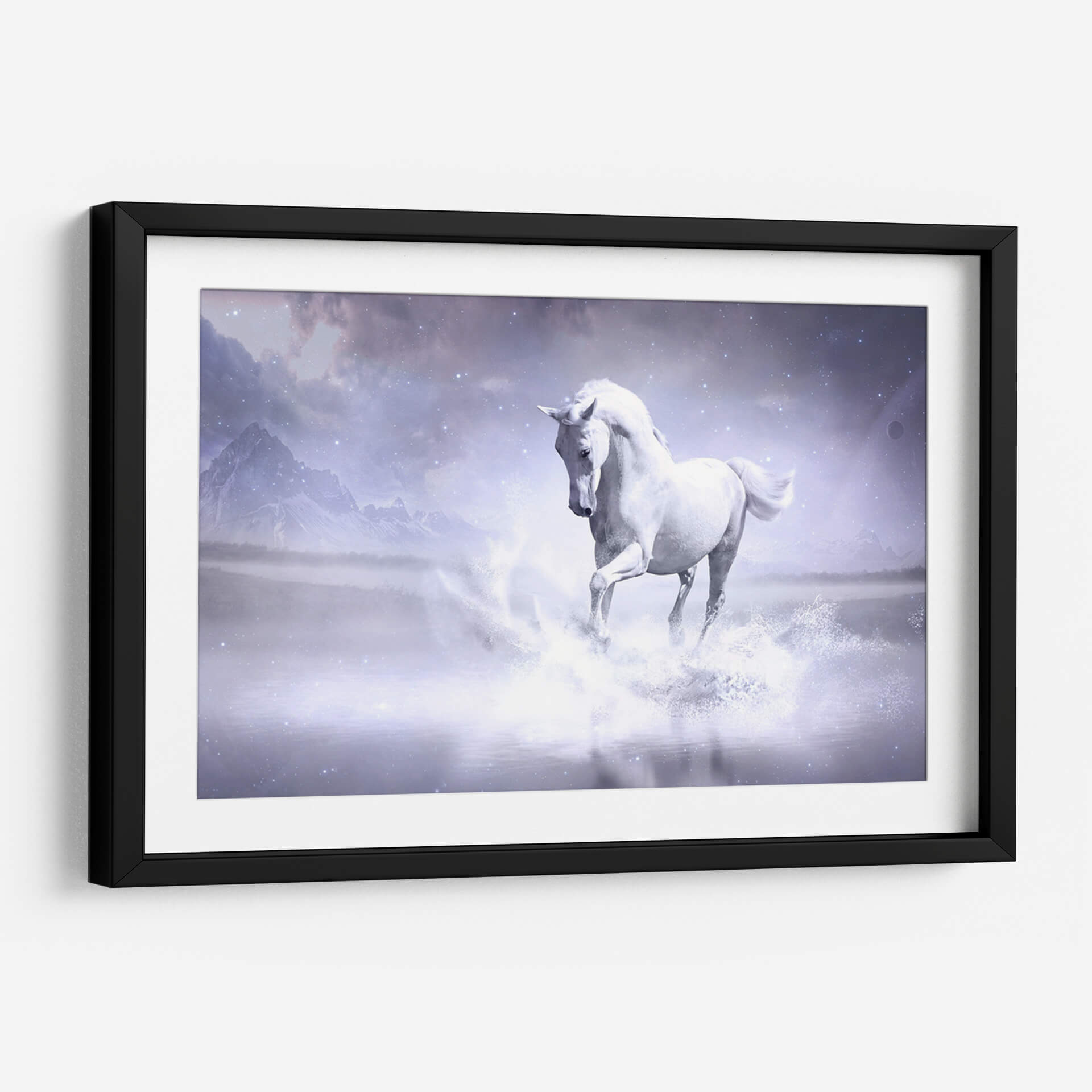 Sumérgete en un universo onírico con "Caballo Blanco en su Universo", una obra de arte digital que captura la majestuosidad y la fuerza de un corcel blanco en pleno galope a través de aguas etéreas. Los tonos fríos y el vibrante contraste entre la pureza del caballo y el místico fondo estrellado crean una atmósfera de ensueño y libertad. Las montañas nevadas y el cielo salpicado de estrellas añaden un toque de fantasía, haciendo de esta pieza un elemento decorativo cautivador para cualquier espacio que busque serenidad y un toque de magia. Los detalles de las salpicaduras de agua, capturadas en el momento justo, transmiten una sensación de dinamismo y poder indomable. Ideal para salones modernos, dormitorios que invitan al descanso o estudios que inspiren creatividad, este cuadro decorativo es una invitación a soñar despierto y a conectar con la energía pura de la naturaleza y el cosmos. Su estilo digital y su composición dinámica lo convierten en un punto focal que atraerá miradas y conversaciones, aportando una sensación de paz y asombro a tu decoración.