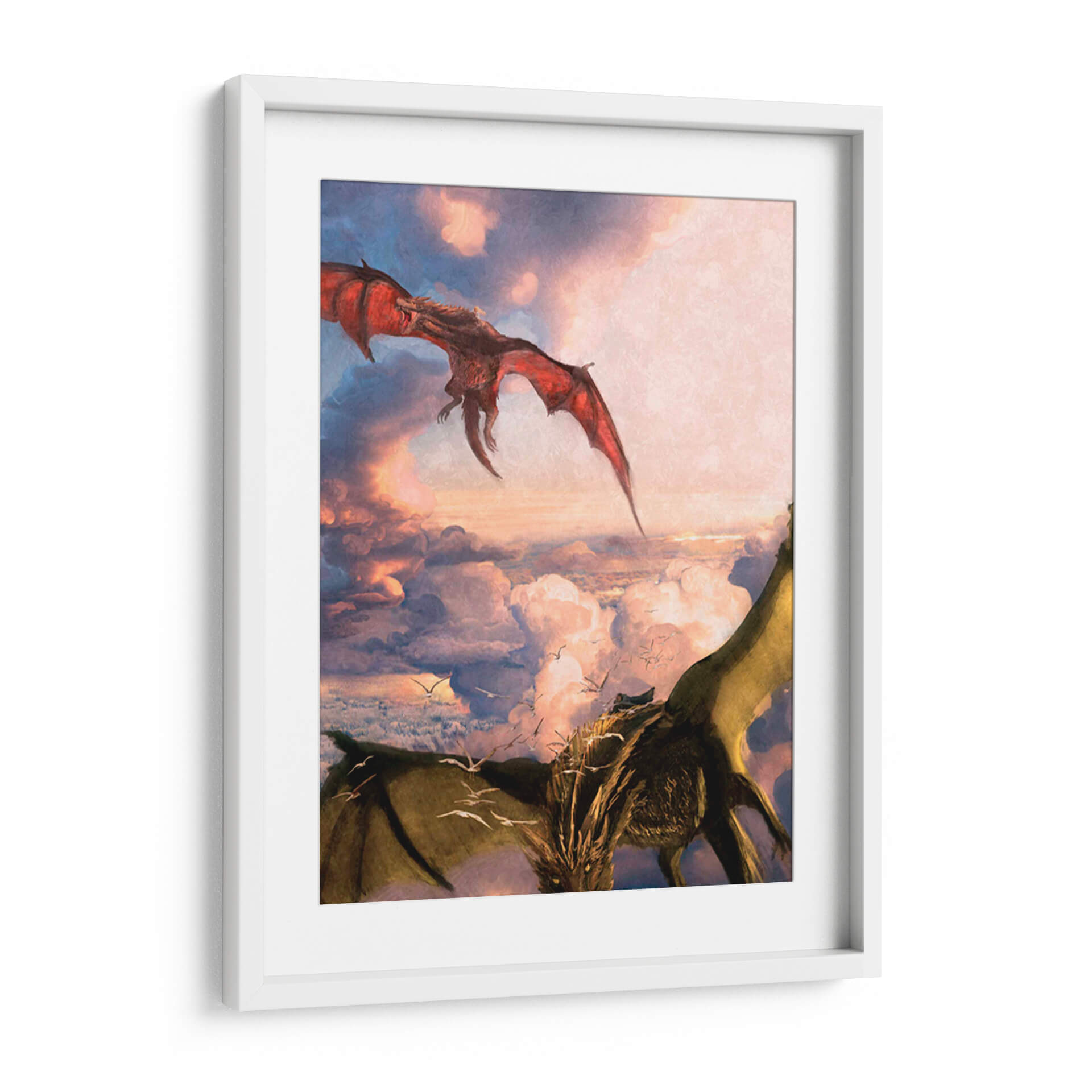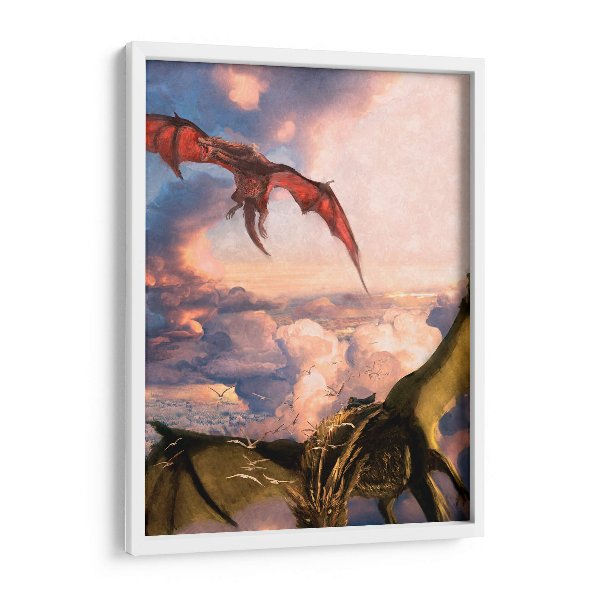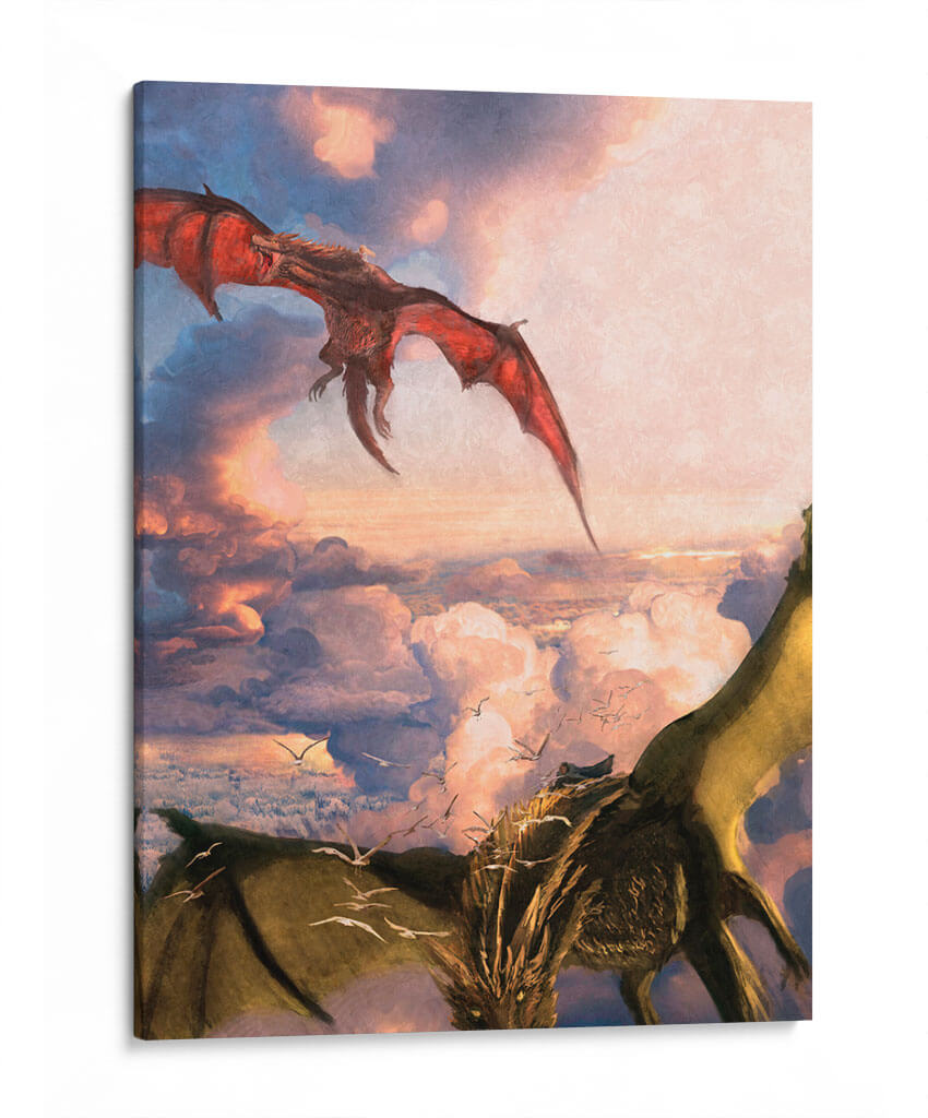 Embárcate en un viaje épico con "El vuelo de Jon y Daenerys", un cuadro decorativo que captura la majestuosidad y el misterio de criaturas legendarias surcando cielos tormentosos. Esta obra maestra visual presenta dos dragones imponentes en pleno vuelo, uno con escamas carmesí intensas y el otro en tonos dorados y terrosos, creando un contraste dinámico. El cielo está adornado con nubes dramáticas, teñidas por los tonos cálidos del atardecer o amanecer, que añaden una atmósfera etérea y a la vez poderosa a la escena. Pequeños pájaros o criaturas aladas revolotean alrededor, añadiendo una capa de movimiento y vida salvaje a la composición. El estilo pictórico, con pinceladas visibles y una textura que evoca la pintura tradicional, dota a la obra de una profundidad y un carácter únicos. Ideal para salones modernos, estudios o cualquier espacio que busque una dosis de fantasía, aventura y poder. Este cuadro decorativo no solo embellece tu pared, sino que también invita a la contemplación de la fuerza y la libertad.