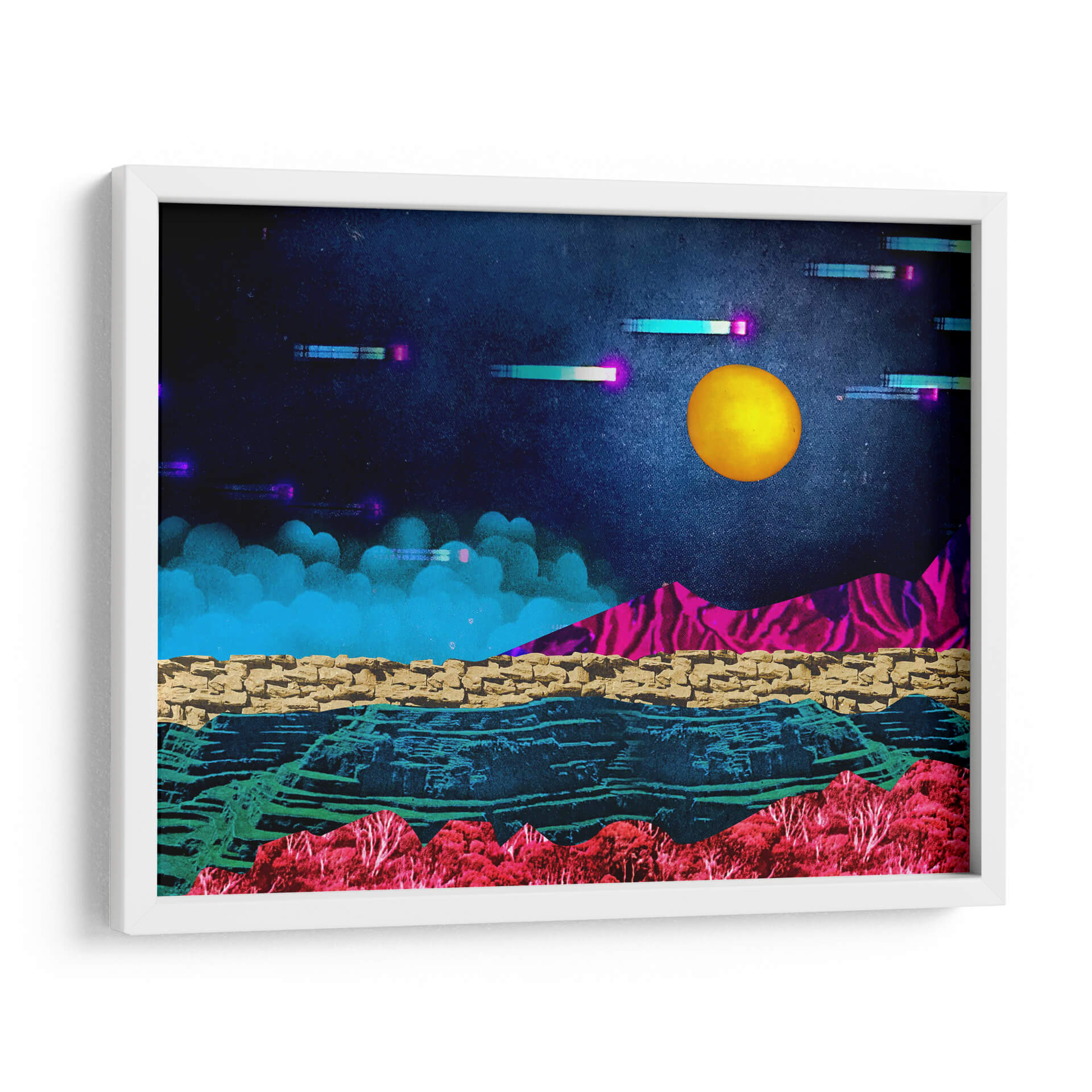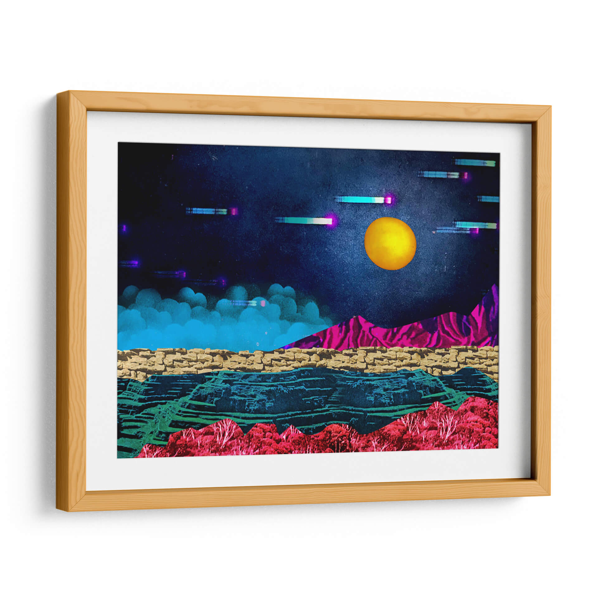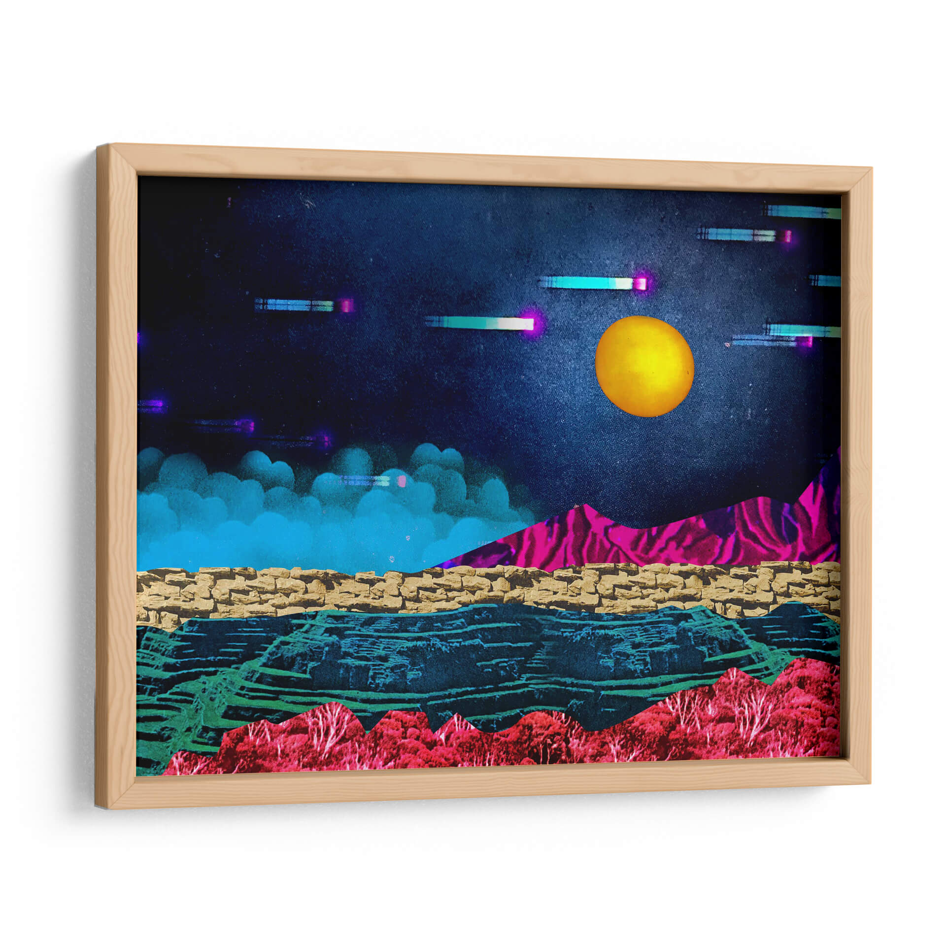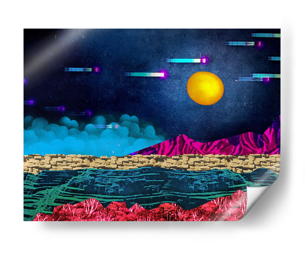 Sumérgete en la enigmática belleza de "Paisaje de Culto", una obra de arte digital que desafía la percepción y transporta al espectador a un reino onírico. Esta pieza destaca por su audaz yuxtaposición de elementos naturales y surrealistas, creando un paisaje que se siente a la vez familiar y extrañamente alienígena. Una esfera solar de un amarillo vibrante domina el cielo nocturno estrellado, proyectando una luz etérea sobre formaciones montañosas psicodélicas en tonos fucsia y morados intensos. Las capas inferiores revelan una textura de roca dorada y formaciones geológicas en vibrantes azules y verdes, culminando en un primer plano de árboles de un rojo carmesí intenso, que sugieren una flora exótica. La atmósfera es misteriosa y contemplativa, invitando a la reflexión sobre la naturaleza, el cosmos y lo desconocido. Las estelas de luz azul y púrpura que cruzan el cielo añaden un toque de ciencia ficción y dinamismo, sugiriendo movimiento y exploración. Ideal para quienes buscan una decoración de pared que provoque conversaciones y despierte la imaginación, este cuadro decorativo es perfecto para salas de estar modernas, estudios creativos u oficinas que busquen un toque de originalidad y vanguardia. "Paisaje de Culto" es más que una imagen; es una invitación a explorar territorios inexplorados de la mente y el espacio.
