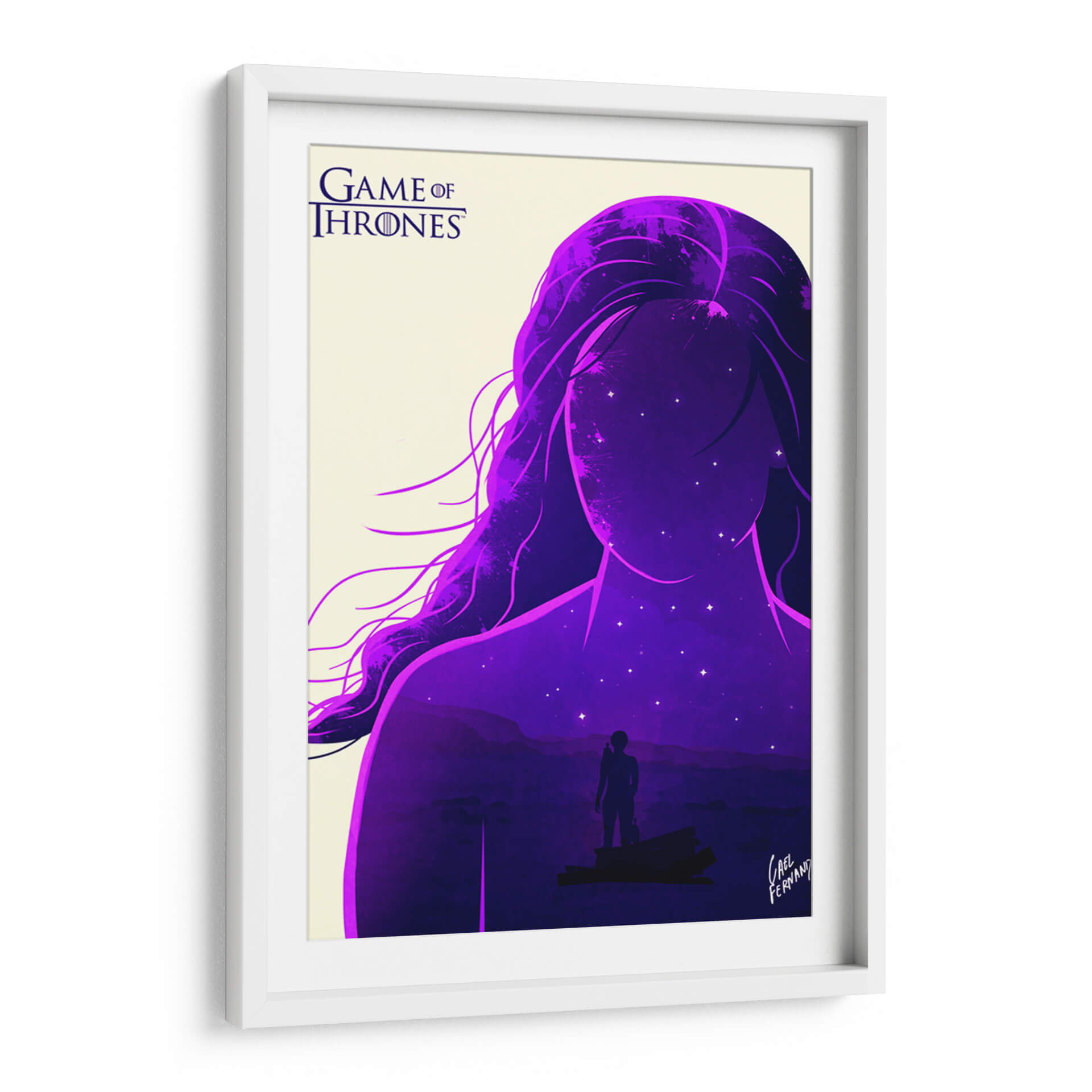Sumérgete en la majestuosidad de 'Purple Daenerys', una obra de arte digital que captura la esencia de la fuerza y el misterio. Este cuadro decorativo presenta una silueta femenina etérea en un vibrante tono púrpura, evocando un paisaje nocturno estrellado que se fusiona con la figura. Las delicadas pinceladas y el uso magistral del color morado crean una atmósfera de ensueño y poder. Dentro de la figura, se vislumbra un pequeño personaje solitario en medio de un paisaje de montañas, sugiriendo un viaje interior o una narrativa épica. El estilo minimalista y la composición audaz hacen de esta pieza un punto focal cautivador para cualquier espacio. Ideal para salones modernos, estudios o dormitorios que busquen un toque de fantasía y sofisticación. 'Purple Daenerys' no es solo una decoración, es una invitación a soñar con reinos y destinos. La paleta de púrpuras profundos y el contraste con el fondo claro añaden profundidad y carácter, haciendo de este cuadro una pieza versátil que combina con una variedad de estilos decorativos. Añade un toque de magia inspirada en historias épicas a tu hogar con esta impresionante obra de arte. El nombre de la obra y la firma del artista, Cael Fernando, añaden autenticidad y valor a esta pieza única.
