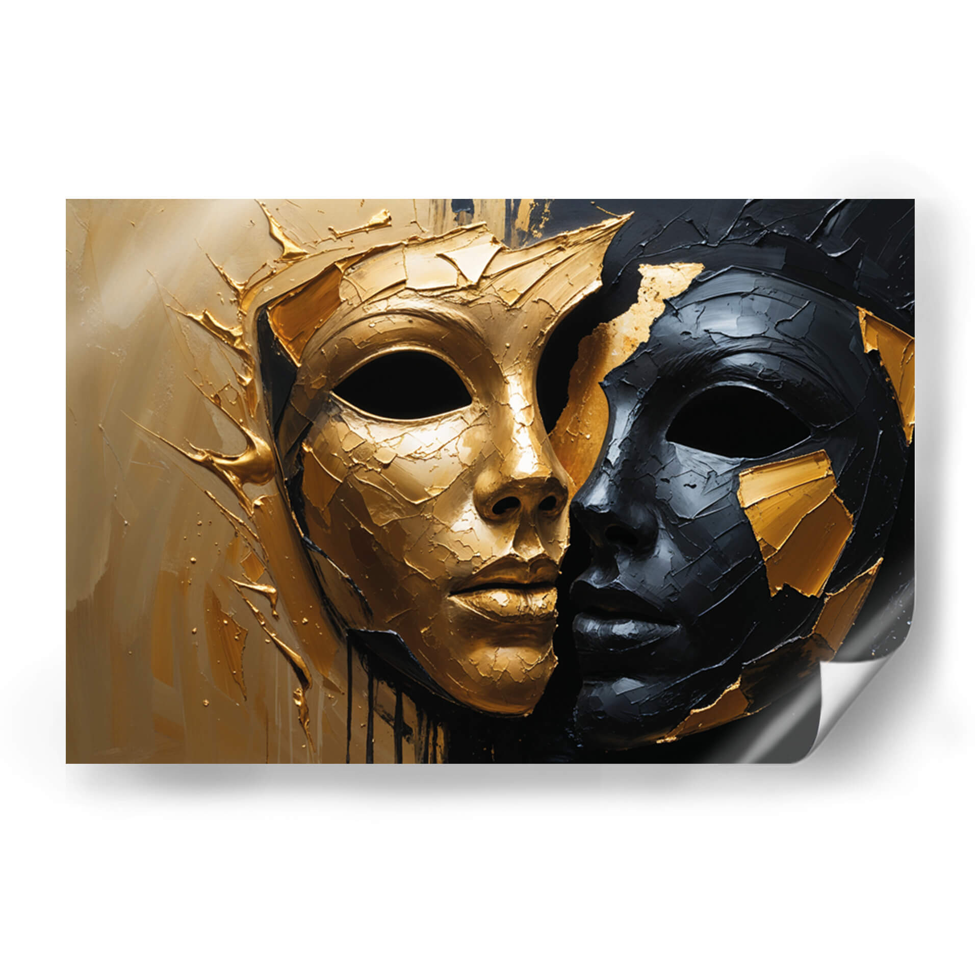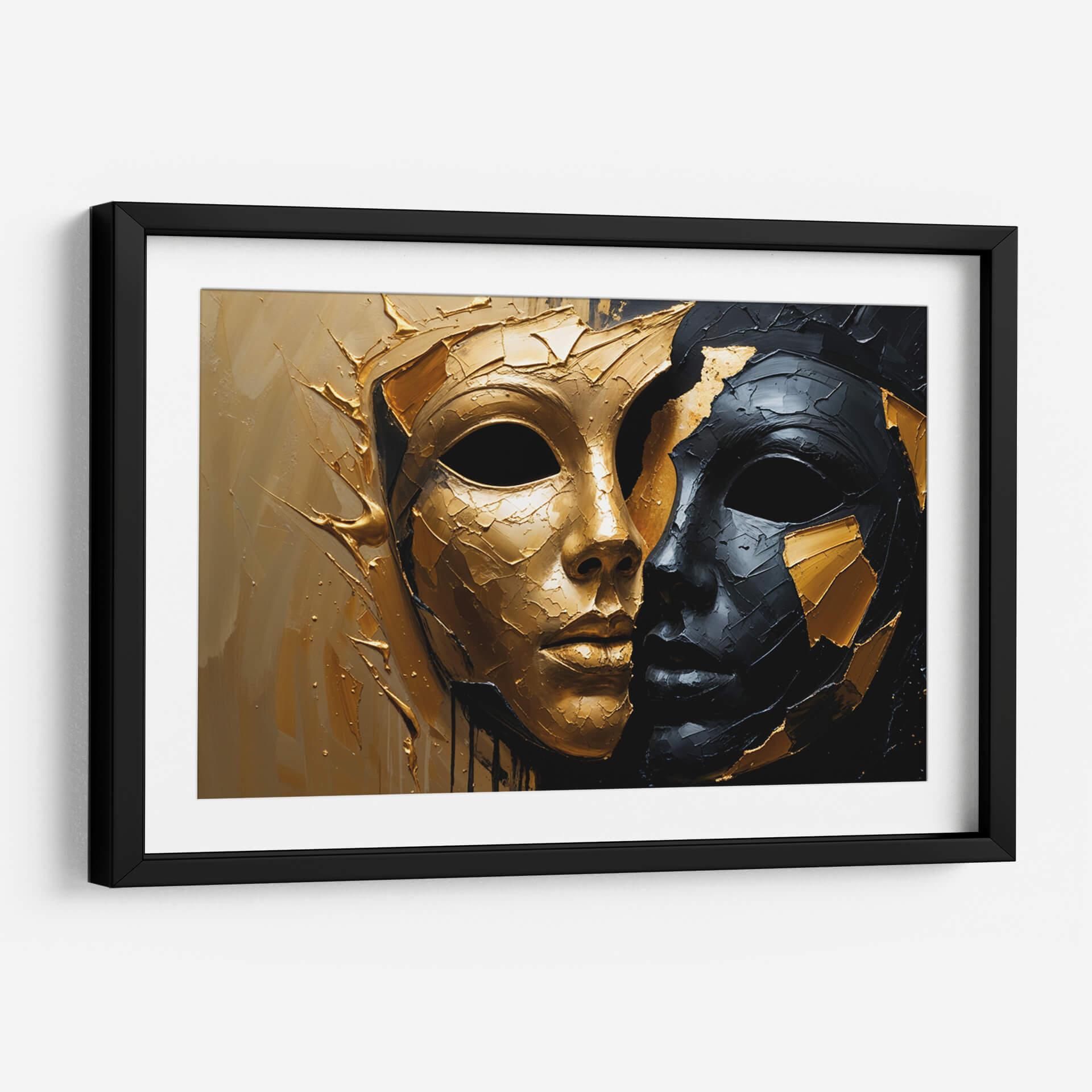 Sumérgete en el misterio y la dualidad con "Bajo la Máscara", una obra de arte contemporáneo que desafía la percepción. Este cuadro decorativo presenta dos rostros enigmáticos, uno bañado en tonos dorados y ocres vibrantes, el otro envuelto en sombras profundas de negro. La técnica expresionista, con empastes de pintura texturizados y un juego audaz de luces y sombras, crea una sensación de profundidad y drama impactante. Las máscaras, con sus formas fragmentadas y su mirada vacía, invitan a la reflexión sobre la identidad, las apariencias y las verdades ocultas. La paleta de colores, dominada por el contraste entre el oro brillante y el negro intenso, aporta un toque de lujo y sofisticación, a la vez que evoca una atmósfera de intriga y elegancia. "Bajo la Máscara" es una pieza perfecta para espacios que buscan un punto focal audaz y conceptual, como un salón moderno, un estudio o un recibidor. Su fuerte impacto visual y su profundidad temática la convierten en una elección ideal para quienes aprecian el arte que provoca pensamiento y conversación, añadiendo un toque de misterio y glamour a cualquier ambiente.