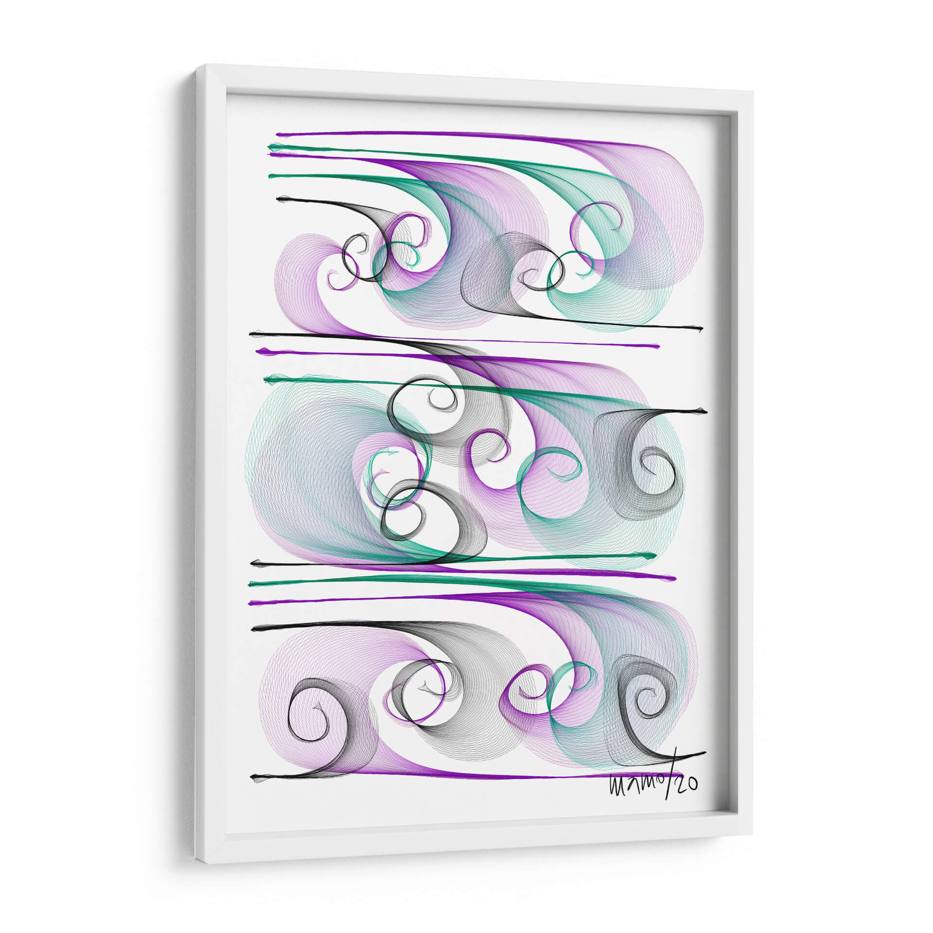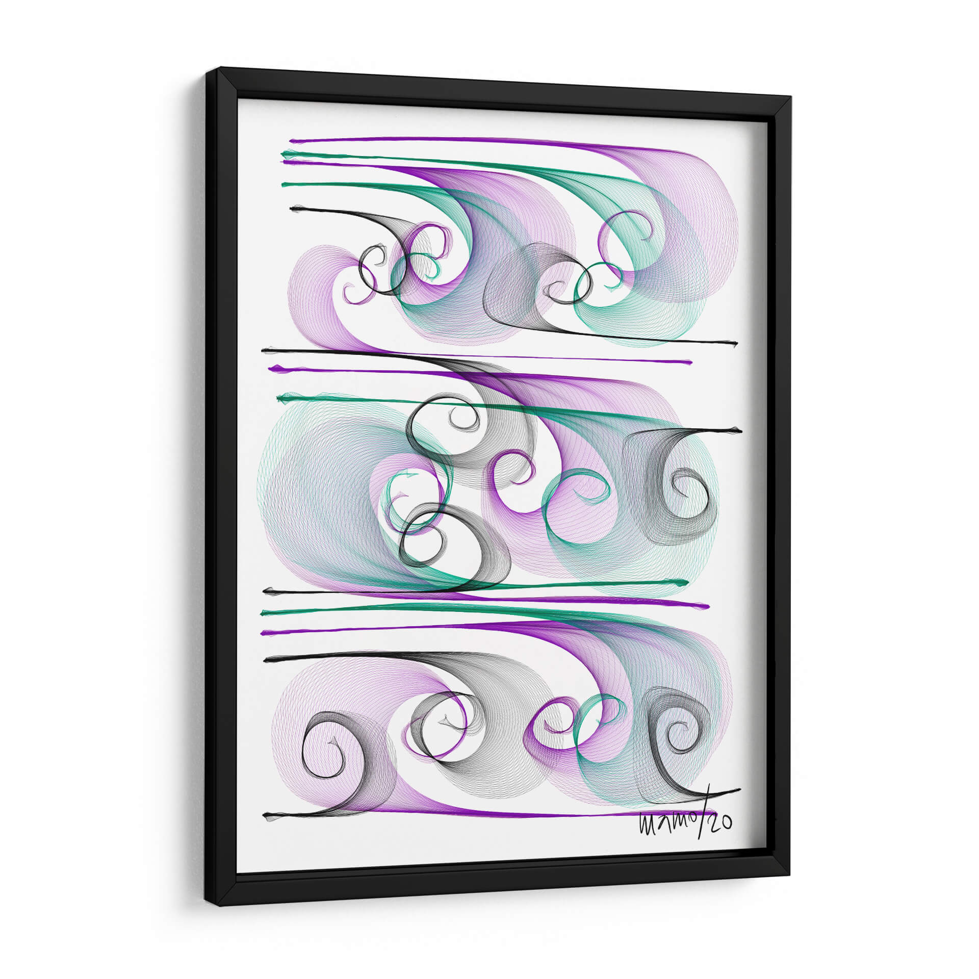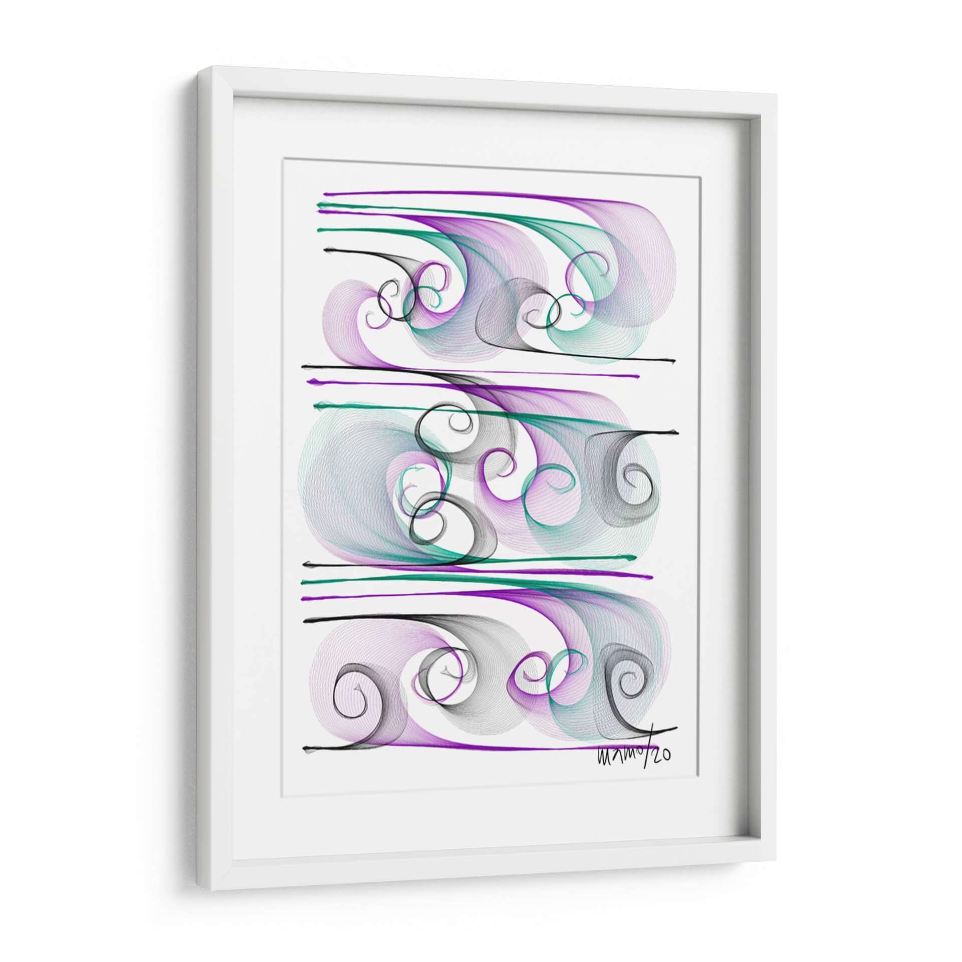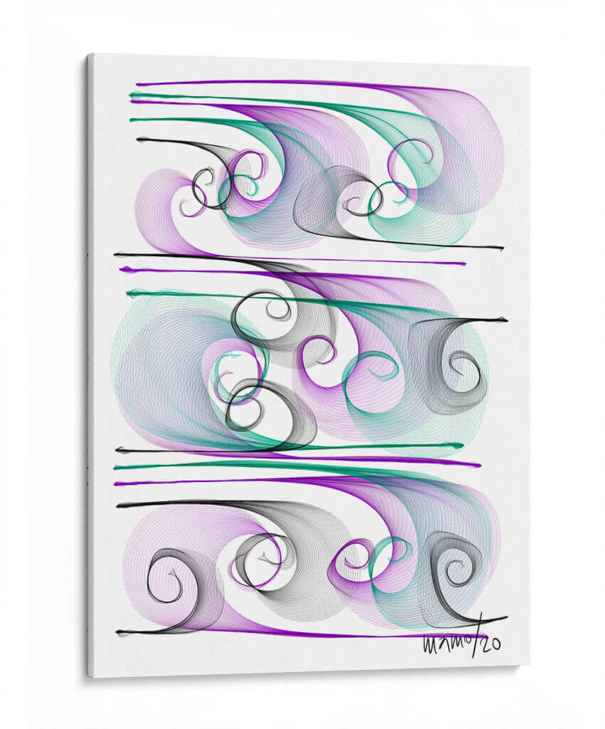 Sumérgete en la fluidez y elegancia de "Brisas", una obra de arte contemporáneo de Gina Villalobos que captura la esencia del movimiento y la serenidad. Esta pieza abstracta presenta una delicada coreografía de líneas fluidas y espirales en tonos púrpura, verde azulado y negro, creando un efecto visual hipnotizante sobre un fondo blanco nítido. La composición, dividida en tres secciones horizontales, evoca la sensación de olas suaves o corrientes de aire, aportando una atmósfera de calma y sofisticación a cualquier espacio. El estilo lineal y etéreo de Villalobos invita a la contemplación, convirtiendo "Brisas" en un punto focal ideal para salones modernos, oficinas serenas o dormitorios que buscan un toque de tranquilidad y belleza abstracta. Deja que esta obra maestra transporte tu imaginación y añada una dimensión de calma visual a tu decoración.