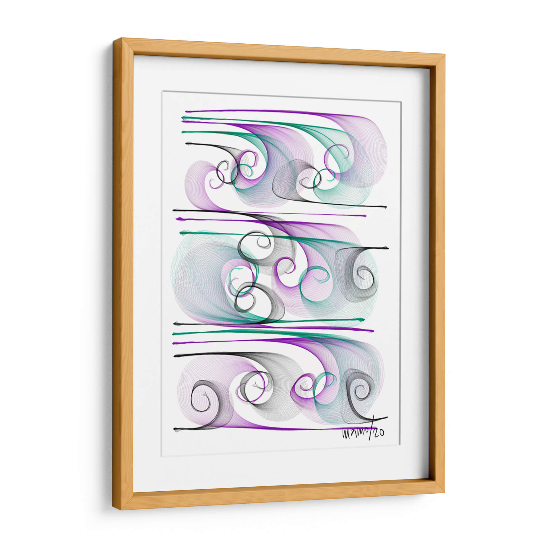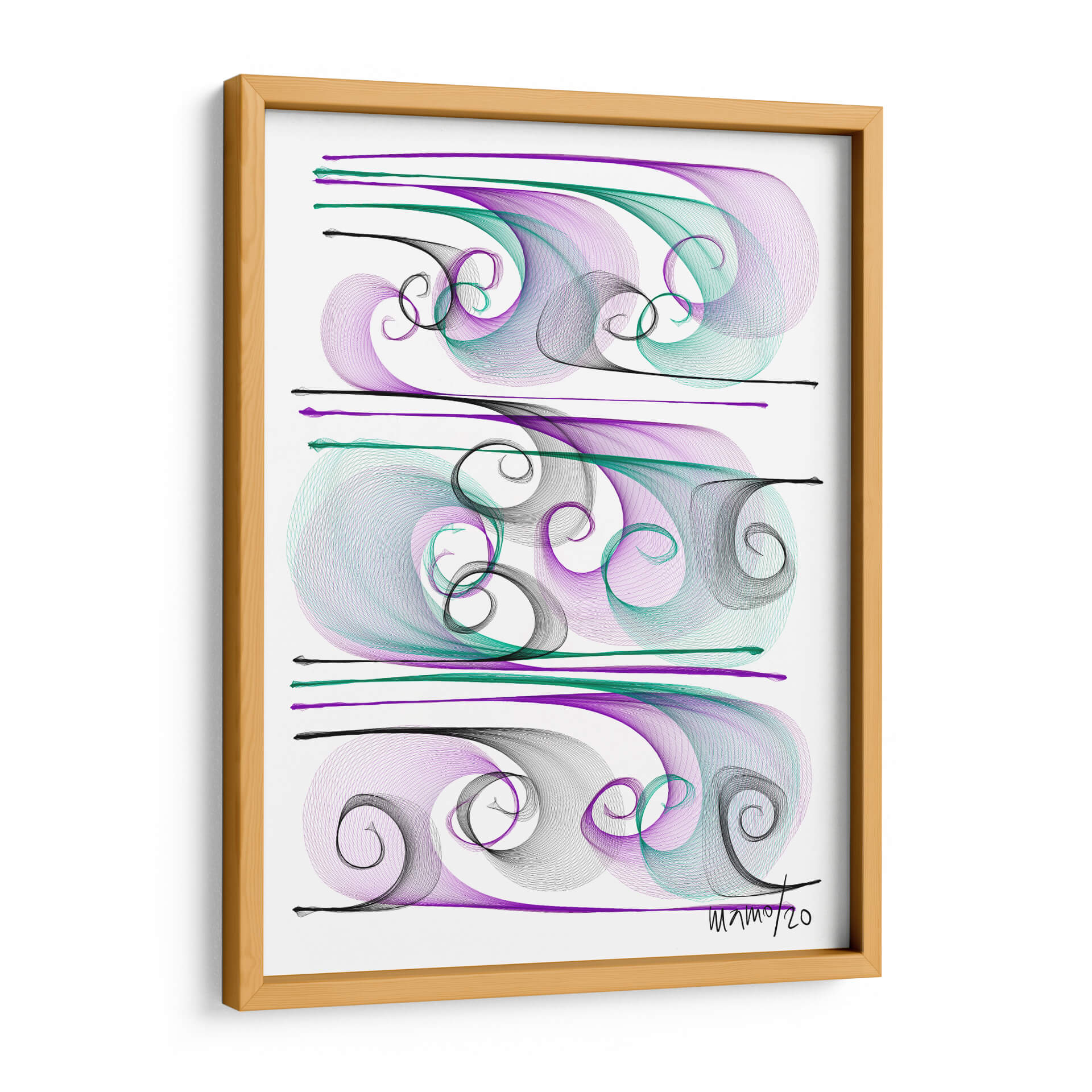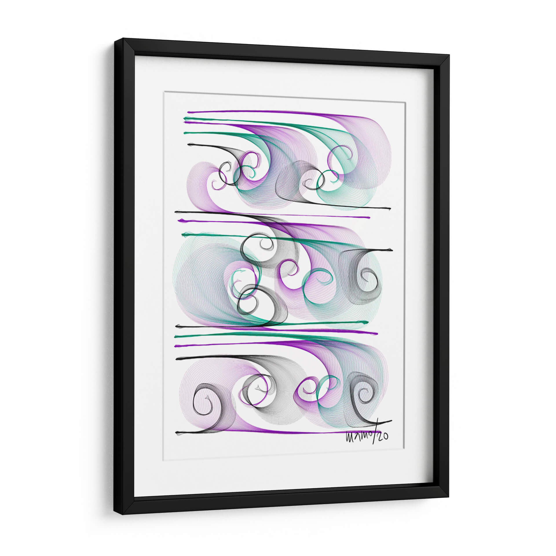 Sumérgete en la fluidez y elegancia de "Brisas", una obra de arte contemporáneo de Gina Villalobos que captura la esencia del movimiento y la serenidad. Esta pieza abstracta presenta una delicada coreografía de líneas fluidas y espirales en tonos púrpura, verde azulado y negro, creando un efecto visual hipnotizante sobre un fondo blanco nítido. La composición, dividida en tres secciones horizontales, evoca la sensación de olas suaves o corrientes de aire, aportando una atmósfera de calma y sofisticación a cualquier espacio. El estilo lineal y etéreo de Villalobos invita a la contemplación, convirtiendo "Brisas" en un punto focal ideal para salones modernos, oficinas serenas o dormitorios que buscan un toque de tranquilidad y belleza abstracta. Deja que esta obra maestra transporte tu imaginación y añada una dimensión de calma visual a tu decoración.