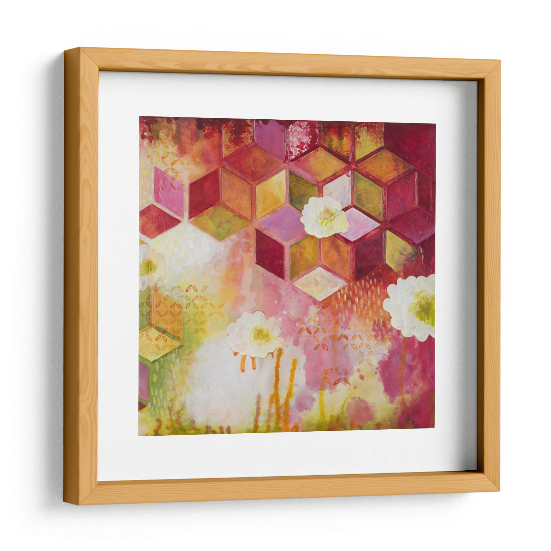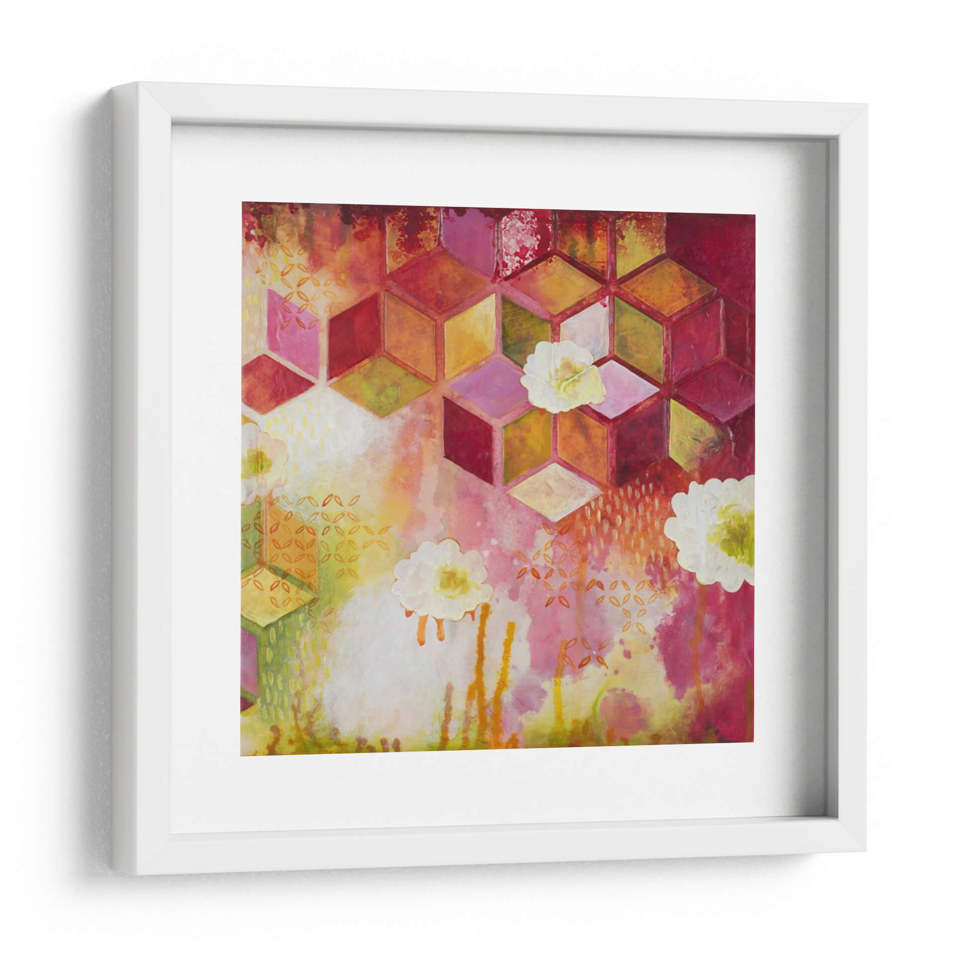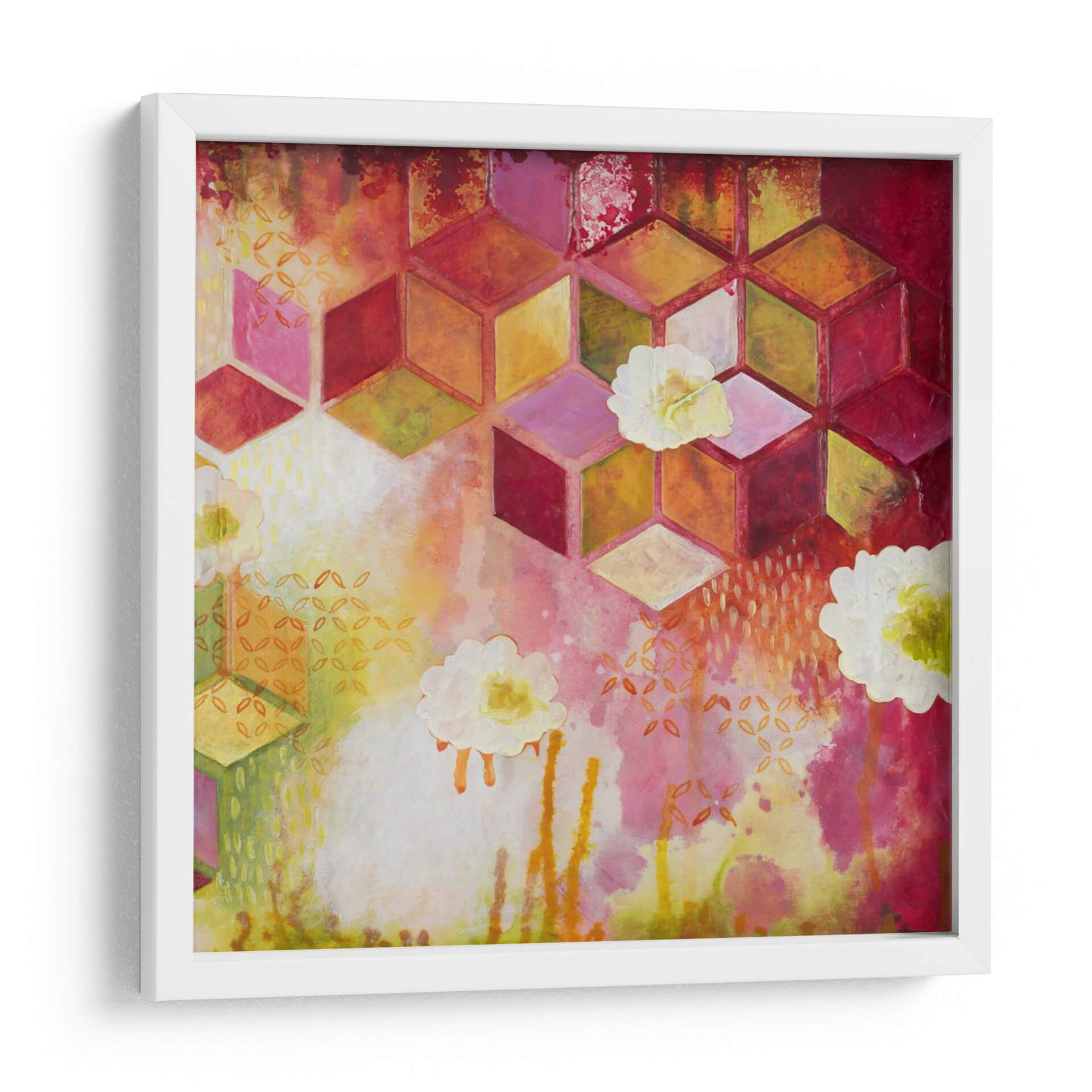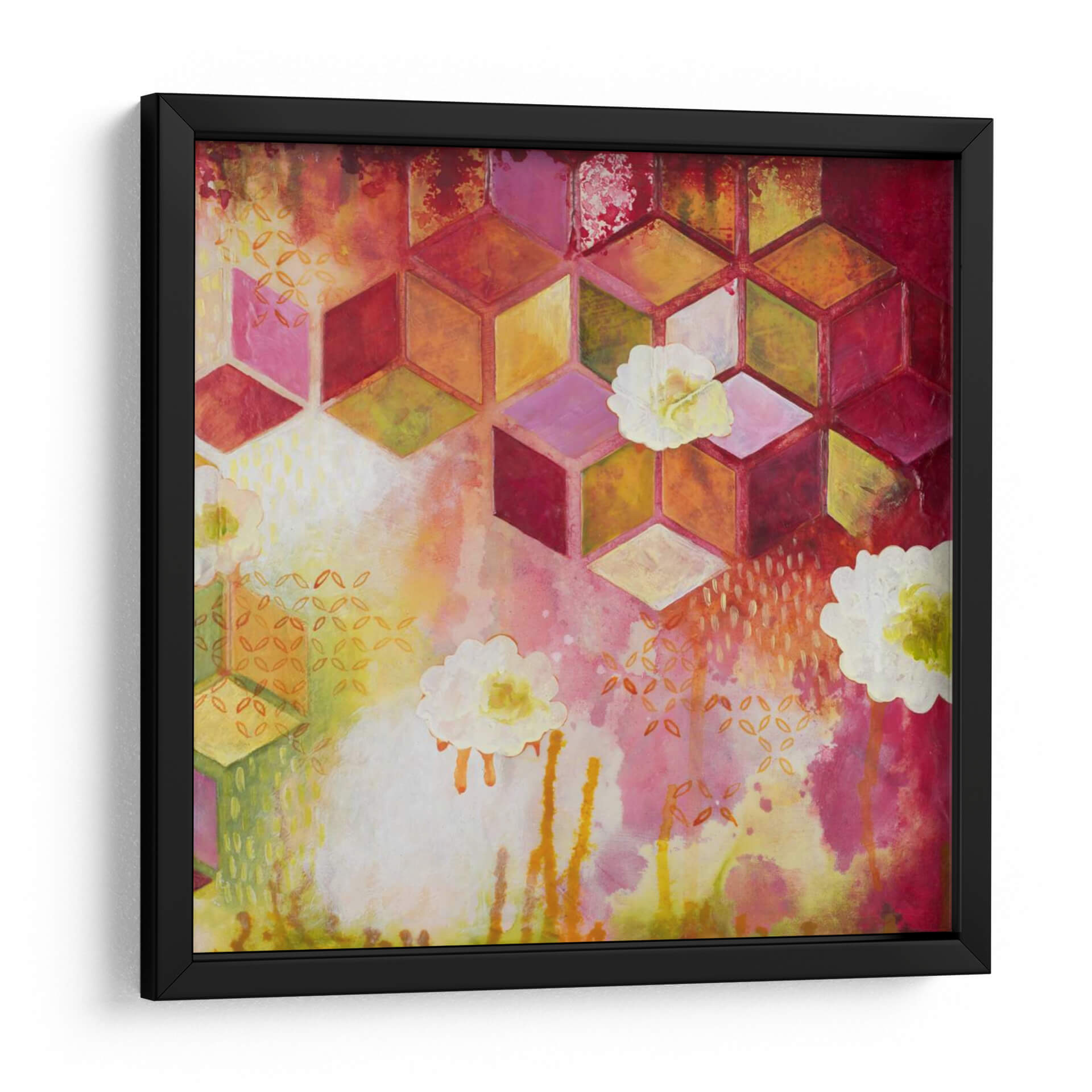 Sumérgete en la contemplación con "Camino De La Reflexión III", una obra de arte contemporáneo que invita a la introspección. Los colores vibrantes y cálidos, que van desde rojos profundos y naranjas energéticos hasta toques de rosa y amarillo brillante, crean una atmósfera dinámica y a la vez serena. La composición se caracteriza por un intrincado patrón de cubos tridimensionales superpuestos sobre un fondo texturizado que evoca acuarela y sutiles motivos florales o decorativos, creando una sensación de profundidad y movimiento. Tres delicadas flores blancas emergen de la composición, aportando puntos de luz y suavidad que contrastan con las formas geométricas. Esta pieza es ideal para añadir un toque de color y sofisticación a tu sala de estar, estudio u oficina, transformando cualquier espacio en un refugio de inspiración y belleza. "Camino De La Reflexión III" es más que una simple decoración; es una invitación a explorar el paisaje interior, perfecta para quienes buscan arte que combine la modernidad geométrica con la delicadeza orgánica. Descubre cómo esta obra puede convertirse en el punto focal de tu hogar, llenándolo de energía positiva y estilo único.