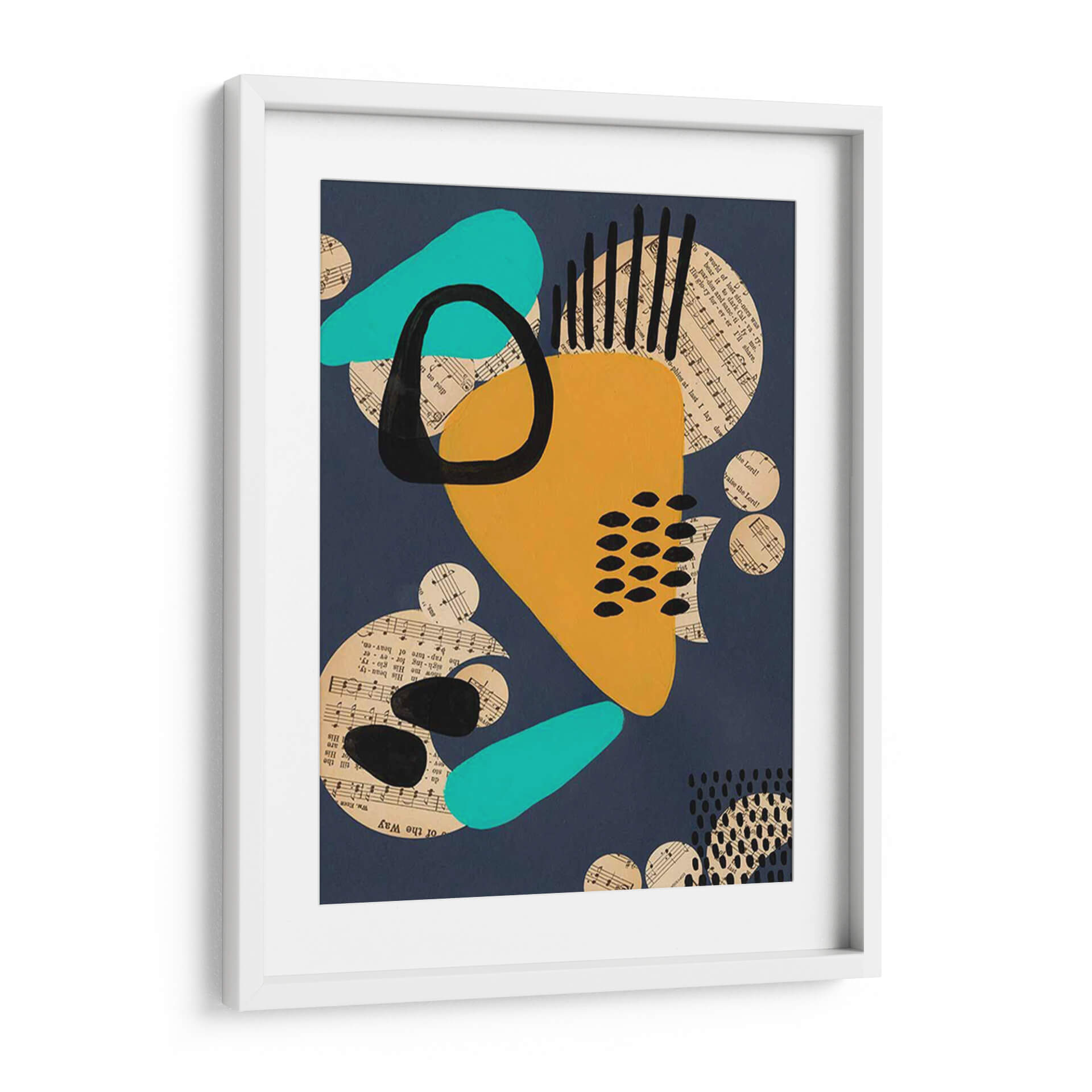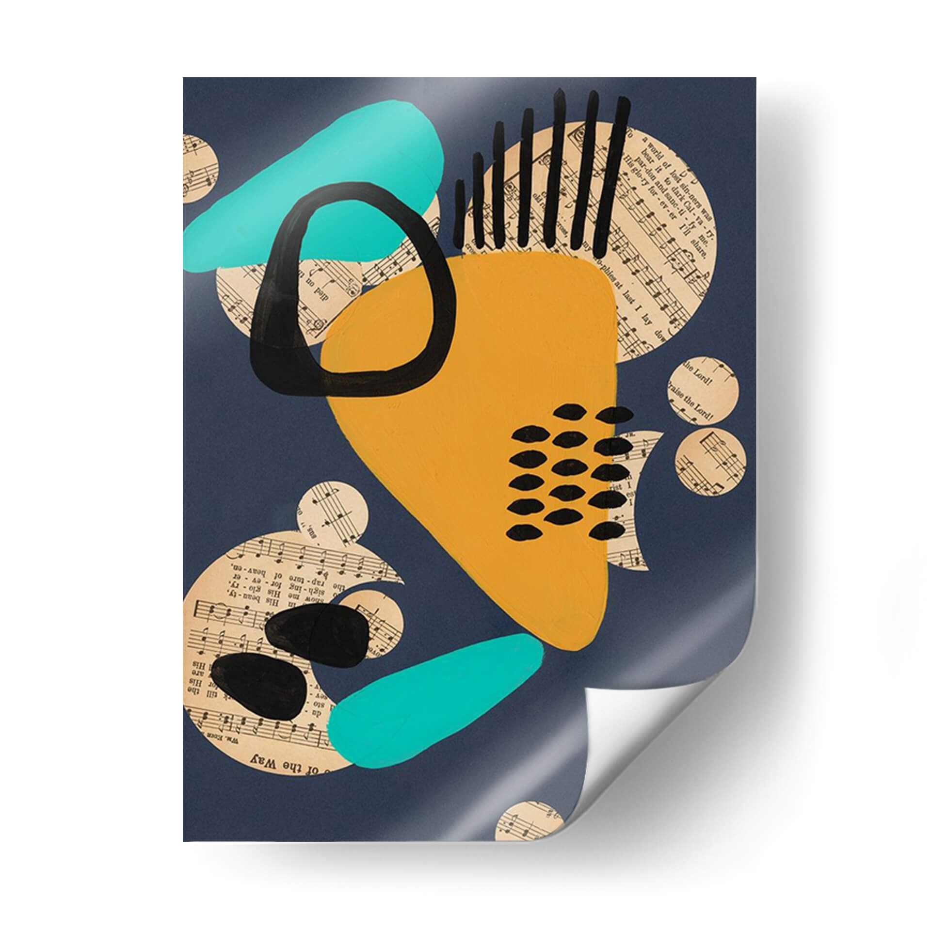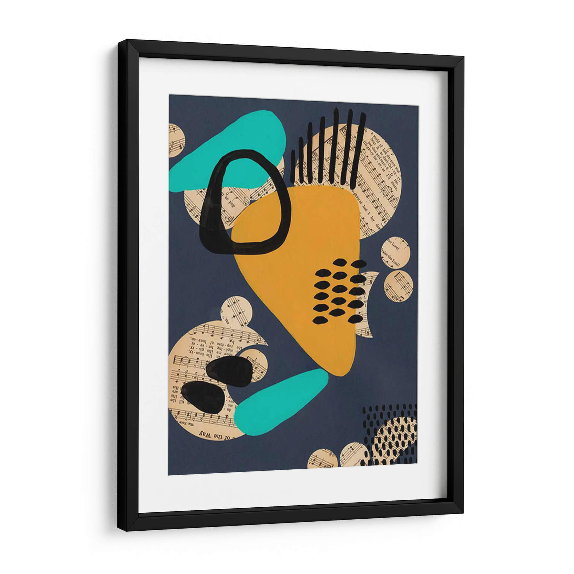 Sumérgete en la vibrante y enigmática obra 'Configuración Contemporánea IV' de Regina Moore. Este cuadro decorativo abstracto fusiona audaces formas geométricas con fragmentos de partituras musicales, creando una composición dinámica y llena de energía. La paleta de colores, dominada por un profundo azul marino, se ve realzada por toques de amarillo mostaza intenso, turquesa brillante y el contraste dramático del negro. Los círculos de música dispersos añaden una textura visual intrigante y sugieren una conexión subyacente entre el arte visual y la música. Las formas orgánicas y fluidas se entrelazan con elementos lineales y punteados, generando un equilibrio visual cautivador. Esta pieza es perfecta para aquellos que buscan añadir un toque moderno y sofisticado a su hogar u oficina. Ideal para salas de estar, estudios o cualquier espacio que requiera un punto focal audaz y contemporáneo. La obra de Regina Moore invita a la contemplación, estimulando la imaginación y aportando una atmósfera de creatividad y modernidad a cualquier ambiente, convirtiéndose en una pieza de conversación única.