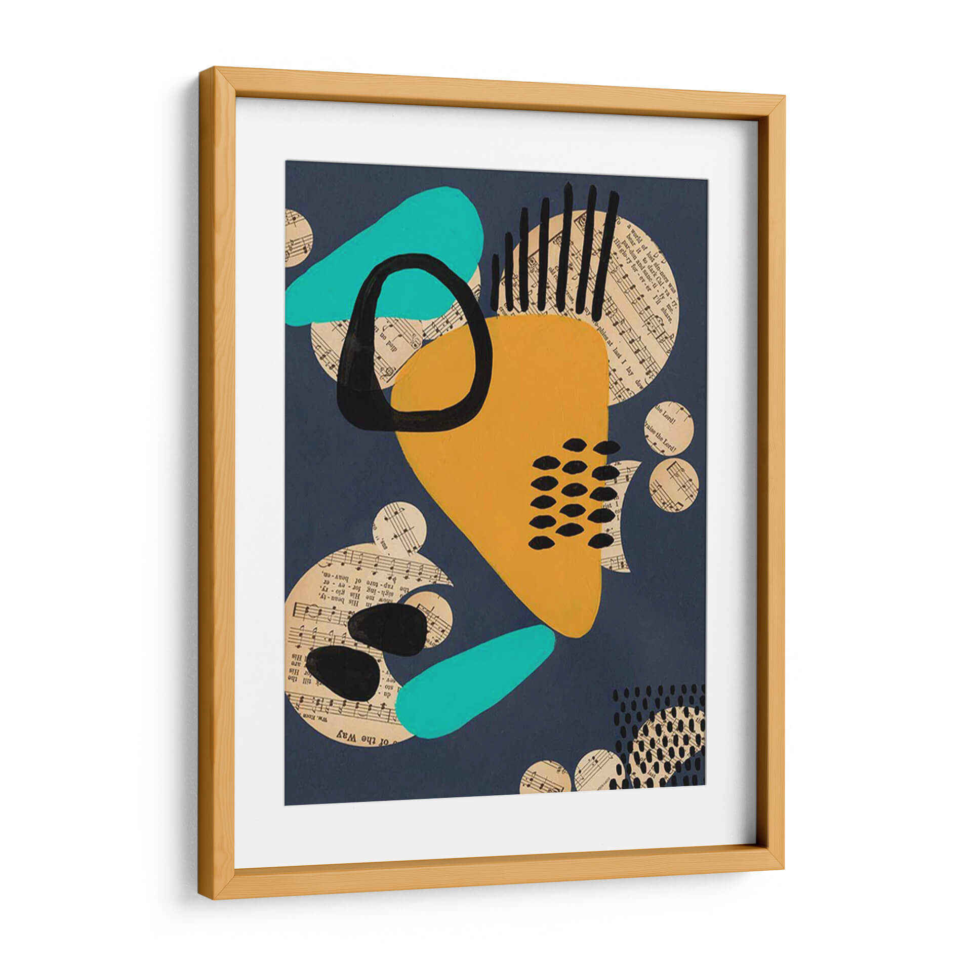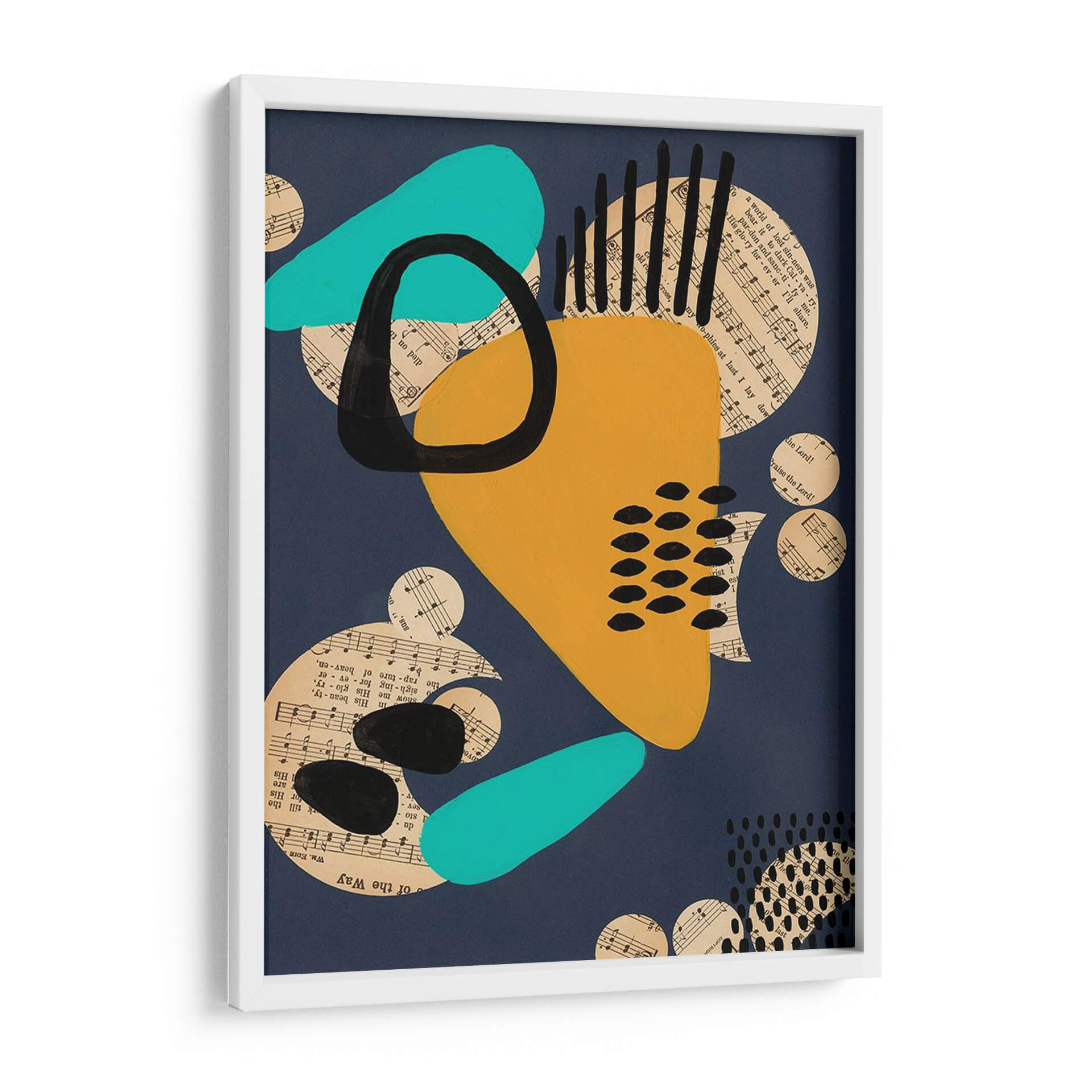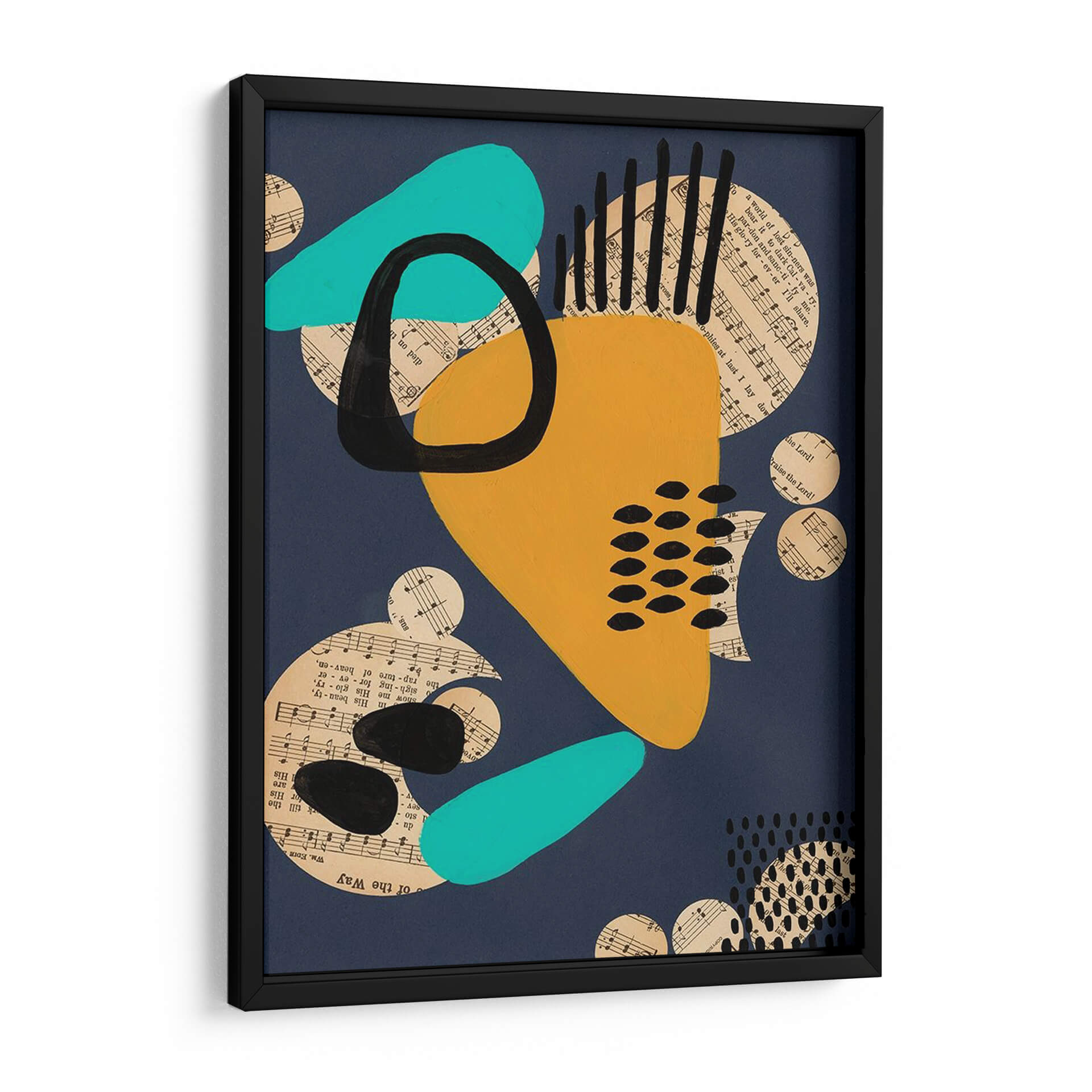 Sumérgete en la vibrante y enigmática obra 'Configuración Contemporánea IV' de Regina Moore. Este cuadro decorativo abstracto fusiona audaces formas geométricas con fragmentos de partituras musicales, creando una composición dinámica y llena de energía. La paleta de colores, dominada por un profundo azul marino, se ve realzada por toques de amarillo mostaza intenso, turquesa brillante y el contraste dramático del negro. Los círculos de música dispersos añaden una textura visual intrigante y sugieren una conexión subyacente entre el arte visual y la música. Las formas orgánicas y fluidas se entrelazan con elementos lineales y punteados, generando un equilibrio visual cautivador. Esta pieza es perfecta para aquellos que buscan añadir un toque moderno y sofisticado a su hogar u oficina. Ideal para salas de estar, estudios o cualquier espacio que requiera un punto focal audaz y contemporáneo. La obra de Regina Moore invita a la contemplación, estimulando la imaginación y aportando una atmósfera de creatividad y modernidad a cualquier ambiente, convirtiéndose en una pieza de conversación única.