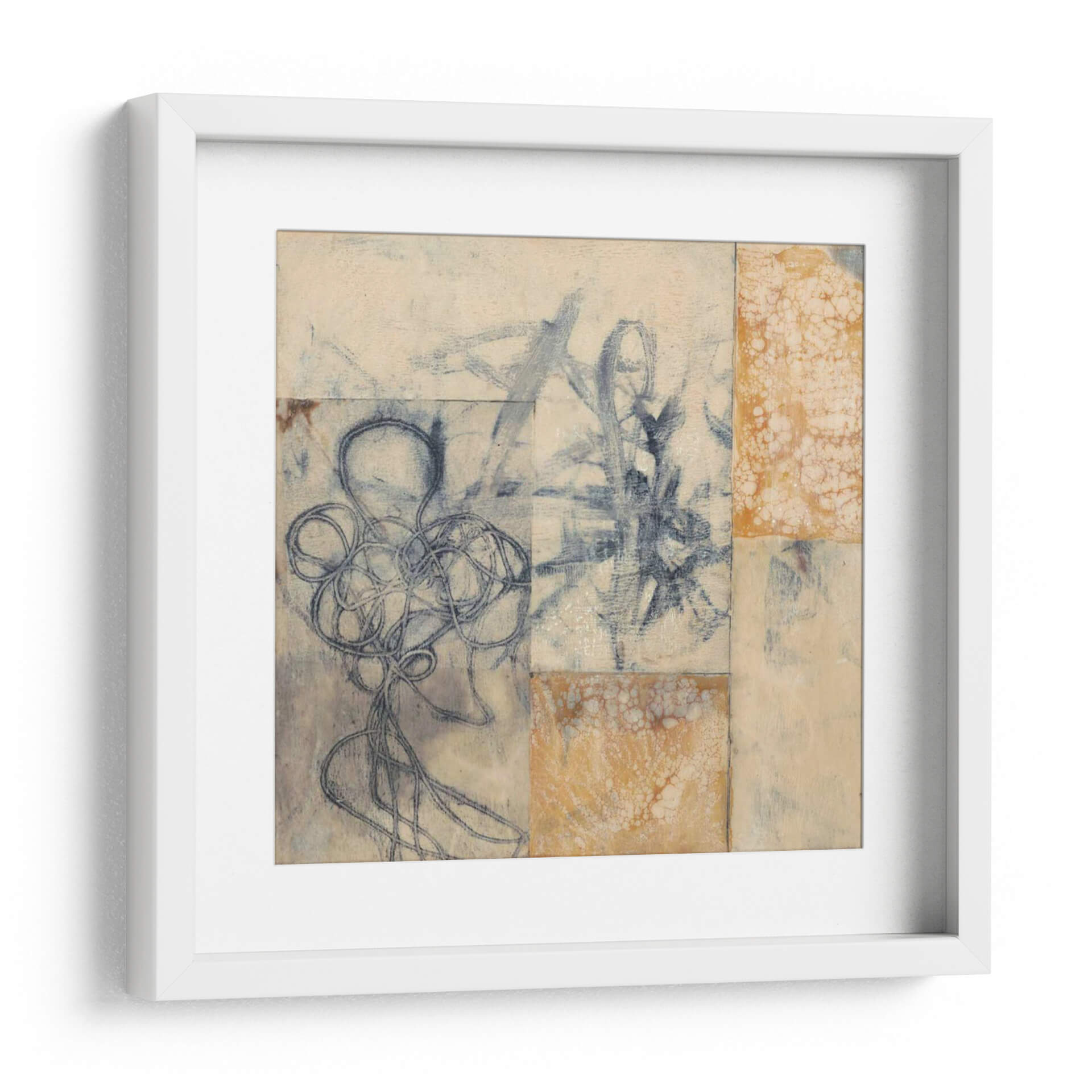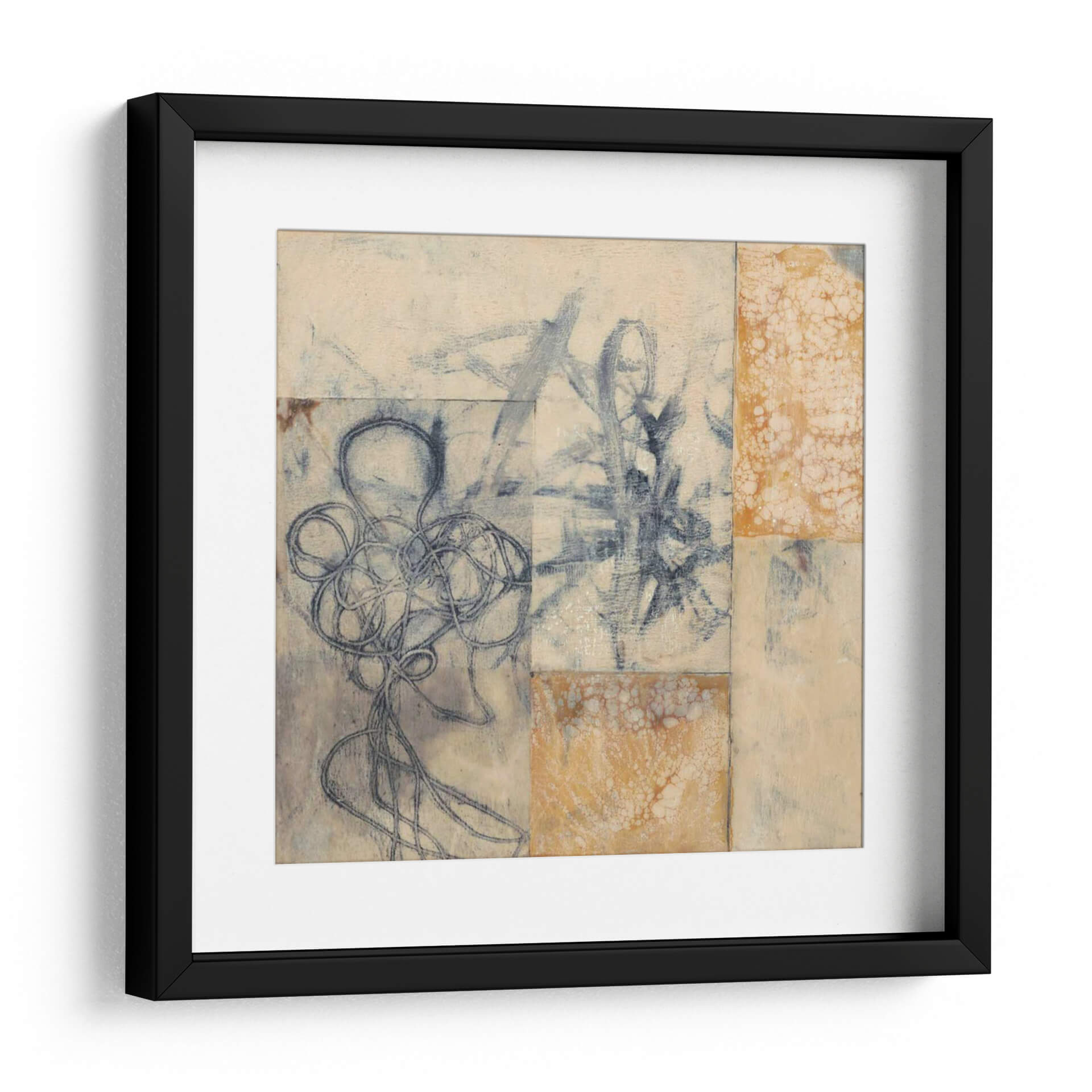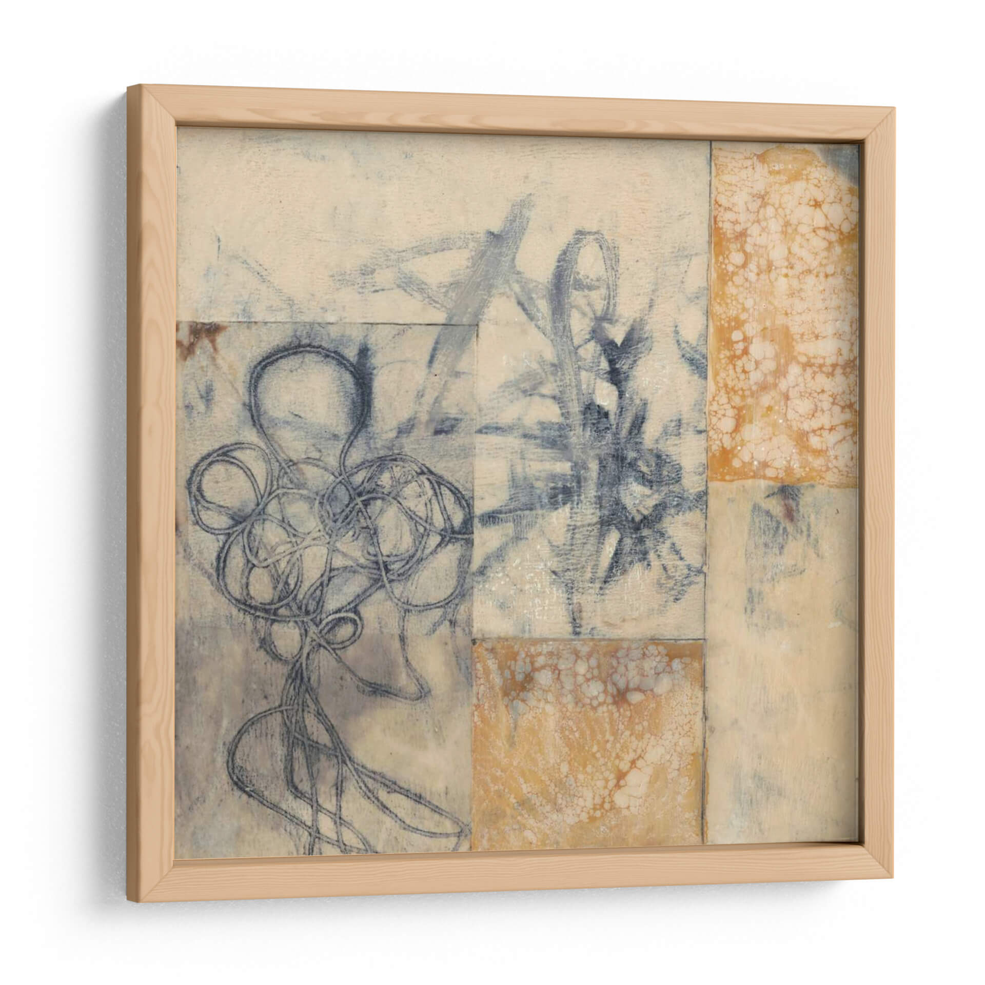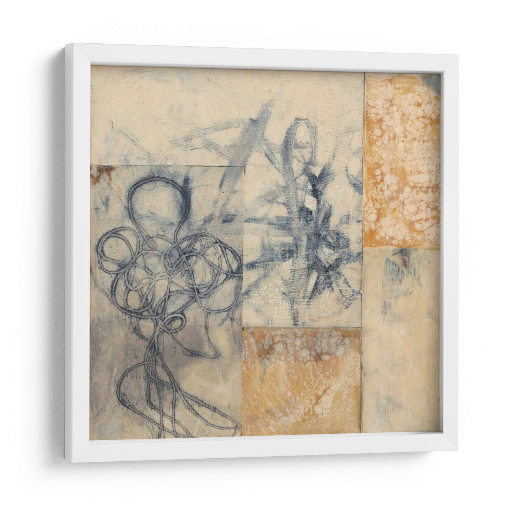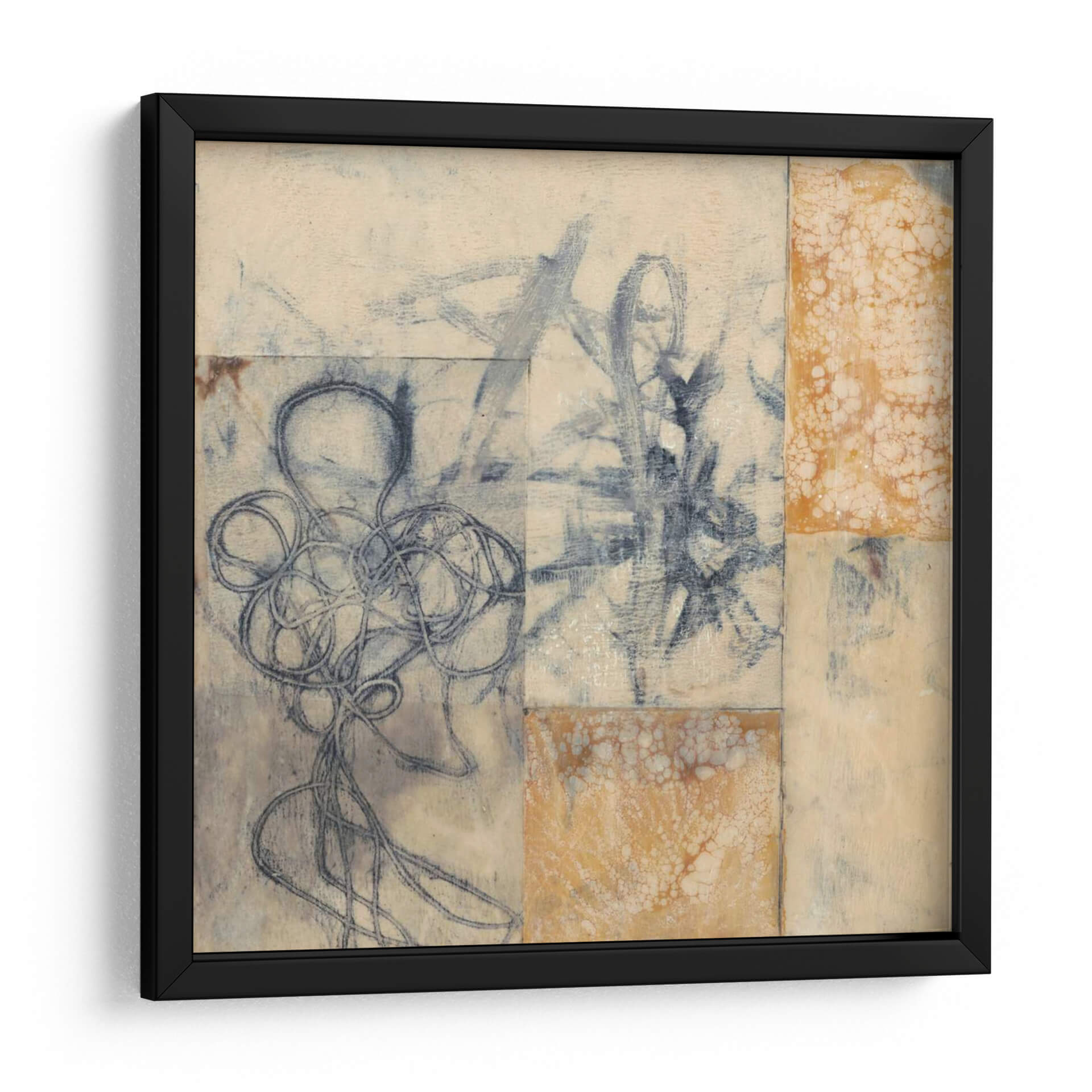 Sumérgete en la enigmática belleza de "Cuerdas De Índigo I", una obra de arte contemporáneo de Jennifer Goldberger que captura la esencia de la abstracción lírica. Este cuadro decorativo, con su cautivadora paleta de azules índigo profundos y tonos terrosos, evoca una sensación de misterio y serenidad. La composición, que parece una serie de collages o fragmentos de bocetos, presenta intrincadas líneas de tinta azul que fluyen y se entrelazan, creando formas orgánicas y sugerentes. Los toques de textura y el uso de colores neutros, como el beige y el crema, aportan una calidez sutil, mientras que las áreas salpicadas de ocre o naranja quemado añaden un punto de interés visual. "Cuerdas De Índigo I" es una pieza versátil, perfecta para infundir un aire de sofisticación artística en cualquier sala de estar, estudio u oficina. Su estilo abstracto y su profundidad emocional invitan a la contemplación, convirtiéndola en el punto focal ideal para espacios que buscan un toque de originalidad y elegancia moderna. Transforma tu hogar en una galería personal con este cautivador cuadro decorativo, una pieza que dialoga con la imaginación y añade carácter a tu decoración.