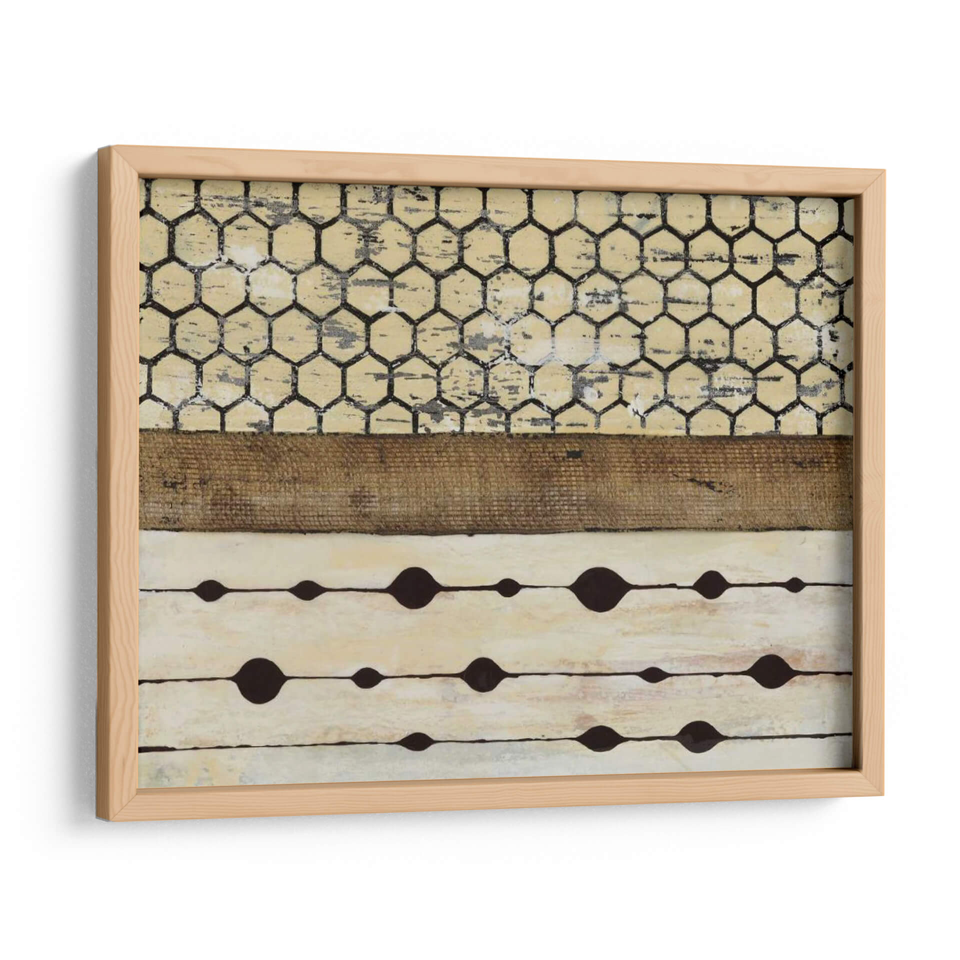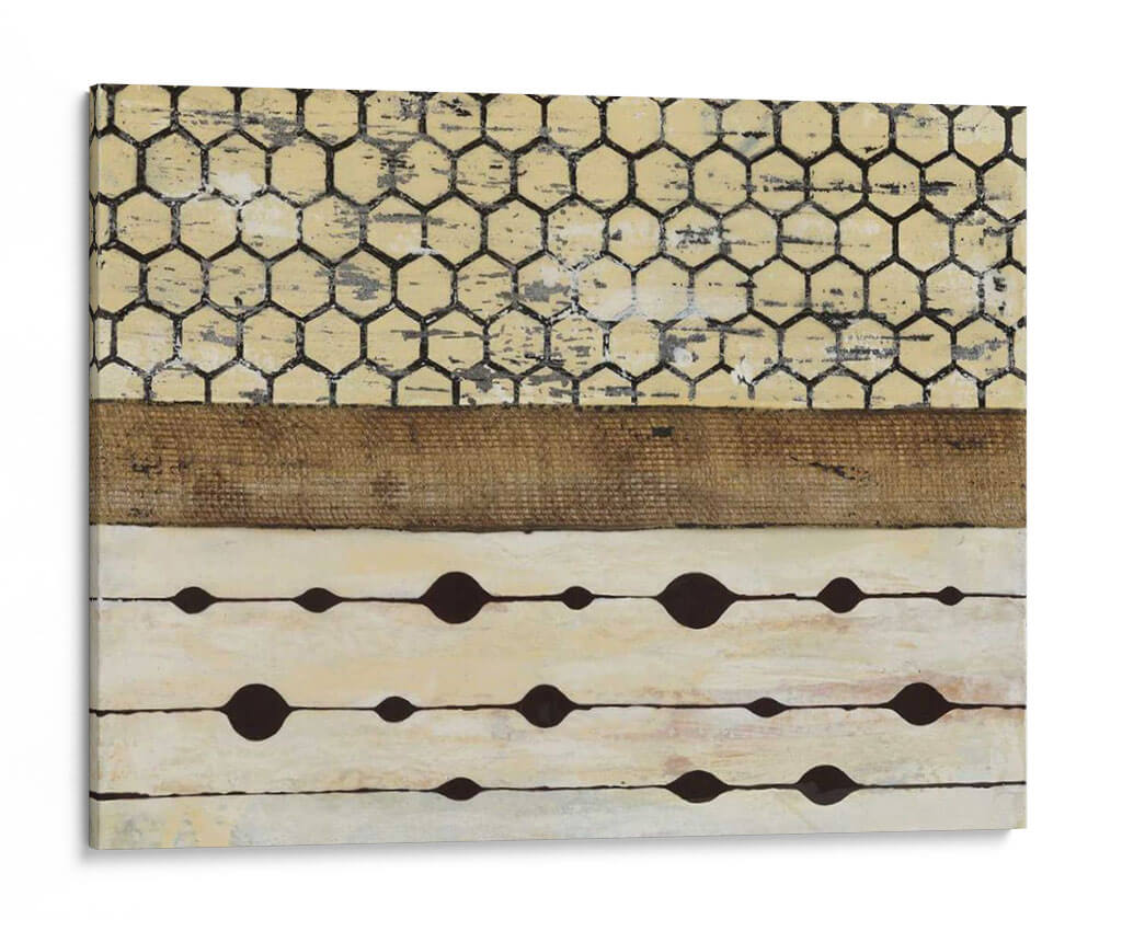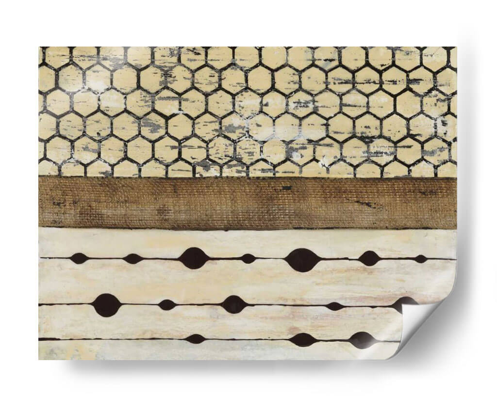 Sumérgete en la fascinante obra abstracta "Dazzle Ii" de Natalie Avondet, una pieza que redefine la estética moderna con su audaz composición y paleta de colores terrosos. Esta obra se caracteriza por una textura intrigante, donde un patrón hexagonal superior, con toques de desgaste y desvanecimiento, se fusiona con una banda central de tejido rústico. La parte inferior de la composición presenta líneas horizontales suaves, interrumpidas por formas ovaladas oscuras que crean un ritmo visual cautivador. Los tonos predominantemente beige, ocre y marrones, combinados con contrastes negros, otorgan a "Dazzle Ii" una profundidad y un carácter orgánico, evocando una sensación de calidez y conexión con la naturaleza, a pesar de su naturaleza abstracta. Es una adición perfecta para espacios que buscan un toque de sofisticación sutil y un punto de interés visual. Ideal para salas de estar contemporáneas, estudios o oficinas que deseen transmitir una atmósfera de serenidad y elegancia. El diseño abstracto y texturizado de este cuadro decorativo lo convierte en una pieza versátil, capaz de complementar una variedad de estilos decorativos, desde el rústico moderno hasta el minimalismo industrial. Permite que "Dazzle Ii" sea el centro de atención o un complemento armonioso en tu diseño interior, añadiendo una dimensión artística única y un aire de intriga.