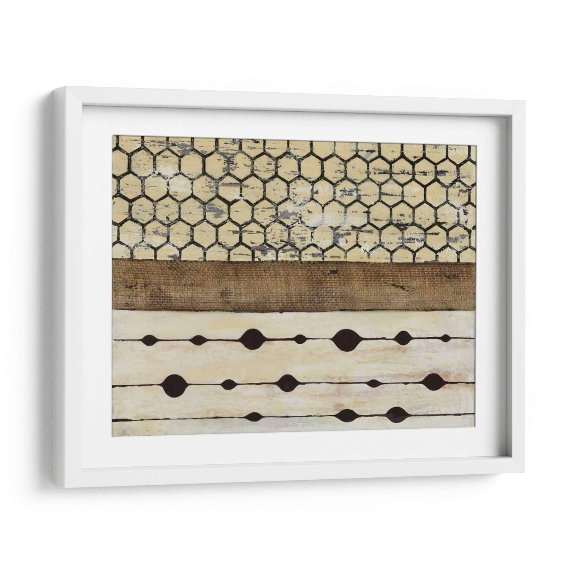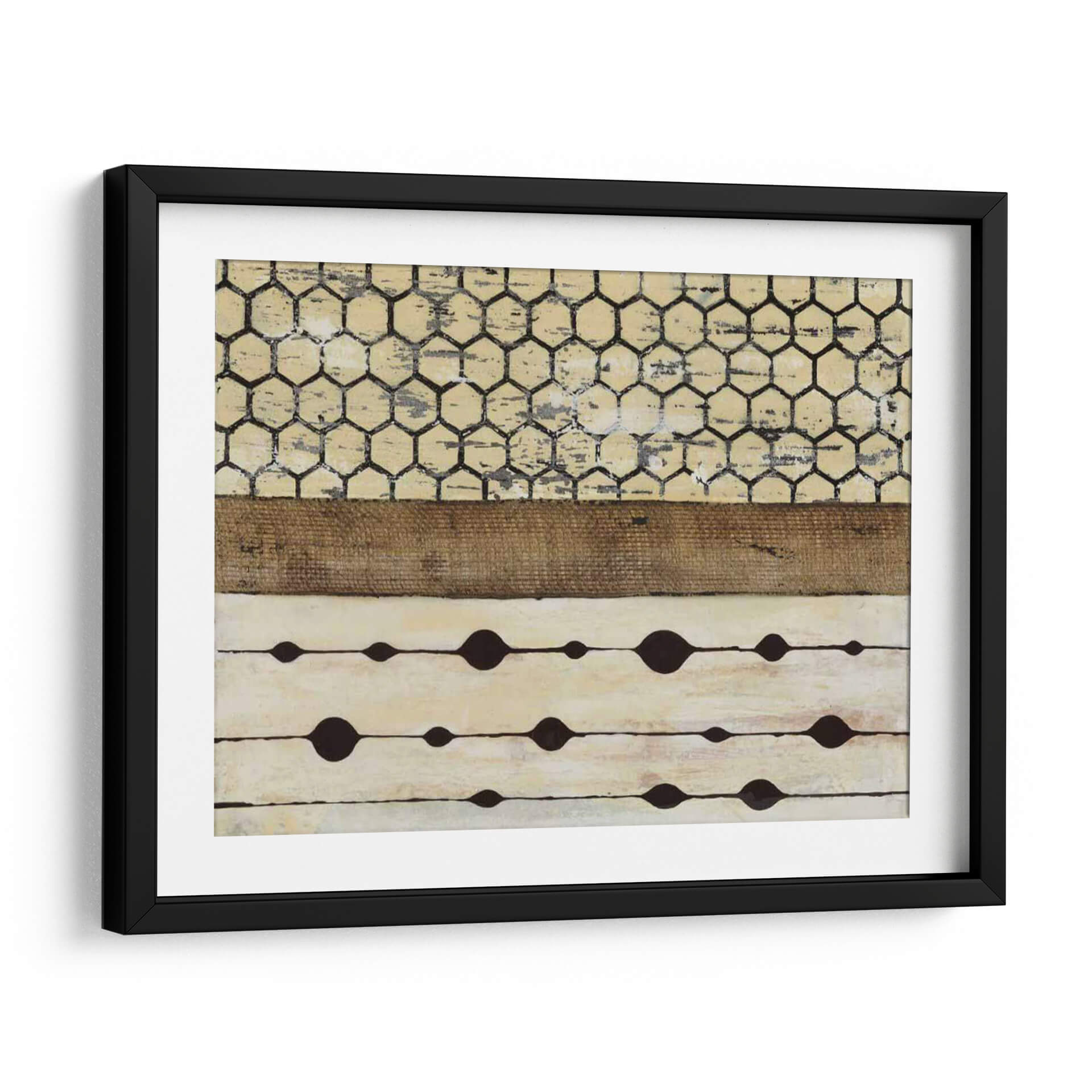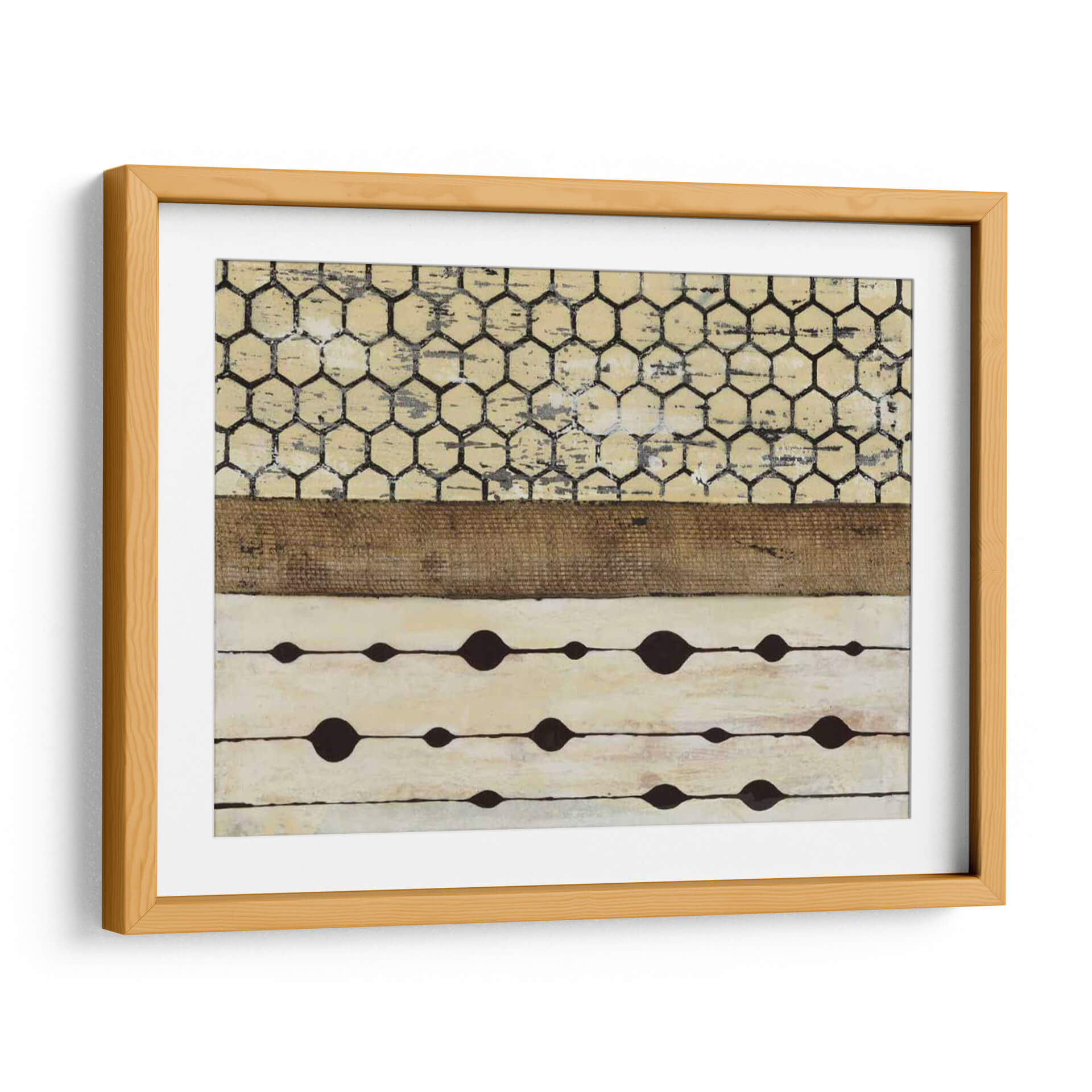 Sumérgete en la fascinante obra abstracta "Dazzle Ii" de Natalie Avondet, una pieza que redefine la estética moderna con su audaz composición y paleta de colores terrosos. Esta obra se caracteriza por una textura intrigante, donde un patrón hexagonal superior, con toques de desgaste y desvanecimiento, se fusiona con una banda central de tejido rústico. La parte inferior de la composición presenta líneas horizontales suaves, interrumpidas por formas ovaladas oscuras que crean un ritmo visual cautivador. Los tonos predominantemente beige, ocre y marrones, combinados con contrastes negros, otorgan a "Dazzle Ii" una profundidad y un carácter orgánico, evocando una sensación de calidez y conexión con la naturaleza, a pesar de su naturaleza abstracta. Es una adición perfecta para espacios que buscan un toque de sofisticación sutil y un punto de interés visual. Ideal para salas de estar contemporáneas, estudios o oficinas que deseen transmitir una atmósfera de serenidad y elegancia. El diseño abstracto y texturizado de este cuadro decorativo lo convierte en una pieza versátil, capaz de complementar una variedad de estilos decorativos, desde el rústico moderno hasta el minimalismo industrial. Permite que "Dazzle Ii" sea el centro de atención o un complemento armonioso en tu diseño interior, añadiendo una dimensión artística única y un aire de intriga.
