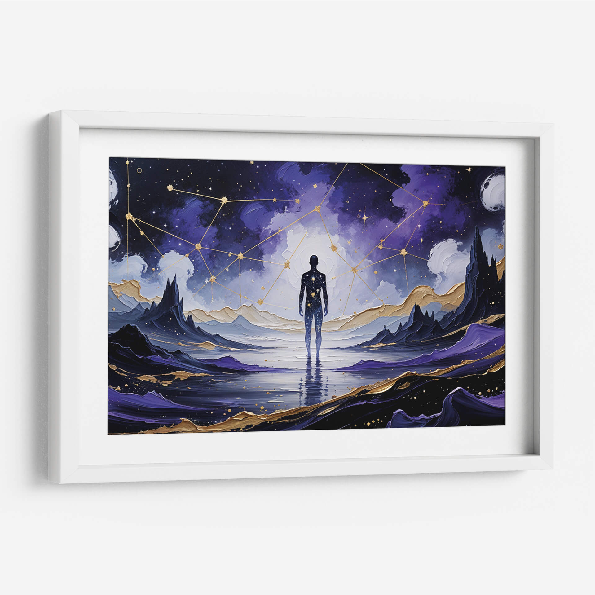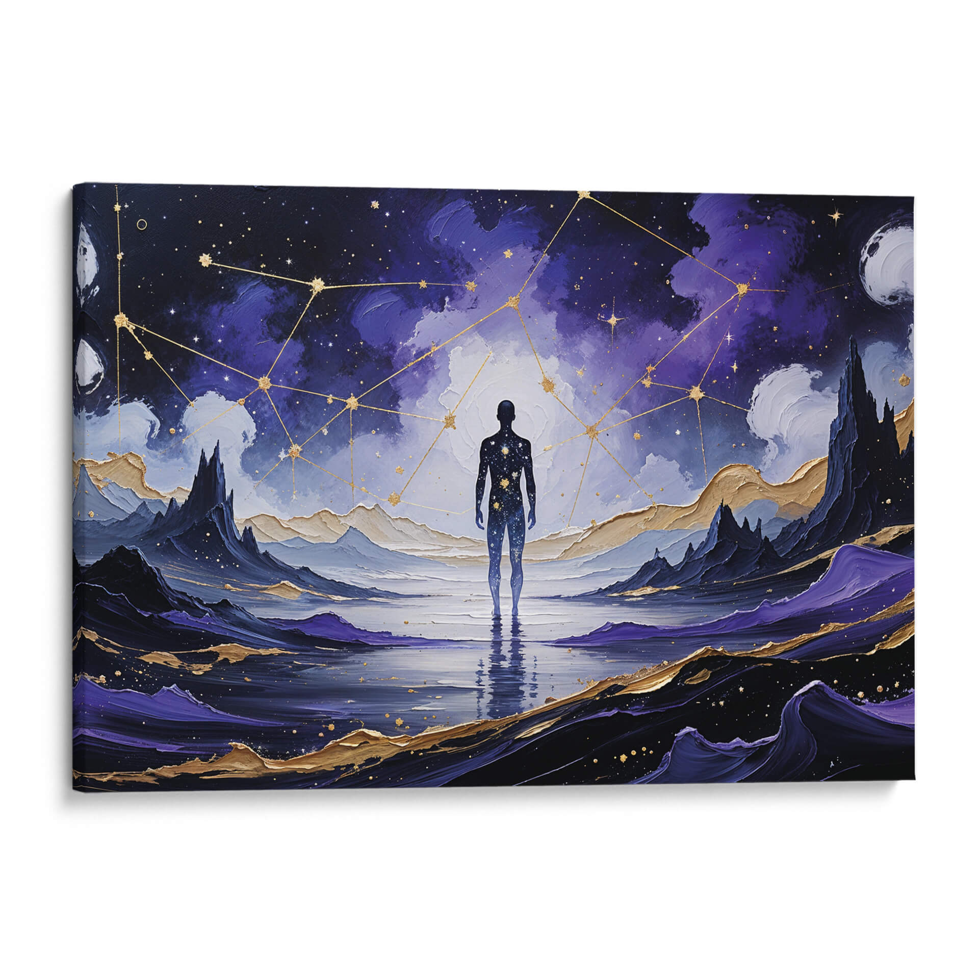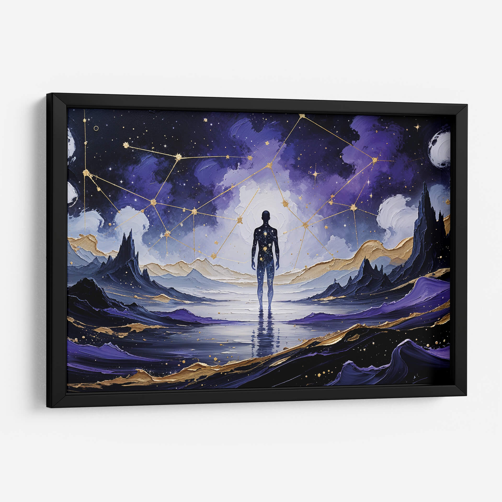 Sumérgete en la inmensidad cósmica con "El Guardián de las Estrellas", una obra de arte que trasciende lo terrenal. Esta pieza cautivadora presenta la silueta de una figura humana de pie en un paisaje onírico, reflejándose en aguas serenas bajo un cielo estrellado y vibrante. Nubes púrpura y azules se entrelazan con constelaciones doradas, creando una atmósfera de misterio y asombro. El contraste entre la oscuridad profunda del espacio y los destellos dorados, junto con las formaciones montañosas escarpadas y los detalles en oro, aporta una sensación de profundidad y lujo. El estilo evoca una mezcla de fantasía y surrealismo, invitando a la contemplación sobre nuestro lugar en el universo. Este cuadro decorativo es ideal para inspirar tranquilidad y admiración en cualquier espacio, ya sea una sala de estar moderna, un estudio sereno o un dormitorio que busque un toque de magia celestial. "El Guardián de las Estrellas" no es solo una imagen, es una invitación a explorar los misterios del cosmos desde la comodidad de tu hogar, un portal visual hacia lo desconocido y lo sublime.