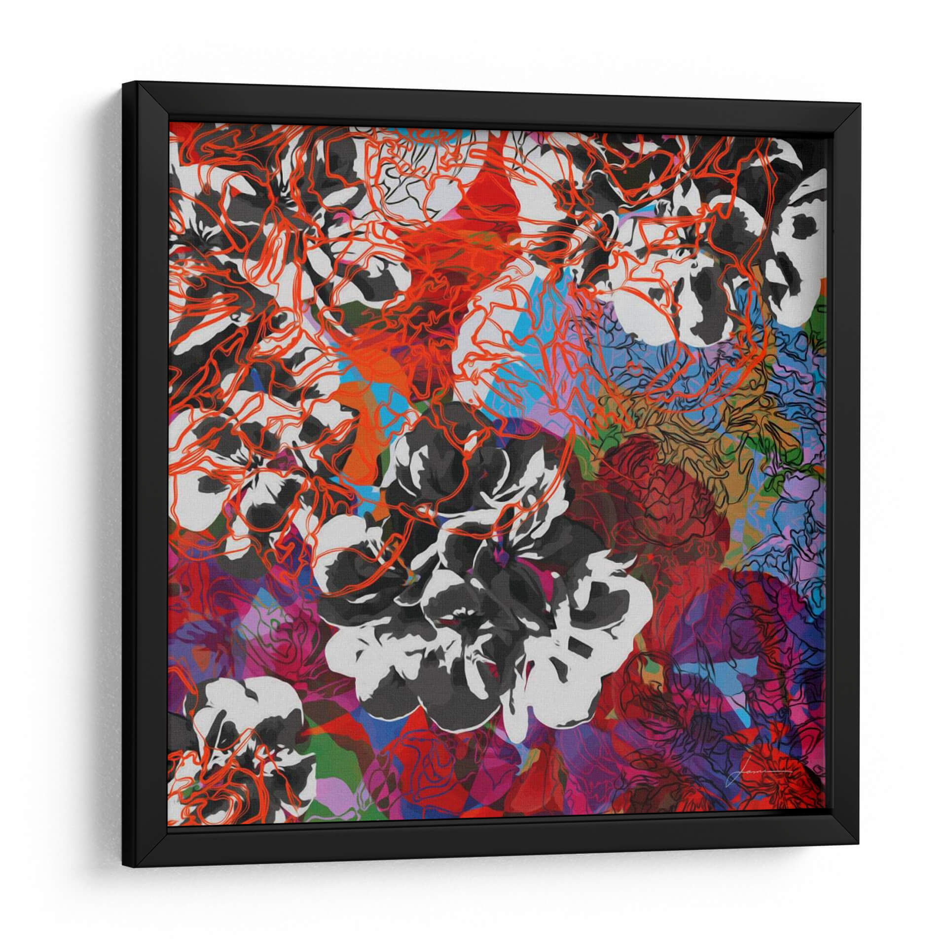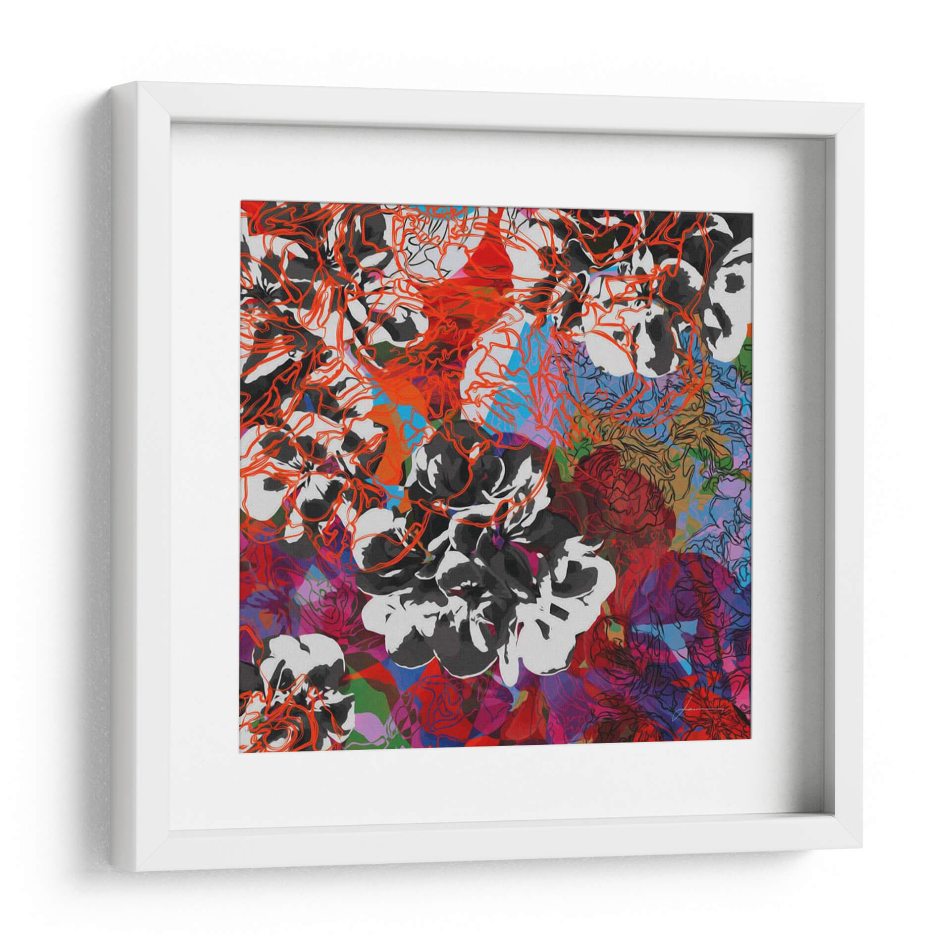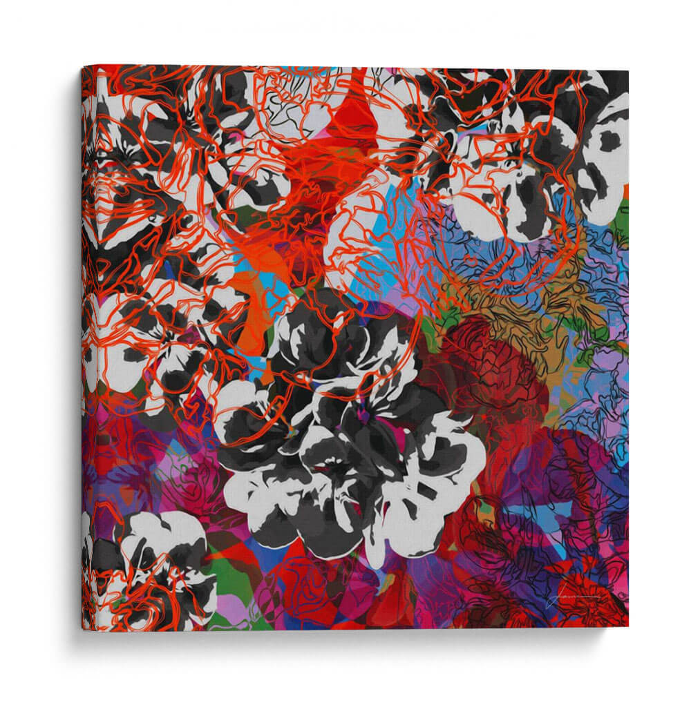 Sumérgete en la vibrante complejidad de "Elementos De Seguimiento Iii" de James Burghardt, una obra de arte contemporáneo que desafía las percepciones. Esta pieza cautiva con su intrincada composición floral, donde delicados contornos en rojo anaranjado se entrelazan con gruesas pinceladas en blanco y negro. La paleta de colores se expande en un tapiz dinámico de rojos intensos, púrpuras profundos, azules eléctricos y toques de verde, creando una sensación de energía y profundidad visual. El estilo, una fusión entre lo figurativo y lo abstracto, invita a la contemplación, revelando nuevas capas con cada mirada. Ideal para espacios que buscan un acento audaz y artístico, este cuadro decorativo es perfecto para salas de estar modernas, estudios creativos u oficinas que desean transmitir dinamismo y sofisticación. Añade un toque de expresividad artística y modernidad a tu decoración con esta pieza única que evoca la belleza en su forma más abstracta y enérgica, convirtiéndose en un punto focal inolvidable en cualquier ambiente. Su diseño abstracto y colorido lo hace versátil para complementar una variedad de estilos decorativos, desde el contemporáneo hasta el ecléctico, asegurando que sea una adición memorable a tu colección de arte.