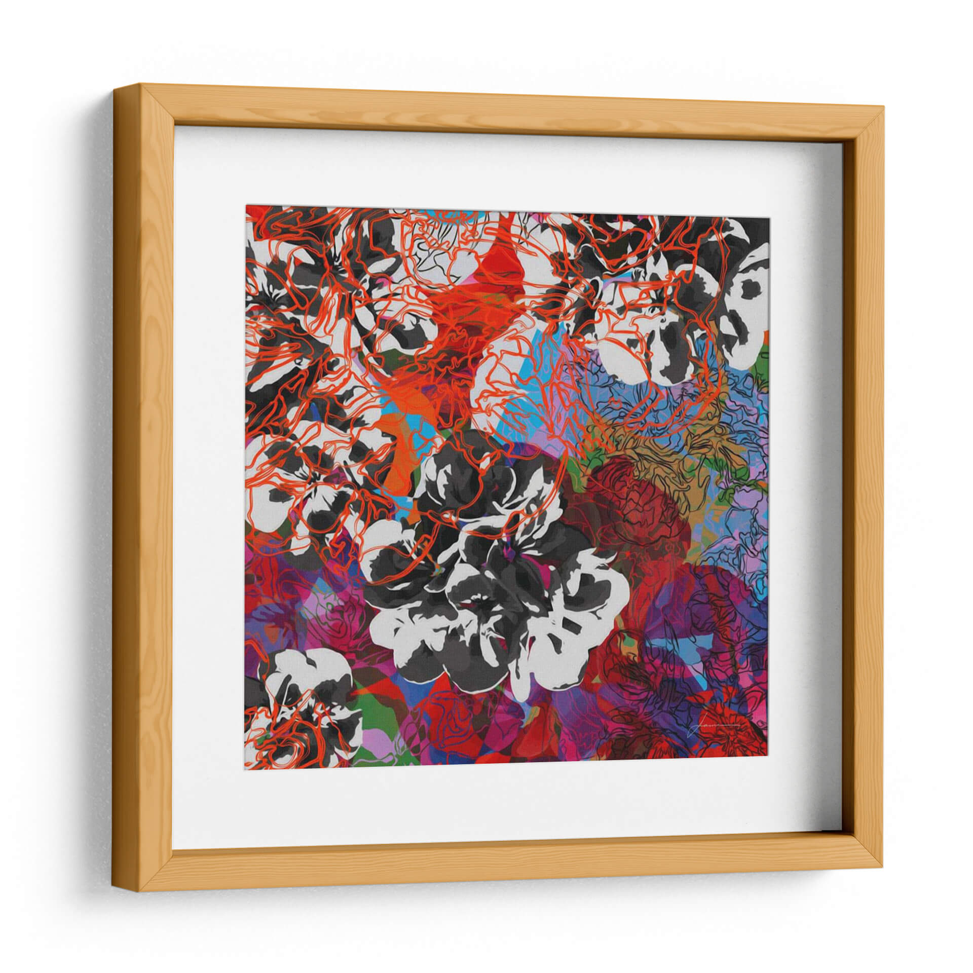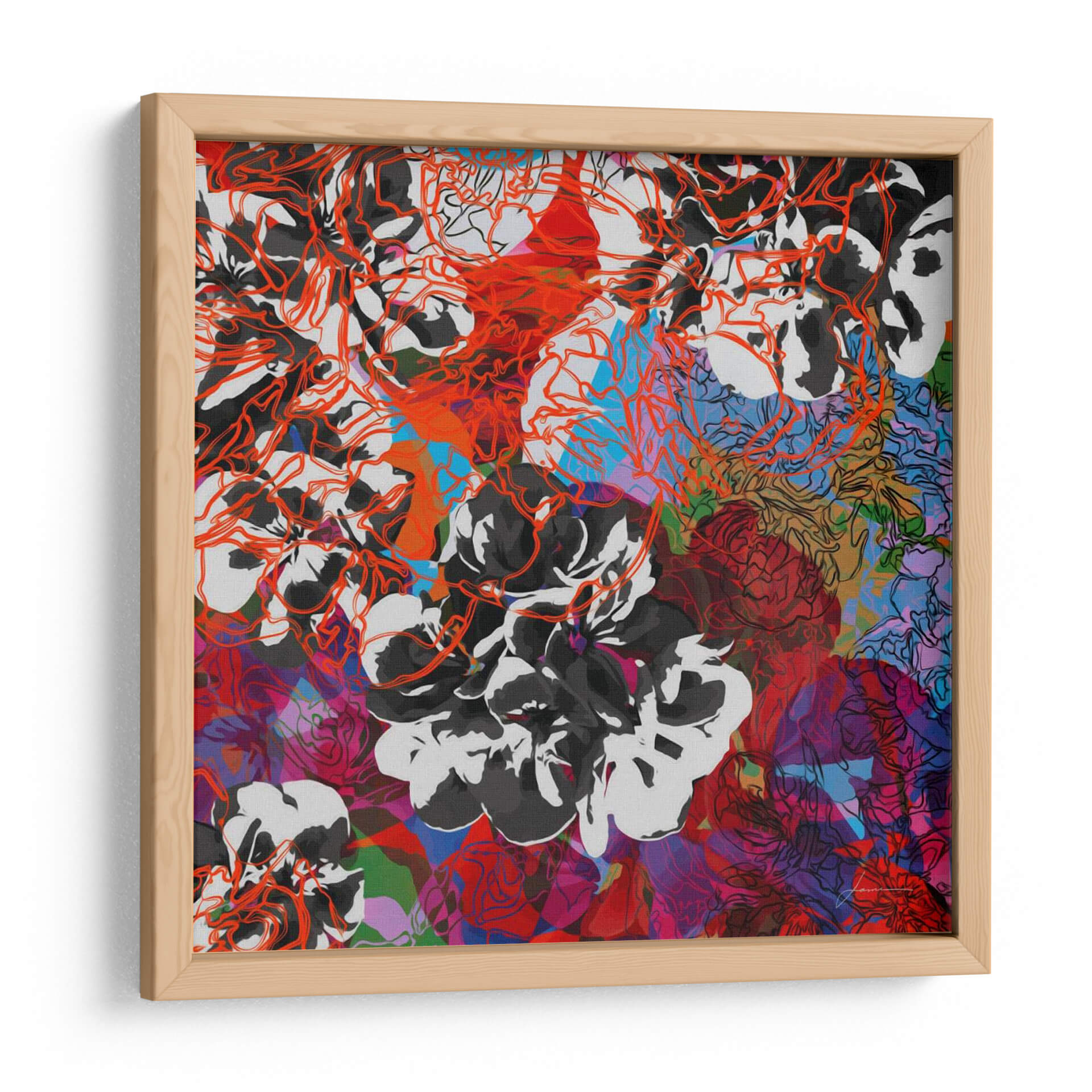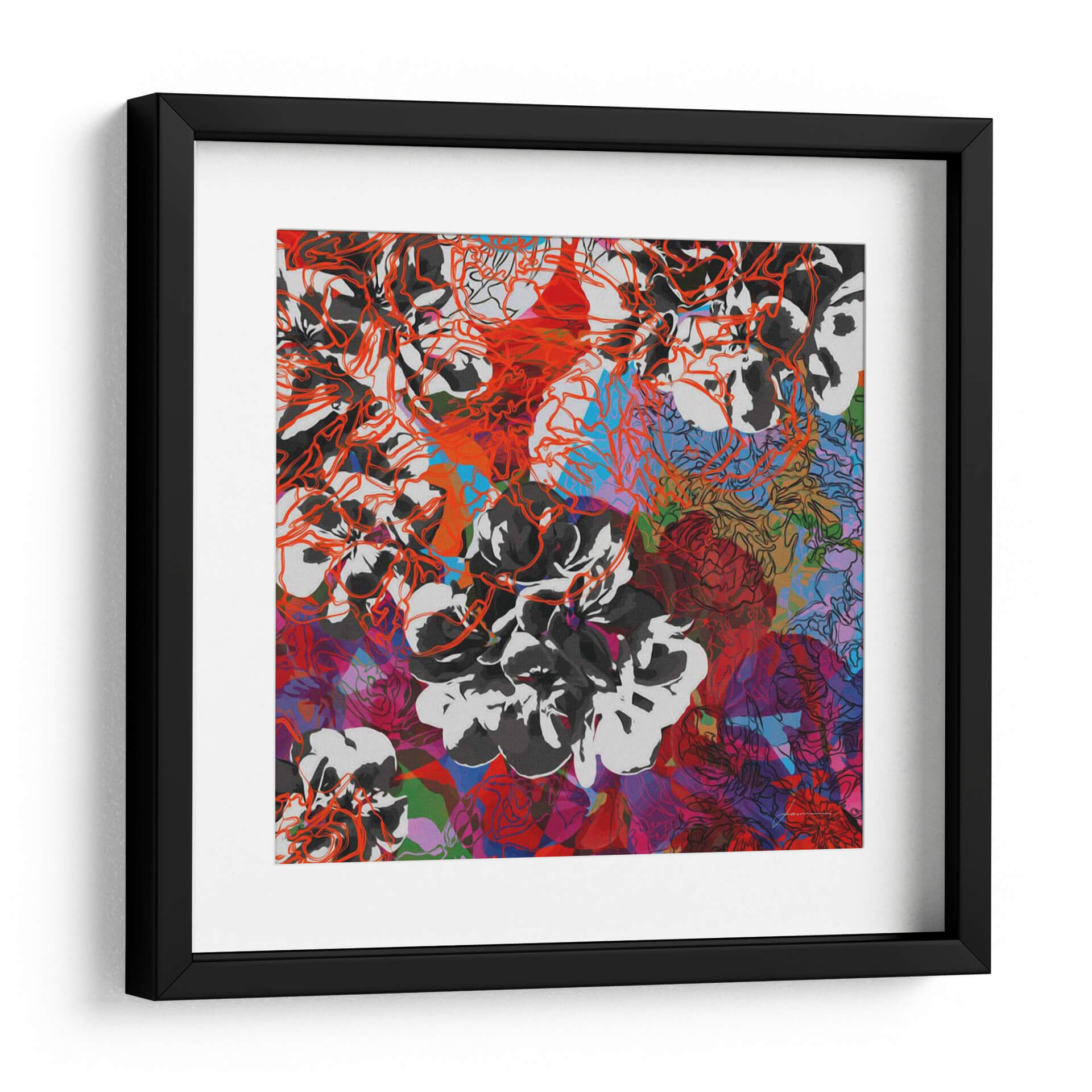 Sumérgete en la vibrante complejidad de "Elementos De Seguimiento Iii" de James Burghardt, una obra de arte contemporáneo que desafía las percepciones. Esta pieza cautiva con su intrincada composición floral, donde delicados contornos en rojo anaranjado se entrelazan con gruesas pinceladas en blanco y negro. La paleta de colores se expande en un tapiz dinámico de rojos intensos, púrpuras profundos, azules eléctricos y toques de verde, creando una sensación de energía y profundidad visual. El estilo, una fusión entre lo figurativo y lo abstracto, invita a la contemplación, revelando nuevas capas con cada mirada. Ideal para espacios que buscan un acento audaz y artístico, este cuadro decorativo es perfecto para salas de estar modernas, estudios creativos u oficinas que desean transmitir dinamismo y sofisticación. Añade un toque de expresividad artística y modernidad a tu decoración con esta pieza única que evoca la belleza en su forma más abstracta y enérgica, convirtiéndose en un punto focal inolvidable en cualquier ambiente. Su diseño abstracto y colorido lo hace versátil para complementar una variedad de estilos decorativos, desde el contemporáneo hasta el ecléctico, asegurando que sea una adición memorable a tu colección de arte.