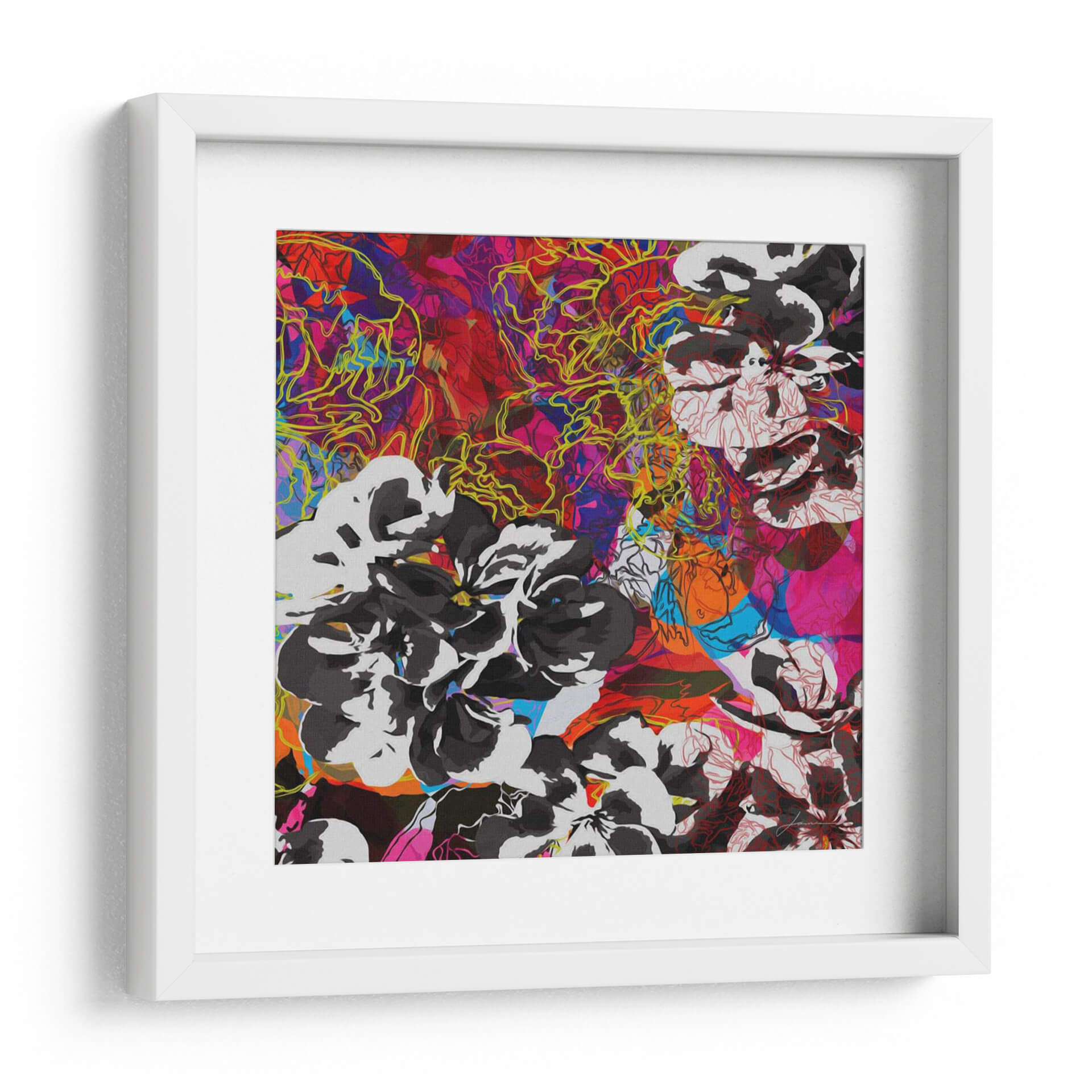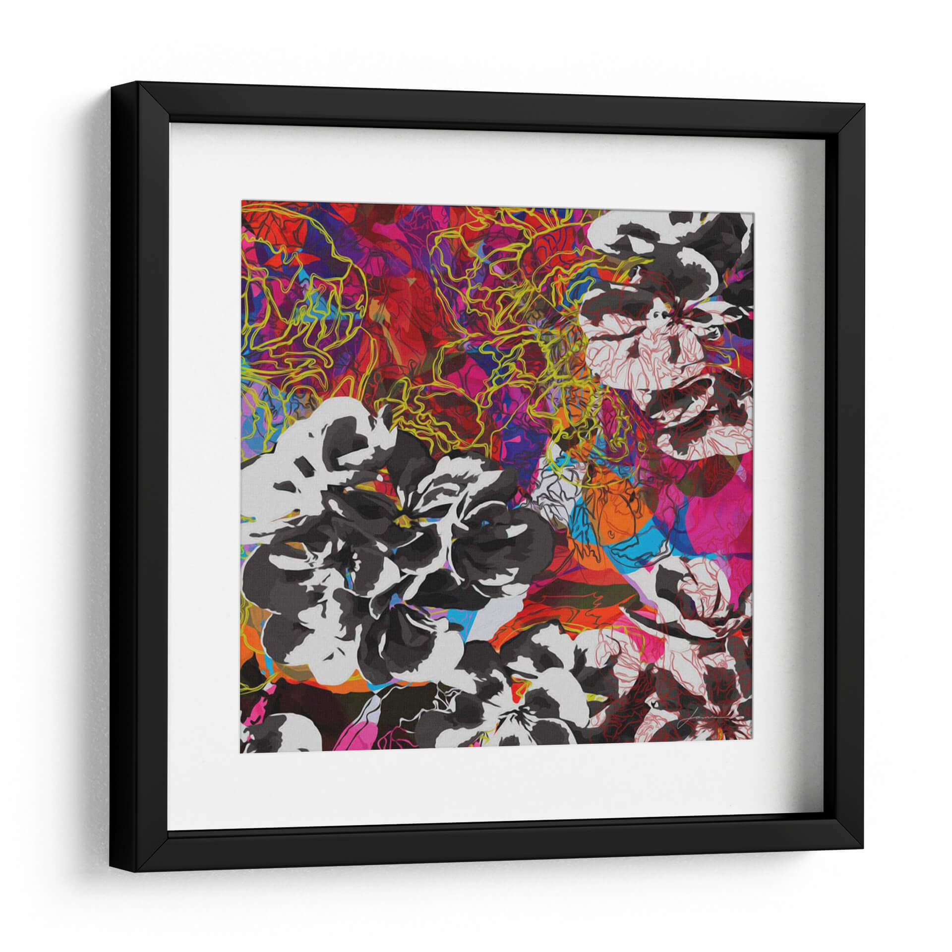 Sumérgete en la vibrante energía de "Elementos De Seguimiento Iv", una obra de arte contemporáneo que desafía las convenciones con su audaz composición y explosión de color. El artista James Burghardt nos presenta un lienzo donde las formas florales en blanco y negro, con trazos definidos, contrastan poderosamente con un fondo abstracto y caótico, lleno de pinceladas psicodélicas en tonos rojos, fucsias, azules y naranjas. Delicadas líneas amarillas serpentean a través de la composición, añadiendo una capa de intriga visual y movimiento dinámico. Esta pieza es una celebración de la dualidad, combinando la delicadeza de los pétalos con la intensidad de un torbellino de color. Ideal para espacios que buscan un toque audaz y contemporáneo, este cuadro decorativo se convertirá en el punto focal de cualquier sala de estar, oficina o estudio. Su naturaleza abstracta permite múltiples interpretaciones, invitando al espectador a una conexión personal y emocional. Añade un toque de arte moderno y expresivo a tu decoración con esta impactante obra.
