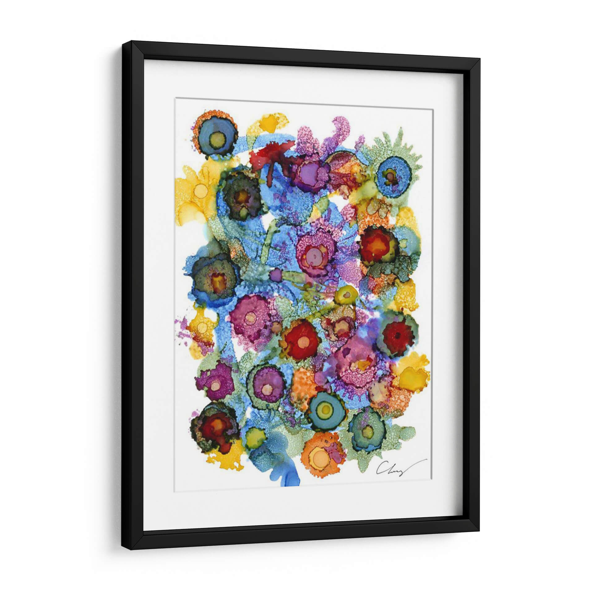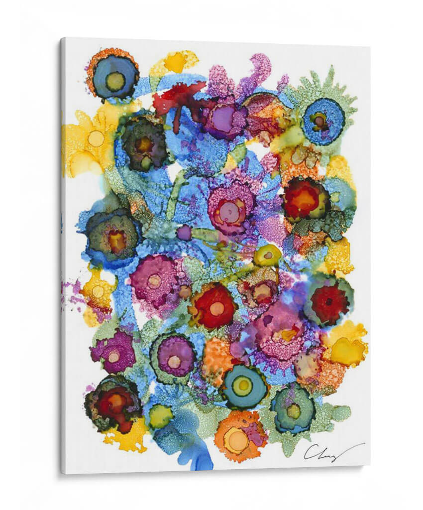 Sumérgete en la vibrante explosión de color y forma de 'Espectro Costero II', una obra de arte contemporáneo que captura la esencia de la naturaleza con una energía desbordante. Esta pieza, creada por la talentosa artista Cheryl Baynes, se caracteriza por su abstracción lírica y su audaz uso de la tinta, que fluye creando texturas orgánicas y patrones hipnóticos. Los círculos concéntricos y las formas etéreas recuerdan a flores exóticas o formaciones marinas, invitando a la contemplación y al descubrimiento de nuevos detalles en cada mirada. La paleta de colores es un festín visual, con azules profundos que se entrelazan con vibrantes rosas, naranjas intensos y toques de amarillo sol, creando un contraste dinámico que aporta vida y alegría a cualquier espacio. "Espectro Costero II" es más que un simple cuadro decorativo; es una ventana a un mundo de imaginación y vitalidad. Su composición fluida y su intensidad cromática la convierten en el punto focal perfecto para una sala de estar moderna, un estudio creativo o un dormitorio que busque un toque de sofisticación y optimismo. Ideal para quienes aprecian el arte abstracto y buscan piezas únicas que inspiren y transformen su entorno.