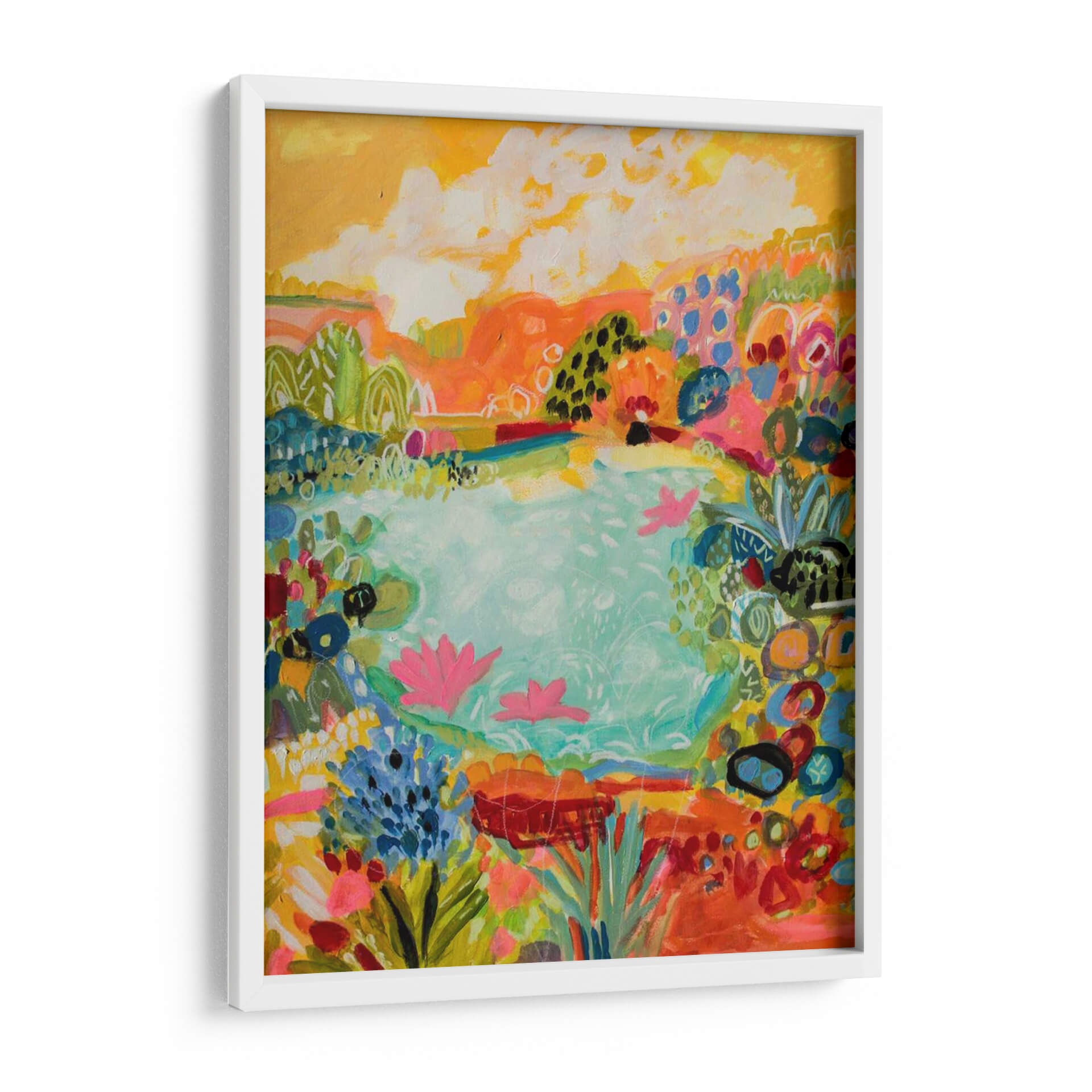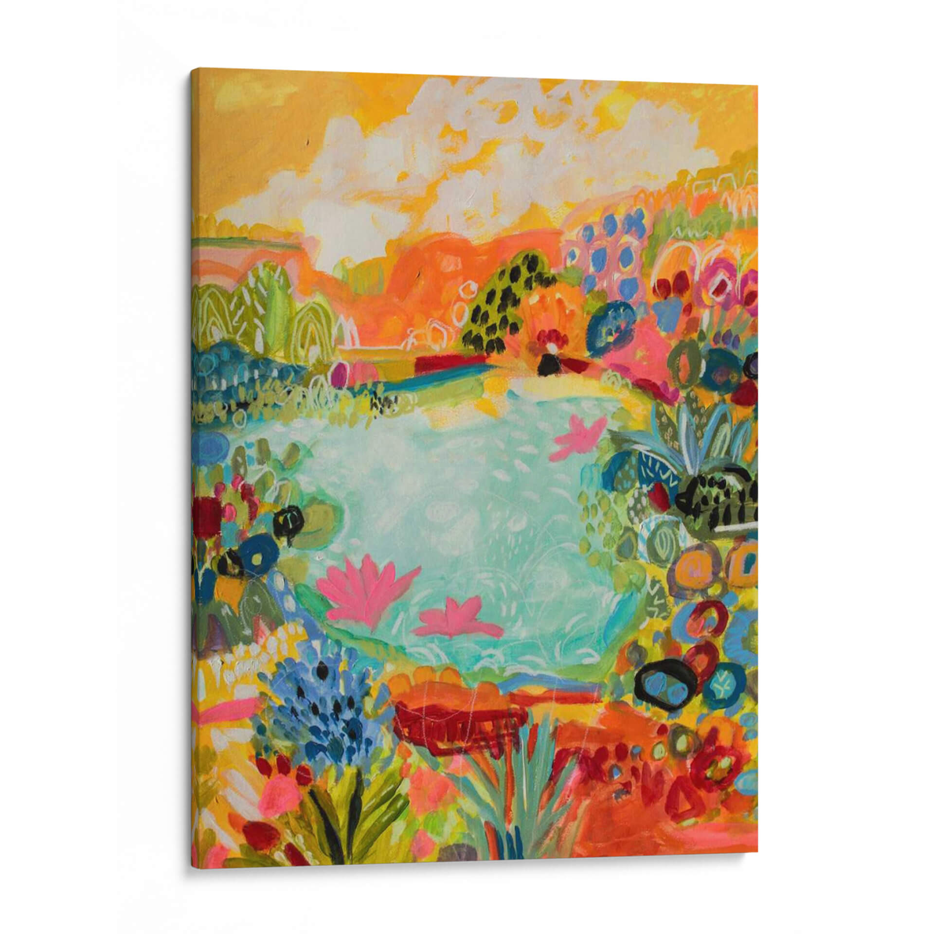 Sumérgete en la vibrante serenidad de "Estanque Caprichoso I", una obra de arte contemporáneo que captura la esencia lúdica de la naturaleza. Los alegres trazos de Karen Fields dan vida a un paisaje exuberante, dominado por un estanque de tonos turquesa que invita a la contemplación. La paleta de colores es un festín visual, con explosiones de naranja, rosa vibrante, azul eléctrico y amarillo sol, creando una atmósfera de alegría y vitalidad. Las formas, semi-abstractas y orgánicas, sugieren flores acuáticas, follaje exuberante y nubes esponjosas bajo un cielo soleado. Esta pieza evoca una sensación de paz y asombro, perfecta para añadir un toque de color y vida a cualquier espacio. Ideal para salas de estar modernas, dormitorios acogedores o estudios creativos, este cuadro decorativo transformará tu hogar en un oasis de inspiración. El estilo expresionista y la composición dinámica invitan a la exploración visual, haciendo de "Estanque Caprichoso I" una adición memorable y llena de carácter a tu colección de arte.