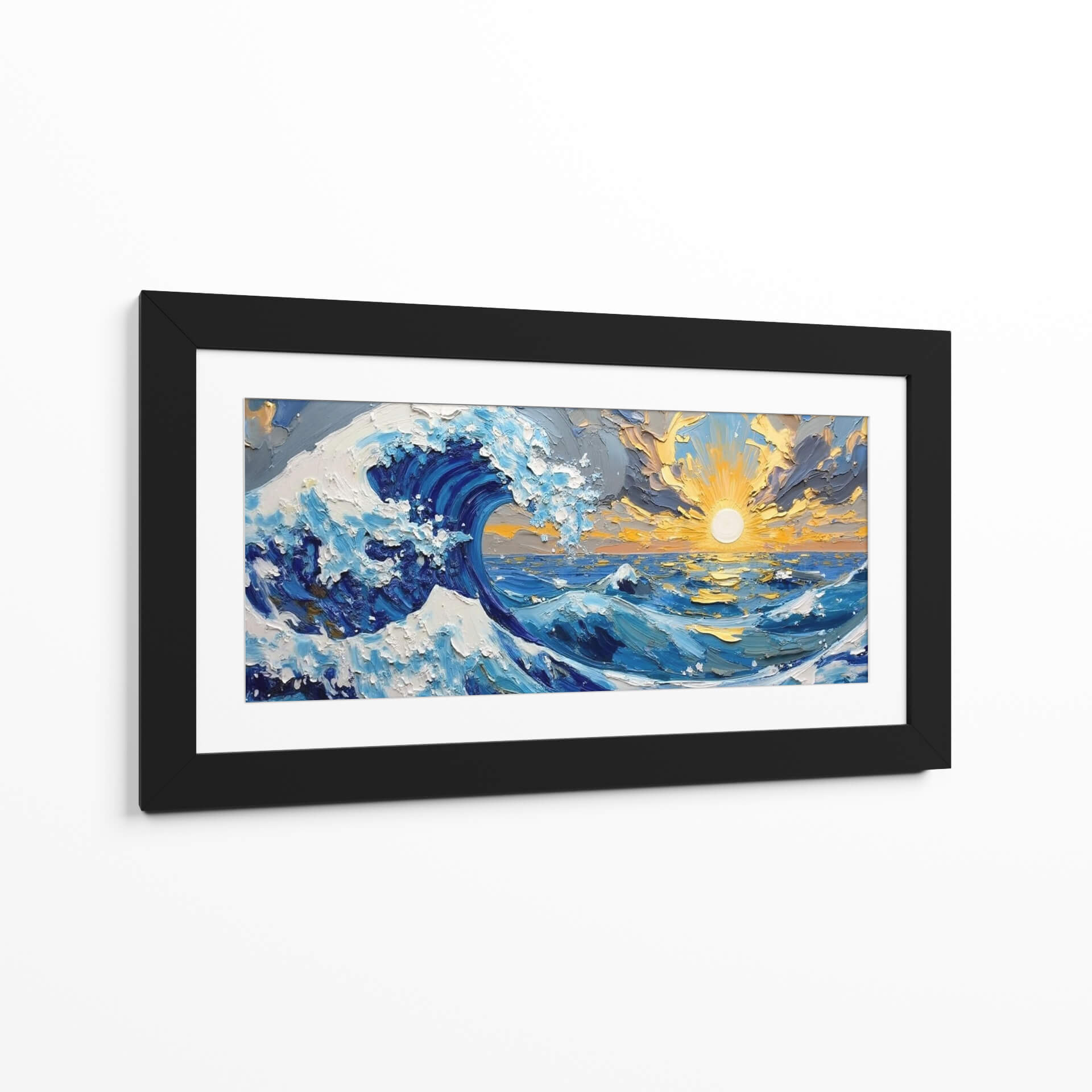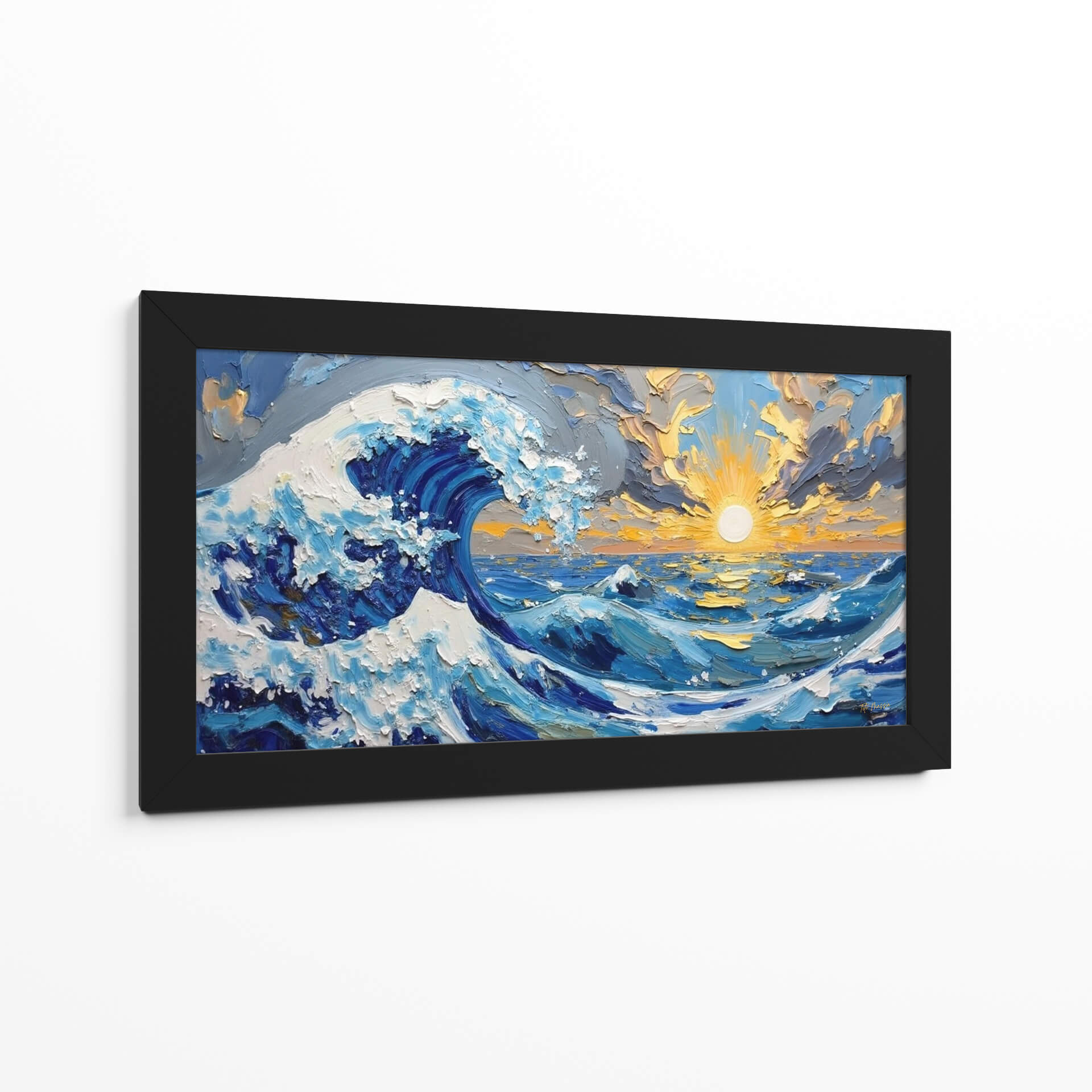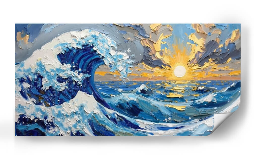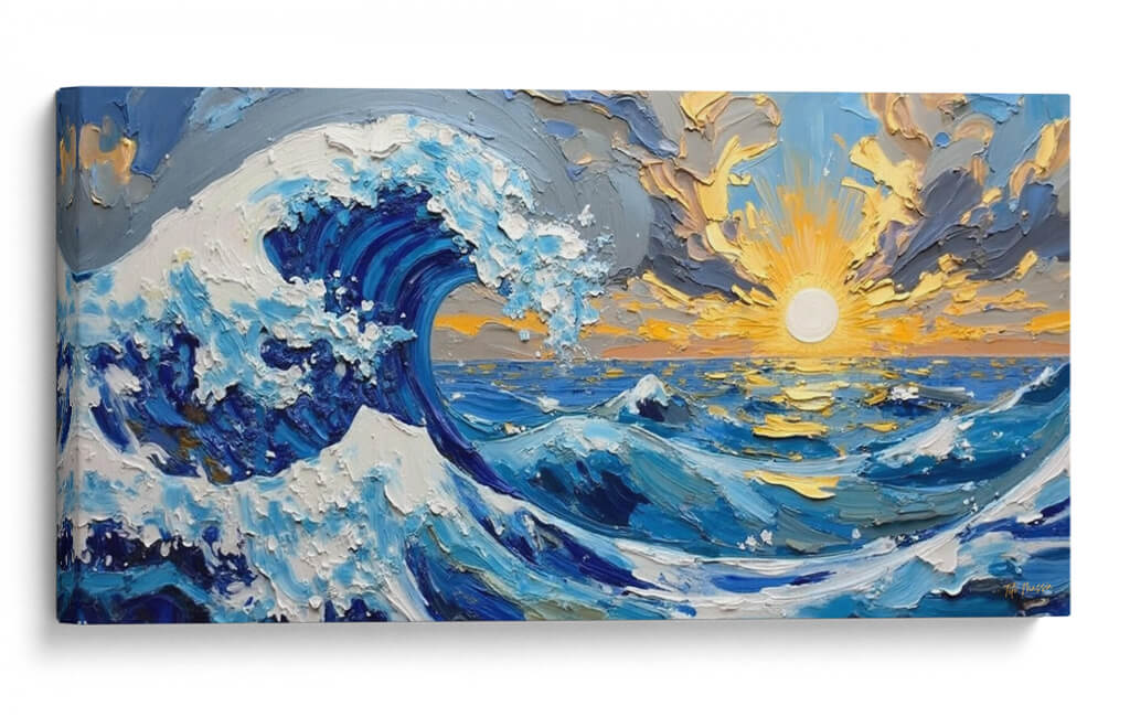 Sumérgete en la majestuosidad del océano con "Furia del Océano", una obra de arte vibrante y expresiva de Tito Massia. Este cuadro decorativo captura la fuerza indómita de las olas con una técnica de pincelada audaz y texturizada que da vida a cada detalle. Los profundos azules del mar se entrelazan con el blanco espumoso de las crestas de las olas, creando un contraste dinámico que evoca la potencia y la belleza de la naturaleza en su máxima expresión. El sol poniente, representado con intensos tonos dorados y anaranjados, se asoma entre nubes dramáticas, añadiendo un toque de calidez y serenidad a la escena tempestuosa. La composición, centrada en el poderío de la ola principal, invita a la reflexión sobre la inmensidad y el misterio del mar. "Furia del Océano" es la pieza perfecta para añadir un punto focal de energía y color a cualquier sala de estar, estudio u oficina, transformando tu espacio en un refugio de inspiración marina. Ideal para amantes del arte abstracto y paisajístico que buscan una conexión emocional con la naturaleza.
