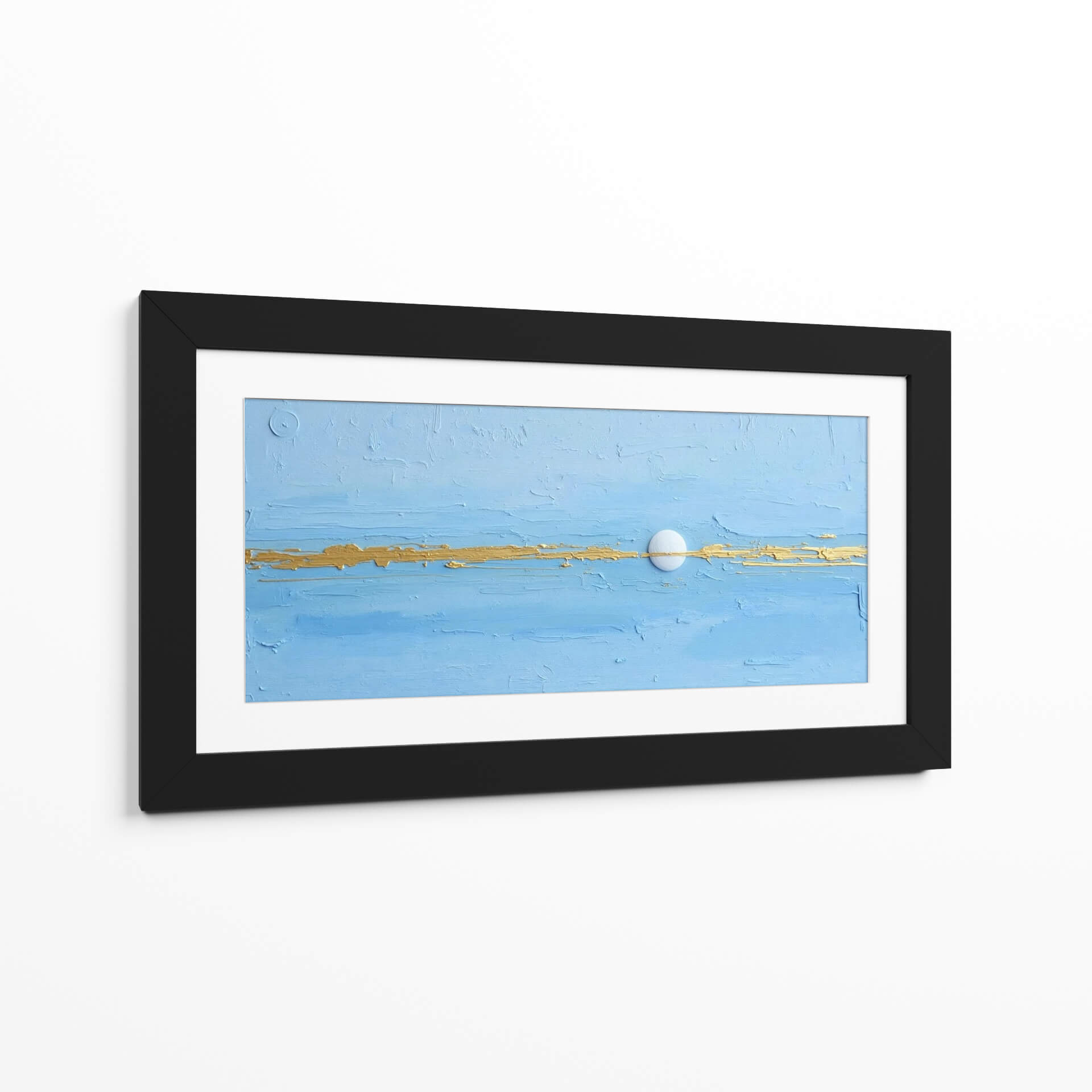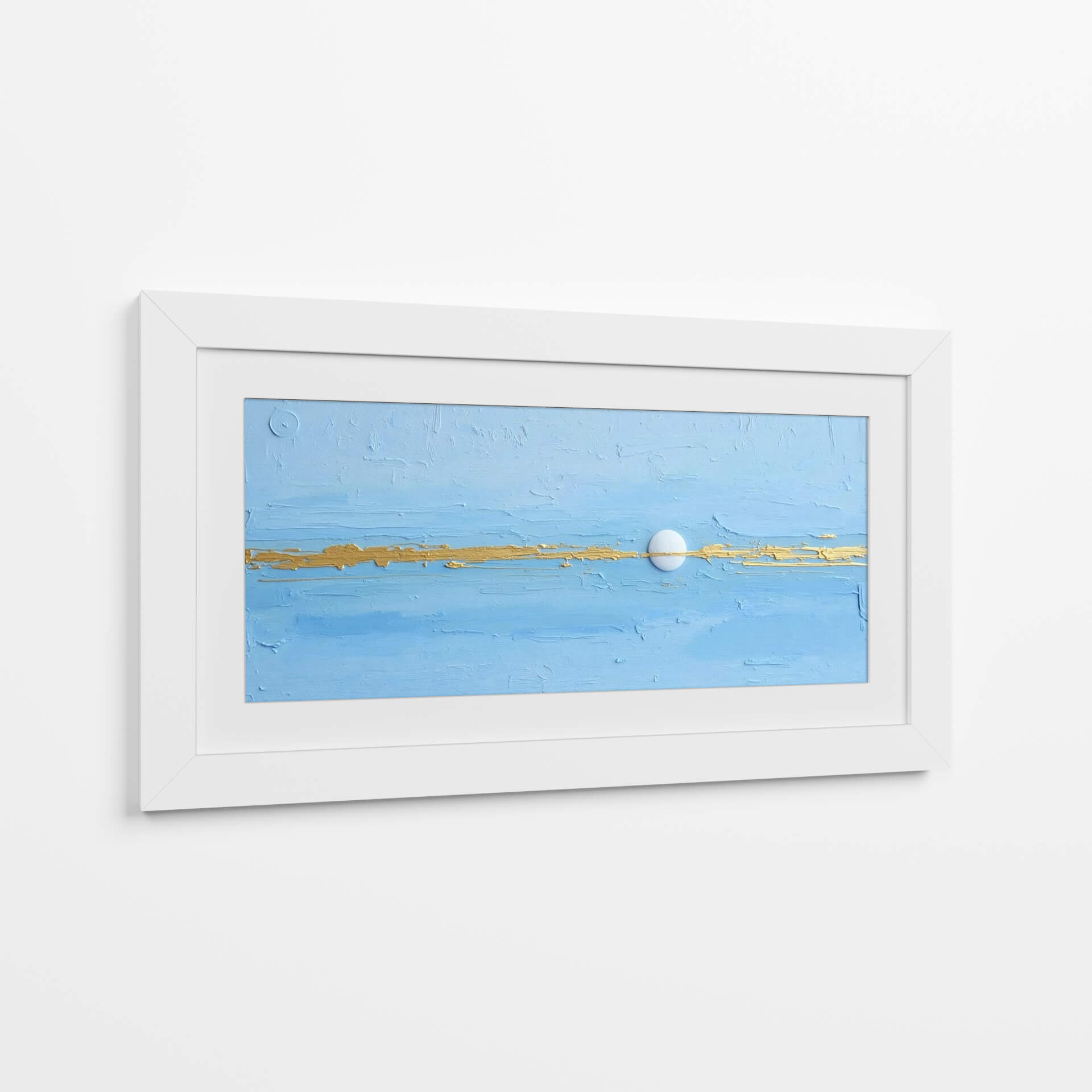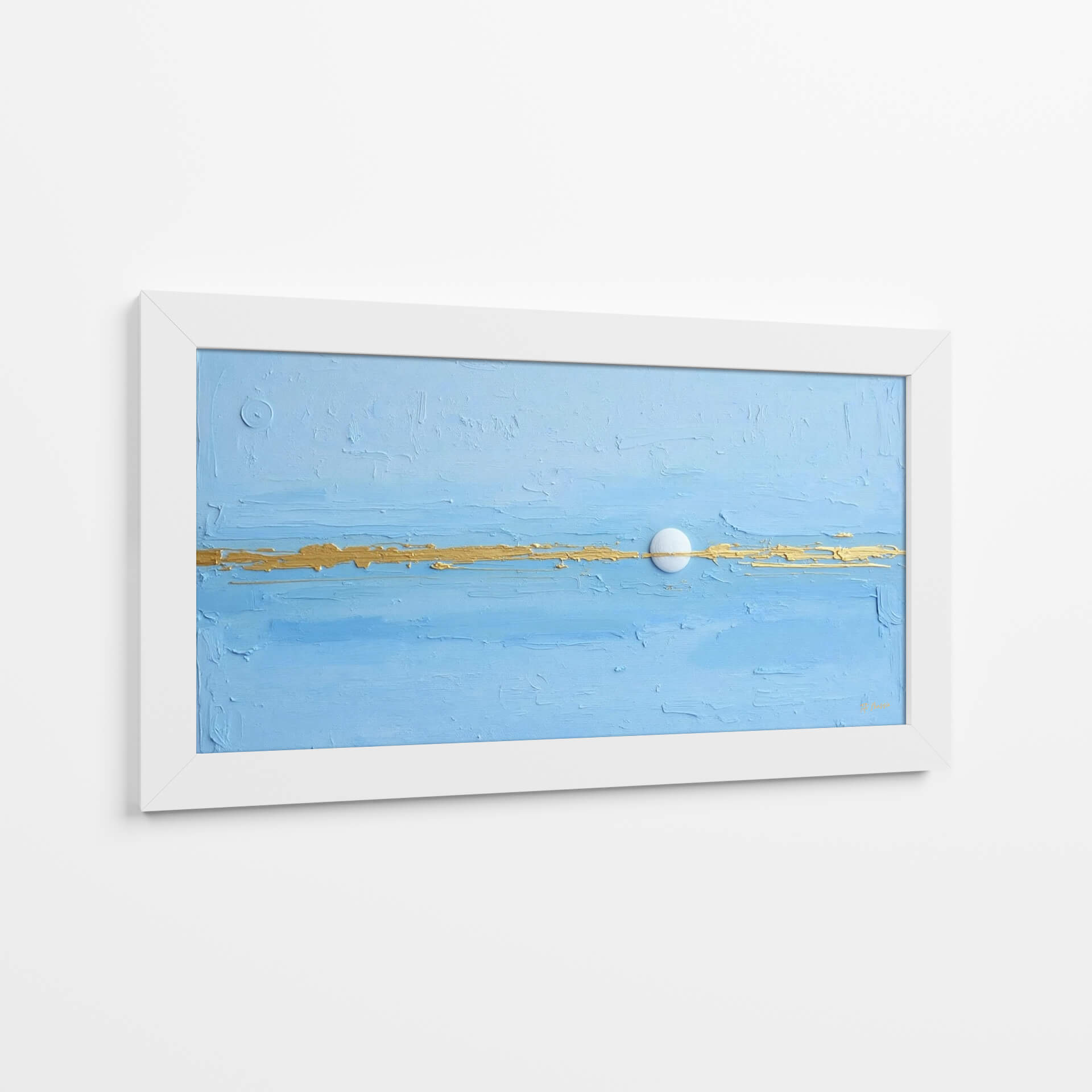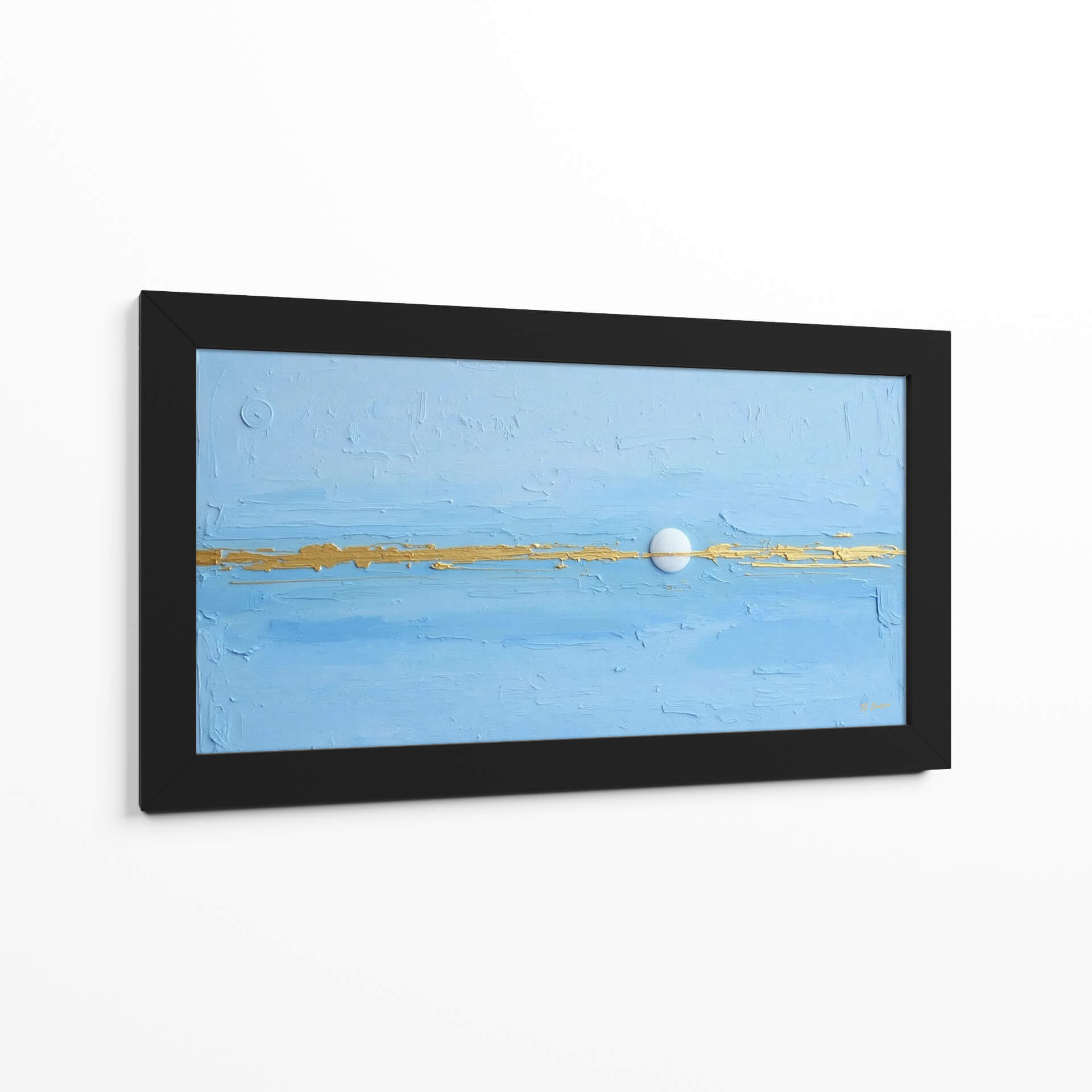 Sumérgete en la serenidad de "Horizonte Sereno", una obra de arte contemporáneo que captura la esencia de un amanecer o atardecer tranquilizador. Tito Massia nos presenta una composición minimalista donde la vastedad del cielo azul se fusiona con sutiles texturas, evocando la calma del mar o la inmensidad del firmamento. Una línea dorada brillante atraviesa el lienzo, actuando como un horizonte imaginario que separa y une dos planos de color, mientras que un disco blanco, similar a un sol o una luna, irradia una paz palpable. La paleta de azules celestes y profundos, realzada por toques de oro metálico, crea un ambiente de sosiego y elegancia. Este cuadro decorativo es ideal para espacios que buscan transmitir tranquilidad y sofisticación, como dormitorios, salones o estudios. Su diseño abstracto y la calidad de su ejecución lo convierten en una pieza versátil, capaz de complementar desde decoraciones modernas hasta ambientes más serenos. Añade un toque de contemplación y belleza a tu hogar con esta pieza única de arte abstracto.