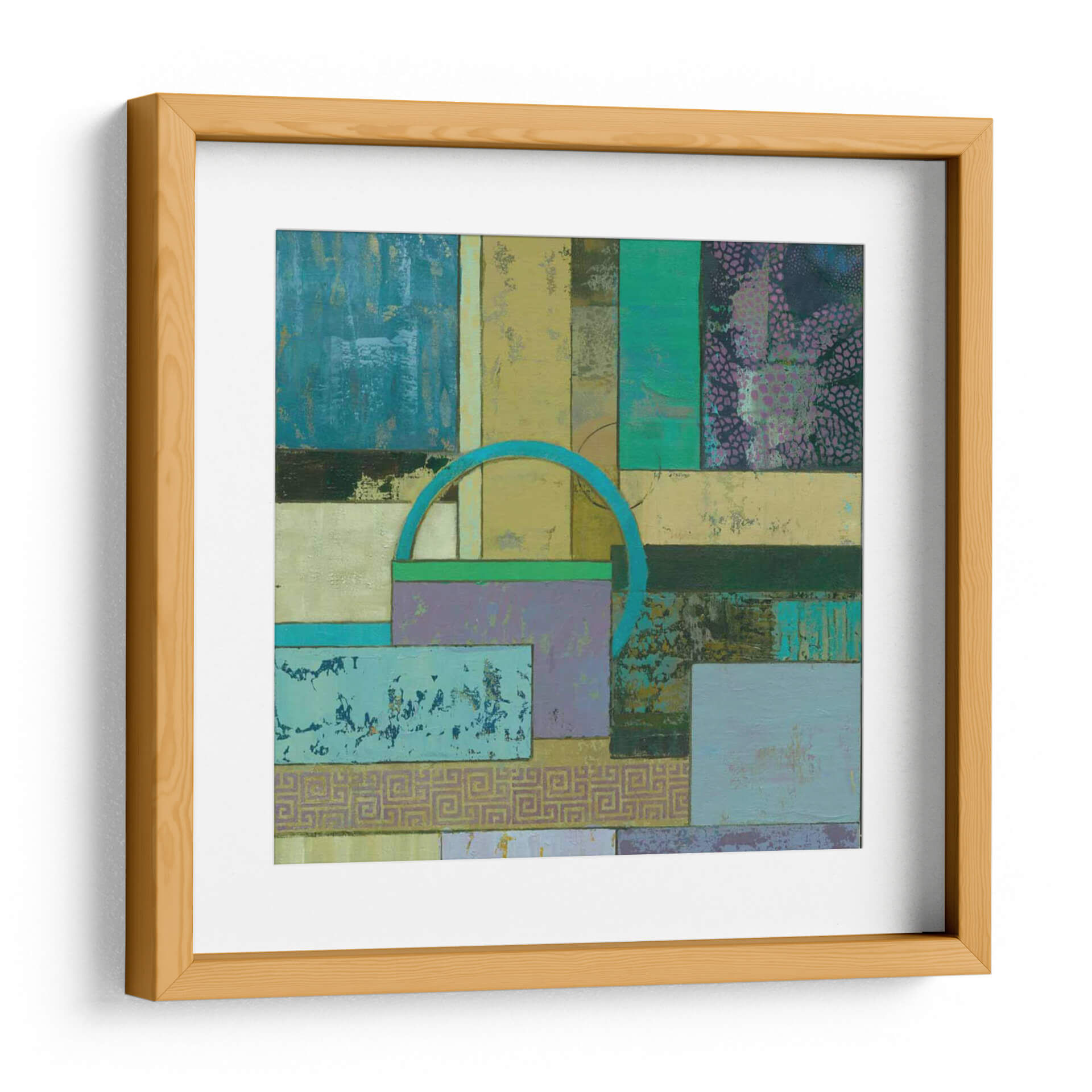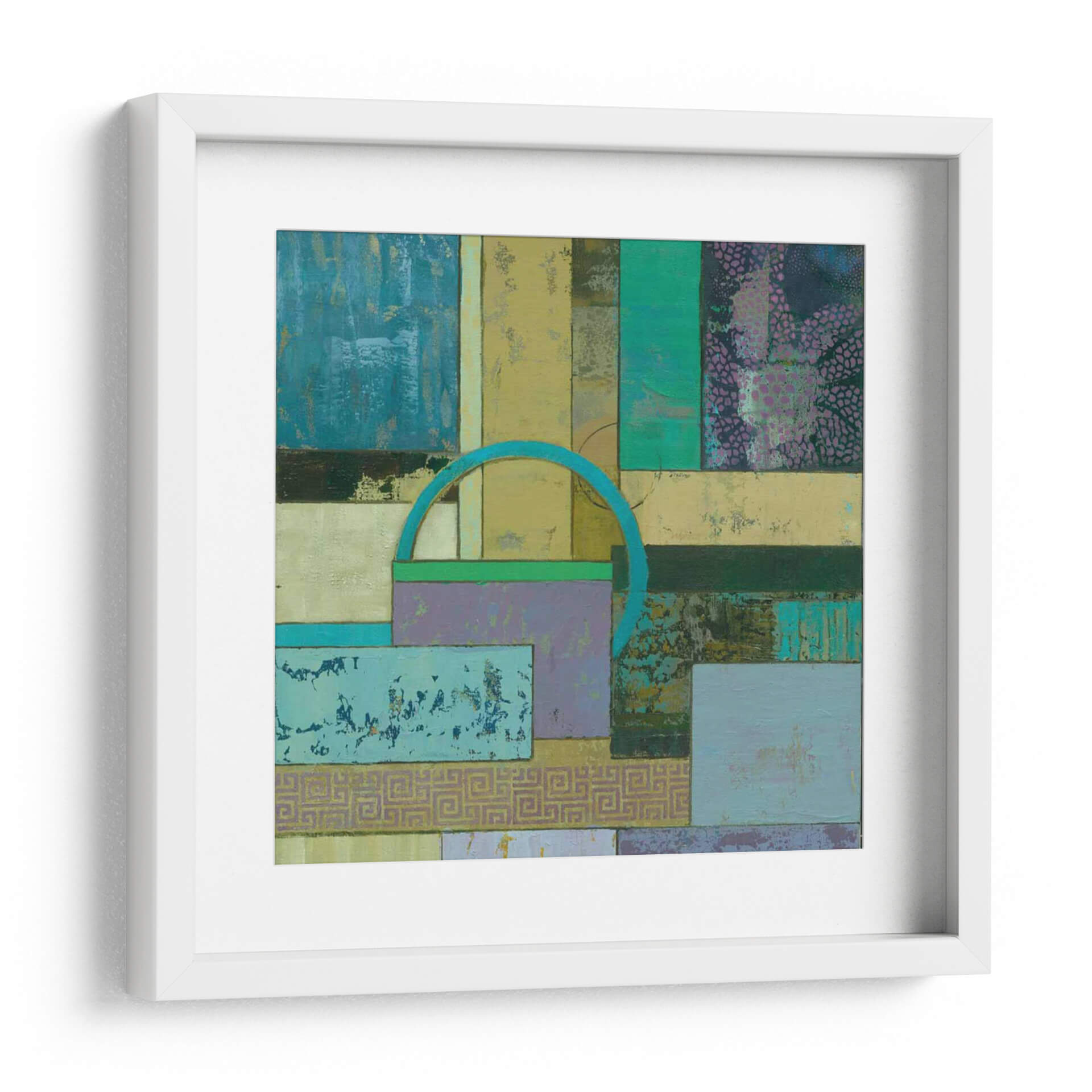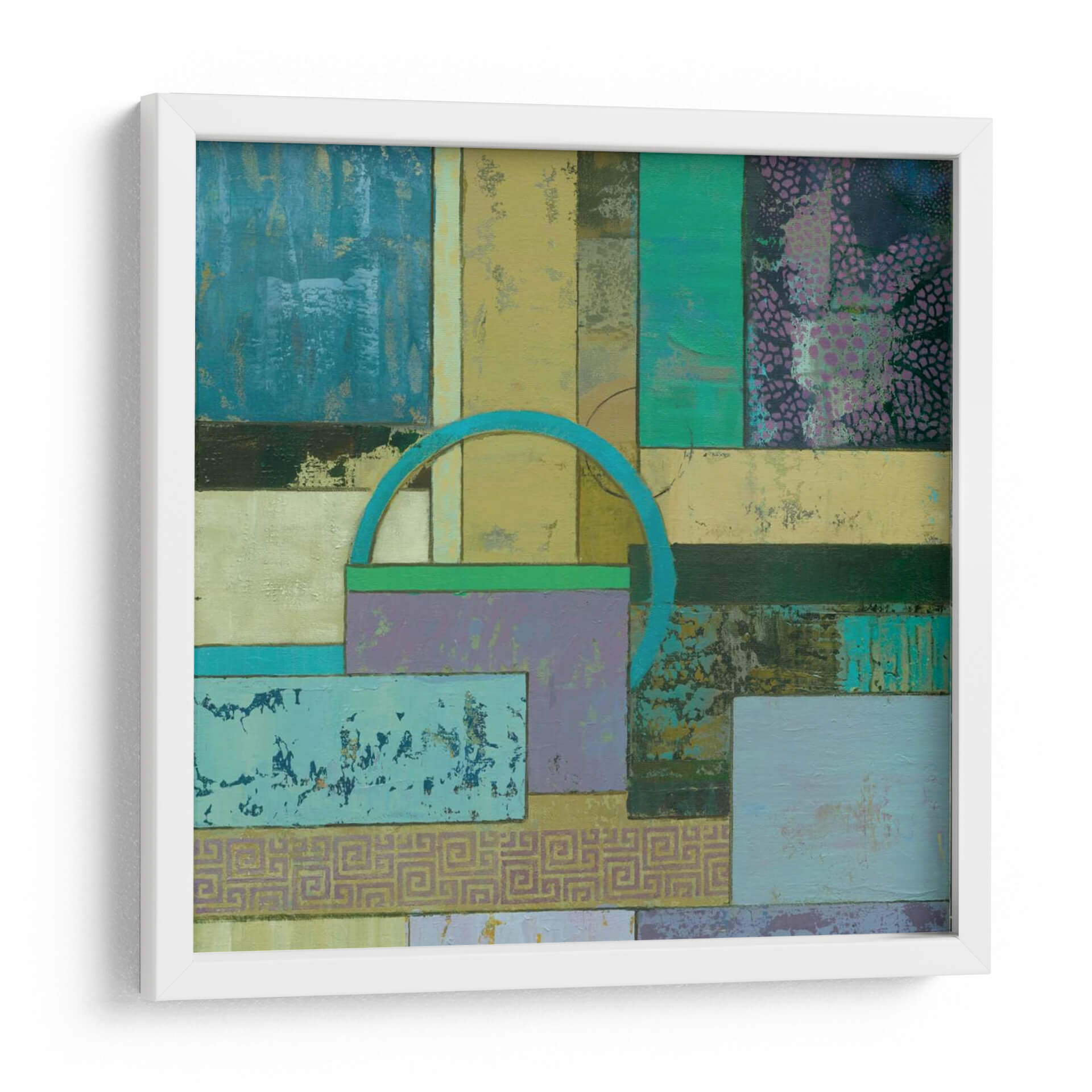 Sumérgete en la fascinante abstracción de 'Infusión Fósil I Un' de Julie Joy, una obra de arte contemporáneo que redefine el espacio con su cautivadora composición. Este cuadro decorativo se despliega como un tapiz visual de texturas y formas geométricas entrelazadas, invitando a la contemplación. La paleta de colores, dominada por tonos azules profundos, verdes esmeralda, amarillos ocre y toques de lila y púrpura, crea una atmósfera rica y enigmática que evoca tanto la serenidad de la naturaleza como la complejidad de la mente humana. La superposición de rectángulos y cuadrados, salpicados de patrones sutiles y texturas desgastadas, genera una sensación de profundidad y descubrimiento. Un arco azul turquesa emerge como un elemento focal intrigante, añadiendo un toque de dinamismo y misterio. Esta pieza abstracta es ideal para cualquier persona que busque infundir su hogar u oficina con un carácter único y una explosión de color controlada. 'Infusión Fósil I Un' no es solo una decoración de pared, es una experiencia sensorial que estimula la imaginación y añade un toque de sofisticación moderna a cualquier ambiente. Transforma tu espacio con esta cautivadora obra de arte, perfecta para salas de estar, estudios o pasillos donde el arte contemporáneo es apreciado por su capacidad de evocar emociones y conversaciones.