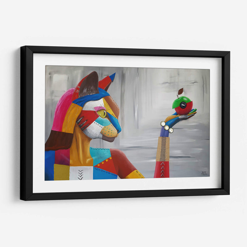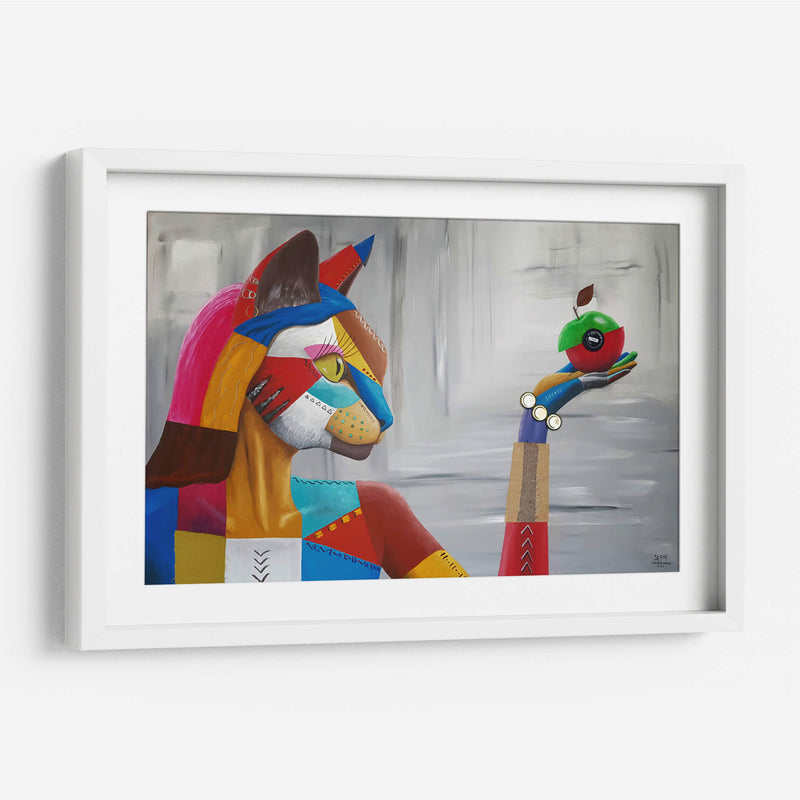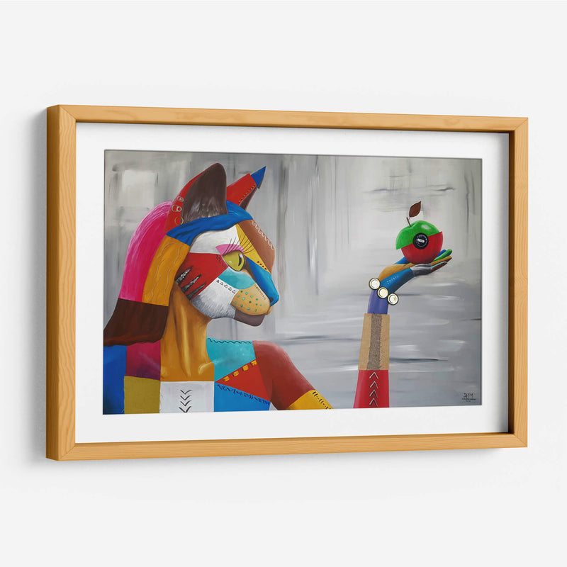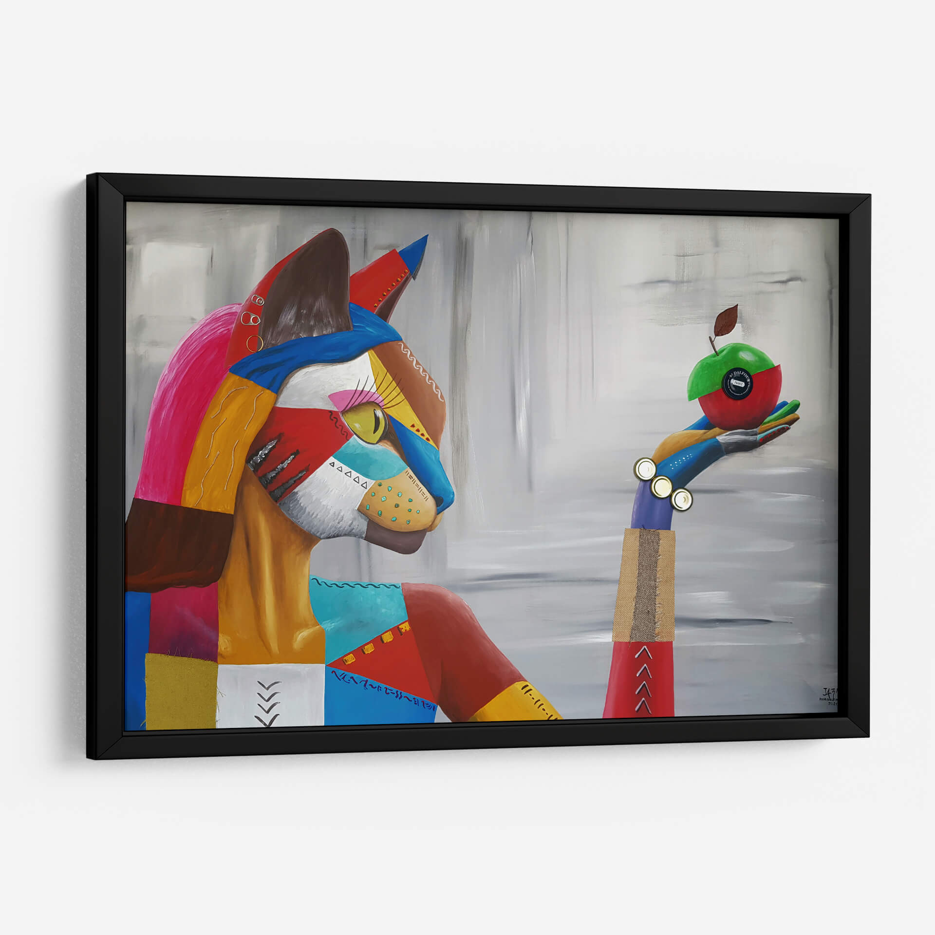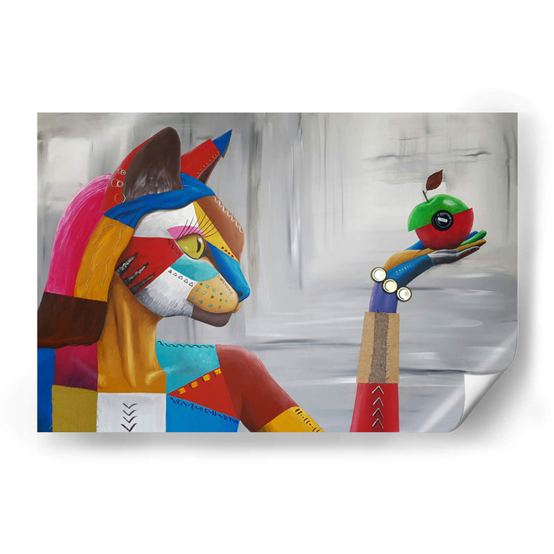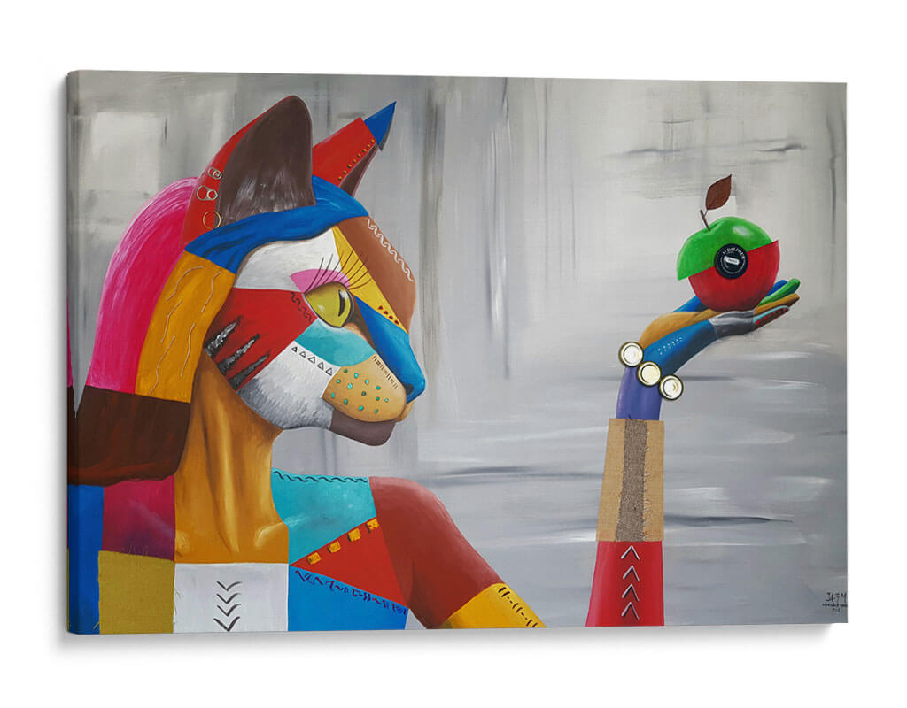 Adéntrate en un mundo de color y simbolismo con "La Gata y la Manzana", una obra de arte contemporáneo que desafía las convenciones. Este cautivador cuadro decorativo presenta una representación estilizada de una gata, cuya figura se construye a través de un vibrante mosaico de formas geométricas y colores audaces. Cada faceta de su rostro y cuerpo está definida por parches de rojo intenso, azul eléctrico, amarillo solar, rosa vibrante y toques de blanco y marrón, creando un efecto visual dinámico y lleno de energía. La mirada penetrante de la gata, resaltada por unos ojos amarillos intensos y cejas arqueadas, se dirige hacia una manzana dividida en dos, sostenida en una mano artificial de tonos diversos. La manzana, un símbolo clásico de conocimiento o tentación, se presenta aquí con un corte limpio, revelando un interior rojo y verde, coronada por una hoja marrón. El fondo, una abstracción de grises y blancos texturizados, contrasta sutilmente con la intensidad de la figura principal, permitiendo que la obra respire y que los detalles sean apreciados. "La Gata y la Manzana" es más que una simple imagen; es una invitación a la reflexión sobre la dualidad, la percepción y la belleza que se encuentra en lo inesperado. Este cuadro decorativo es perfecto para añadir un toque de originalidad y conversación a tu sala de estar, estudio u oficina, resonando con aquellos que aprecian el arte audaz y con carácter.