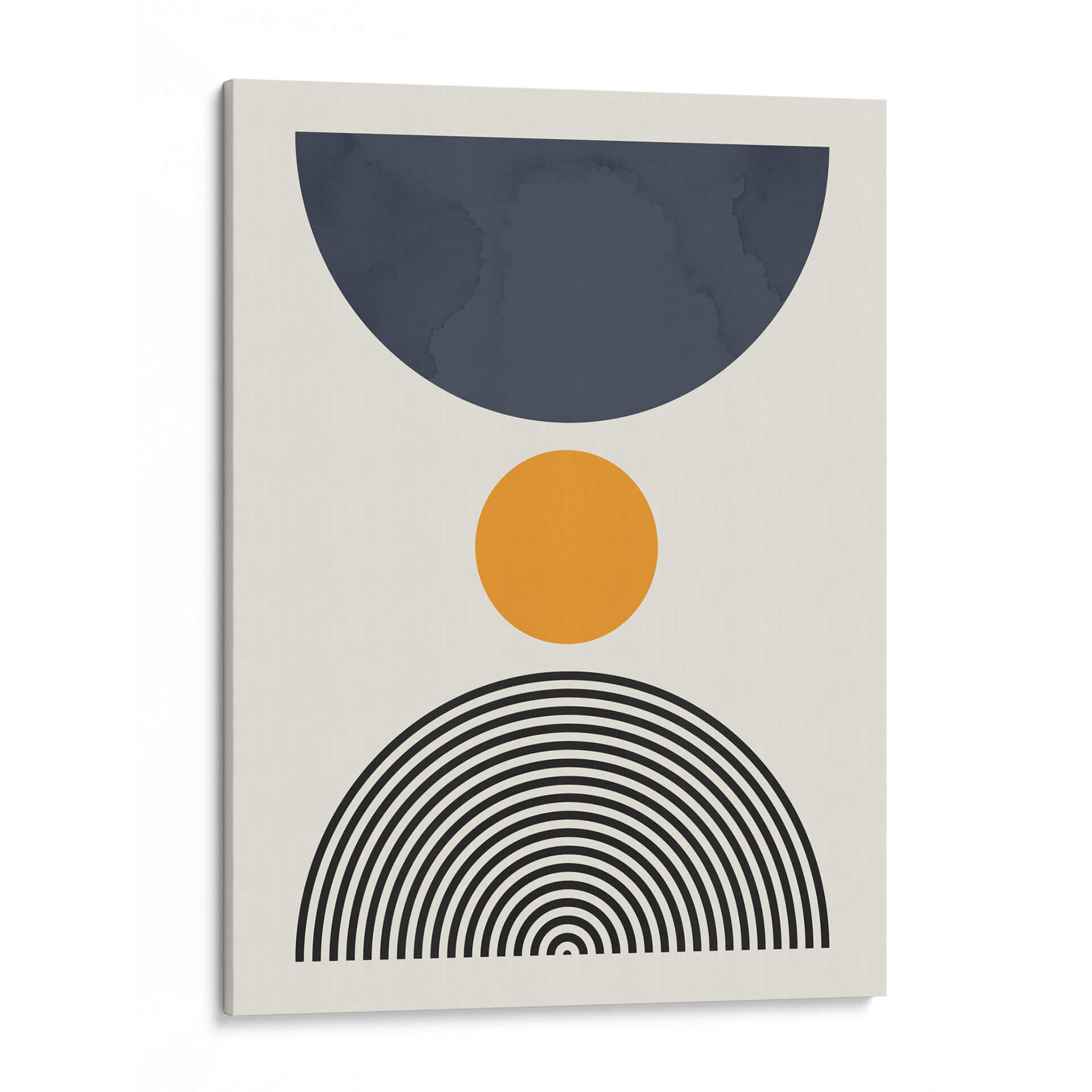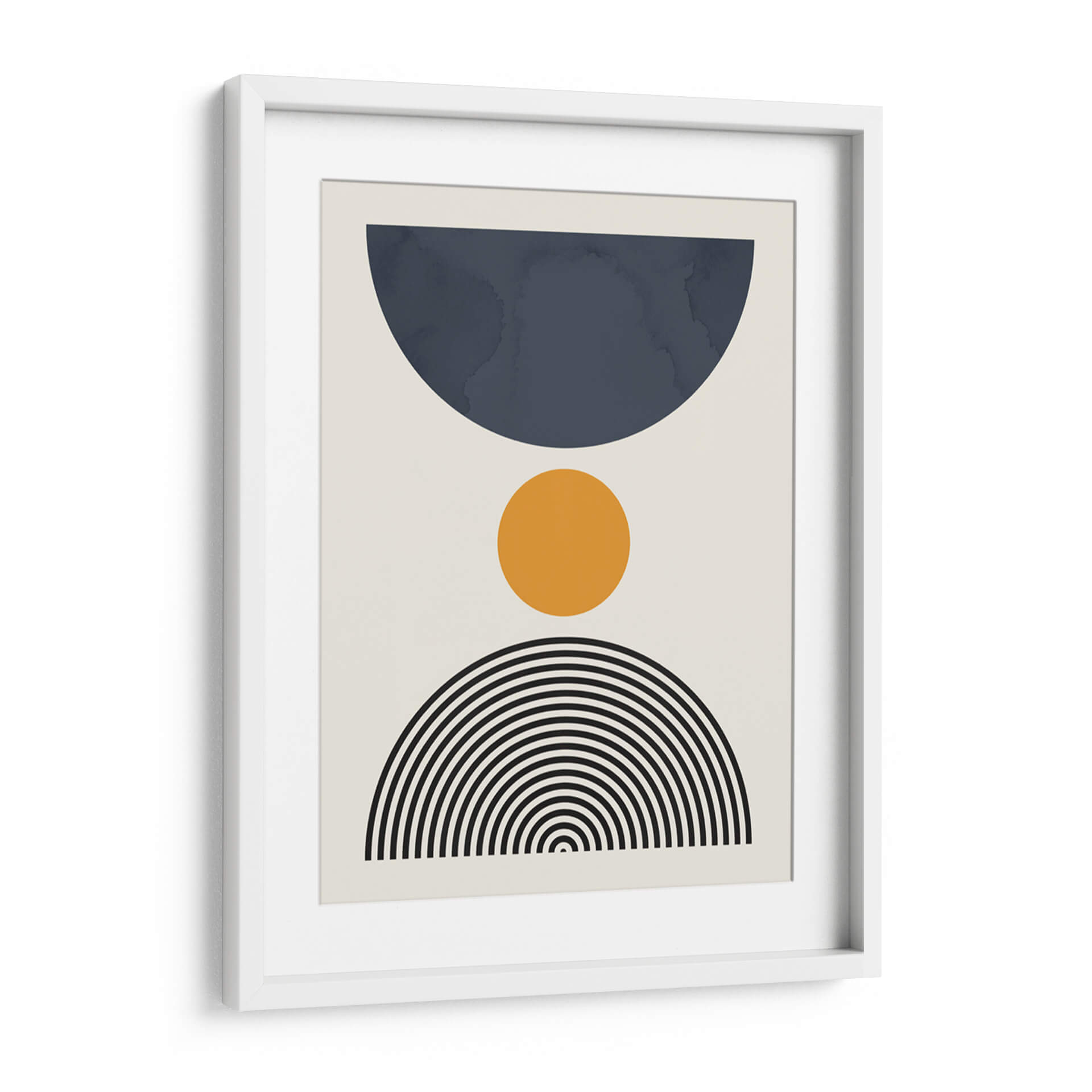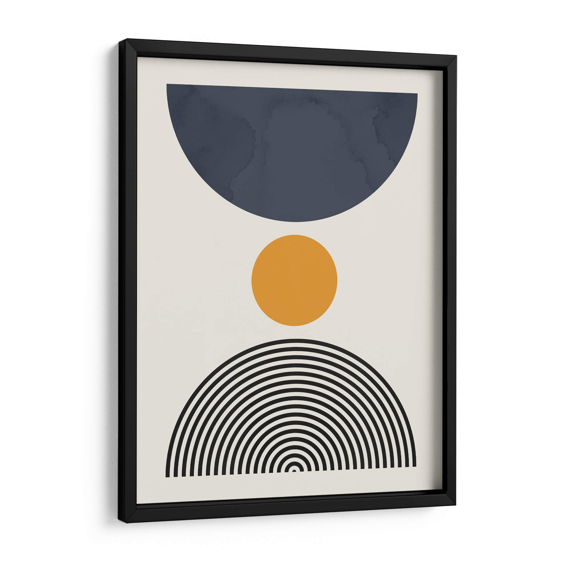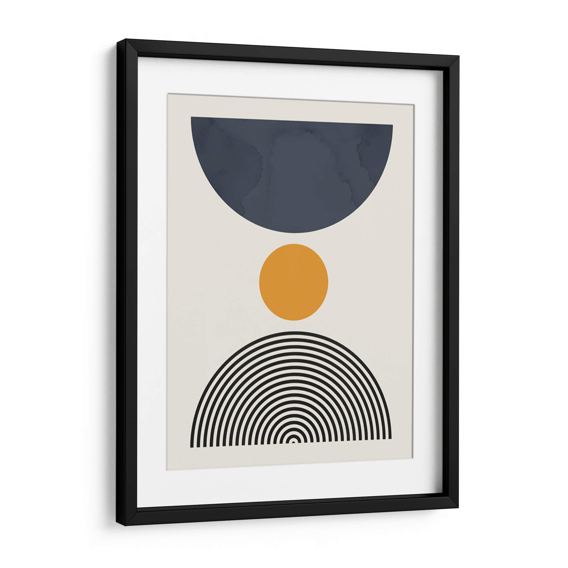 Sumérgete en la serenidad geométrica de "Líneas y Círculos 13", una obra de arte contemporáneo del artista Vitor Costa. Este cuadro decorativo presenta una composición limpia y moderna que combina formas abstractas con una paleta de colores sutilmente equilibrada. Un gran semicírculo en un profundo tono azul petróleo domina la parte superior, contrastando con un vibrante círculo naranja situado en el centro, que aporta un toque de calidez y energía. La base de la composición se completa con un abanico de líneas concéntricas negras que evocan un sentido de movimiento y armonía. El fondo neutro y claro permite que cada elemento brille, creando una pieza visualmente atractiva y versátil. Ideal para espacios que buscan un toque de sofisticación y un aire de calma, esta obra es perfecta para salones modernos, oficinas o dormitorios, añadiendo un punto focal de interés sin abrumar el entorno. "Líneas y Círculos 13" es una invitación a la contemplación, fusionando el arte abstracto con una estética depurada que complementa cualquier estilo decorativo, desde el minimalista hasta el escandinavo. Aporta equilibrio y un aire contemporáneo a tu hogar con este excepcional cuadro decorativo.