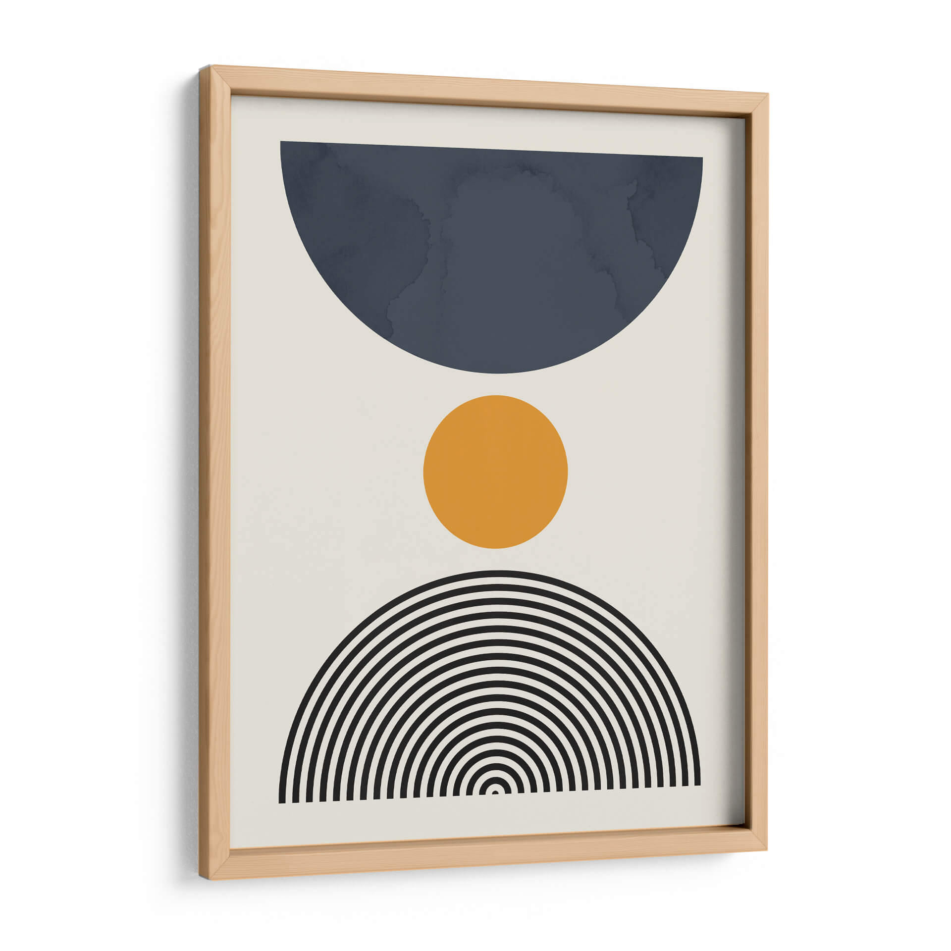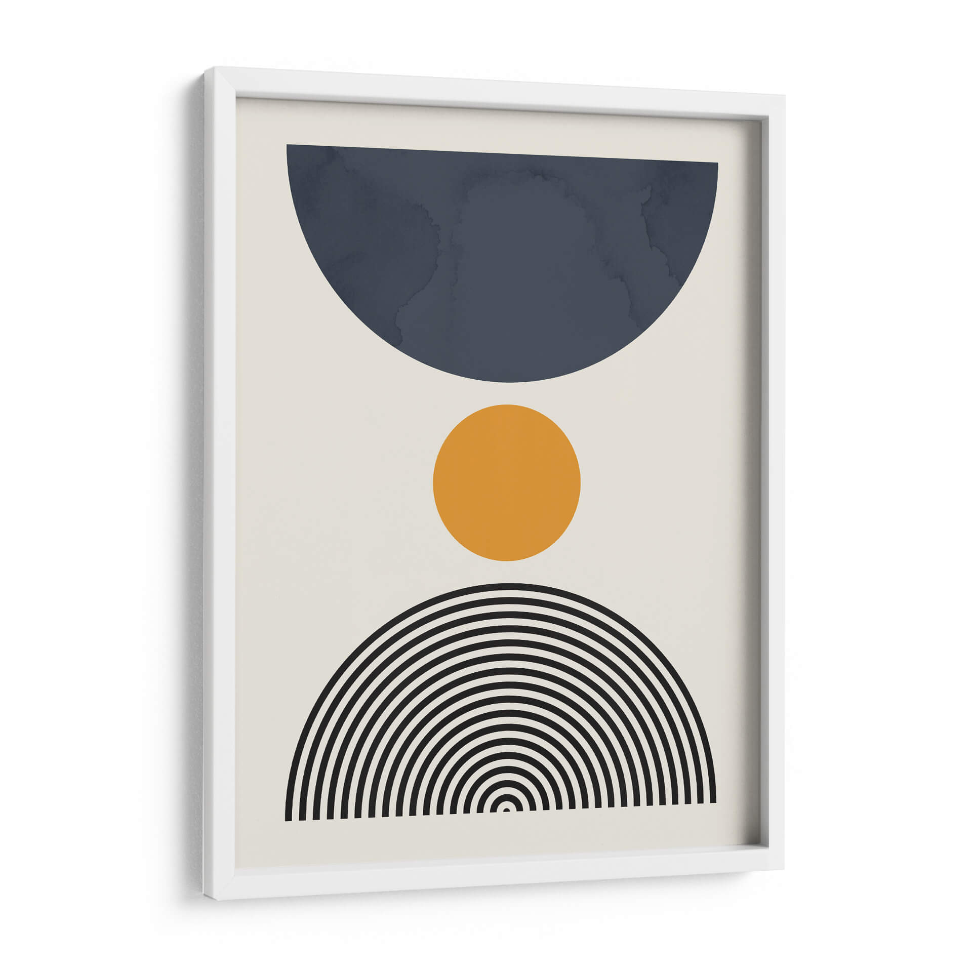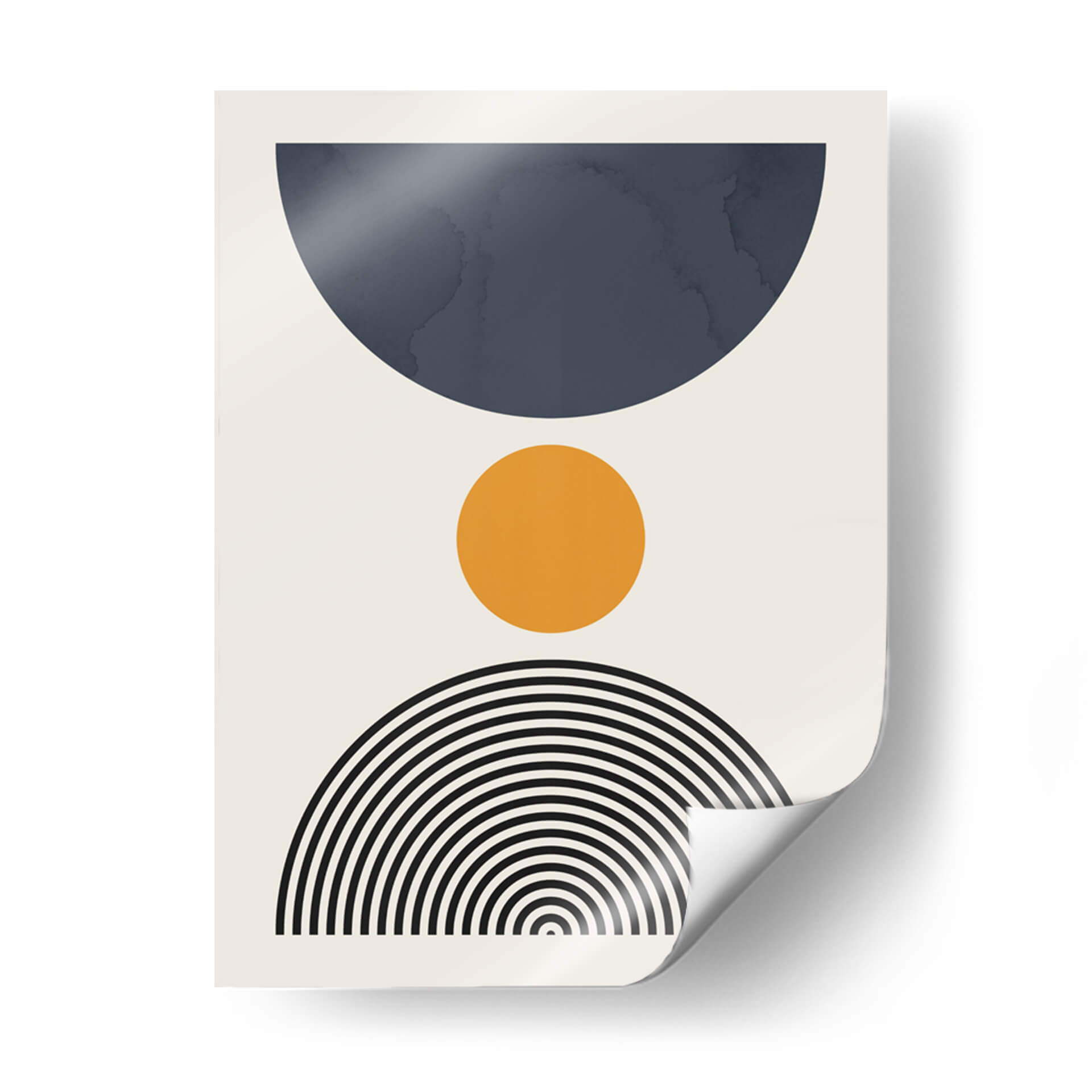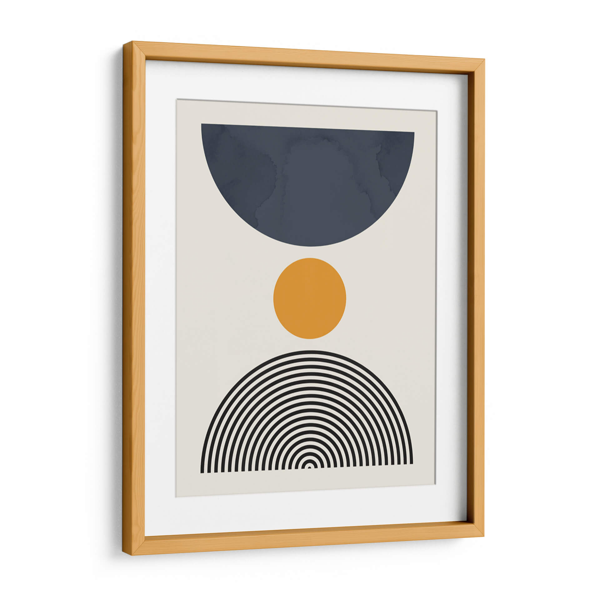Sumérgete en la serenidad geométrica de "Líneas y Círculos 13", una obra de arte contemporáneo del artista Vitor Costa. Este cuadro decorativo presenta una composición limpia y moderna que combina formas abstractas con una paleta de colores sutilmente equilibrada. Un gran semicírculo en un profundo tono azul petróleo domina la parte superior, contrastando con un vibrante círculo naranja situado en el centro, que aporta un toque de calidez y energía. La base de la composición se completa con un abanico de líneas concéntricas negras que evocan un sentido de movimiento y armonía. El fondo neutro y claro permite que cada elemento brille, creando una pieza visualmente atractiva y versátil. Ideal para espacios que buscan un toque de sofisticación y un aire de calma, esta obra es perfecta para salones modernos, oficinas o dormitorios, añadiendo un punto focal de interés sin abrumar el entorno. "Líneas y Círculos 13" es una invitación a la contemplación, fusionando el arte abstracto con una estética depurada que complementa cualquier estilo decorativo, desde el minimalista hasta el escandinavo. Aporta equilibrio y un aire contemporáneo a tu hogar con este excepcional cuadro decorativo.