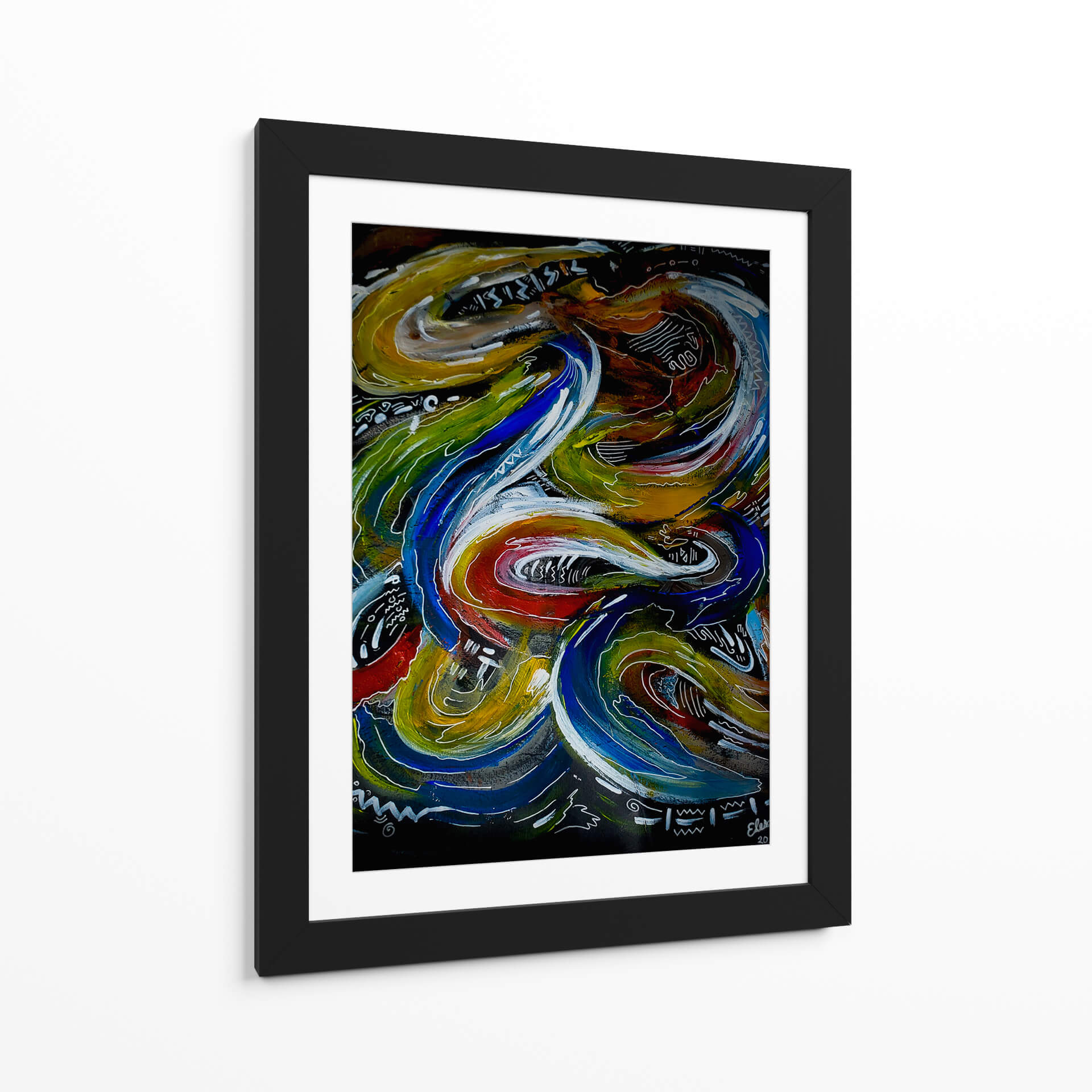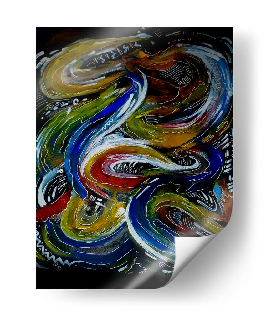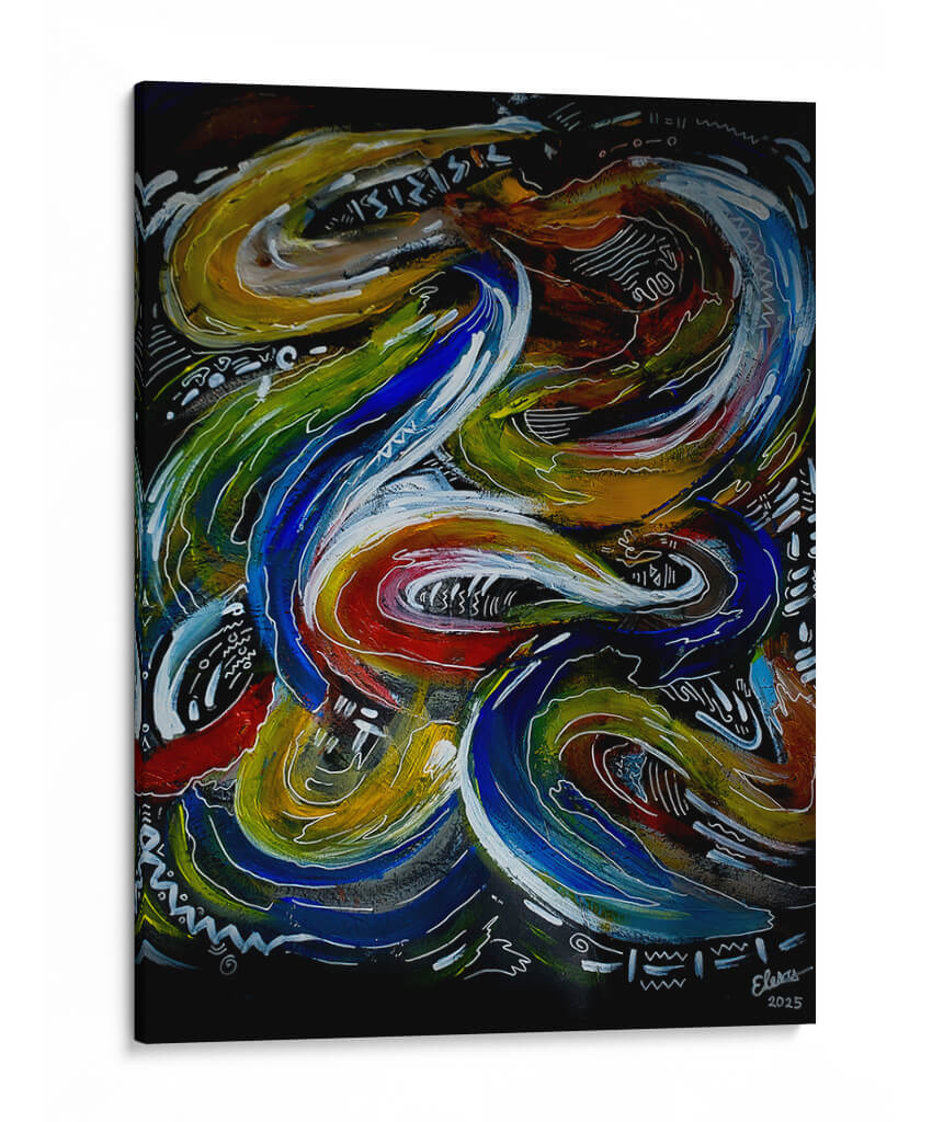 Sumérgete en la vibrante energía de "Mente Inquieta", una obra de arte contemporáneo que captura la esencia del movimiento y la introspección. Este cuadro decorativo se caracteriza por sus fluidas y dinámicas formas, que parecen danzar sobre un fondo oscuro y enigmático. La paleta de colores es rica y audaz, con intensos azules, verdes, amarillos y toques de rojo y blanco, creando un contraste cautivador que atrae la mirada y estimula la imaginación. La composición es intrincada, invitando al espectador a perderse en sus detalles y descubrir nuevas interpretaciones en cada vistazo. Las líneas sinuosas y los trazos enérgicos transmiten una sensación de vitalidad y creatividad desbordante, evocando la complejidad del pensamiento humano y la constante búsqueda de ideas. "Mente Inquieta" es ideal para añadir un toque de carácter y profundidad a cualquier espacio, ya sea una sala de estar moderna, un estudio o una oficina. Este cuadro decorativo contemporáneo es una pieza que no solo embellece, sino que también inspira conversaciones y refleja una personalidad audaz y reflexiva. Transforma tu hogar u oficina con esta pieza única que combina estilo, emoción y arte abstracto de manera magistral. Su impacto visual lo convierte en un punto focal perfecto para cualquier ambiente que busque distinción y dinamismo.