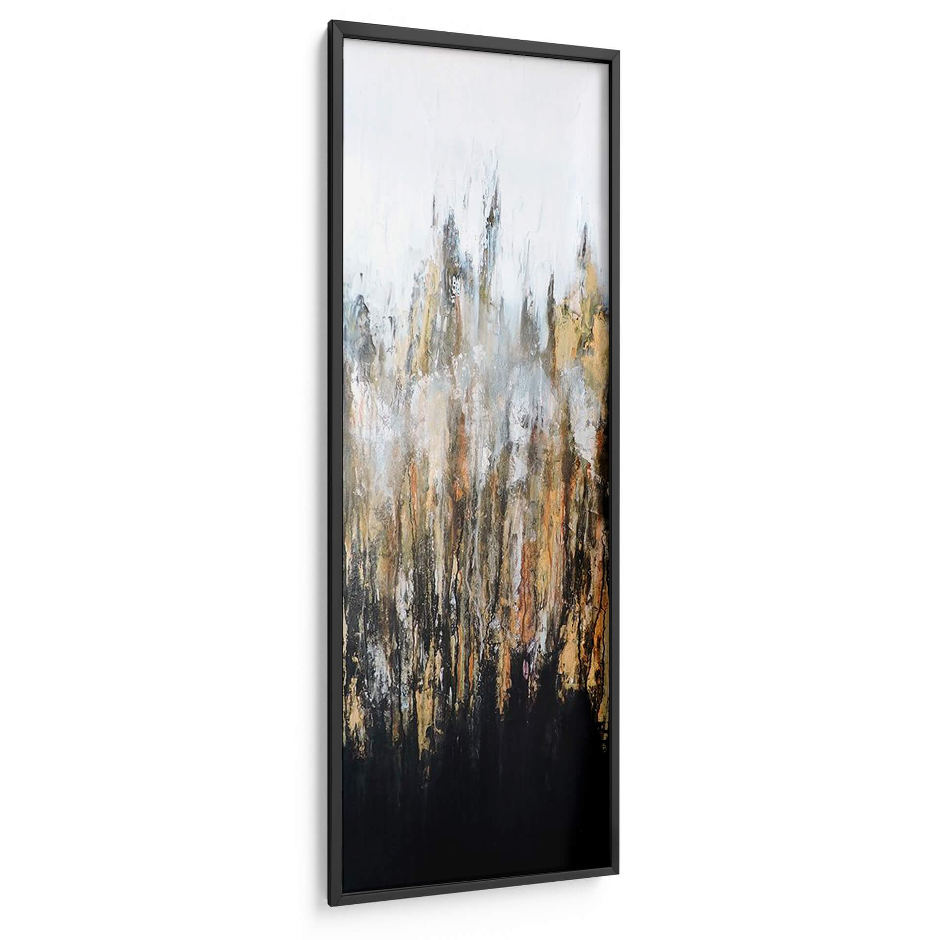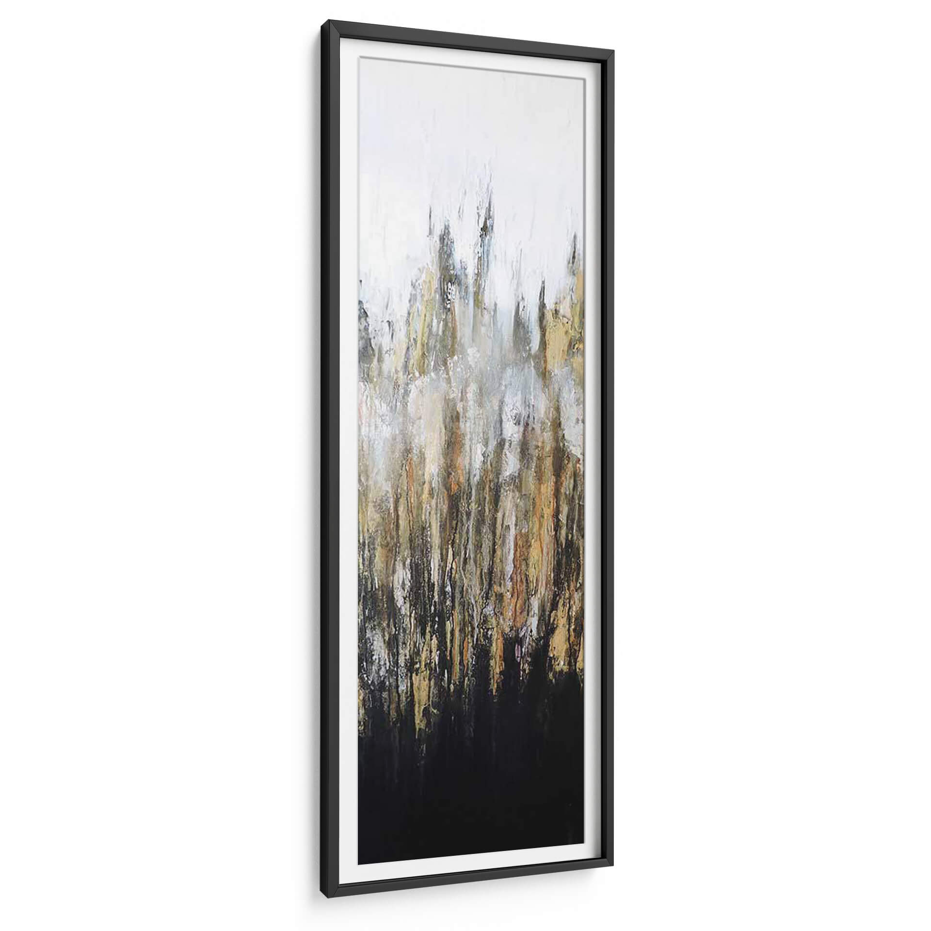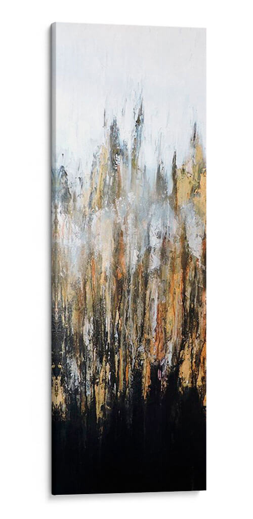 Adéntrate en la profundidad abstracta de "Metalico II", una obra de arte contemporáneo de Leticia Herrera que cautiva por su textura y paleta cromática. Este cuadro decorativo vertical se despliega en una cascada de tonos dorados, ocres, grises y negros, evocando una sensación de energía contenida y sofisticación. Las pinceladas gestuales y el juego de luces y sombras crean un efecto casi metálico, invitando a la contemplación y al descubrimiento de nuevas capas en cada mirada. Su composición vertical, con una base oscura sólida que se eleva hacia un blanco etéreo, genera un contraste dinámico y una sensación de movimiento ascendente. "Metalico II" es ideal para transformar cualquier espacio, desde una sala de estar moderna hasta una oficina ejecutiva, añadiendo un toque de lujo y carácter distintivo. Es una pieza que no solo decora, sino que también dialoga con el observador, despertando emociones y reflexionessobre la abstracción y la belleza inherente a las formas y colores. Perfecta para quienes buscan una decoración de pared que combine vanguardia y elegancia atemporal, esta obra se convertirá en un punto focal inspirador en tu hogar u oficina, fusionando arte contemporáneo con una presencia magnética y serena.