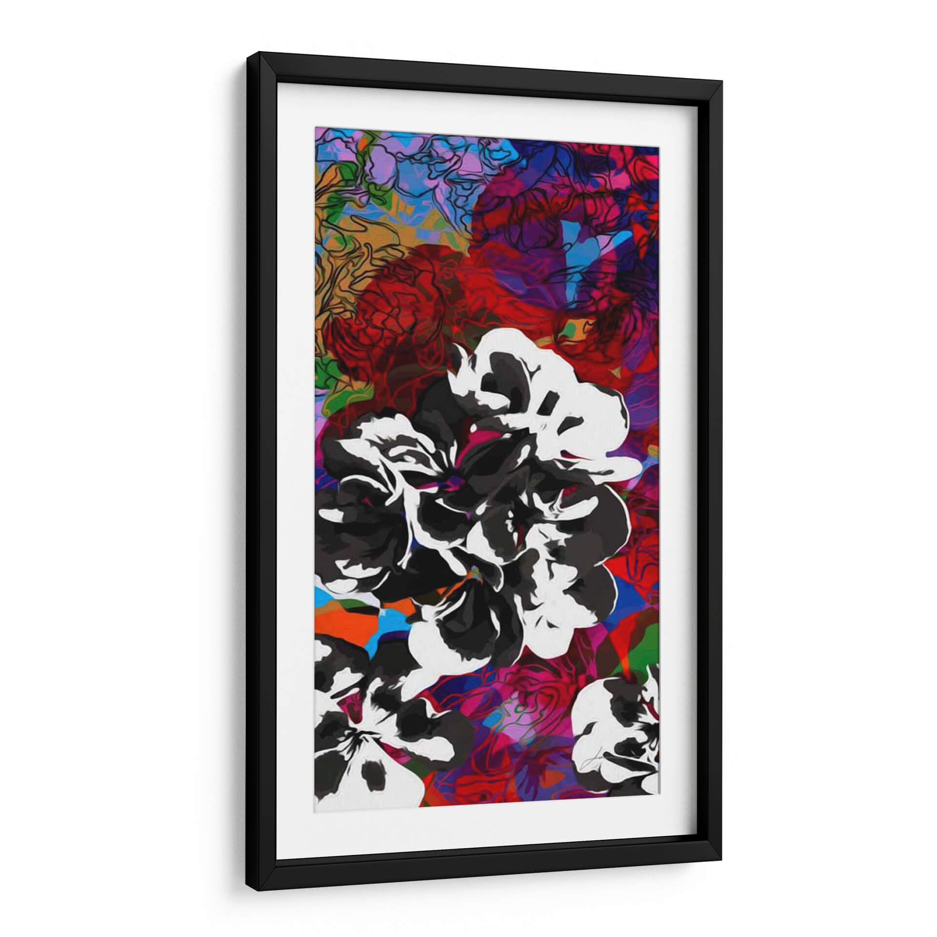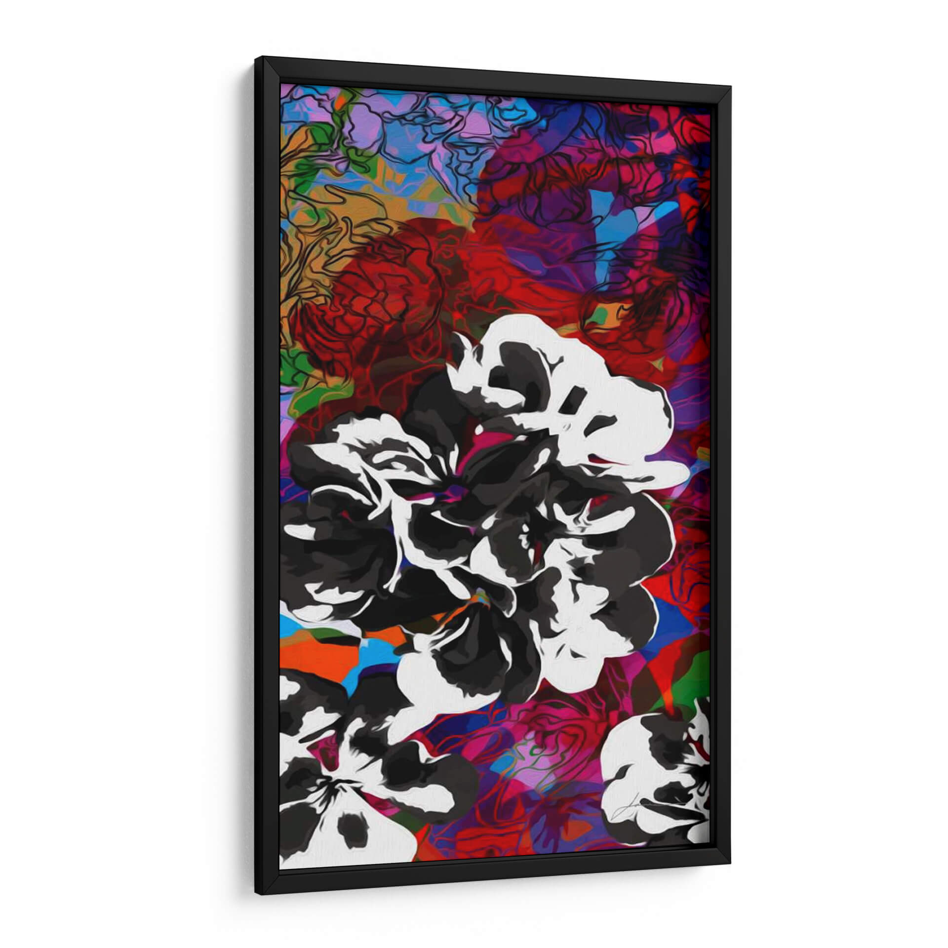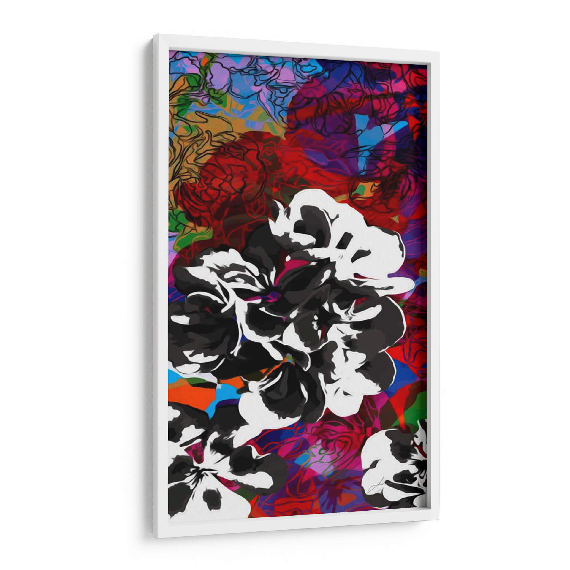 Sumérgete en la vibrante y audaz composición de "Oligoelementos I", una obra de arte contemporáneo que desafía las convenciones. El artista James Burghardt nos presenta un explosivo despliegue de formas florales estilizadas, dominadas por un impactante contraste entre el blanco y negro de los pétalos y un fondo multifacético de colores intensos. Tonos de rojo carmesí, azul eléctrico, magenta vibrante y toques de naranja y verde se entrelazan creando una sensación de profundidad y dinamismo. La técnica mixta, que combina contornos definidos con áreas de color audaz y texturas sugeridas, aporta una energía única a la pieza. Esta obra es ideal para quienes buscan un cuadro decorativo que inyecte personalidad y un aire moderno a su hogar u oficina. Perfecta para salas de estar, comedores o incluso espacios de trabajo creativos, "Oligoelementos I" es más que una simple decoración; es una declaración de estilo y una invitación a la contemplación de la belleza abstracta y la vitalidad.
