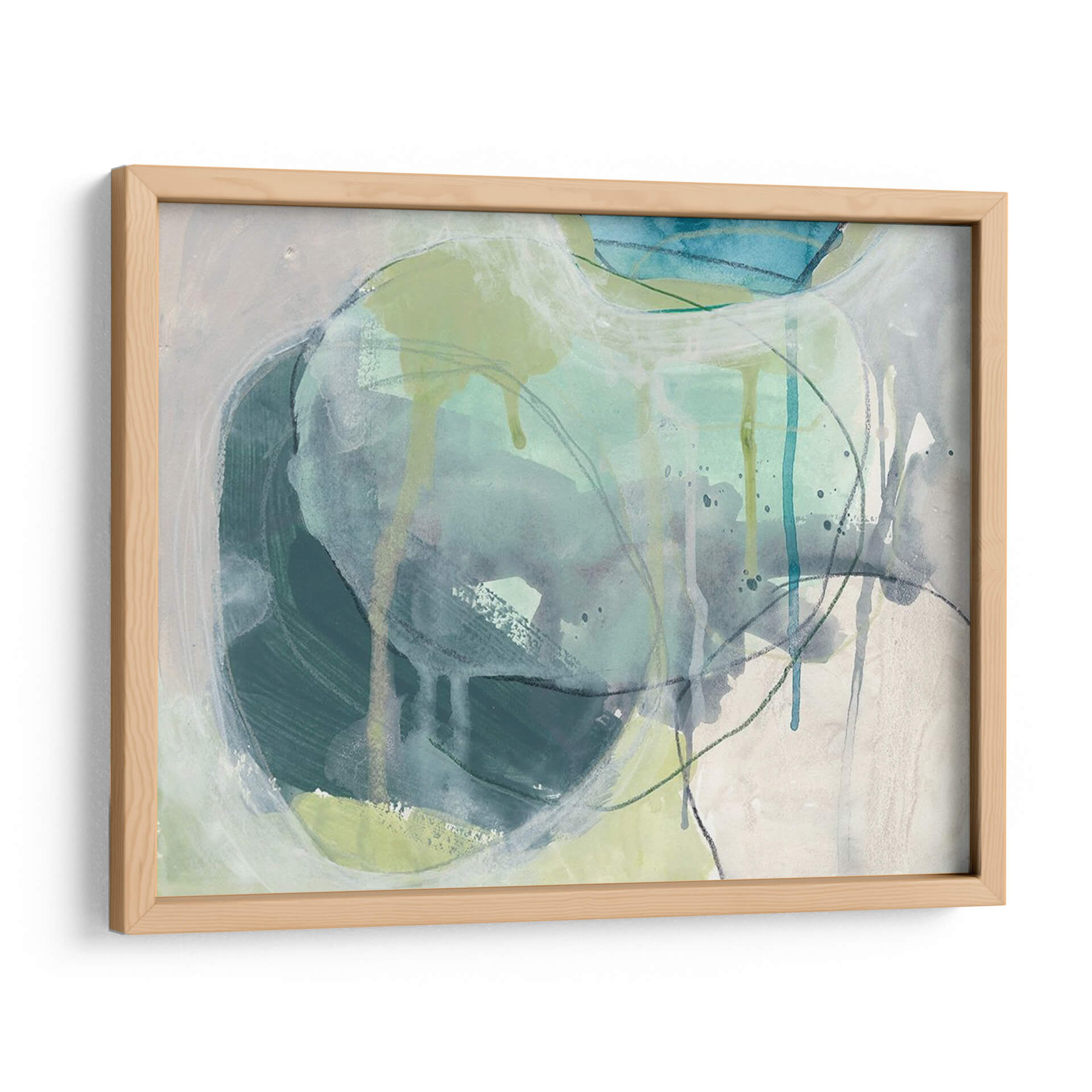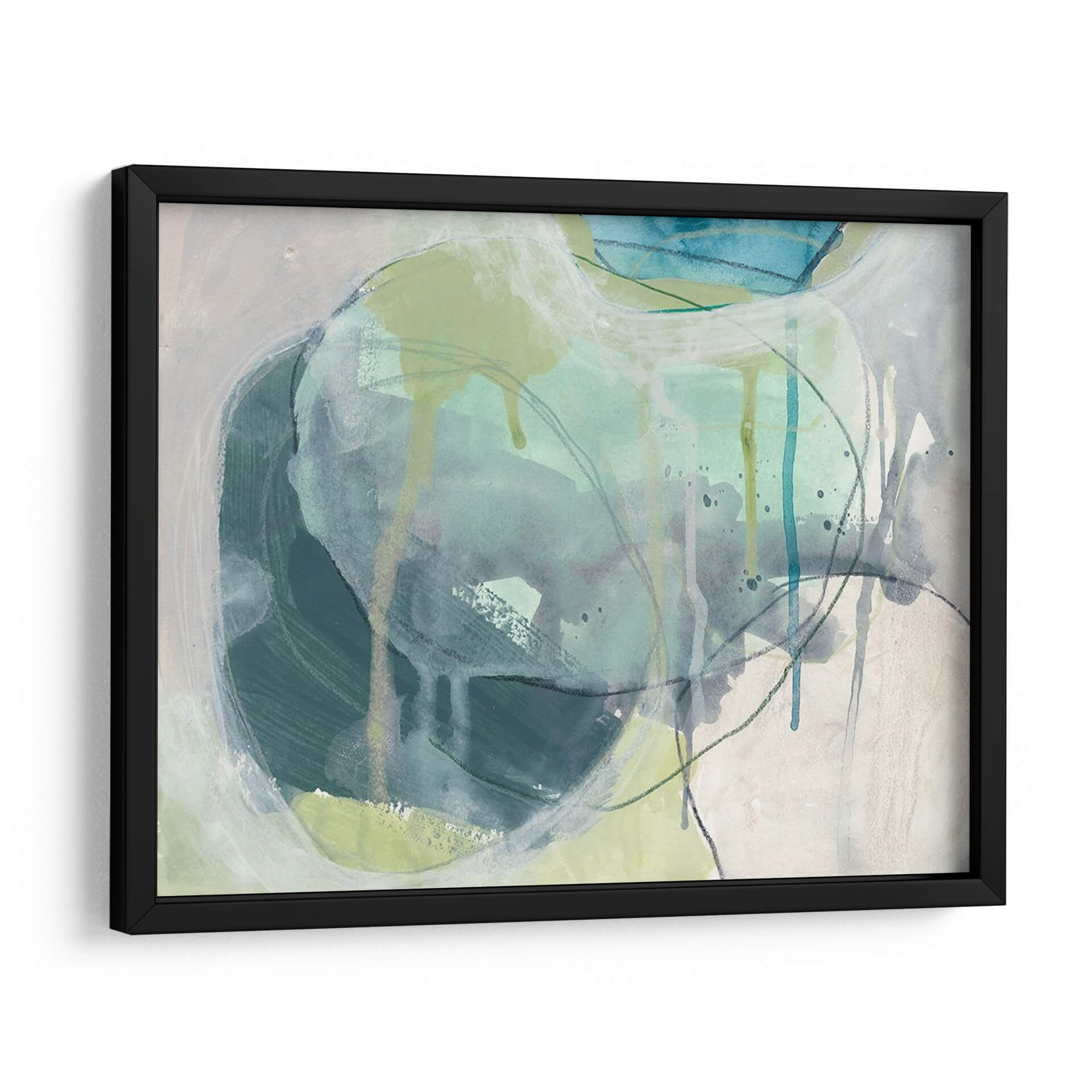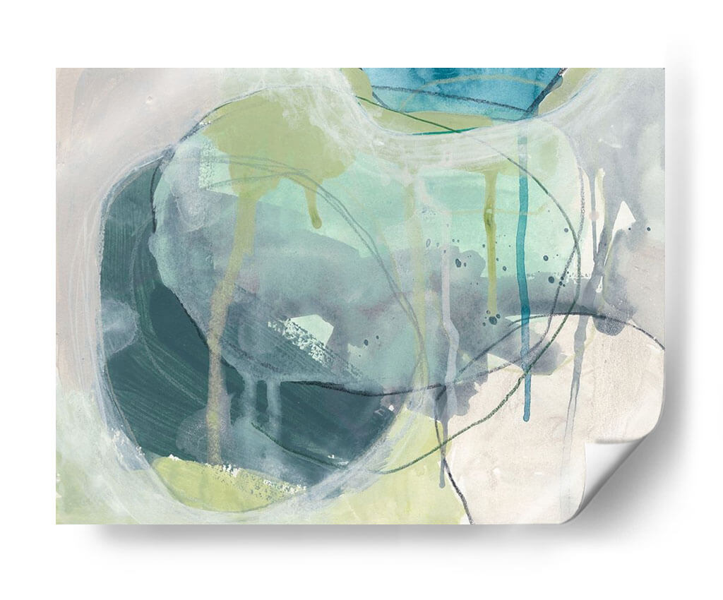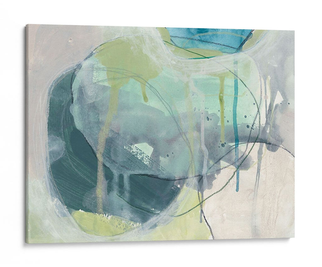 Sumérgete en la serenidad acuática con "Piedra De Mar I", una obra de arte contemporáneo que evoca la fluidez y la calma del océano. La artista June Erica Vess utiliza una paleta de colores suaves, dominada por tonos azul verdosos, grises y toques de verde lima, creando una atmósfera de tranquilidad y contemplación. Las pinceladas sueltas y las líneas fluidas, junto con sutiles efectos de goteo, sugieren la textura y el movimiento del agua y las rocas marinas erosionadas por el tiempo. Este cuadro decorativo abstracto es ideal para infundir paz y sofisticación en cualquier espacio, desde salones modernos hasta dormitorios o estudios que buscan un refugio de serenidad. Su composición orgánica invita a la meditación y a la conexión con la naturaleza, convirtiéndose en un punto focal que armoniza y eleva el ambiente. "Piedra De Mar I" es más que una pieza decorativa; es una invitación a un momento de quietud y belleza natural, perfecta para quienes aprecian el arte abstracto con un toque orgánico y emocionalmente resonante.