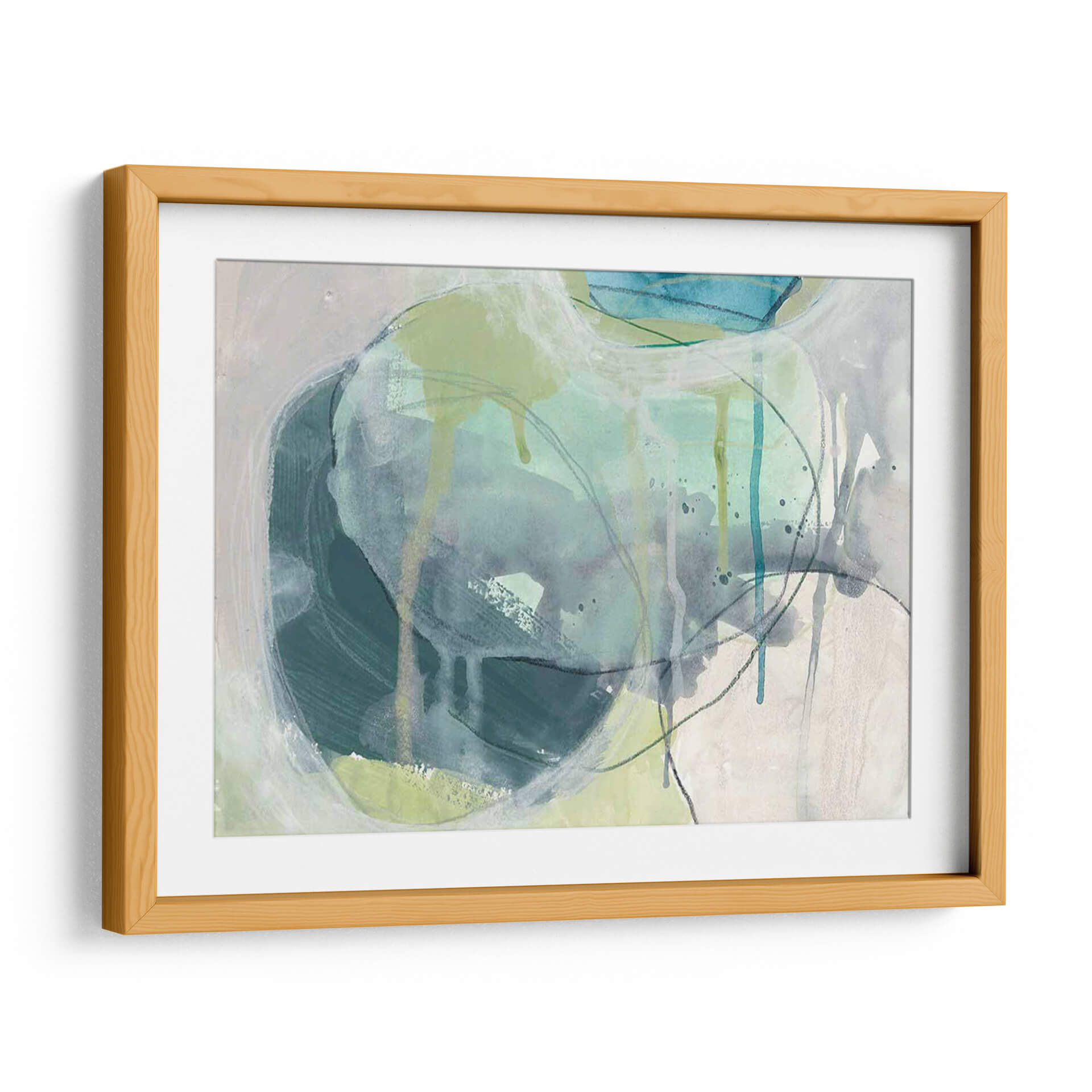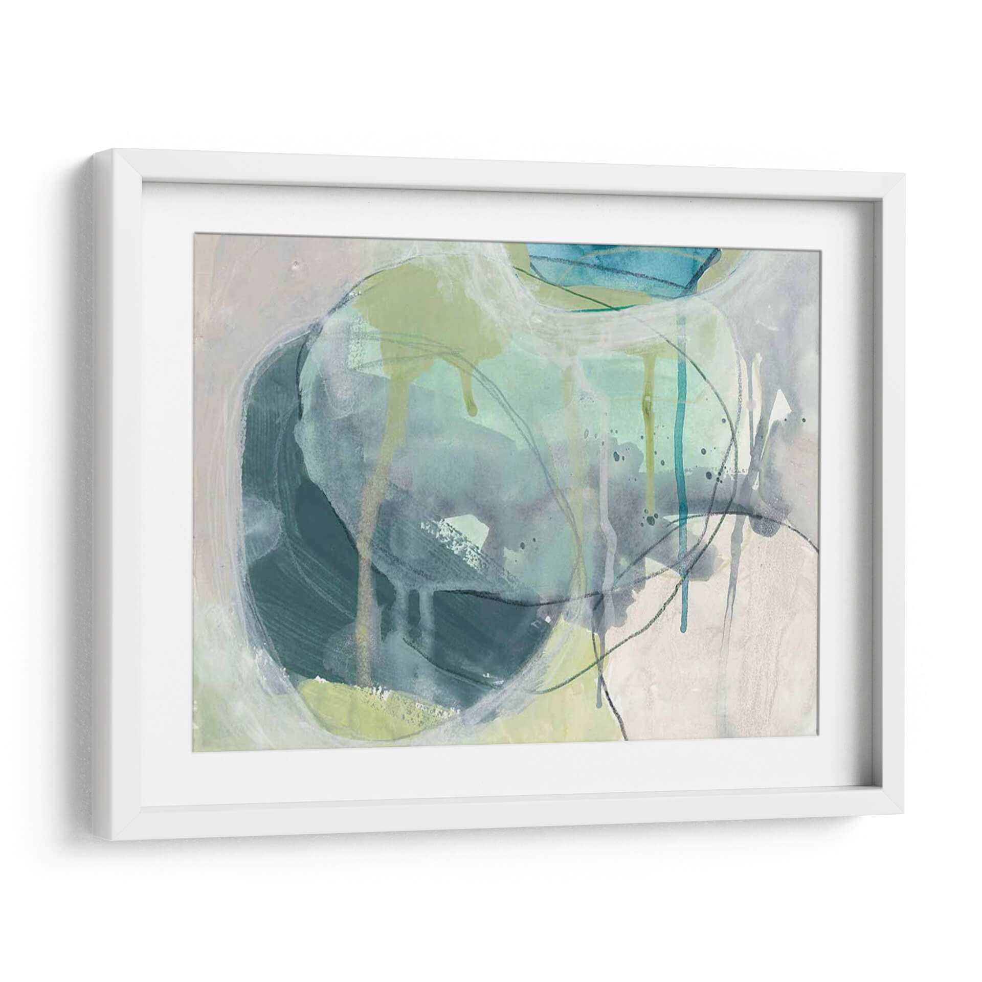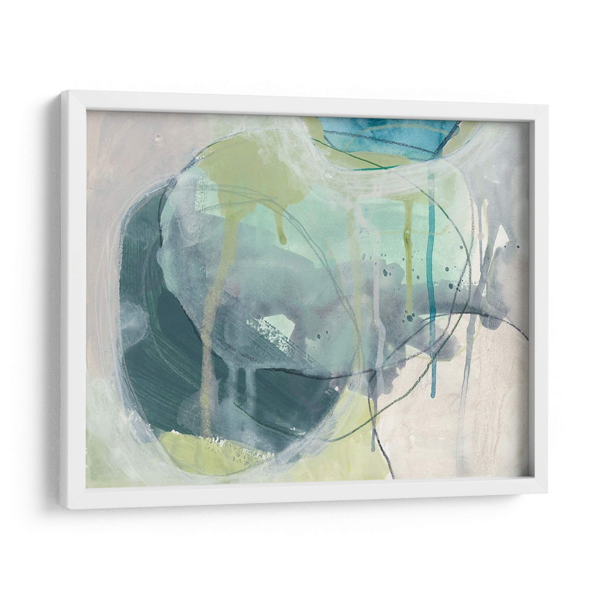 Sumérgete en la serenidad acuática con "Piedra De Mar I", una obra de arte contemporáneo que evoca la fluidez y la calma del océano. La artista June Erica Vess utiliza una paleta de colores suaves, dominada por tonos azul verdosos, grises y toques de verde lima, creando una atmósfera de tranquilidad y contemplación. Las pinceladas sueltas y las líneas fluidas, junto con sutiles efectos de goteo, sugieren la textura y el movimiento del agua y las rocas marinas erosionadas por el tiempo. Este cuadro decorativo abstracto es ideal para infundir paz y sofisticación en cualquier espacio, desde salones modernos hasta dormitorios o estudios que buscan un refugio de serenidad. Su composición orgánica invita a la meditación y a la conexión con la naturaleza, convirtiéndose en un punto focal que armoniza y eleva el ambiente. "Piedra De Mar I" es más que una pieza decorativa; es una invitación a un momento de quietud y belleza natural, perfecta para quienes aprecian el arte abstracto con un toque orgánico y emocionalmente resonante.