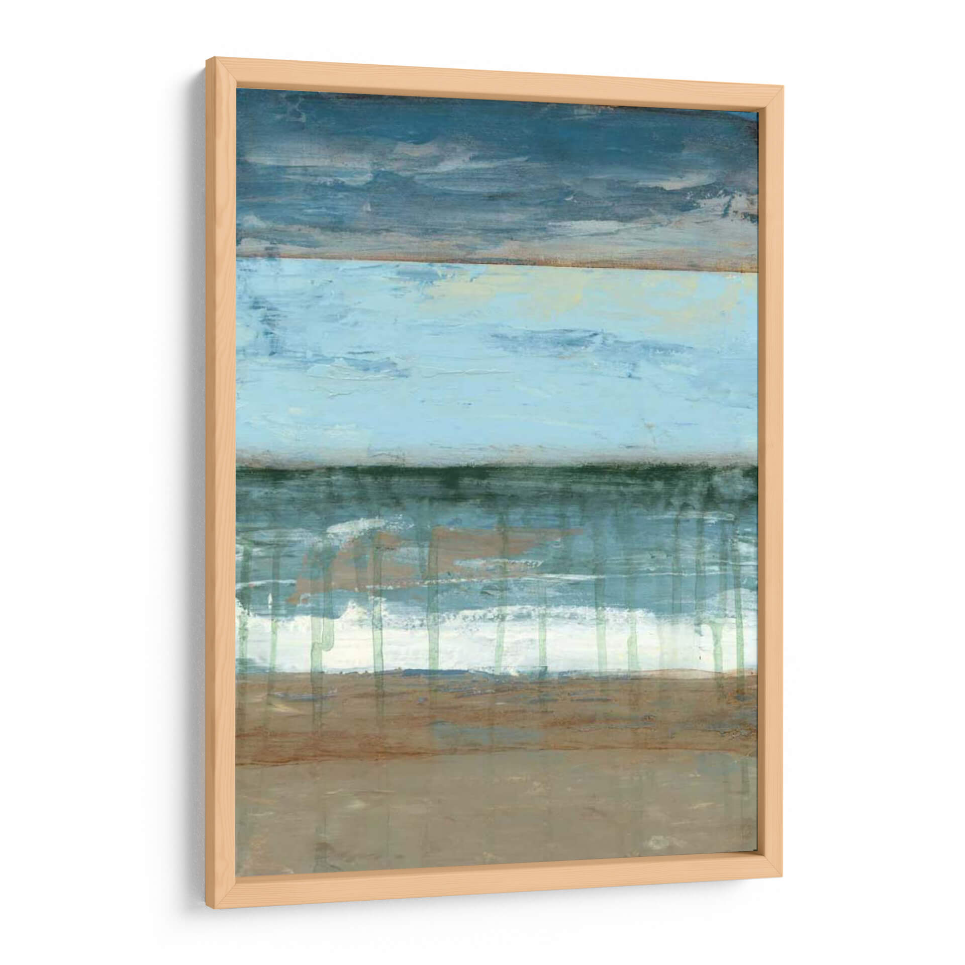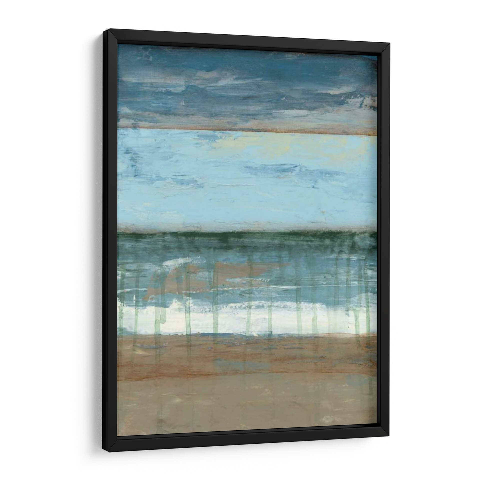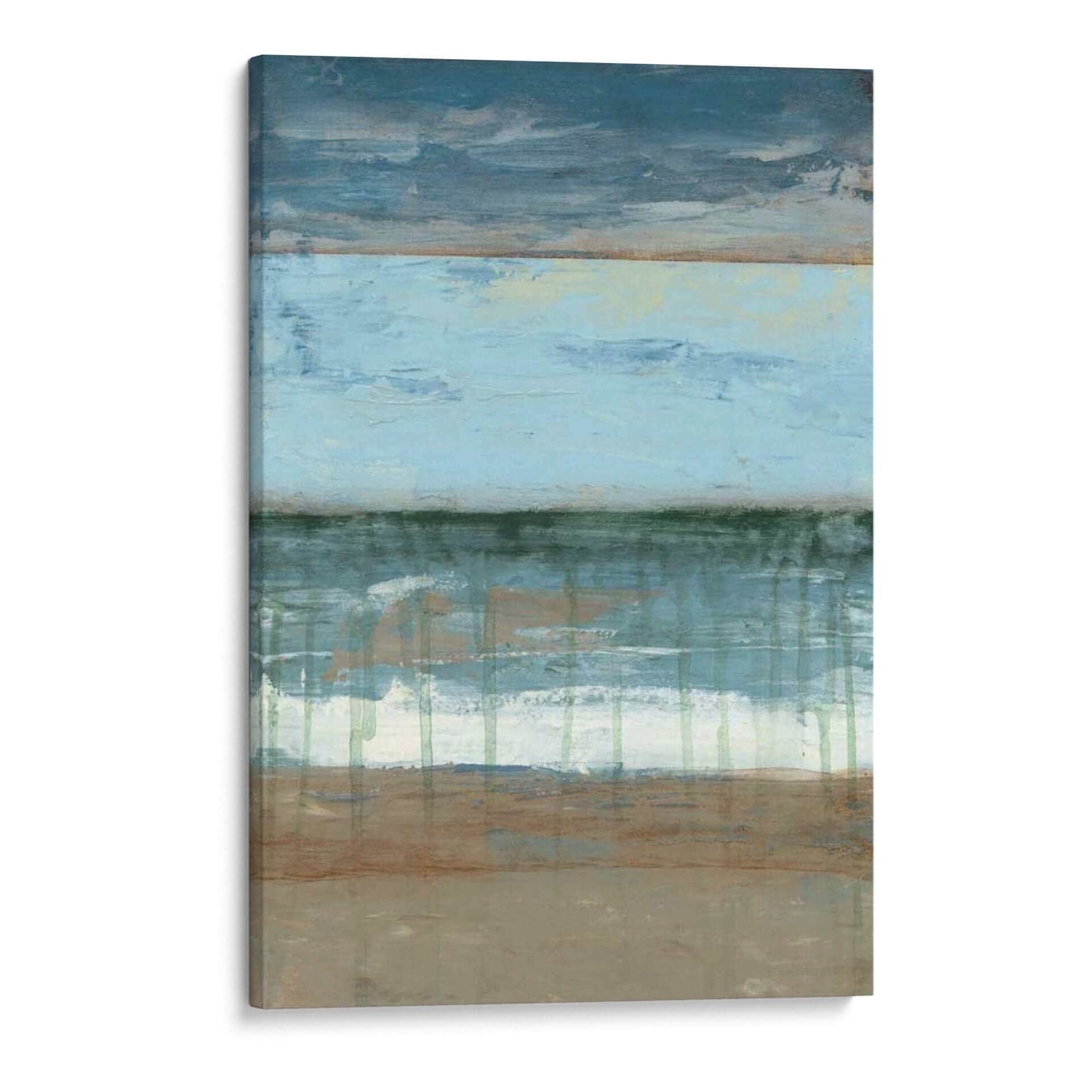 Sumérgete en la serenidad de "Resumen Costera II", una obra de arte abstracto que evoca la tranquilidad de la costa. La pieza presenta una composición horizontal dividida en bandas de color que recuerdan al mar, el cielo y la tierra, con una paleta de azules profundos, celestes pálidos, verdes marinos y tonos tierra. Las texturas visuales y las pinceladas gestuales crean una sensación de movimiento y profundidad, como las olas rompiendo en la orilla o las nubes flotando en el horizonte. Este cuadro decorativo es perfecto para quienes buscan infundir calma y una conexión sutil con la naturaleza en sus espacios. Ideal para salones, dormitorios o estudios, "Resumen Costera II" añade un toque de sofisticación contemporánea y una atmósfera de paz y contemplación. Su estilo abstracto y su paleta de colores suave lo convierten en una adición versátil a cualquier decoración moderna, minimalista o costera. Permite que esta pieza transporte tus sentidos a un paisaje sereno y te brinde un refugio visual diario.
