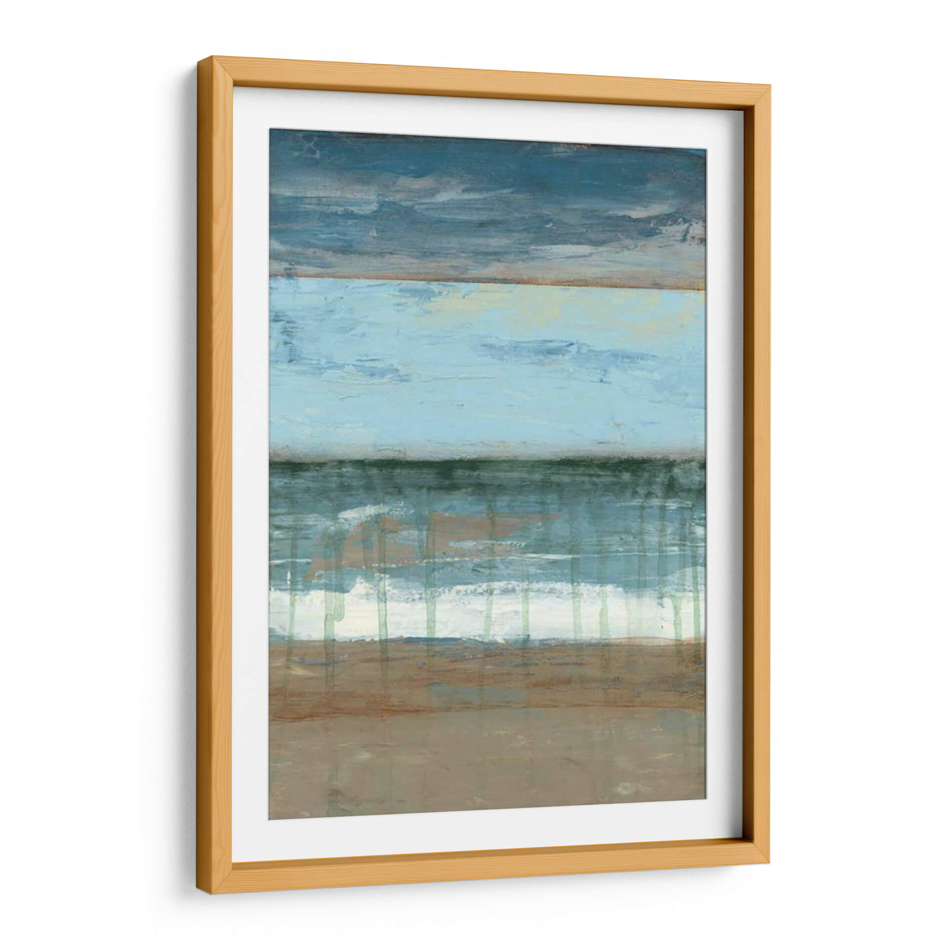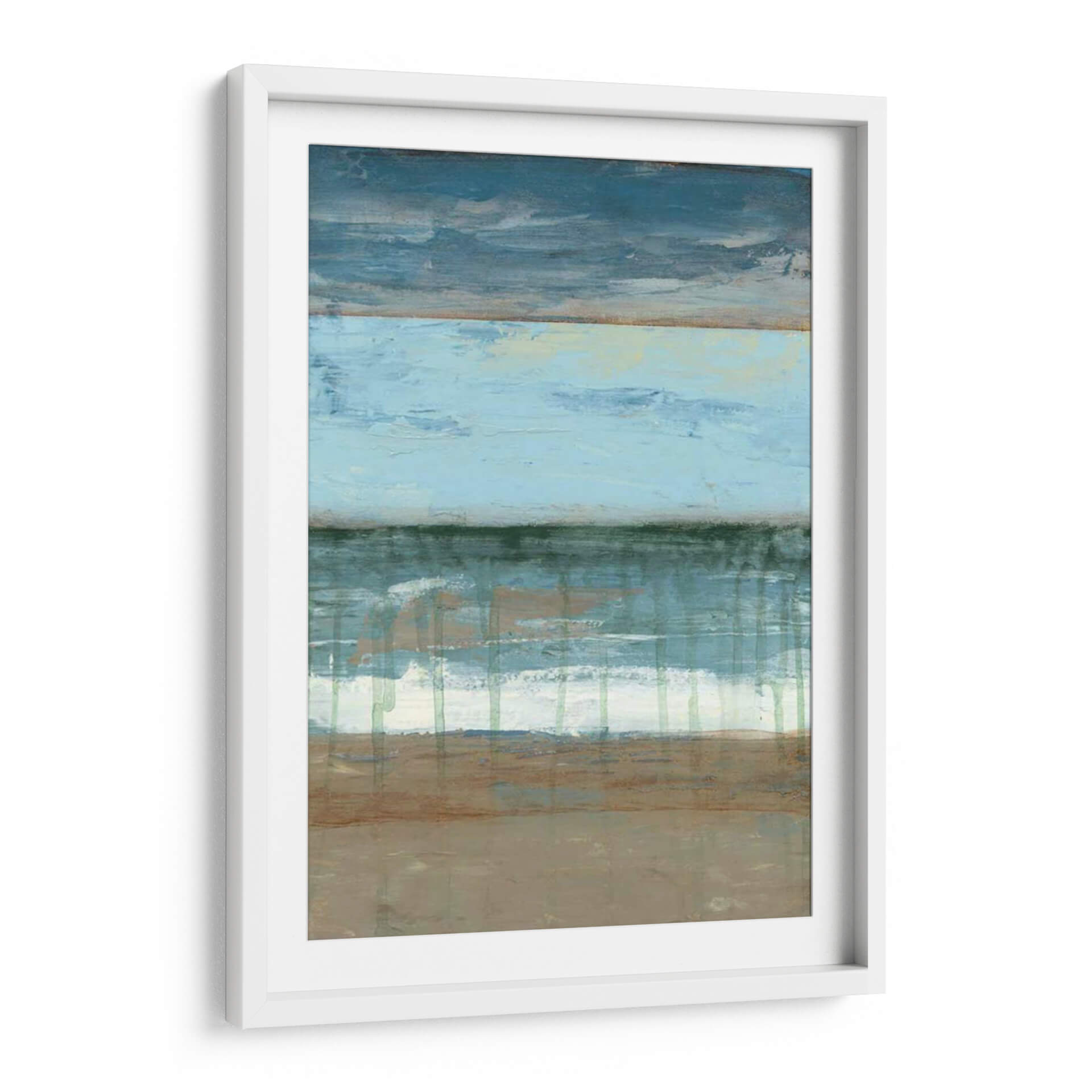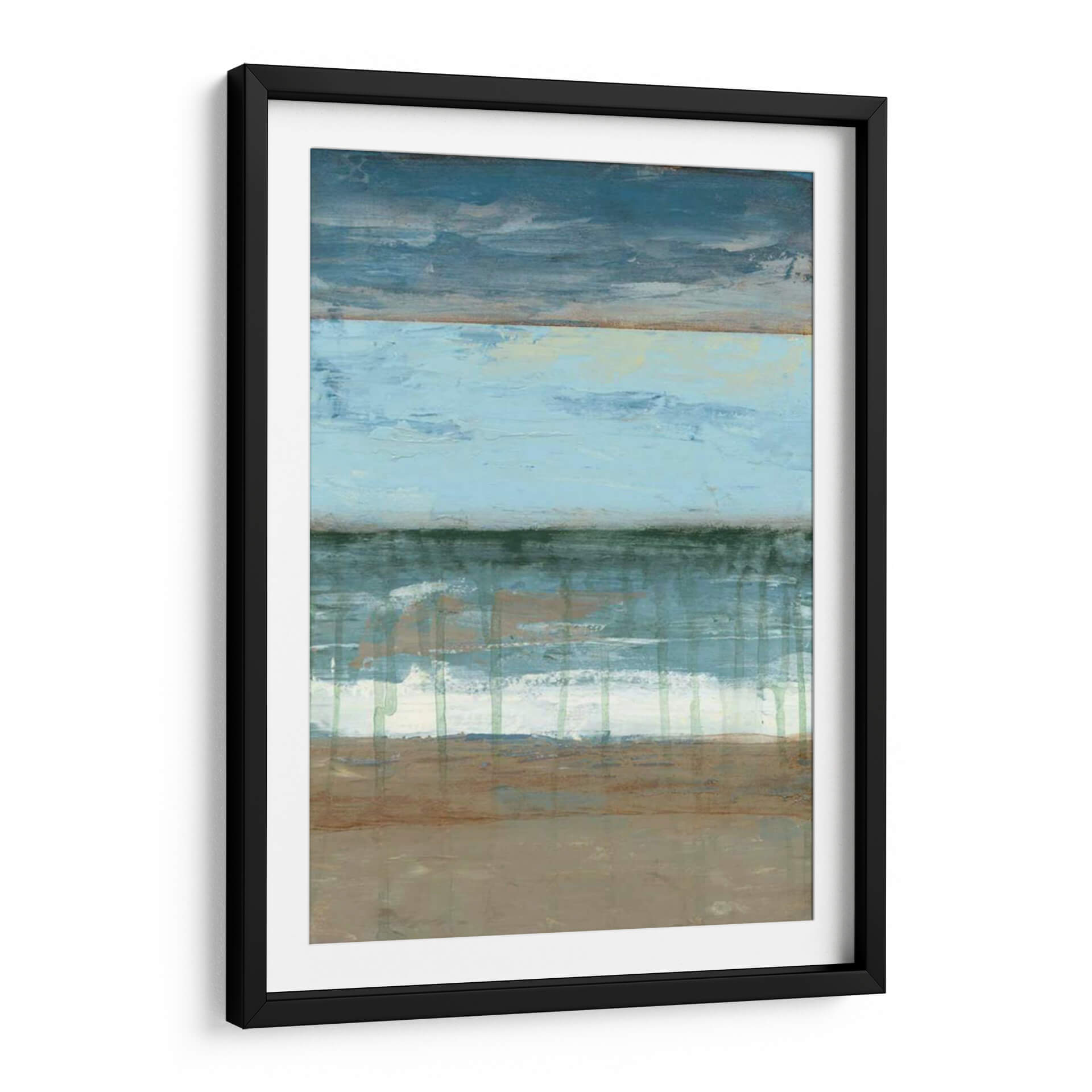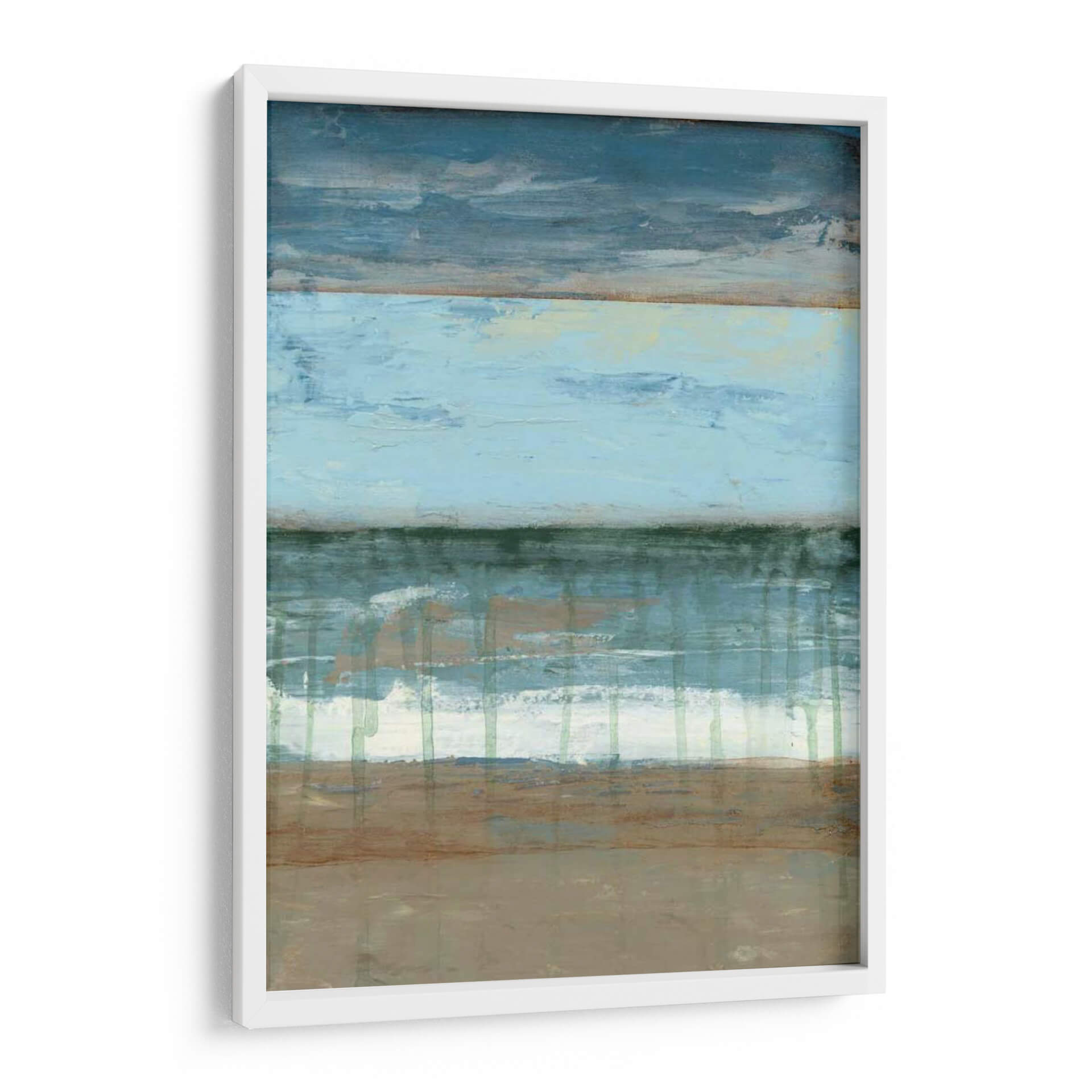 Sumérgete en la serenidad de "Resumen Costera II", una obra de arte abstracto que evoca la tranquilidad de la costa. La pieza presenta una composición horizontal dividida en bandas de color que recuerdan al mar, el cielo y la tierra, con una paleta de azules profundos, celestes pálidos, verdes marinos y tonos tierra. Las texturas visuales y las pinceladas gestuales crean una sensación de movimiento y profundidad, como las olas rompiendo en la orilla o las nubes flotando en el horizonte. Este cuadro decorativo es perfecto para quienes buscan infundir calma y una conexión sutil con la naturaleza en sus espacios. Ideal para salones, dormitorios o estudios, "Resumen Costera II" añade un toque de sofisticación contemporánea y una atmósfera de paz y contemplación. Su estilo abstracto y su paleta de colores suave lo convierten en una adición versátil a cualquier decoración moderna, minimalista o costera. Permite que esta pieza transporte tus sentidos a un paisaje sereno y te brinde un refugio visual diario.