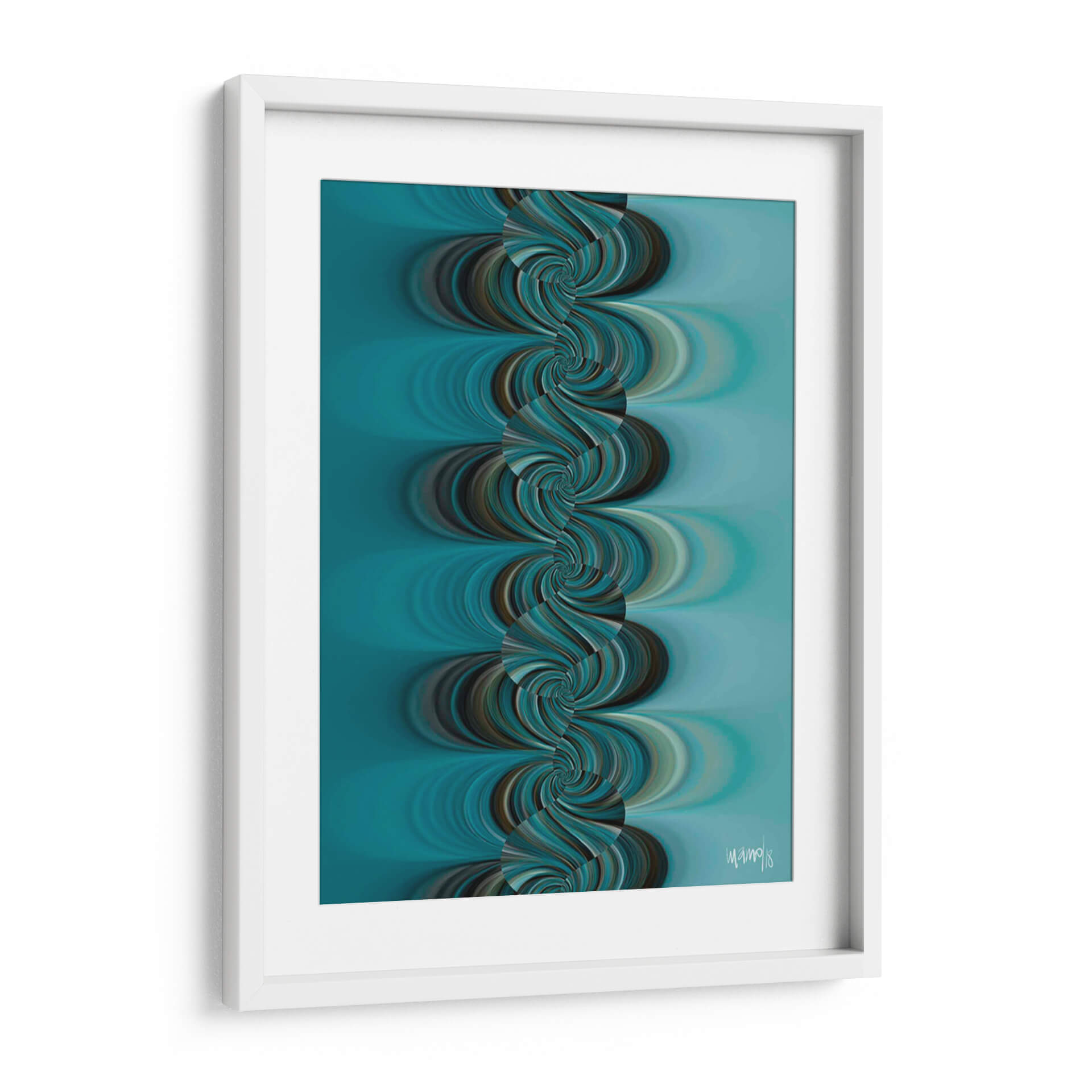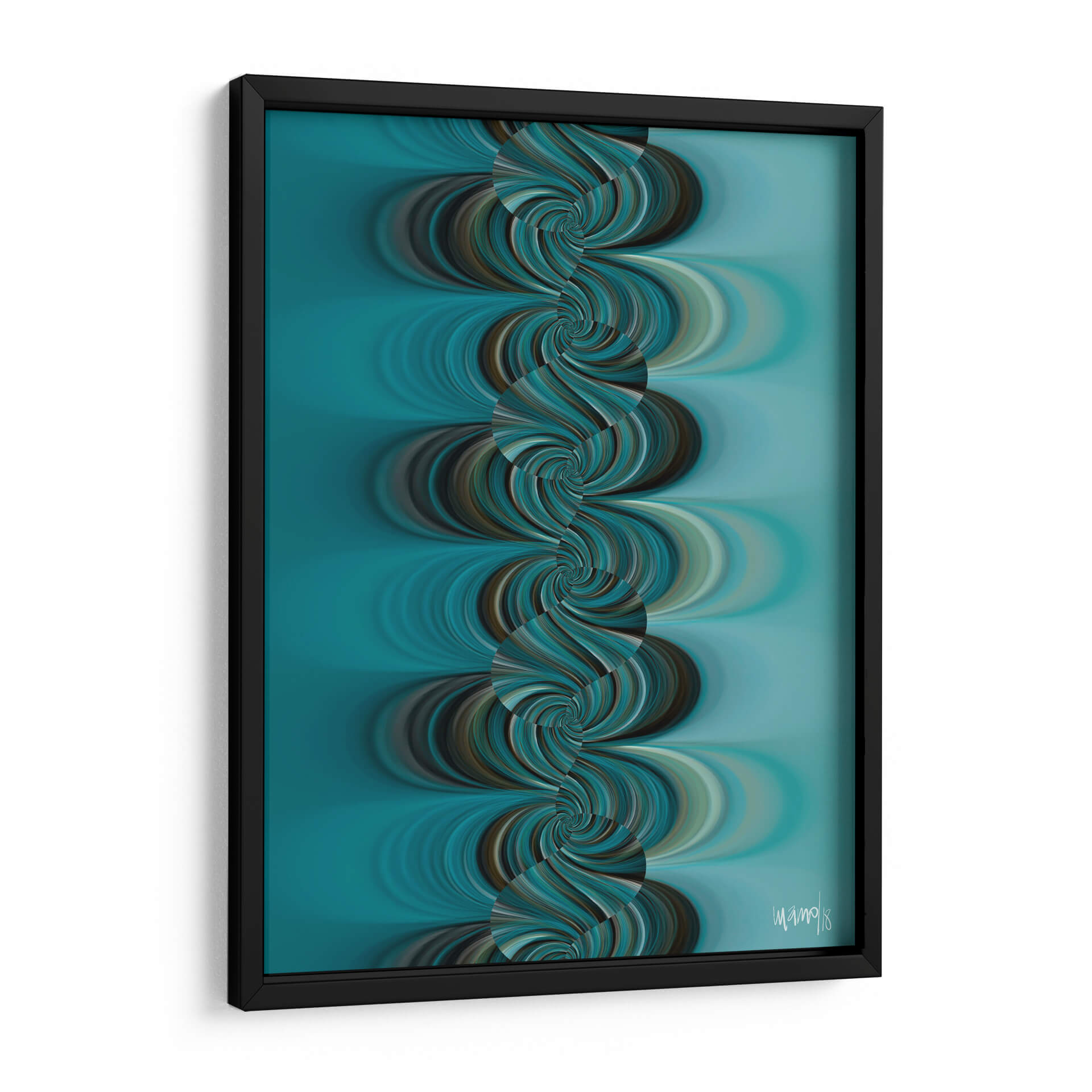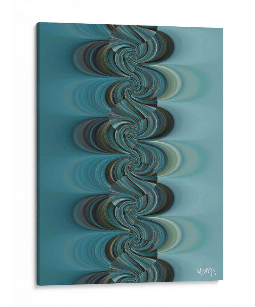 Sumérgete en la hipnótica belleza de "TURQUESA 4", una obra de arte contemporáneo que captura la esencia del movimiento y el color. Diseñada por la talentosa Gina Villalobos, esta pieza presenta una fascinante cascada de espirales en tonos turquesa, azul profundo y marrones terrosos, que se entrelazan creando una sensación de fluidez y profundidad. El fondo suave y degradado en azul aguamarina complementa a la perfección las formas dinámicas del primer plano, generando una atmósfera de calma y sofisticación. "TURQUESA 4" es una invitación a la contemplación, perfecta para añadir un toque de serenidad moderna a tu sala de estar, dormitorio u oficina. Su diseño abstracto y orgánico la convierte en un punto focal cautivador que inspira tranquilidad y elegancia. Ideal para quienes buscan una decoración de pared que combine arte abstracto con una paleta de colores envolvente y una composición visualmente impactante.