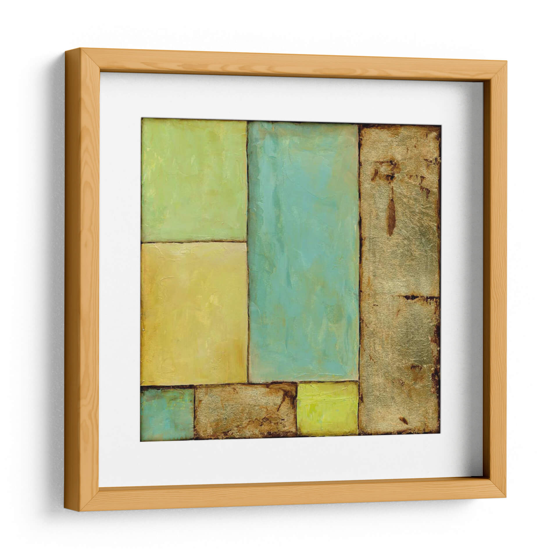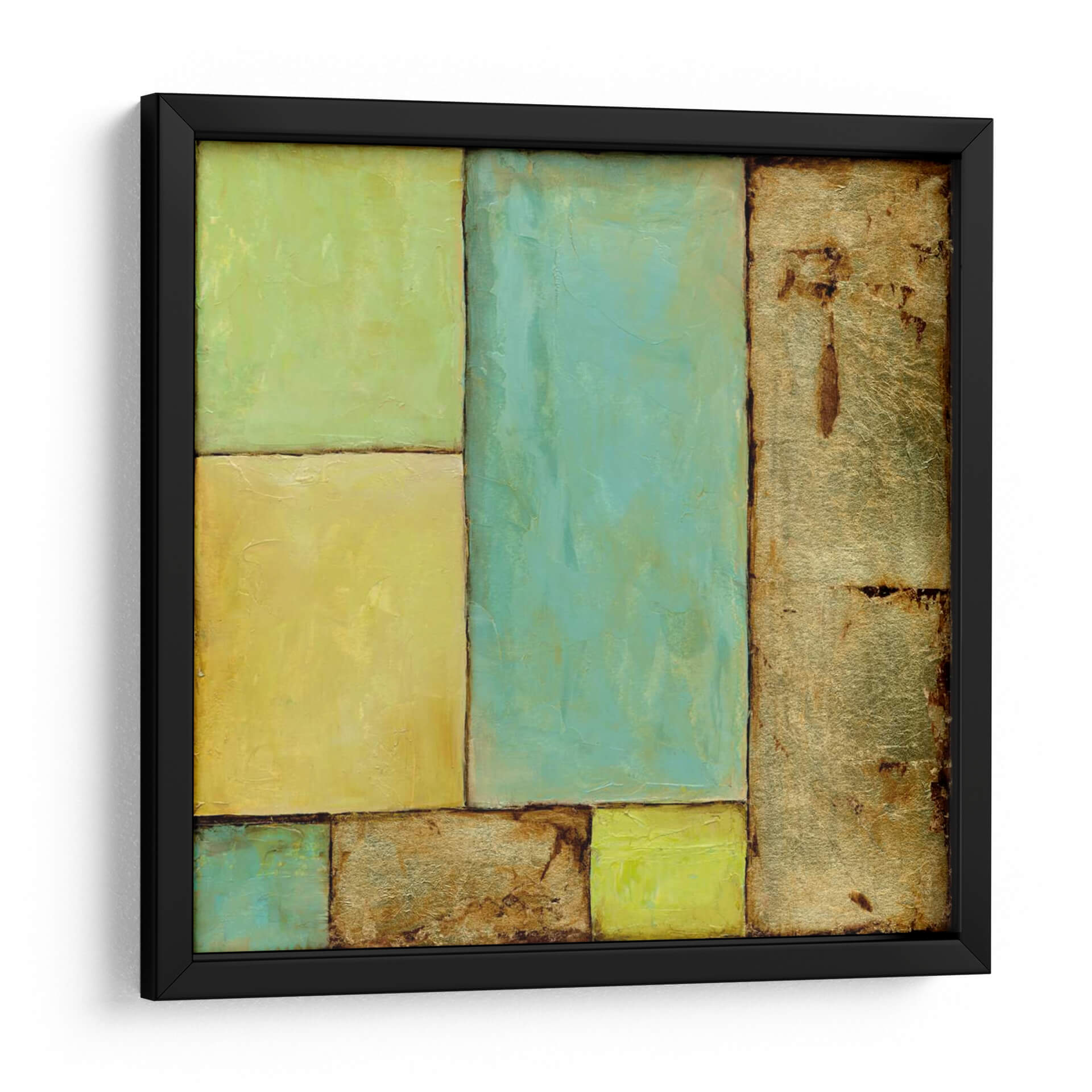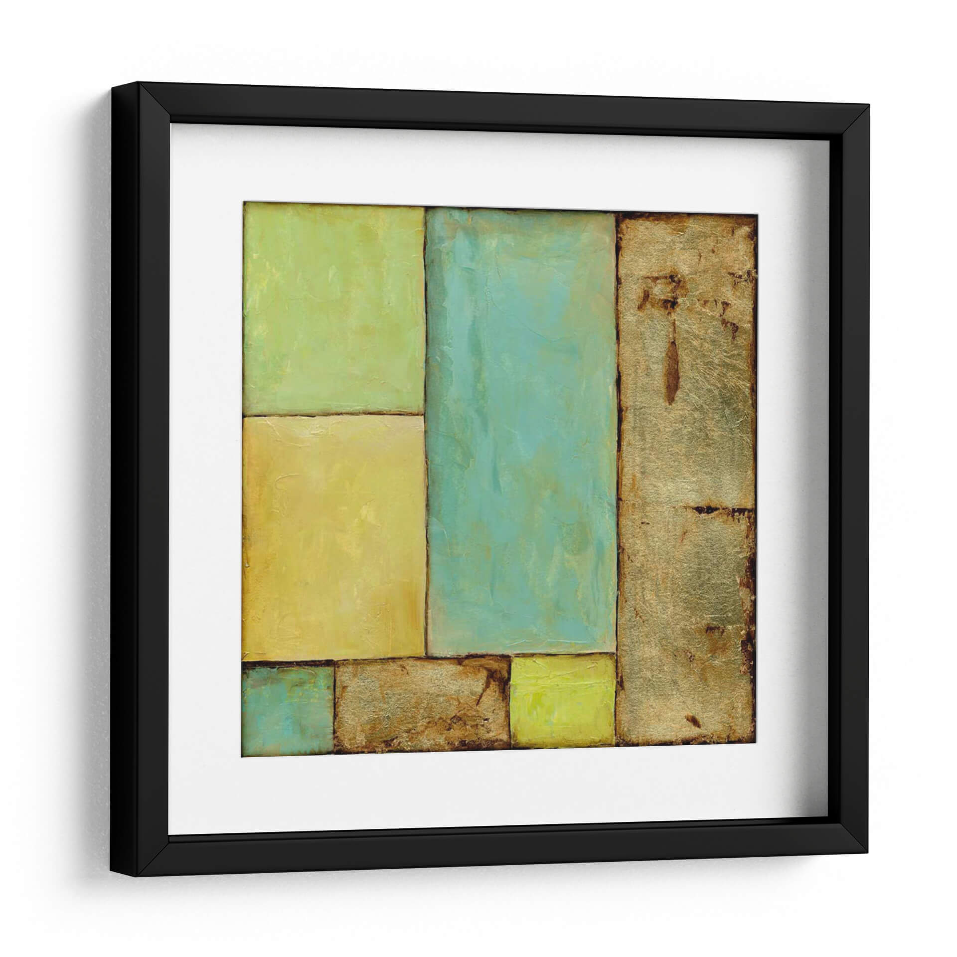 Sumérgete en la serenidad y el arte moderno con "Vitral II", una obra cautivadora de Jennifer Goldberger. Este cuadro decorativo abstracto presenta un juego de rectángulos y formas geométricas que evocan la estética de un vitral contemporáneo. La paleta de colores, dominada por tonos verdes menta, amarillos vibrantes y texturas doradas ricas, crea una atmósfera de calma y sofisticación. Las líneas oscuras que delimitan cada sección añaden una estructura definida a la composición, mientras que las sutiles variaciones de tono y textura invitan a la contemplación. "Vitral II" es la pieza perfecta para infundir vida y carácter en cualquier espacio, desde una sala de estar minimalista hasta una oficina moderna o un dormitorio sereno. Su diseño abstracto lo convierte en un punto focal versátil que complementa una variedad de estilos decorativos, aportando una sensación de equilibrio y armonía visual. Descubre cómo este cuadro decorativo puede transformar tu hogar u oficina, convirtiéndose en una expresión de tu buen gusto y apreciación por el arte contemporáneo.