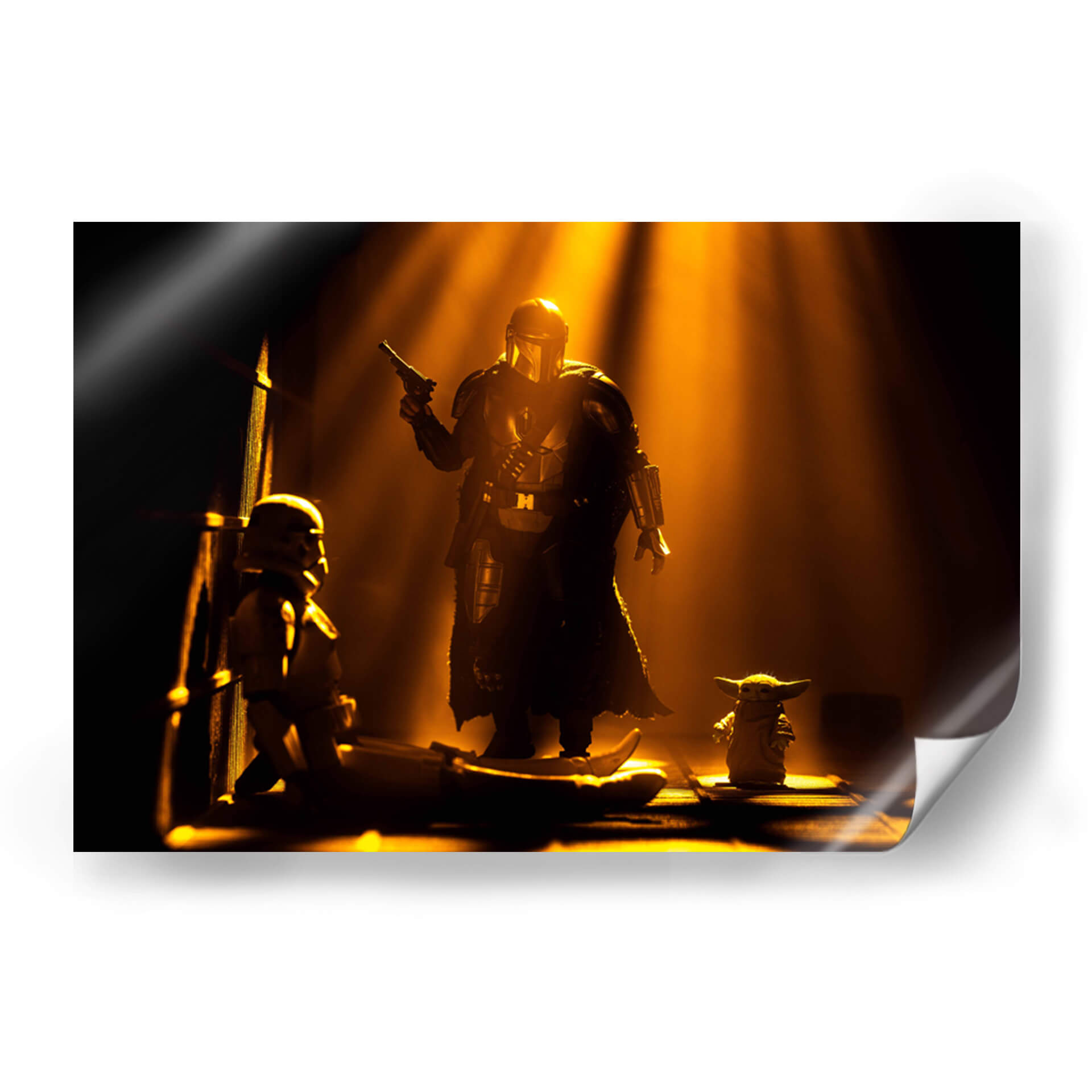 Sumérgete en el universo de Star Wars con este impactante cuadro decorativo "Mando y Grogu", una pieza que captura la esencia de la aventura y el vínculo en el espacio. La obra presenta a un guerrero enigmático, enfundado en su icónica armadura y portando un arma, iluminado por intensos rayos de luz dorada que contrastan dramáticamente con las sombras profundas. A su lado, la tierna figura de Grogu, o "Baby Yoda", añade un elemento de ternura y protección a la escena, creando una narrativa visual potente. La paleta de colores se centra en tonos cálidos y dorados, evocando una atmósfera de misterio, peligro y esperanza, perfecta para los fanáticos de la saga. Este cuadro es ideal para añadir un toque de carácter a tu sala de estar, oficina o cualquier espacio que necesite una dosis de fantasía y emoción. Su composición dramática y su temática reconocible lo convierten en un punto focal que atraerá las miradas y generará conversaciones, un tributo a uno de los dúos más queridos de la ciencia ficción moderna. Añade esta obra maestra a tu colección de arte y transporta tu hogar a una galaxia muy, muy lejana.