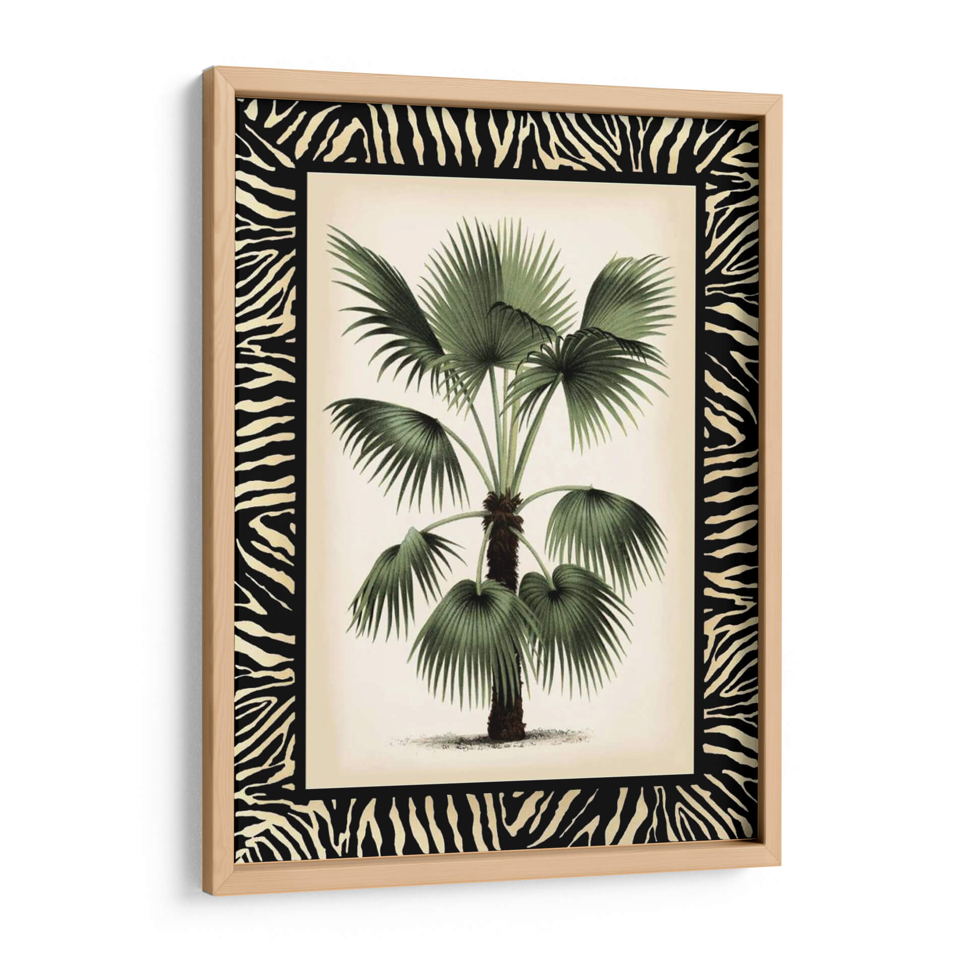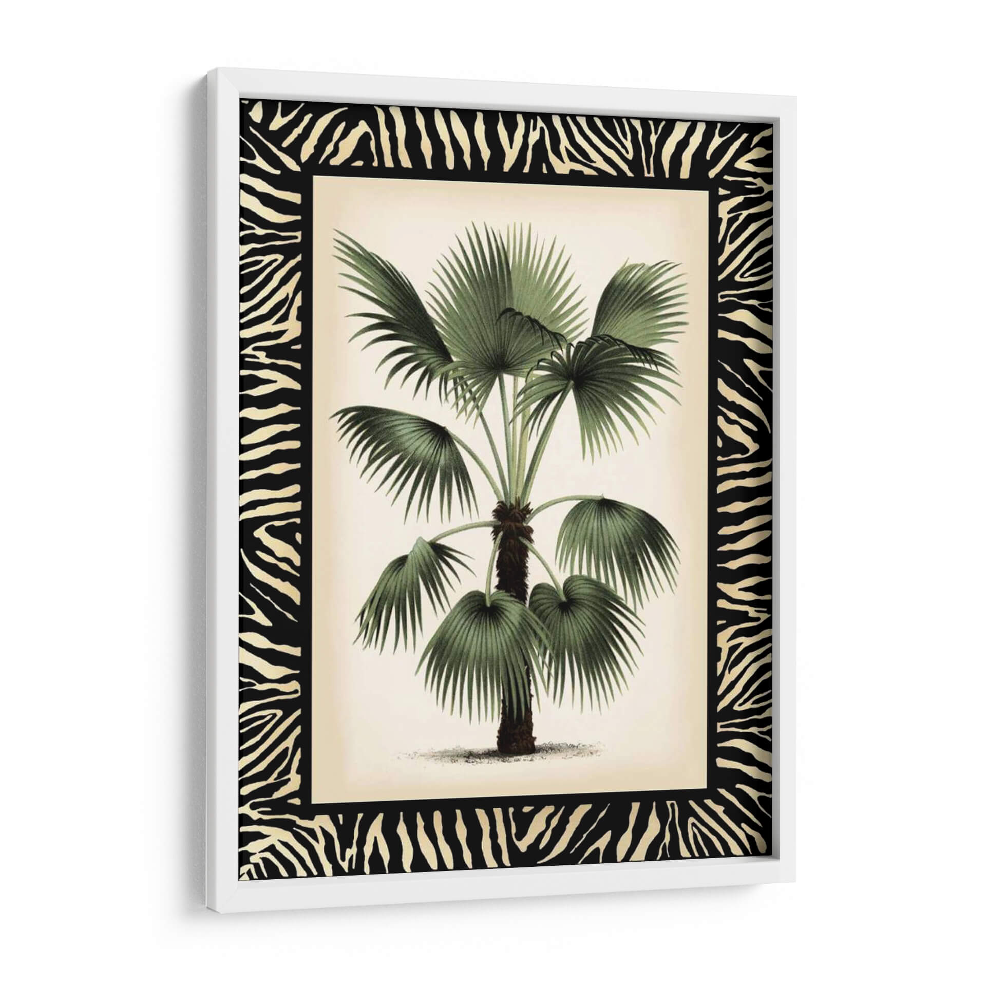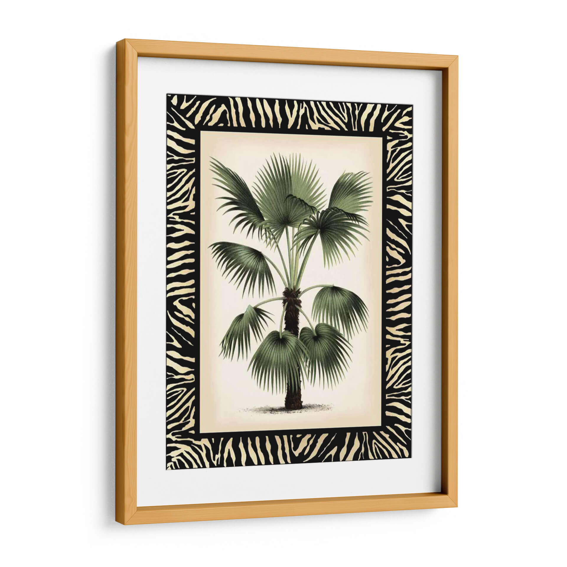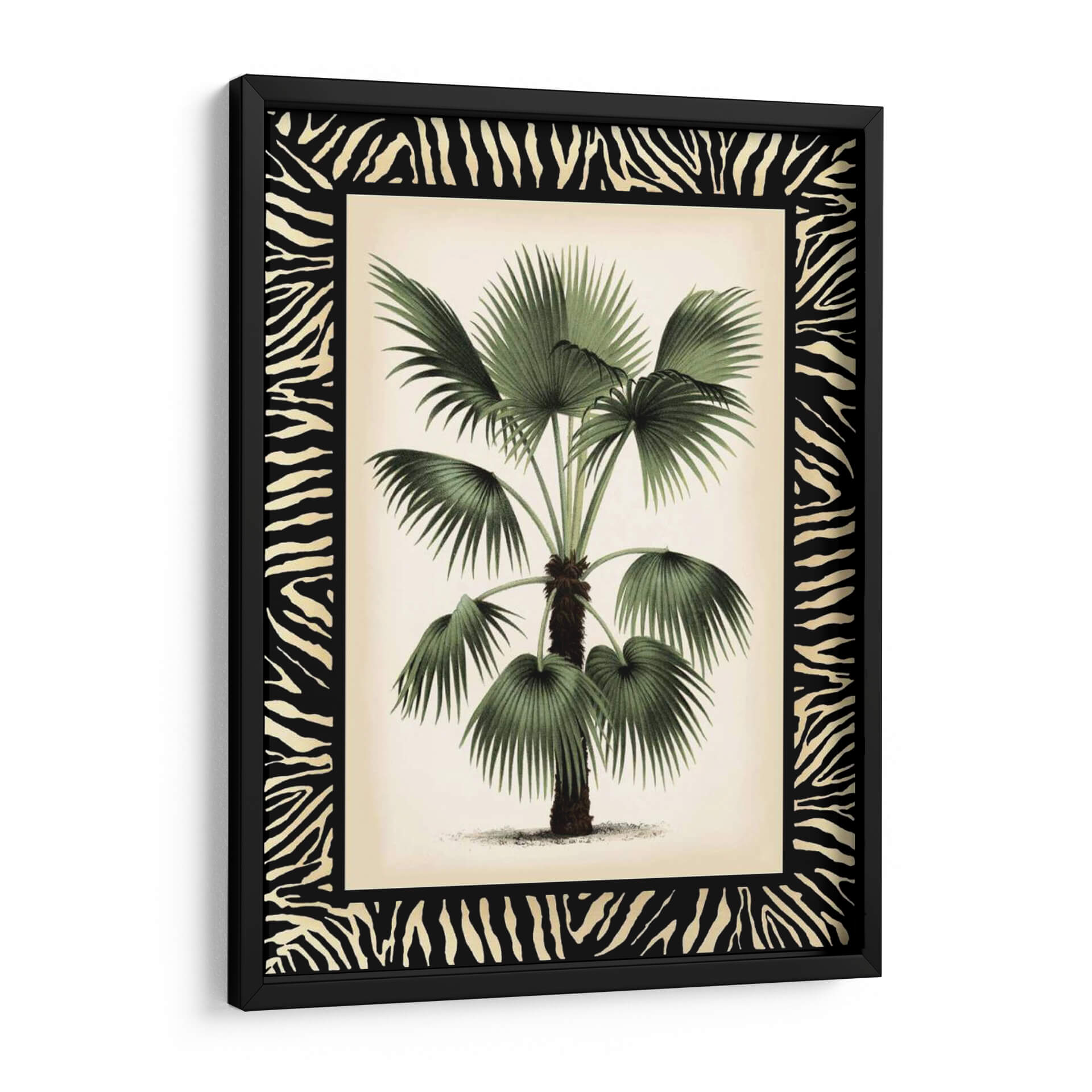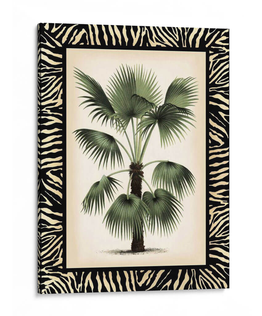 Embellece tu espacio con "Pequeña Palma En La Frontera De Zebra II", una obra de arte que captura la exuberancia tropical con un toque salvaje. Esta pieza, creada por Vision Studio, presenta una detallada ilustración botánica de una palmera, cuyas frondosas hojas verdes contrastan elegantemente con un fondo de tono marfil y un audaz borde de estampado de cebra. La composición se centra en la majestuosidad de la palma, invitando a la contemplación de la naturaleza en su máxima expresión. Los tonos verdes profundos de la vegetación se complementan con los neutros del fondo, creando una atmósfera de serenidad y sofisticación. El contraste entre lo orgánico de la palmera y el patrón geométrico y audaz de la cebra aporta una dimensión única y moderna a la pieza. Este cuadro decorativo es perfecto para añadir un punto focal de interés y carácter a salones, dormitorios o estudios, evocando sensaciones de tranquilidad, aventura y un estilo de vida chic. Es ideal para quienes buscan fusionar la belleza natural con elementos de diseño audaces, transformando cualquier ambiente en un santuario de estilo contemporáneo y conexión con la naturaleza.