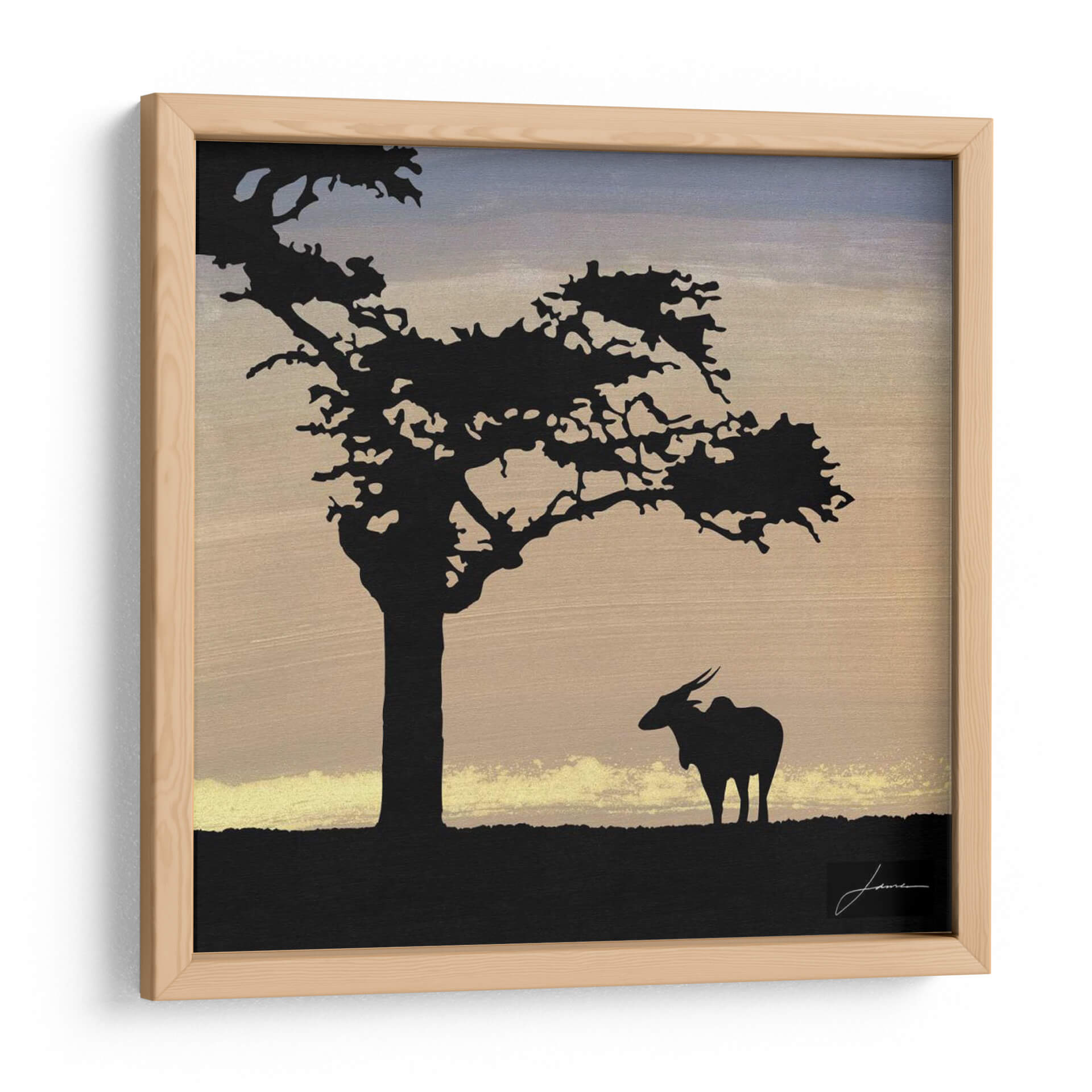 Sumérgete en la serenidad de la sabana africana con "Savanna II" de James Burghardt, un cuadro decorativo que captura la majestuosidad de la naturaleza en su forma más pura. Esta obra maestra presenta la silueta imponente de un árbol robusto y la figura solitaria de un antílope contra un cielo crepuscular de tonos cálidos y suaves. La paleta de colores, dominada por ocres, beiges y un toque de azul pálido en el horizonte, evoca una atmósfera de calma y tranquilidad, perfecta para crear un santuario de paz en tu hogar u oficina. El estilo minimalista y la composición estilizada, con el contraste dramático entre las siluetas oscuras y el fondo etéreo, generan un impacto visual memorable y sofisticado. "Savanna II" no es solo una pieza decorativa, es una invitación a la contemplación, un recordatorio de la belleza salvaje y la quietud de los paisajes africanos. Ideal para salones modernos, dormitorios acogedores o cualquier espacio que busque un toque de elegancia natural y serena. Añade este cuadro decorativo a tu colección y deja que su presencia evoque la grandeza y la paz del mundo natural en tu día a día.