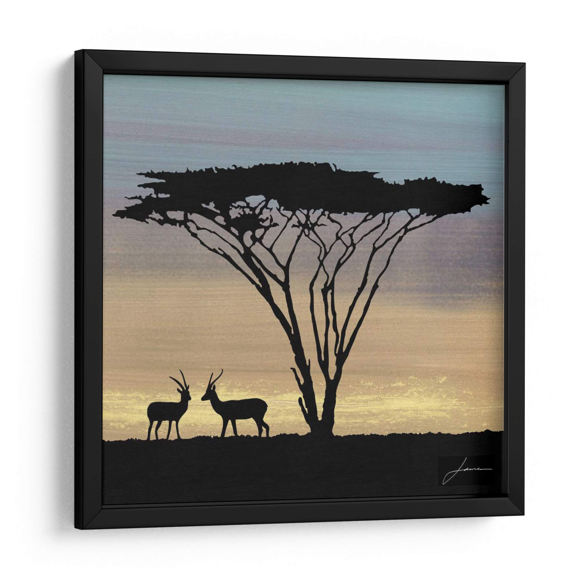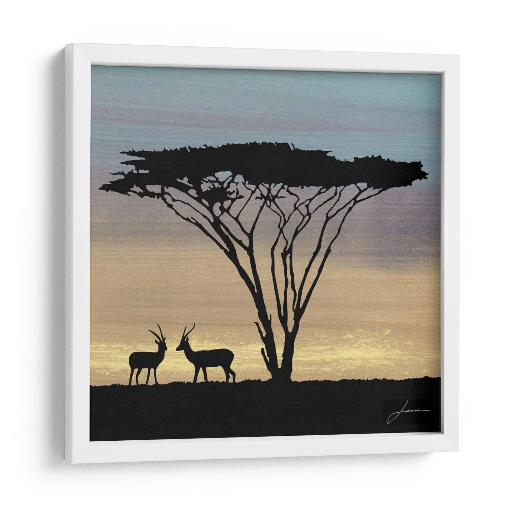 Sumérgete en la serenidad de la sabana africana con "Savanna III" de James Burghardt, un cuadro decorativo que captura la majestuosidad de la naturaleza al atardecer. Esta obra de arte presenta la silueta icónica de un árbol de acacia, con sus ramas delicadamente dibujadas contra un cielo que transita del cálido ocre al suave azul, evocando la tranquilidad del fin del día. Dos gacelas en primer plano, también silueteadas en negro profundo, añaden un toque de vida y misterio a la escena, interactuando sutilmente bajo la sombra protectora del árbol. La paleta de colores, dominada por tonos tierra, dorados y azules serenos, crea una atmósfera de calma y contemplación. El estilo estilizado y el contraste marcado entre las siluetas oscuras y el fondo luminoso otorgan a la pieza una modernidad que encaja perfectamente en diversos estilos de decoración, desde el contemporáneo hasta el bohemio. "Savanna III" es ideal para añadir un punto focal de serenidad a tu salón, un toque de naturaleza inspiradora a tu oficina o un remanso de paz a tu dormitorio. Deja que la belleza atemporal de la sabana transporte tu hogar a un lugar de paz y conexión.
