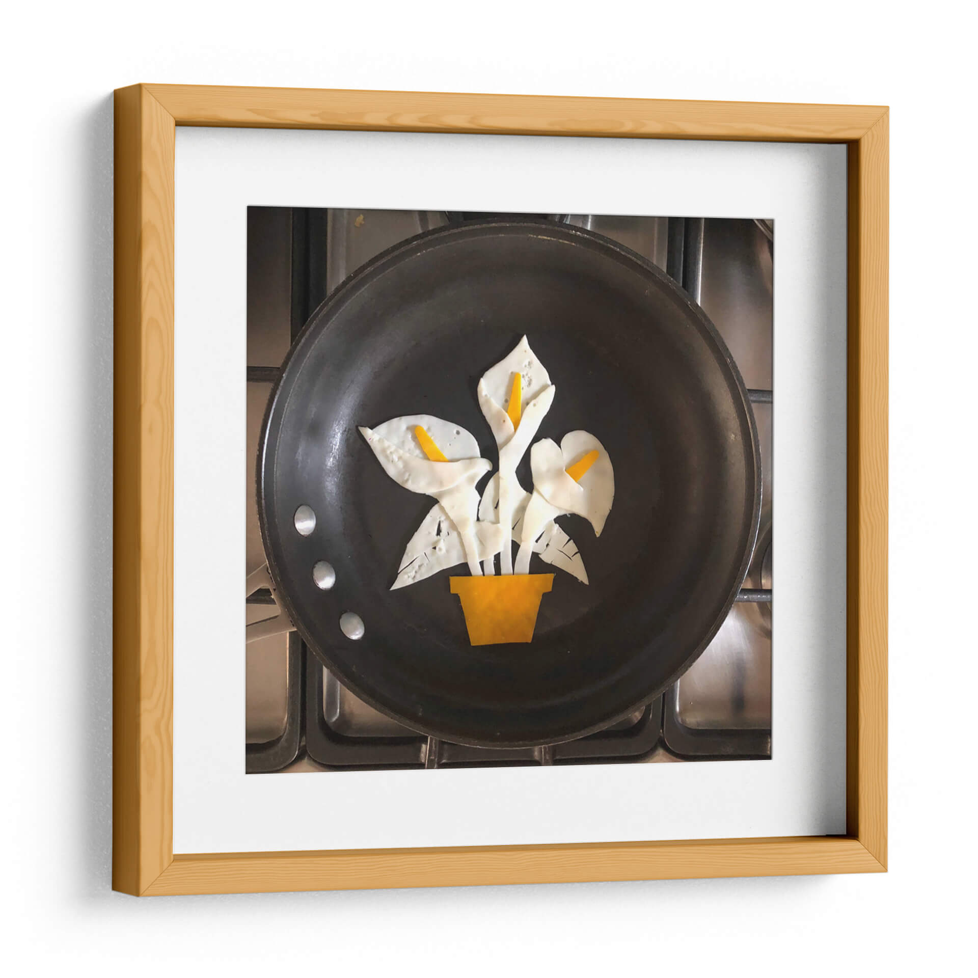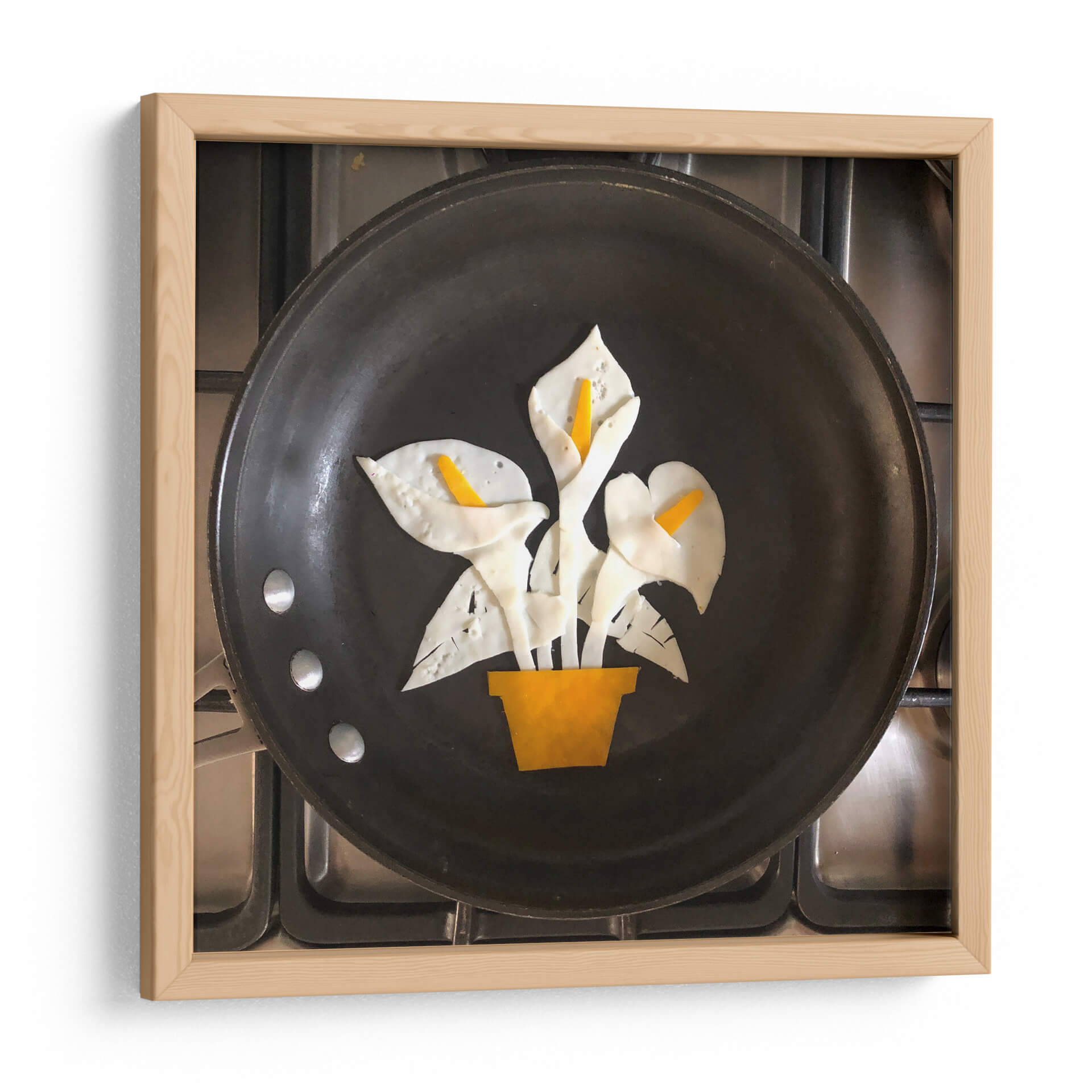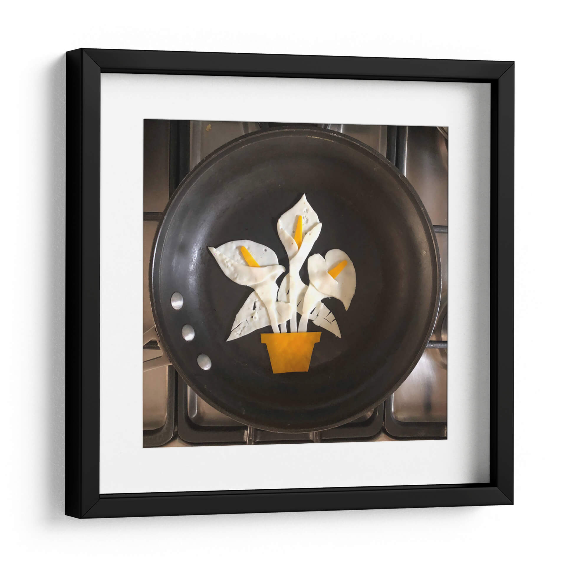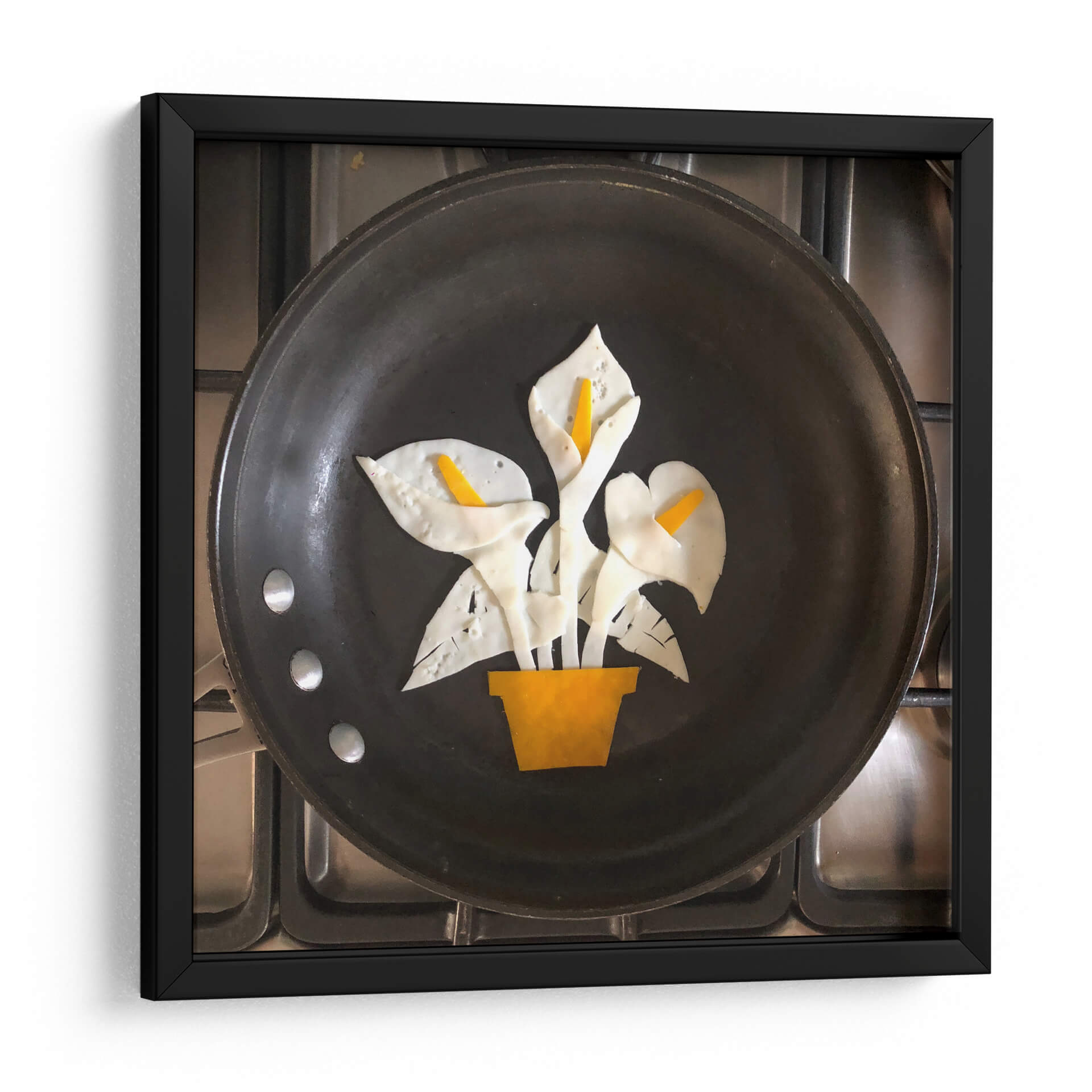Descubre la obra "Alcatraz" de Eggshibit, una pieza visualmente cautivadora que transforma ingredientes cotidianos en una obra de arte comestible. Esta composición presenta delicadas flores de alcatraz, meticulosamente dispuestas dentro de una sartén negra sobre una estufa. Los pétalos blancos y las vibrantes anclas amarillas crean un contraste llamativo contra el fondo oscuro, mientras que el macetero naranja añade un toque de calidez y alegría. La técnica empleada evoca una sensación de arte culinario o arte efímero, celebrando la belleza en lo inesperado. "Alcatraz" es ideal para cocinas modernas, comedores o cualquier espacio que busque un toque de originalidad y color. Su diseño único y la conexión con la gastronomía la convierten en una pieza de conversación perfecta, capaz de inspirar creatividad y aprecio por la vida cotidiana. Una adición vibrante y elegante a tu decoración.