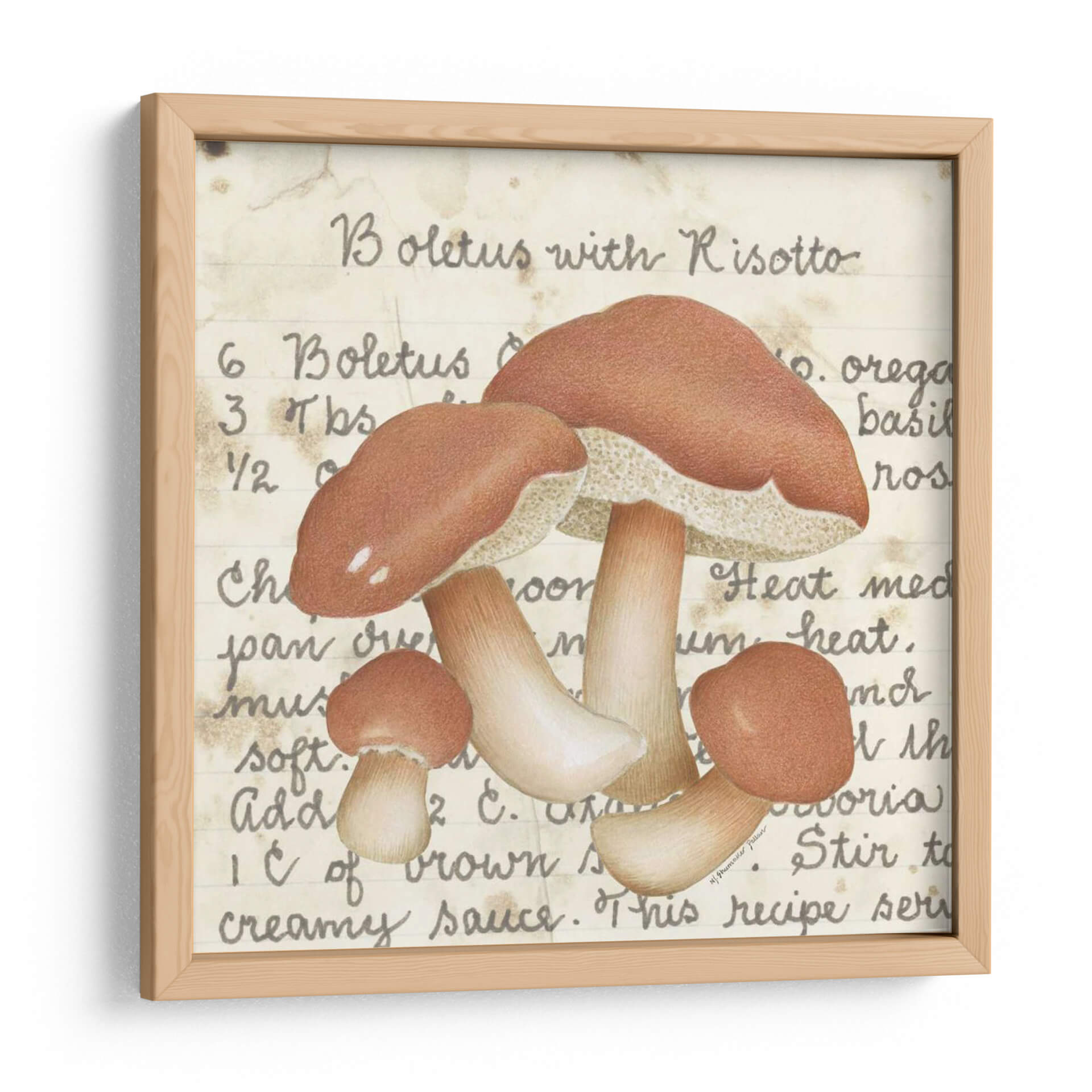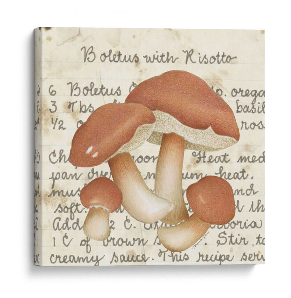 Añada un toque de encanto rústico y sabor culinario a su hogar con este cautivador cuadro decorativo de setas boletus, titulado "Boleto" y creado por Nancy S. Pallan. La obra presenta un grupo de setas boletus de tonos tierra, con sombreros de color marrón rojizo y tallos cremosos, delicadamente dibujadas sobre un fondo de escritura antigua. La textura del papel envejecido y la caligrafía evocan la nostalgia de viejas recetas de cocina, fusionando el arte botánico con un aire vintage y hogareño. La paleta de colores, dominada por cálidos marrones, beiges y cremas, aporta una sensación de calidez y confort, haciendo de esta pieza un complemento ideal para cocinas, comedores o cualquier espacio donde se desee añadir un toque natural y acogedor. El estilo detallado y realista de la ilustración, combinado con el fondo de texto escrito a mano, crea una atmósfera nostálgica y sofisticada. Este cuadro decorativo no solo embellece su pared, sino que también narra una historia de tradición culinaria y apreciación por la naturaleza, invitando a la conversación y al disfrute de los placeres sencillos. Es una elección perfecta para quienes buscan una decoración de pared única que combine estética y un guiño a la gastronomía.