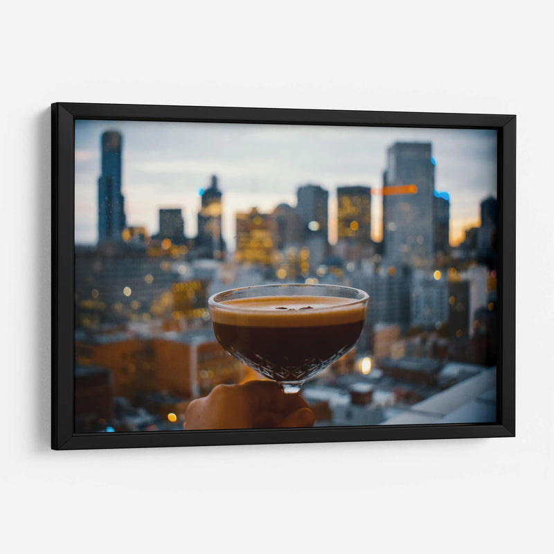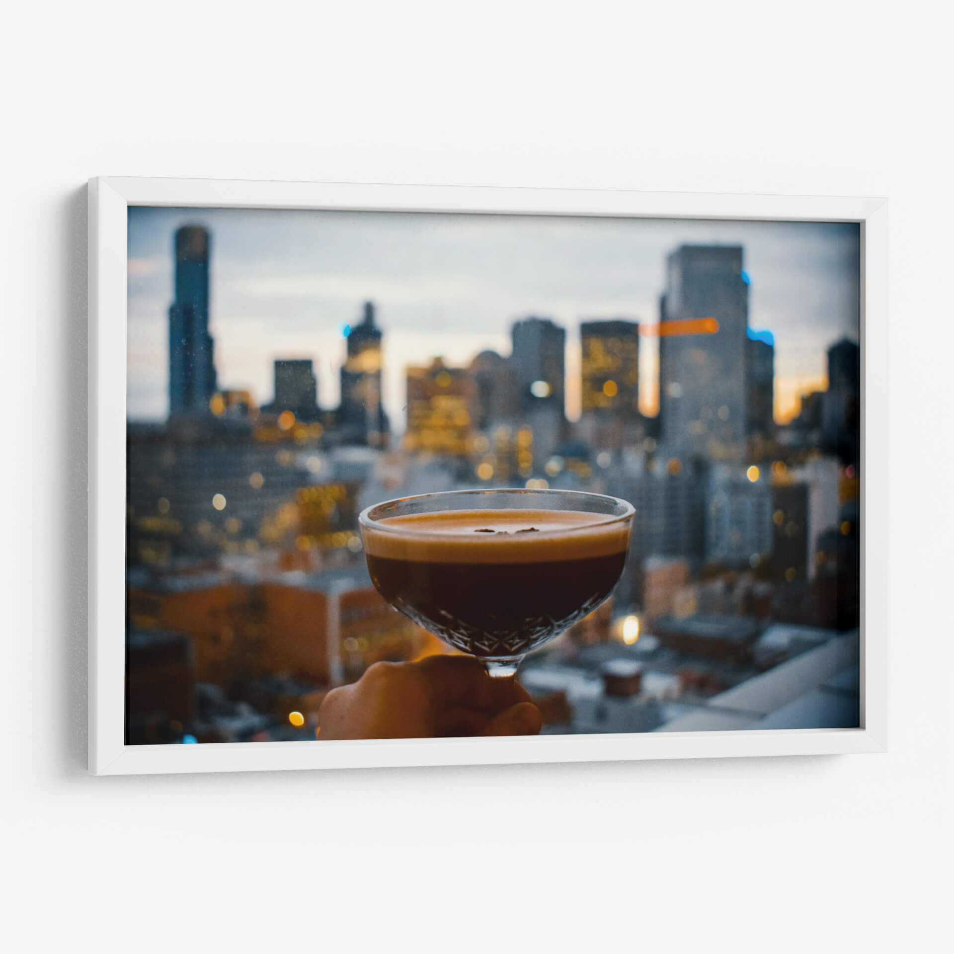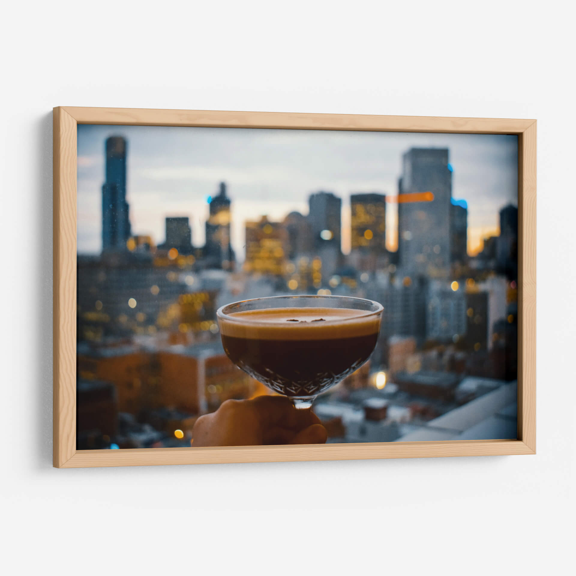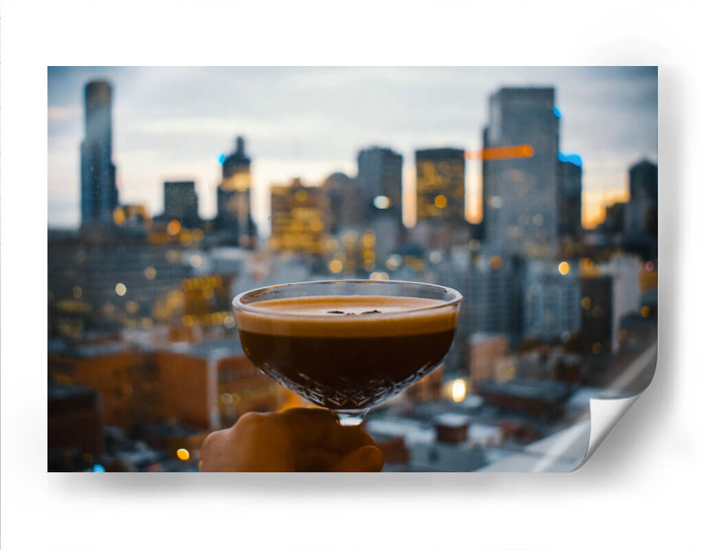 Captura la esencia de la vida urbana y el placer de un momento de relajación con nuestro cuadro decorativo "Carajillo After Office". Esta cautivadora obra de arte presenta una copa de café espumoso, sostenida elegantemente ante un horizonte de ciudad al atardecer. Los rascacielos se perfilan contra un cielo crepuscular, iluminados por las luces cálidas de la ciudad que prometen una noche vibrante. La paleta de colores, dominada por tonos cálidos de marrón café, ocres de la ciudad y azules tenues del cielo, crea una atmósfera de sofisticación y calma. La composición, con el primer plano nítido de la bebida y el fondo desenfocado de la metrópolis, invita a la contemplación y evoca la sensación de disfrutar de un momento íntimo en medio del bullicio urbano. Este cuadro decorativo es perfecto para añadir un toque de elegancia contemporánea a tu sala de estar, comedor u oficina, sirviendo como un recordatorio visual de los placeres sencillos y la energía de la vida moderna. Ideal para amantes del café, profesionales urbanos y cualquiera que aprecie el arte que combina la estética urbana con la calidez de un buen momento.