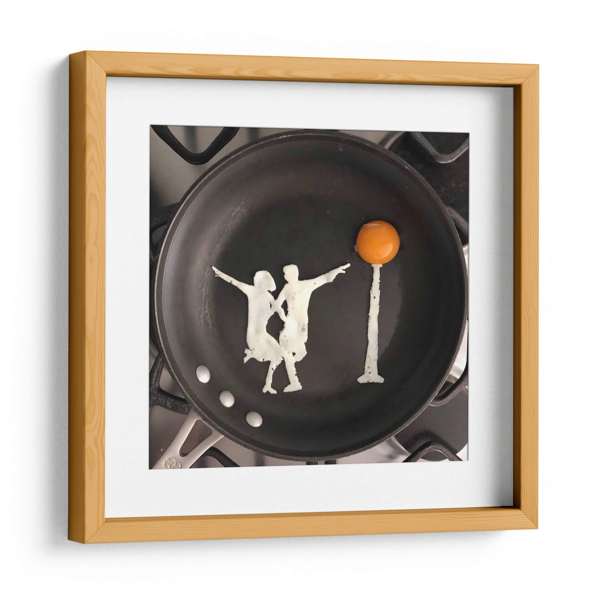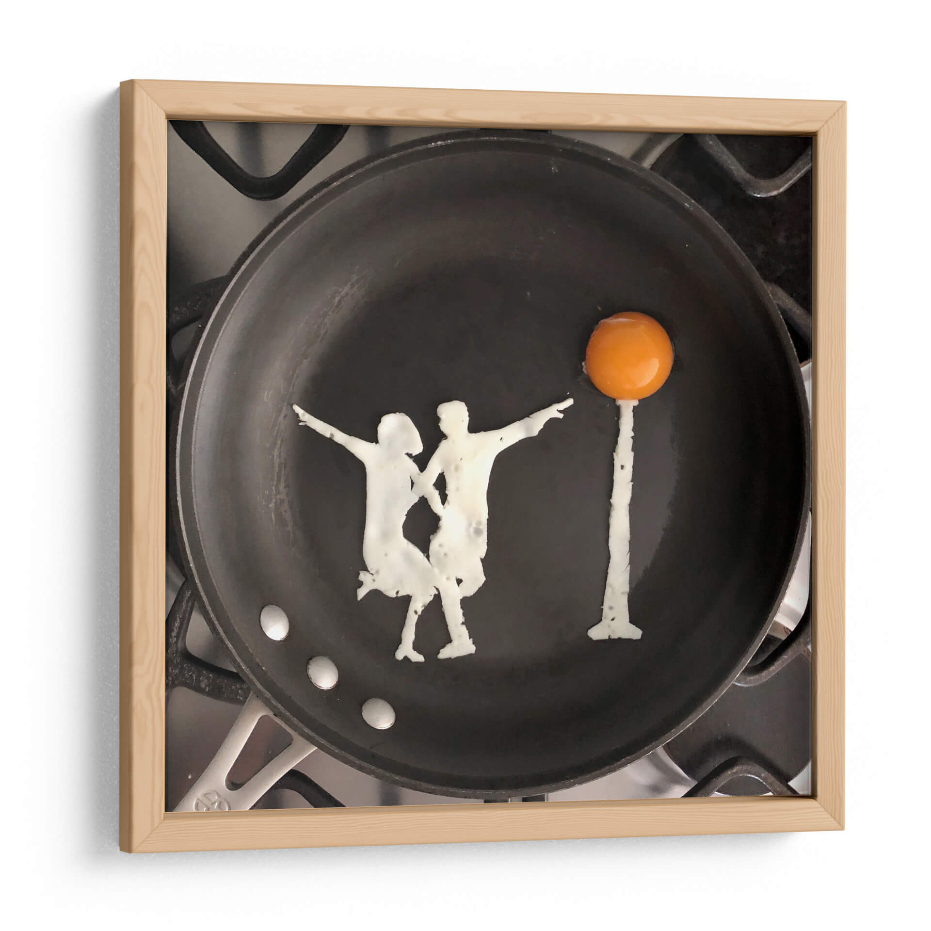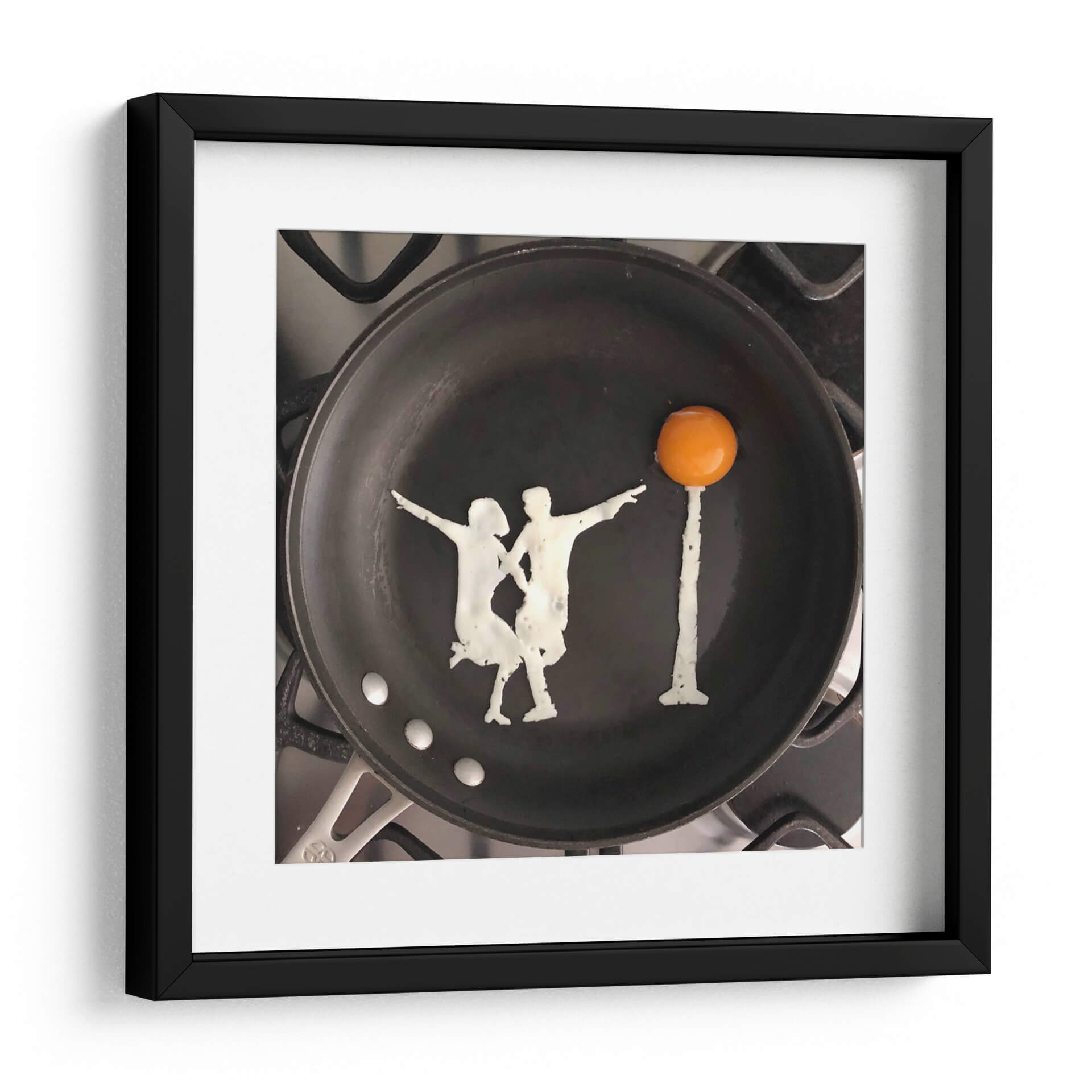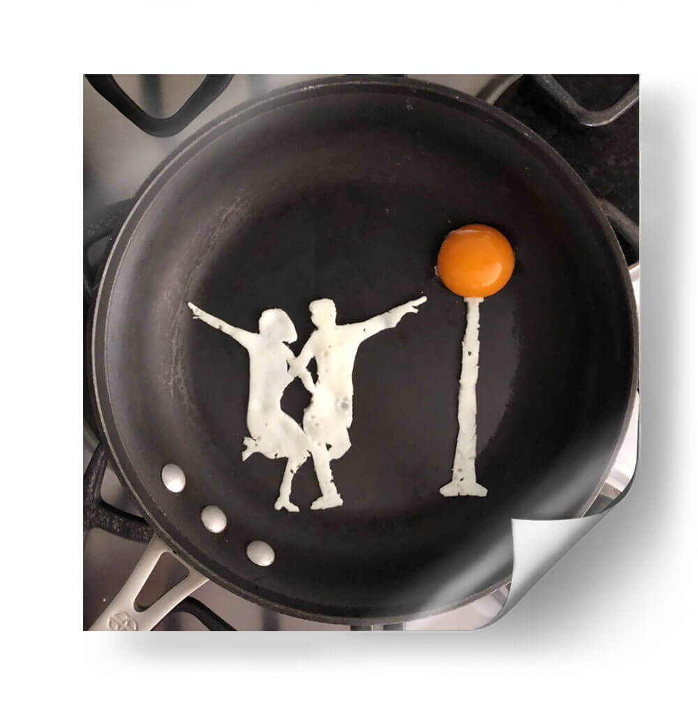 Sumérgete en la singularidad de "Dance", una obra de arte del artista Eggshibit que transforma lo cotidiano en extraordinario. Esta pieza captura la esencia del movimiento y la conexión a través de una representación ingeniosa y artística de una pareja bailando, formada con la delicadeza del huevo y presentada sobre una sartén negra. La composición minimalista, centrada en la silueta de los bailarines y un huevo frito simulando un sol o un faro, crea un ambiente lúdico y sorprendente. Los colores, predominantemente el negro de la sartén, el blanco cremoso del huevo y el vibrante naranja de la yema, generan un contraste visual que resalta la creatividad de la escena. Es una obra que evoca alegría, espontaneidad y la belleza de los momentos simples. "Dance" es perfecta para añadir un toque de originalidad y conversación a cualquier espacio, ya sea una cocina moderna, una sala de estar contemporánea o incluso una oficina, inyectando una dosis de arte conceptual y humor visual que sin duda cautivará a los espectadores y les recordará el arte que se puede encontrar en los detalles más inesperados de la vida. Ideal para quienes aprecian la creatividad culinaria fusionada con el arte de vanguardia.