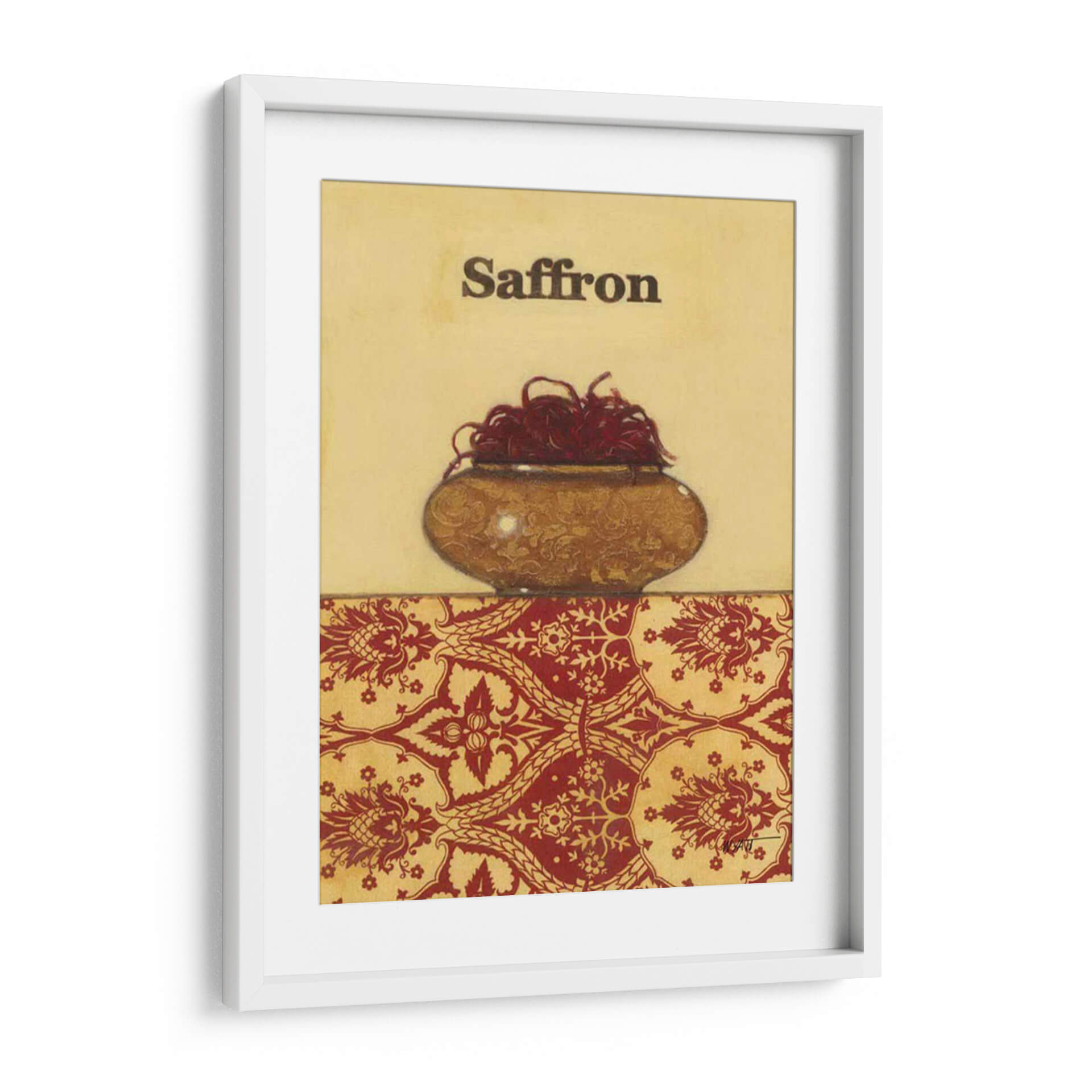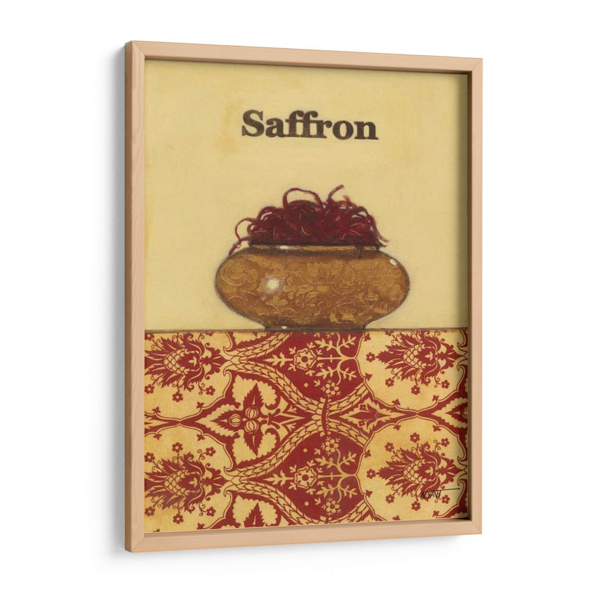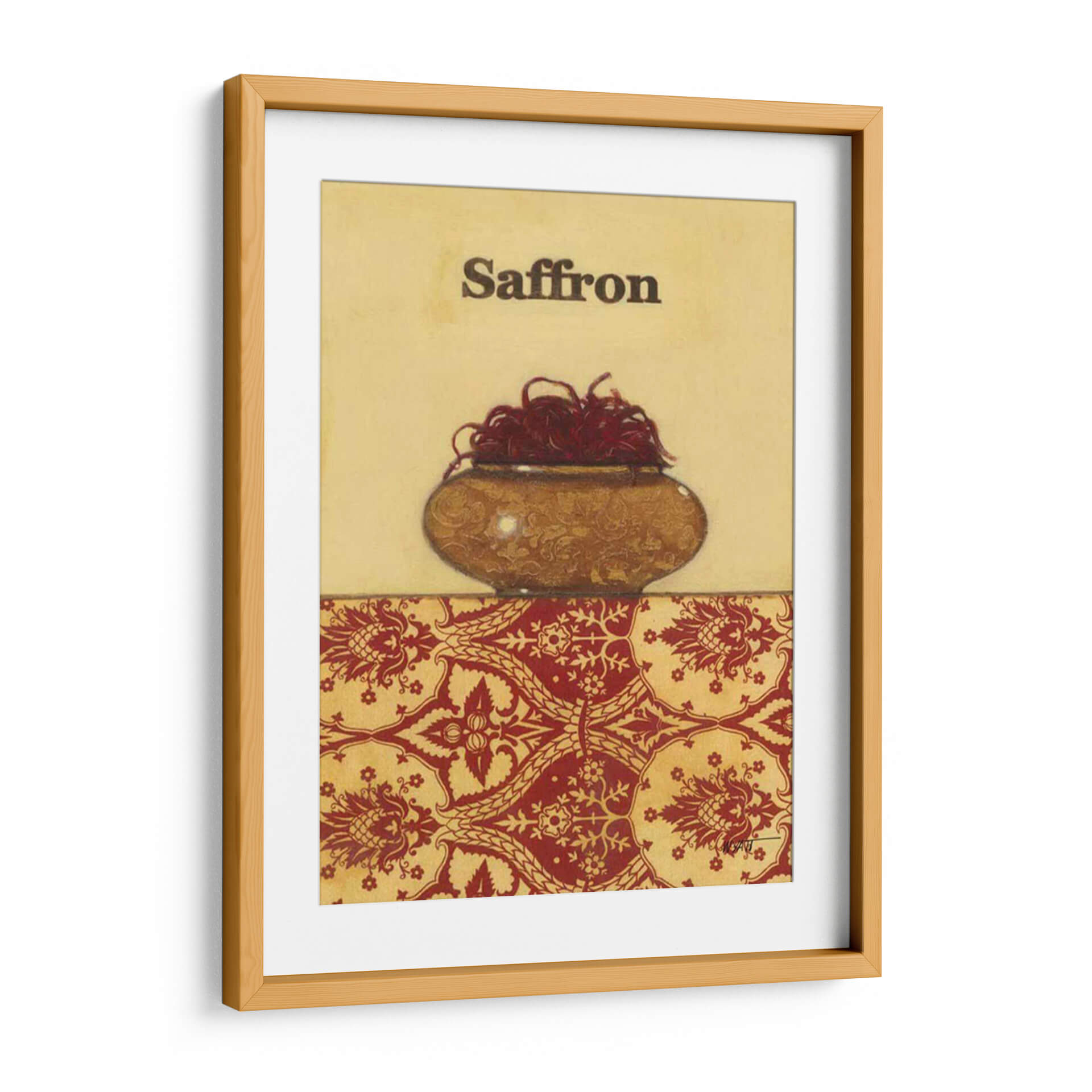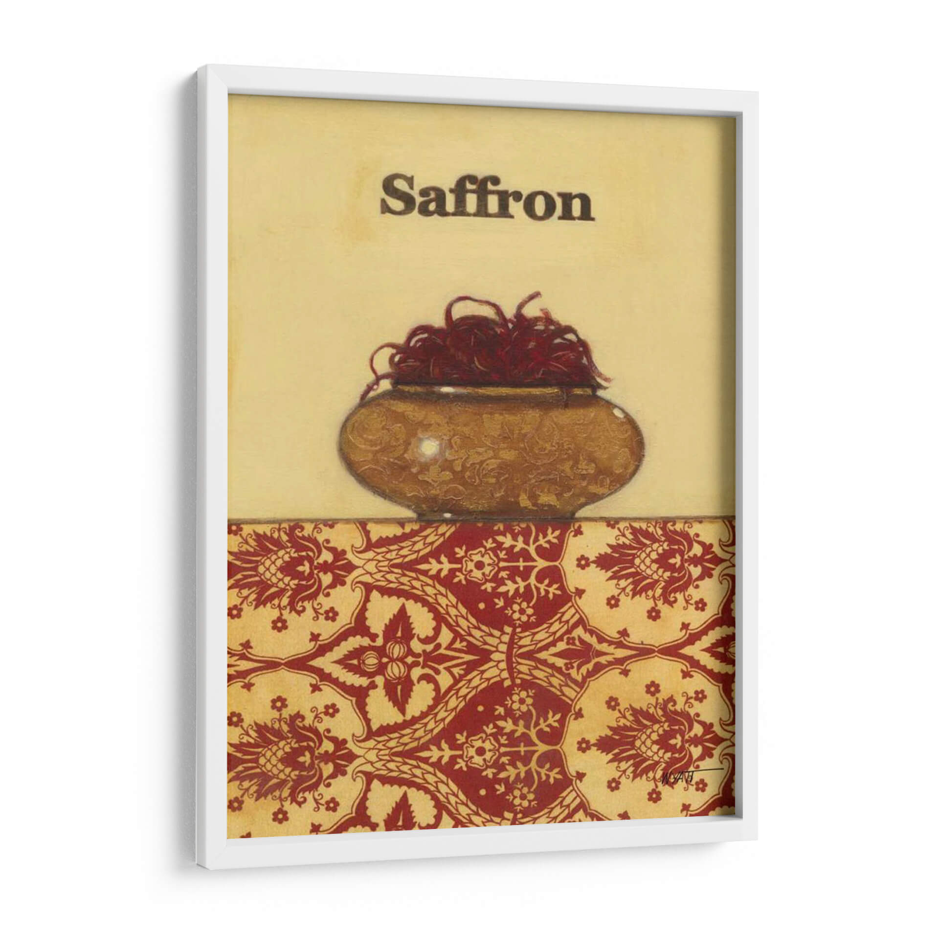 Sumérgete en la riqueza aromática y visual de "Especias Exóticas - Azafrán", una obra de arte que captura la esencia de uno de los condimentos más preciados del mundo. Este cuadro decorativo, creado por el artista Norman Wyatt Jr., presenta un cuenco rústico rebosante de hebras de azafrán rojo intenso, contrastando bellamente con el fondo dorado y un patrón ornamental en tonos rojos y ocres. La composición, dividida en dos secciones, une la sencillez de la representación de la especia con la complejidad de un diseño textil inspirado, evocando un ambiente de calidez y tradición. Los colores tierra y los detalles intrincados invitan a la contemplación, haciendo de esta pieza un punto focal perfecto para cocinas gourmet, comedores o cualquier espacio donde se valore la cultura y el buen gusto. Es ideal para añadir un toque de sofisticación y un guiño a la gastronomía y la historia, resonando con aquellos que aprecian la belleza en los detalles cotidianos y buscan una decoración de pared que cuente una historia. Este cuadro decorativo es una oda a la intensidad y al valor de las especias, transformando su hogar en un refugio de inspiración culinaria y estética refinada.