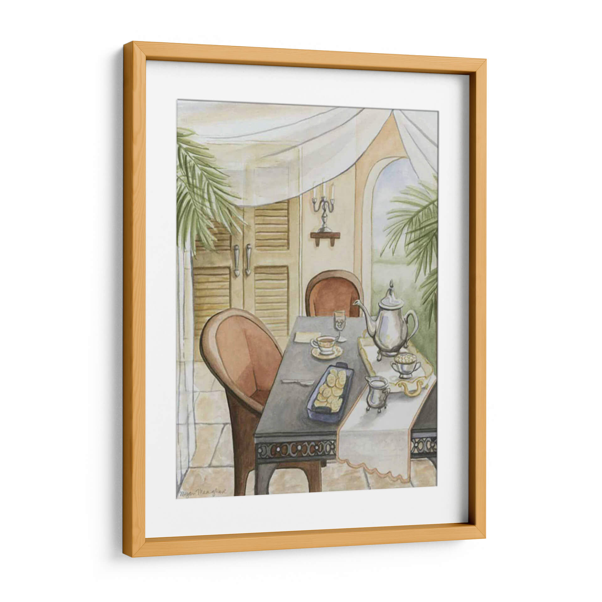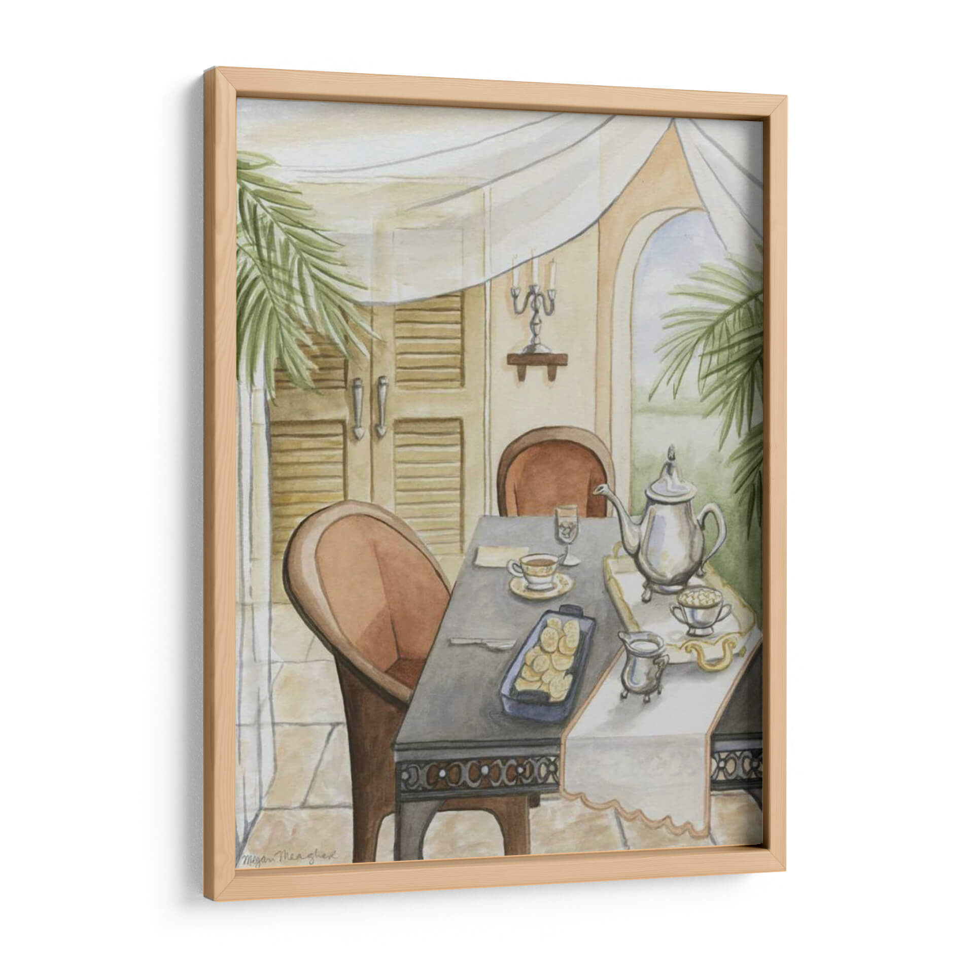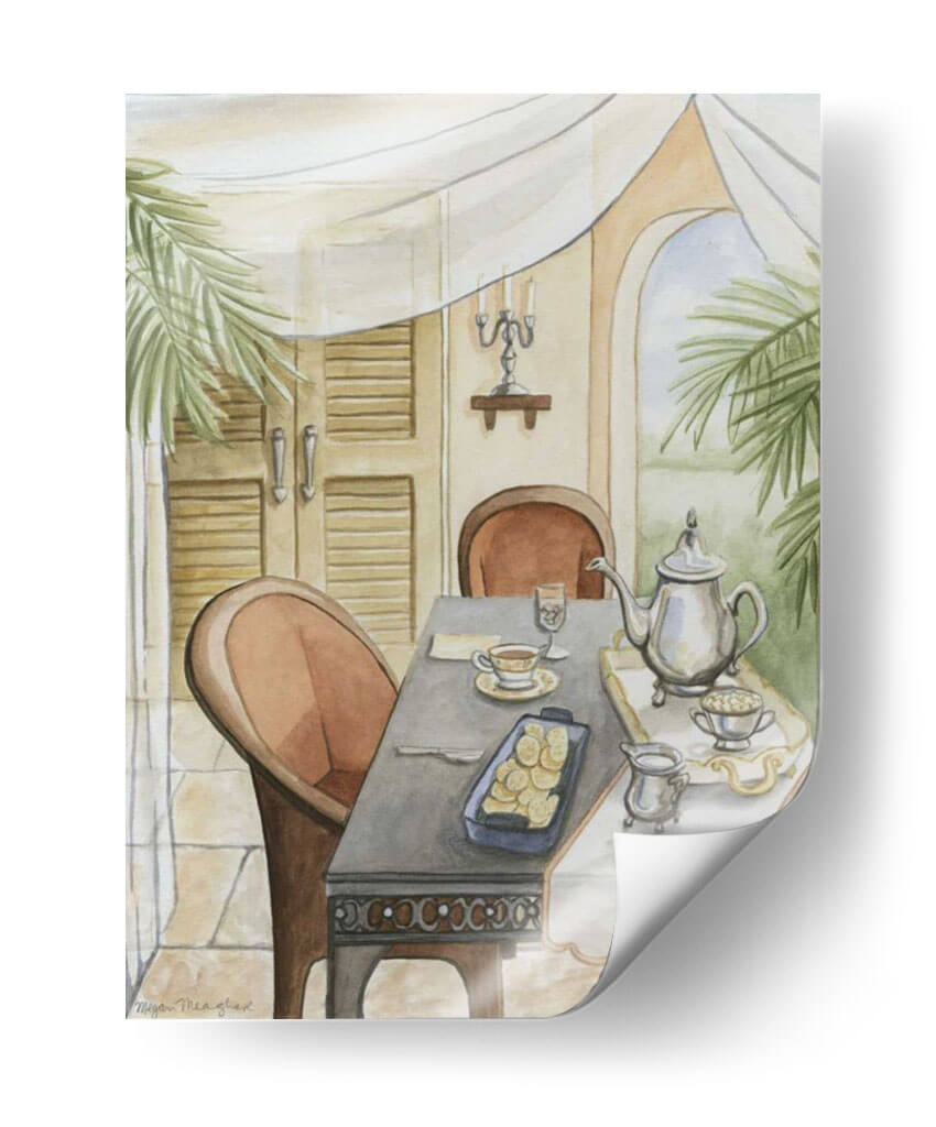 Sumérgete en la atmósfera serena y acogedora de "Grand Hotel Vignette Iii", una obra de arte que captura un momento de apacible contemplación. Esta pieza, realizada por la artista Megan Meagher, te transporta a un rincón elegante y tranquilo, evocando la sensación de unas vacaciones relajantes o una pausa deliciosa. La acuarela se despliega con delicadeza, presentando una mesa de comedor elegantemente dispuesta con tetera, tazas y un plato de bocadillos, todo enmarcado por la suave luz que se filtra a través de las persianas y las frondosas palmeras. La paleta de colores, dominada por tonos tierra, ocres y verdes suaves, crea una sensación de calidez y sofisticación. El estilo pictórico, que recuerda a las escenas de interiores y bodegones, invita a la introspección y al disfrute de los pequeños placeres. "Grand Hotel Vignette Iii" es ideal para añadir un toque de elegancia y serenidad a tu sala de estar, comedor o cualquier espacio que busques transformar en un oasis de paz. Este cuadro decorativo es perfecto para quienes aprecian el arte que evoca tranquilidad y un estilo de vida refinado, convirtiéndose en un punto focal encantador y un recordatorio constante de la belleza en la vida cotidiana.