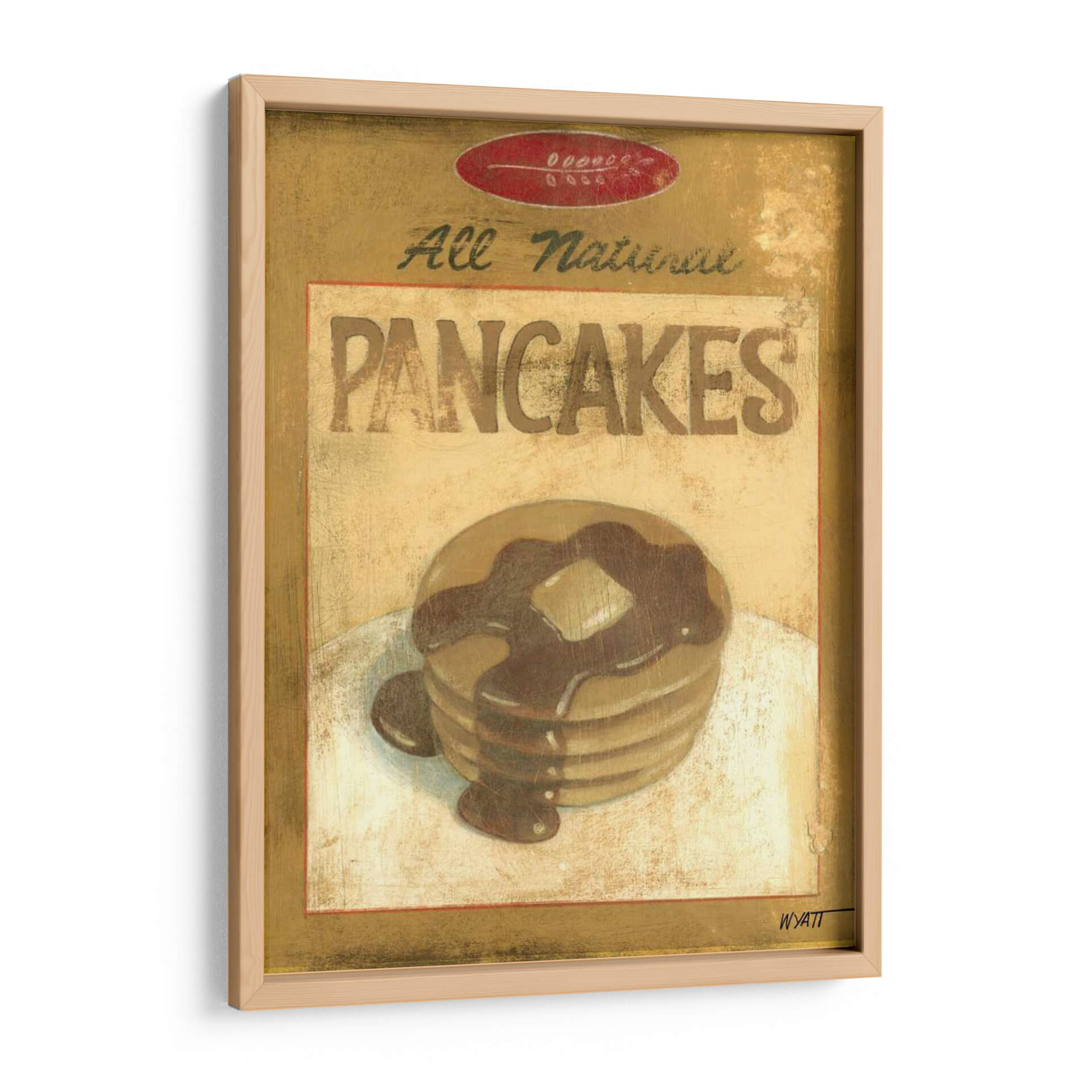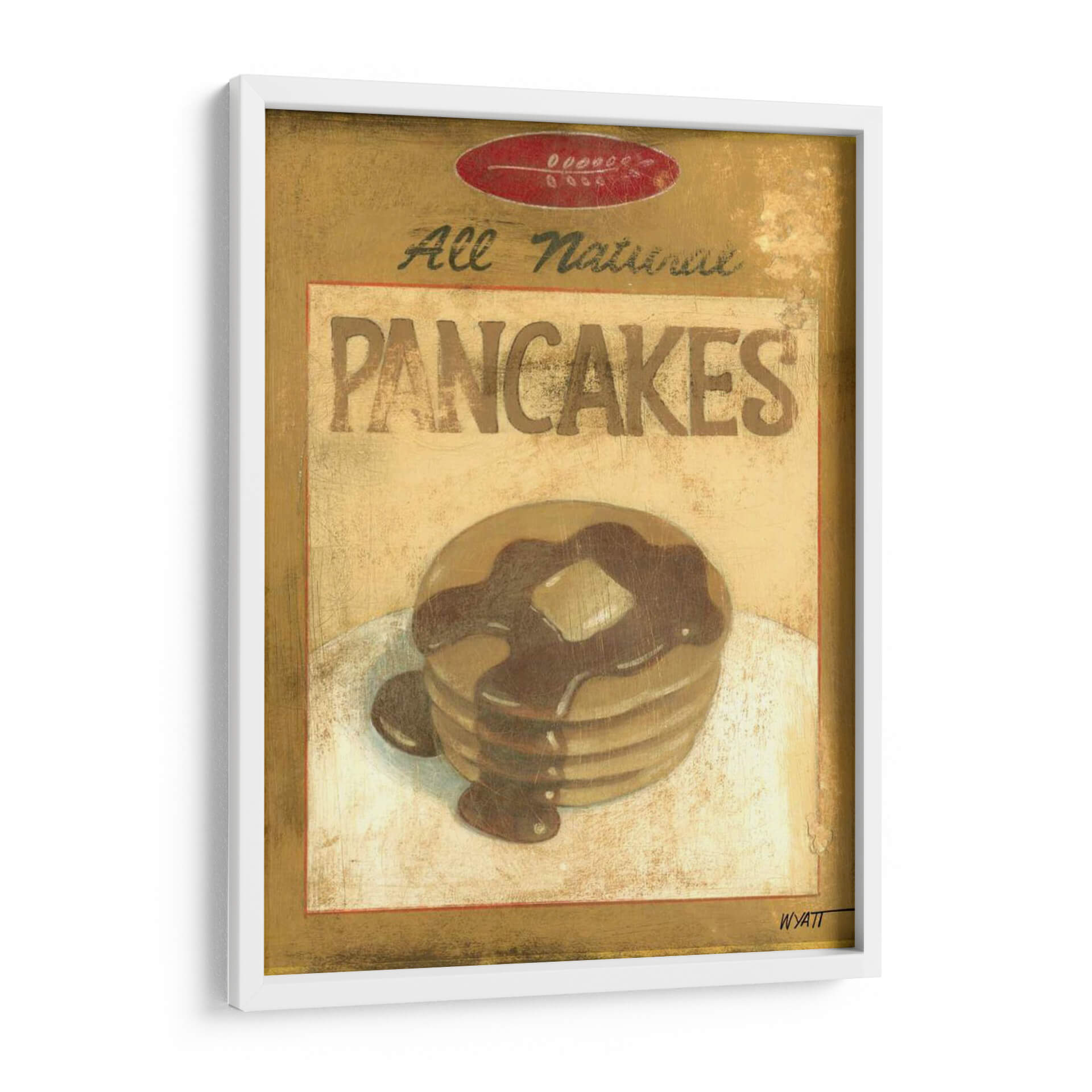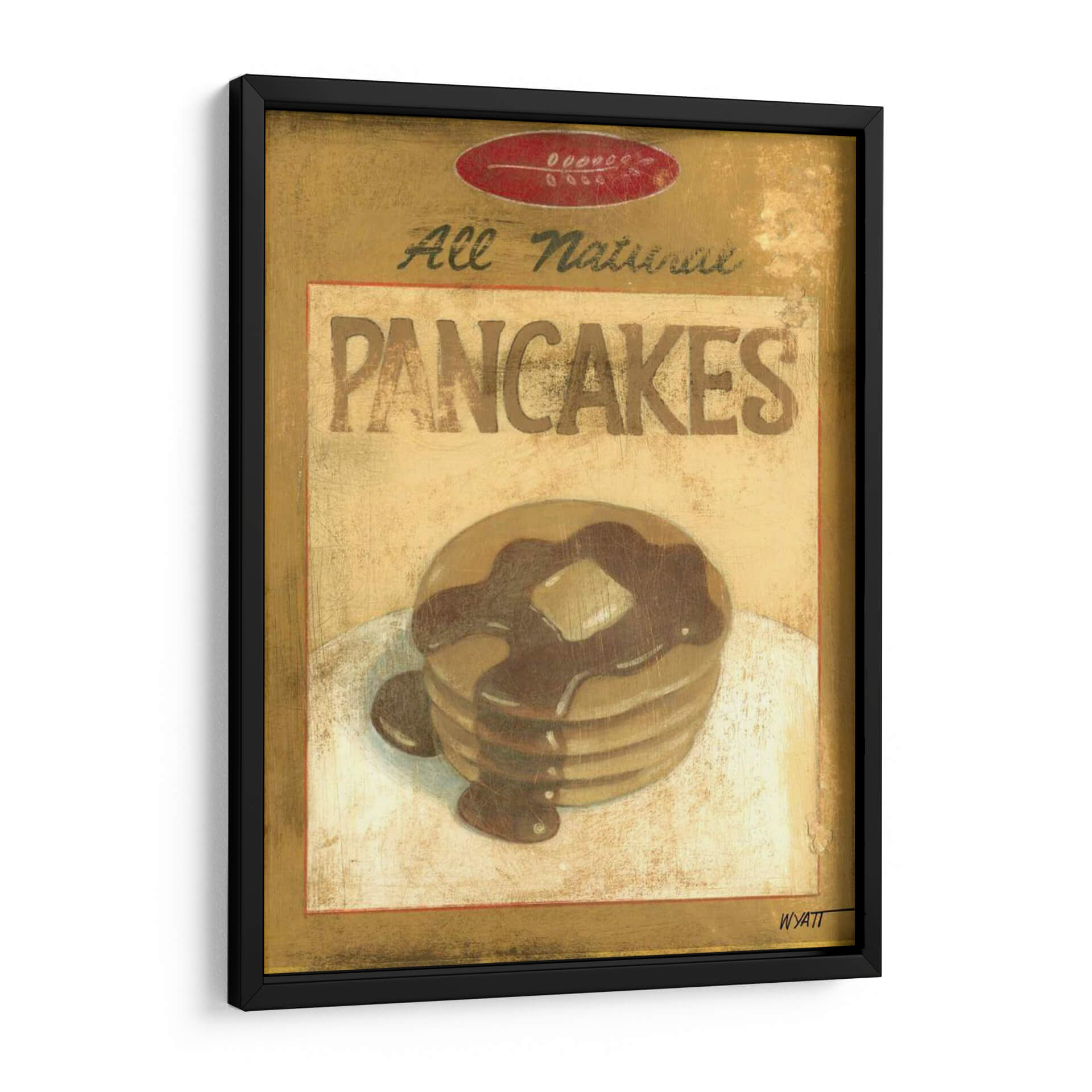 Aporta un toque de nostalgia y dulzura a tu hogar con este encantador cuadro decorativo titulado 'Mezcla Para Panqueques', una obra del artista Norman Wyatt Jr. Esta pieza evoca la calidez y el confort de los desayunos caseros, presentando una apilamiento de panqueques dorados bañados en sirope de chocolate, coronados con una porción de mantequilla. La paleta de colores se centra en tonos dorados, ocres y marrones cálidos, creando una atmósfera acogedora y apetitosa. El estilo rústico y ligeramente texturizado añade profundidad y carácter, simulando la apariencia de una etiqueta vintage o un anuncio retro. "Mezcla Para Panqueques" es ideal para cocinas, comedores o cafeterías, aportando un elemento decorativo con personalidad y un guiño a los placeres sencillos de la vida. Su composición centrada y el detallado tratamiento de la comida la convierten en un punto focal atractivo que invita a la contemplación y genera una sensación de bienestar. Este cuadro decorativo es perfecto para quienes buscan añadir un toque artístico y personal a sus espacios, evocando recuerdos agradables y un ambiente hogareño. Añade esta obra a tu colección y disfruta de su encanto único cada día.