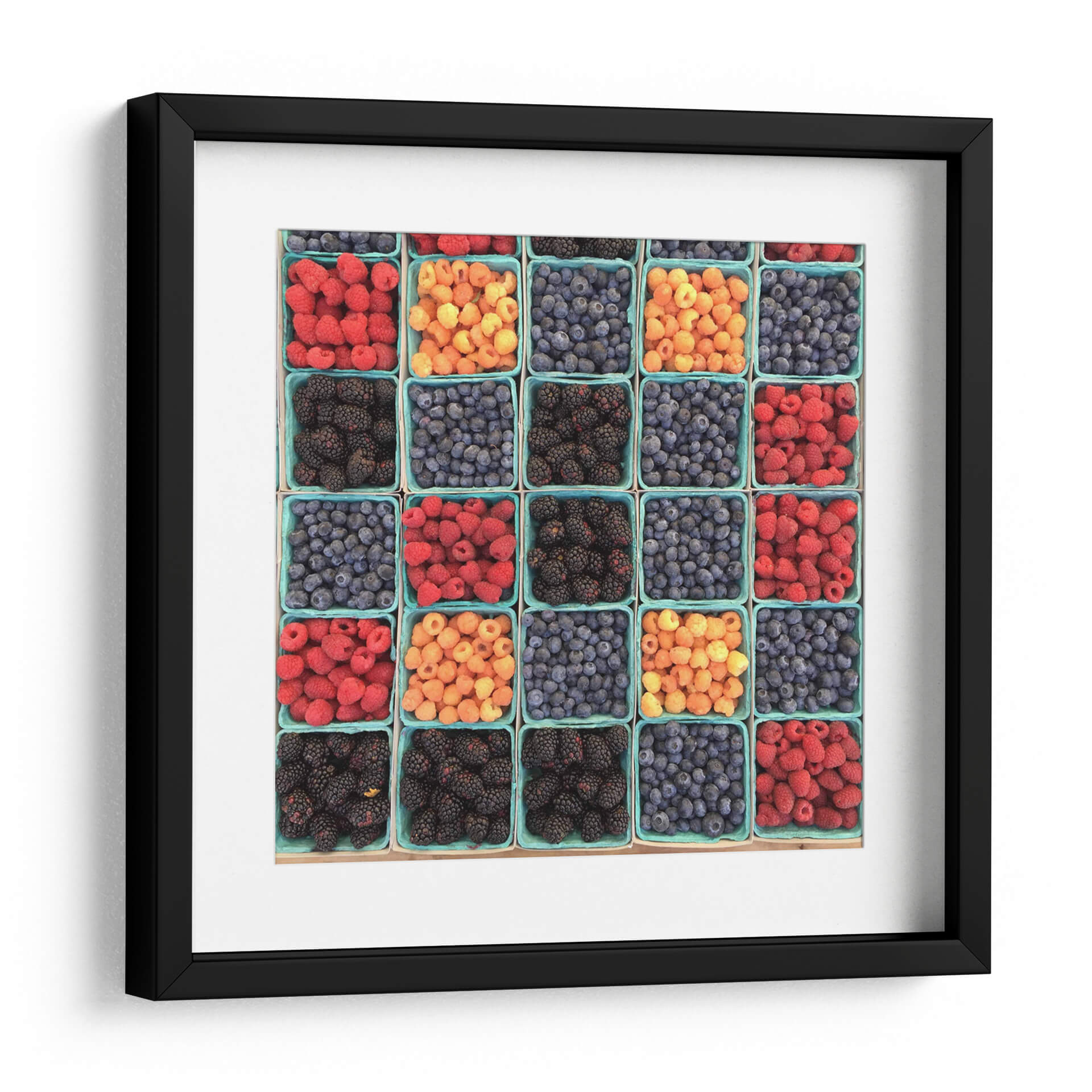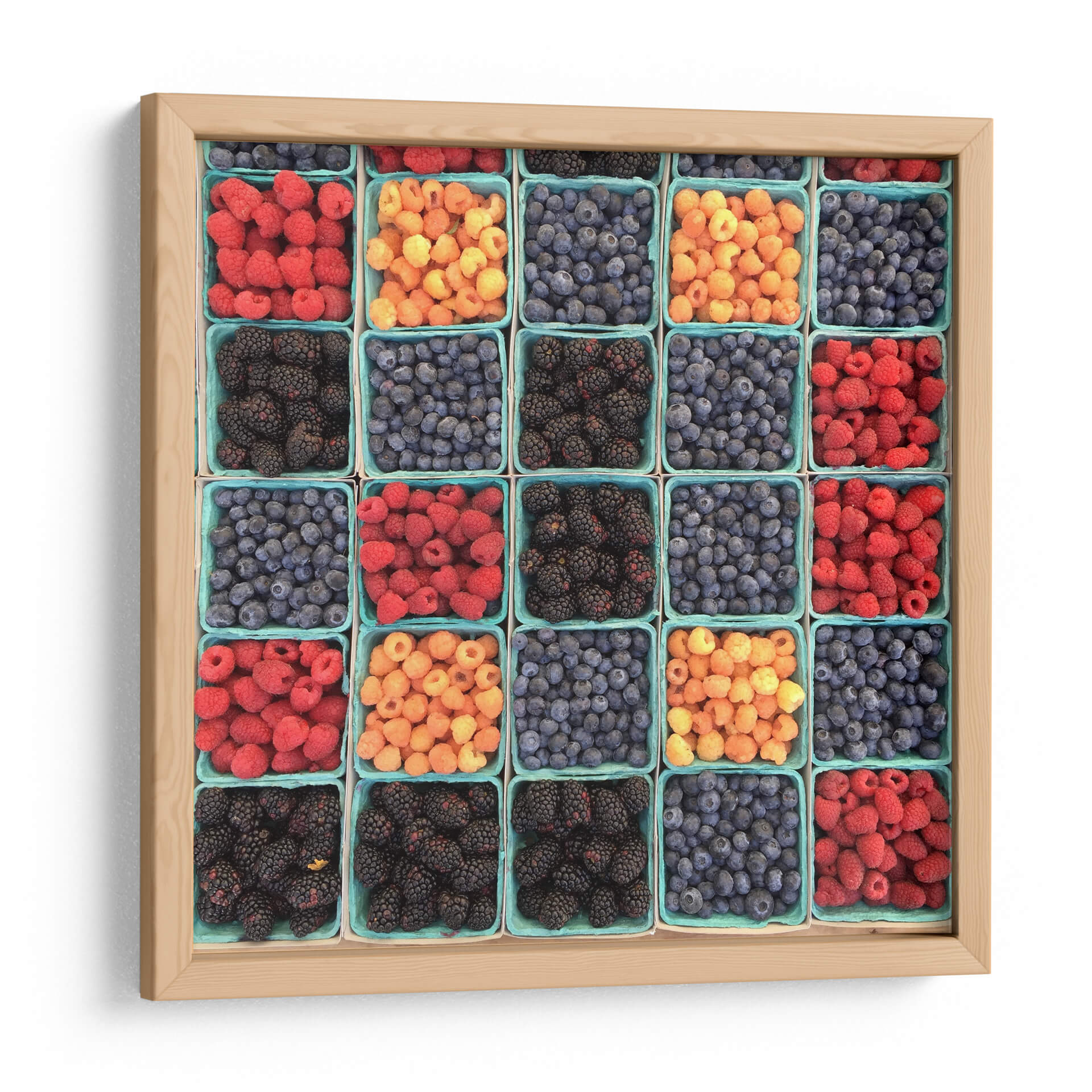 Transforma tu espacio con la vibrante obra 'Moritas de colores', una celebración visual de la abundancia y la frescura de la naturaleza. Este cuadro decorativo presenta una composición simétrica y cautivadora de frambuesas rojas, moras oscuras y arándanos azules y amarillos, cada uno presentado en sus característicos envases de cartón, evocando la sensación de un mercado de agricultores o una despensa rebosante. Los colores intensos y la textura detallada de cada baya crean una imagen que es a la vez deliciosa y estéticamente agradable, aportando un toque de alegría y vitalidad a cualquier habitación. Su estilo fotográfico y su enfoque en la repetición de elementos lo convierten en una pieza versátil, perfecta para cocinas, comedores, o incluso para añadir un toque de color a una oficina o sala de estar moderna. Esta obra es ideal para quienes buscan infundir a su hogar una energía positiva y un recordatorio de los placeres sencillos y la belleza que se encuentra en los productos de la tierra. Añade un toque de color y frescura a tu decoración con este impresionante cuadro.
