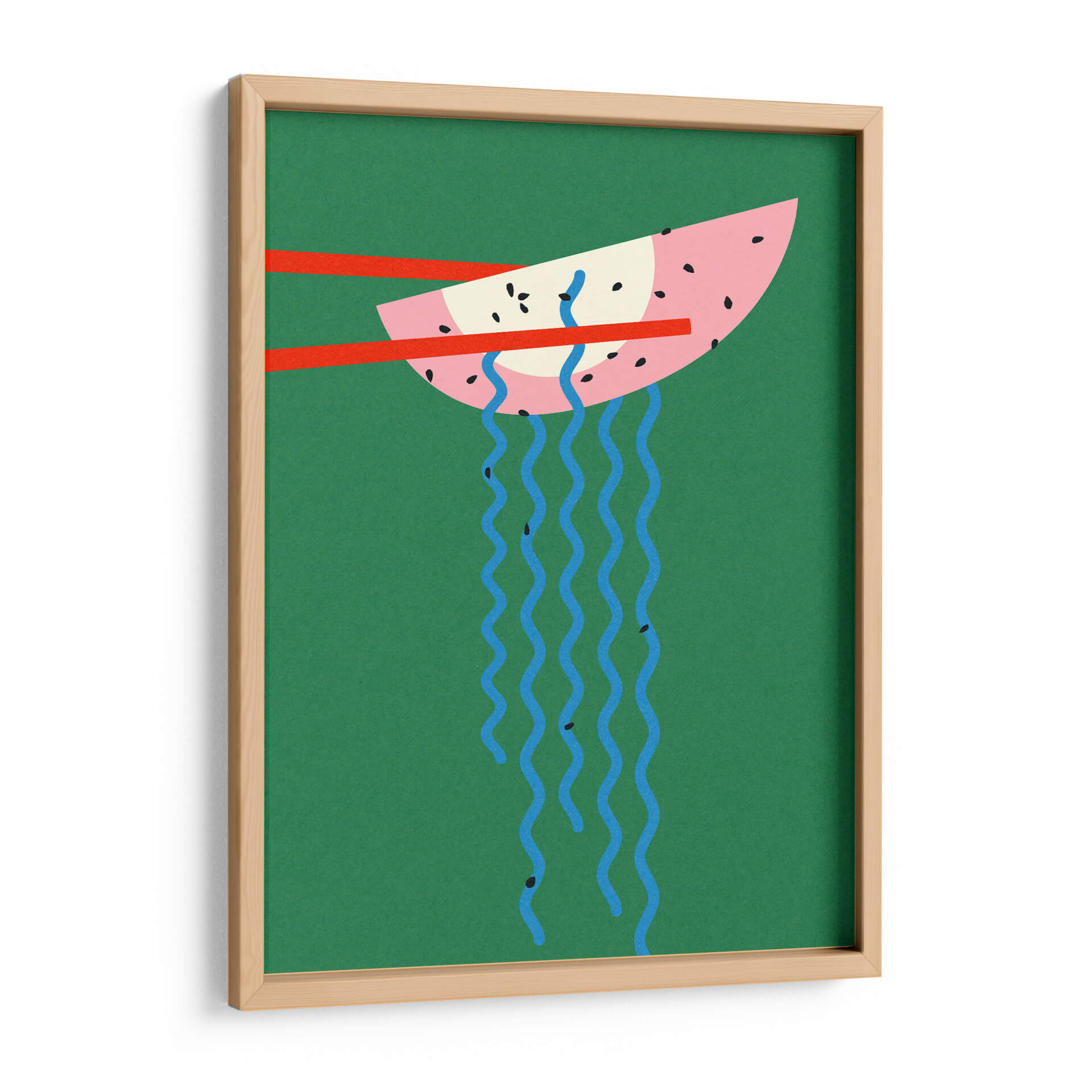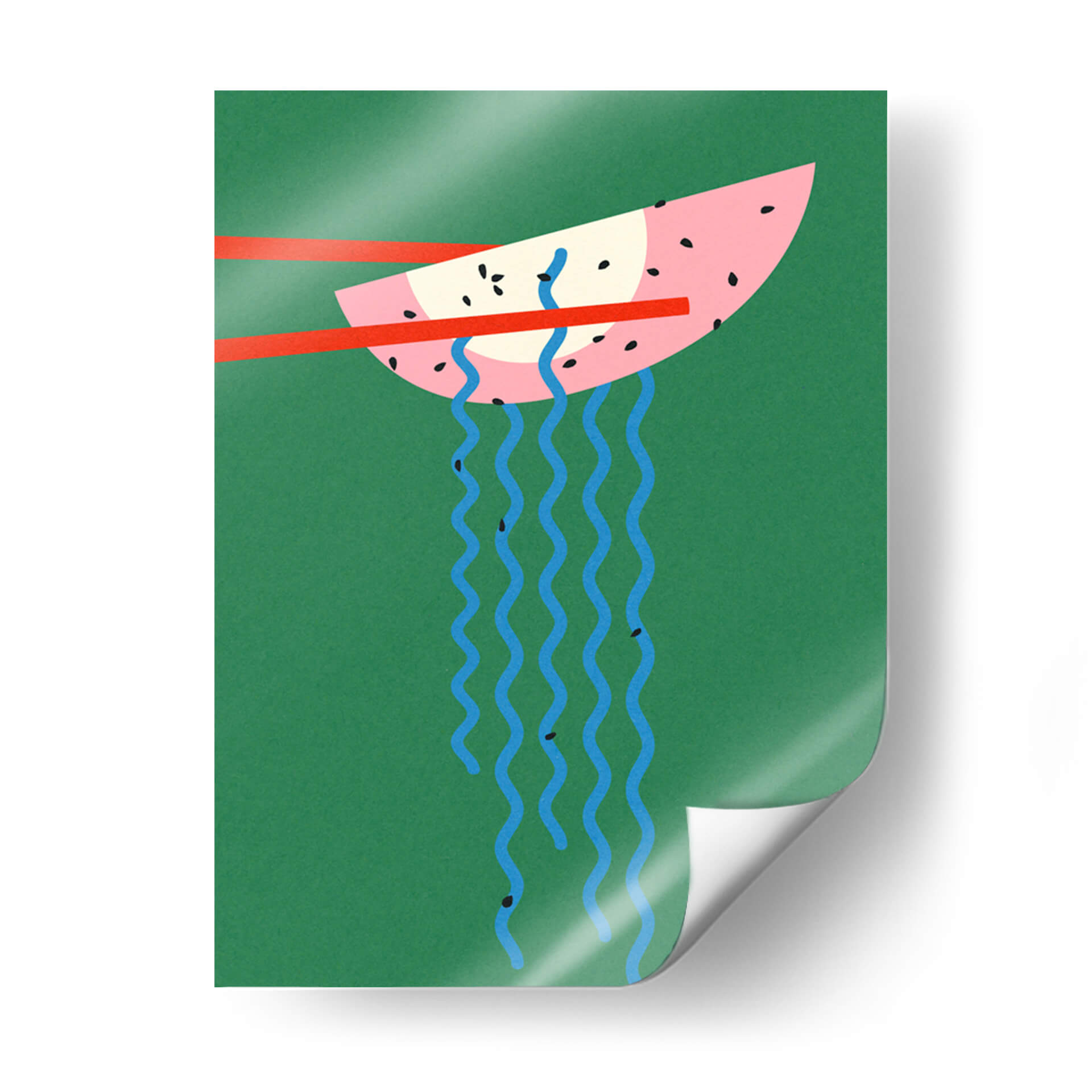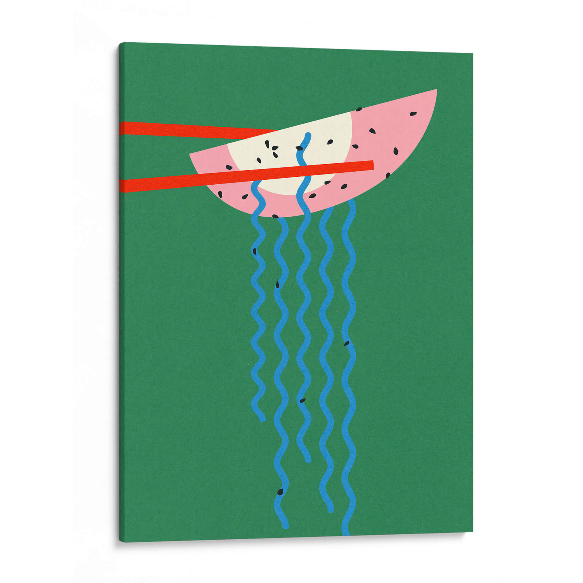 Sumérgete en la vibrante y juguetona obra de arte "Ramen de Hollywood" de Rosi Feist, un cuadro decorativo que desafía las convenciones con su audaz paleta de colores y su concepto surrealista. Esta pieza captura la atención con un diseño minimalista pero impactante, presentando una rodaja de sandía estilizada, sostenida por palillos rojos, de la que caen delicadas hebras de color azul, simulando fideos. El contraste entre el rosa vibrante de la sandía, el verde profundo del fondo y los toques de rojo y azul crea una composición visualmente estimulante que inyecta personalidad y un toque de humor a cualquier espacio. Ideal para amantes de la gastronomía, el arte pop y quienes buscan piezas únicas que inicien conversaciones, este cuadro decorativo es perfecto para añadir un acento de color y originalidad a tu cocina, comedor, oficina o cualquier ambiente que necesite un soplo de aire fresco y creatividad. La simplicidad de sus formas y la audacia de su temática lo convierten en una adición moderna y sorprendente a tu decoración.
