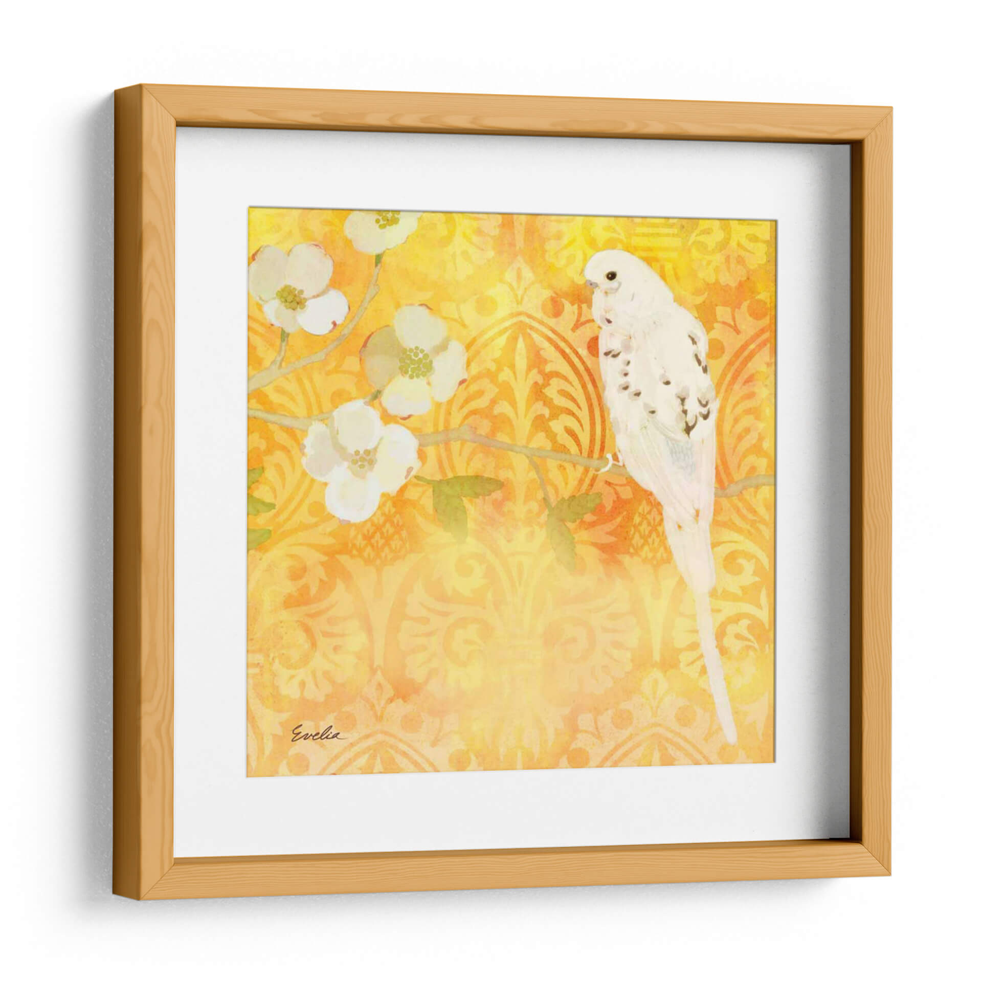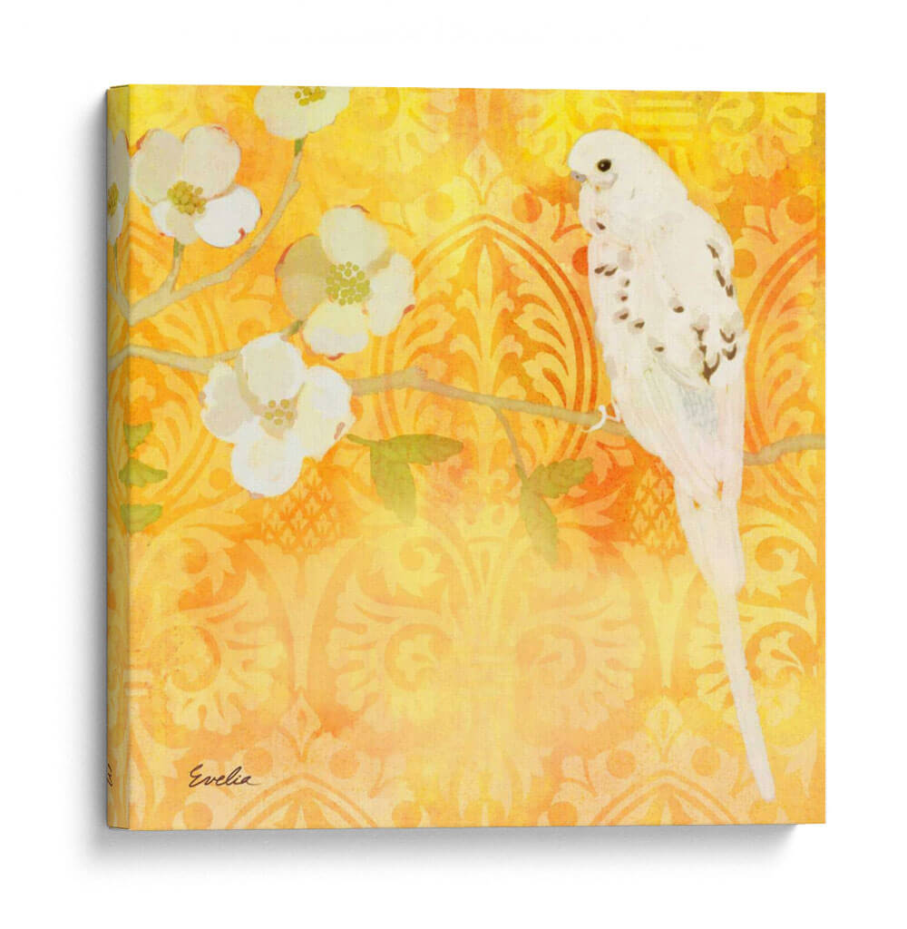 Infundi tu espacio con la delicada belleza de "Budgie Y Cartouche I", una obra de arte que captura la serenidad de la naturaleza con un toque contemporáneo. Esta pieza presenta un tierno periquito blanco posado sobre una rama florida, contrastando con un vibrante y ornamentado fondo en tonos dorados y anaranjados. La paleta de colores cálidos y luminosos crea una atmósfera acogedora y alegre, perfecta para añadir un toque de vida a cualquier habitación. El estilo artístico combina elementos botánicos y figurativos con un patrón de fondo sutilmente texturizado, resultando en una composición visualmente atractiva y equilibrada. Este cuadro decorativo es ideal para quienes buscan infundir calma y un aire de sofisticación natural en su hogar u oficina. Imagina este exquisito detalle en tu sala de estar, dormitorio o estudio, donde aportará una nota de color y tranquilidad. "Budgie Y Cartouche I" no es solo una decoración, es una invitación a la contemplación y al disfrute de la belleza sutil. La delicadeza del periquito, junto a la riqueza del fondo, lo convierten en un punto focal encantador que complementa diversos estilos decorativos, desde el moderno hasta el más clásico.