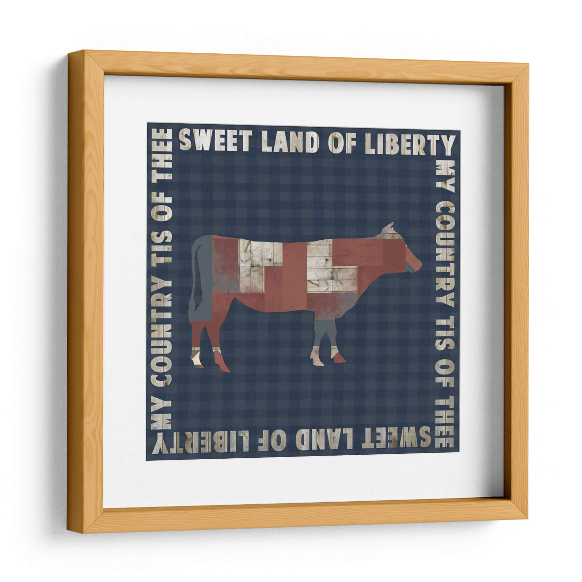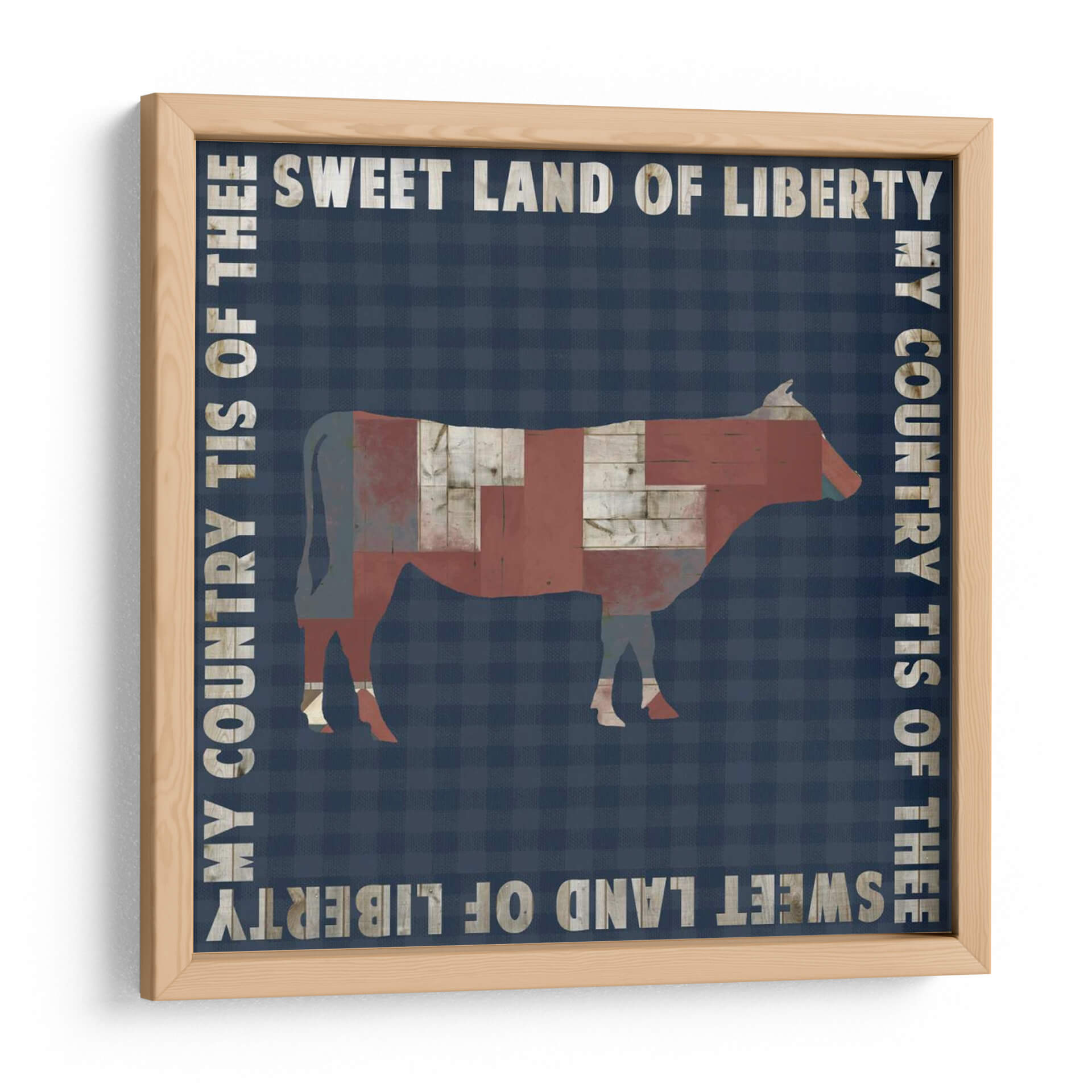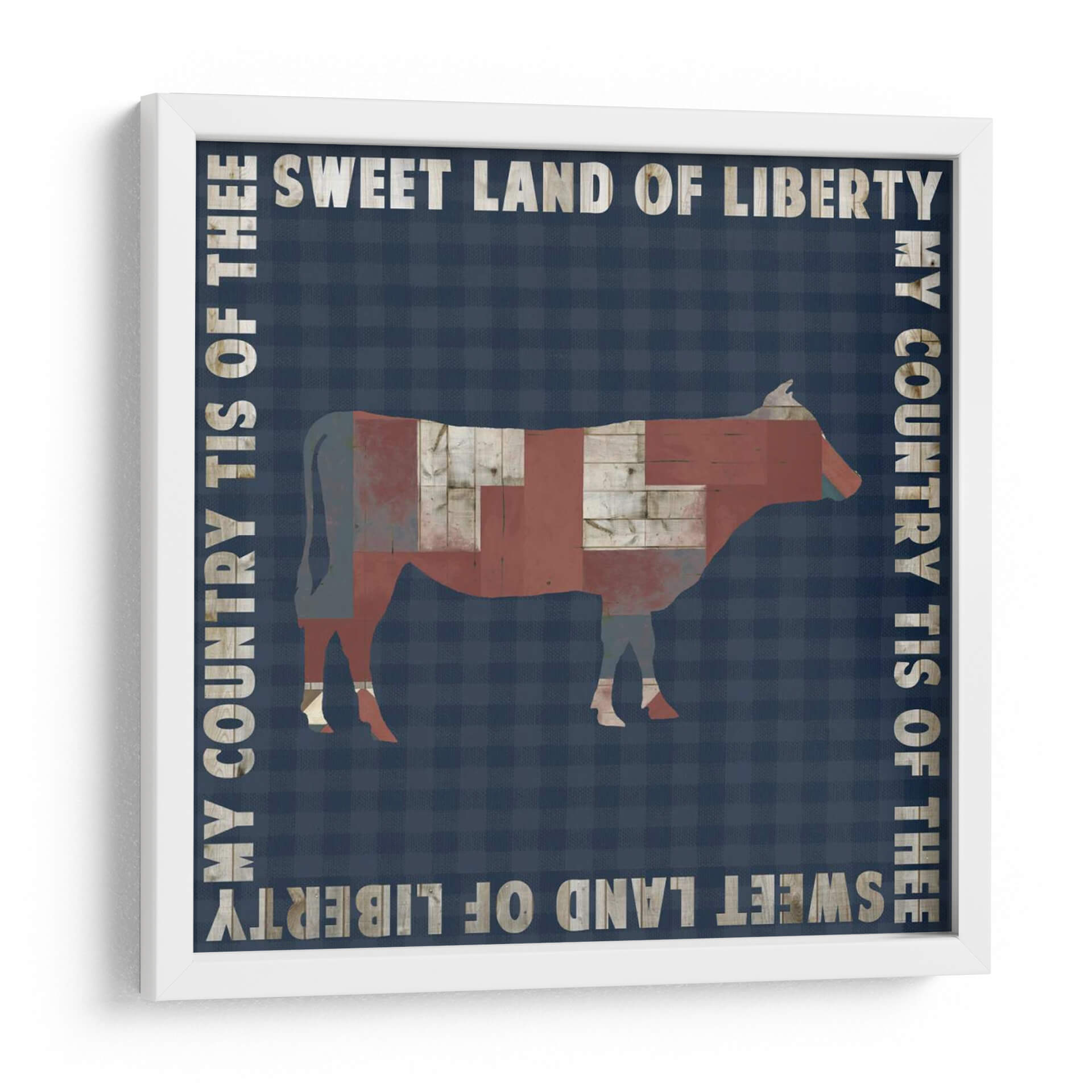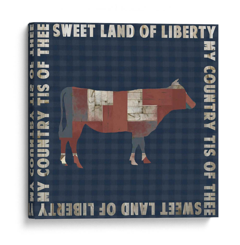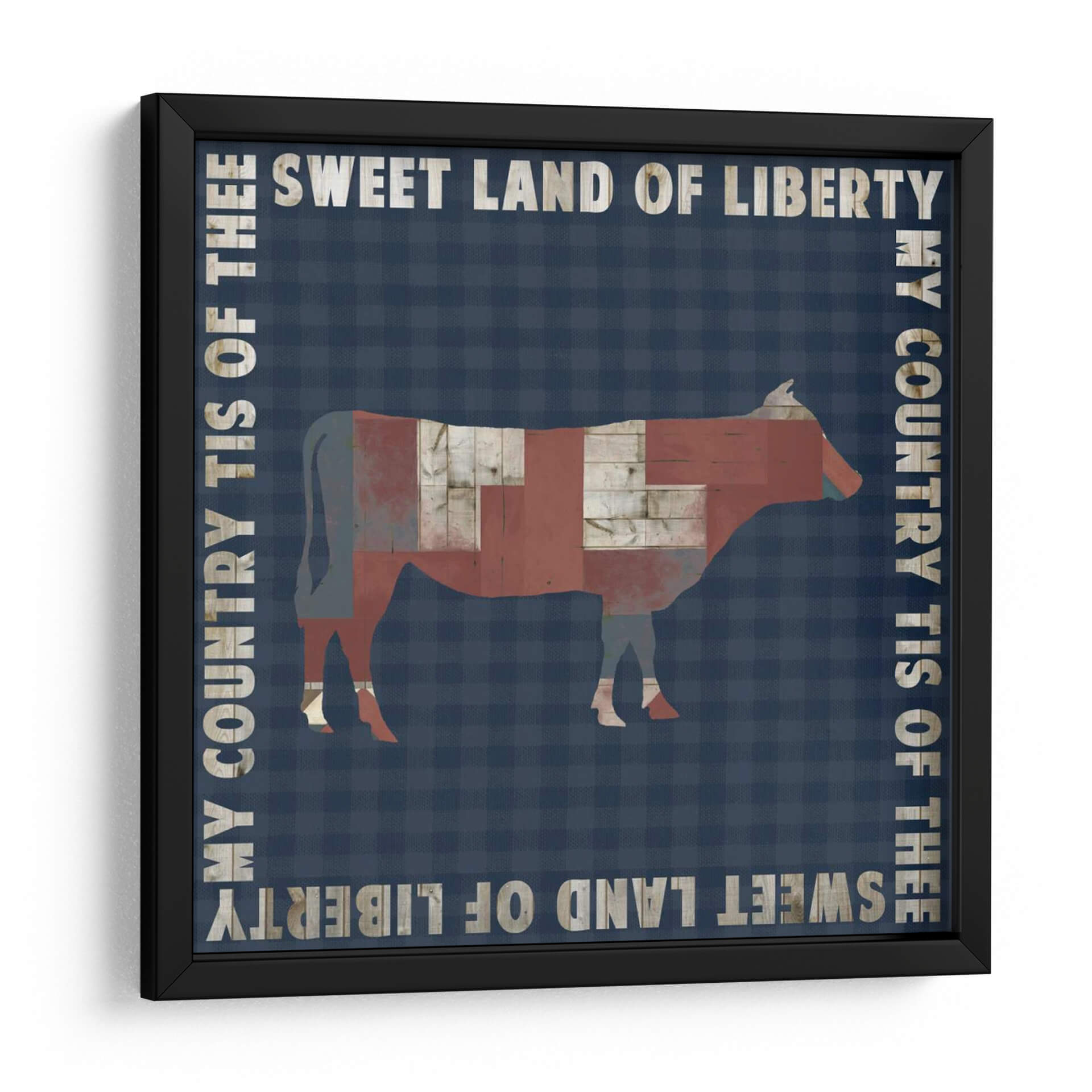 Celebra el espíritu patriótico con este impactante cuadro decorativo, "Cuarto En La Colección De La Granja G.", una obra de Studio W que fusiona arte y sentimiento nacional. La pieza presenta una silueta de vaca estilizada, cuya piel está compuesta por fragmentos que evocan la bandera estadounidense, creando un efecto visual único y patriótico. Los colores predominantes son el rojo, blanco y azul, enmarcados por un fondo de cuadros tartán azul marino, que aporta un toque rústico y acogedor. La obra integra texto de forma audaz y repetida, "Sweet Land of Liberty" y "My Country Tis of Thee", rindiendo homenaje a los icónicos himnos patrióticos y reforzando el mensaje de unidad y orgullo. Este cuadro decorativo es ideal para añadir un toque de carácter y conversación a cualquier sala de estar, comedor o estudio. Su diseño audaz y temática americana lo convierten en una elección perfecta para espacios que buscan expresar identidad y un estilo rústico-moderno. Transforma tu hogar en un santuario de orgullo nacional con esta pieza artística única.